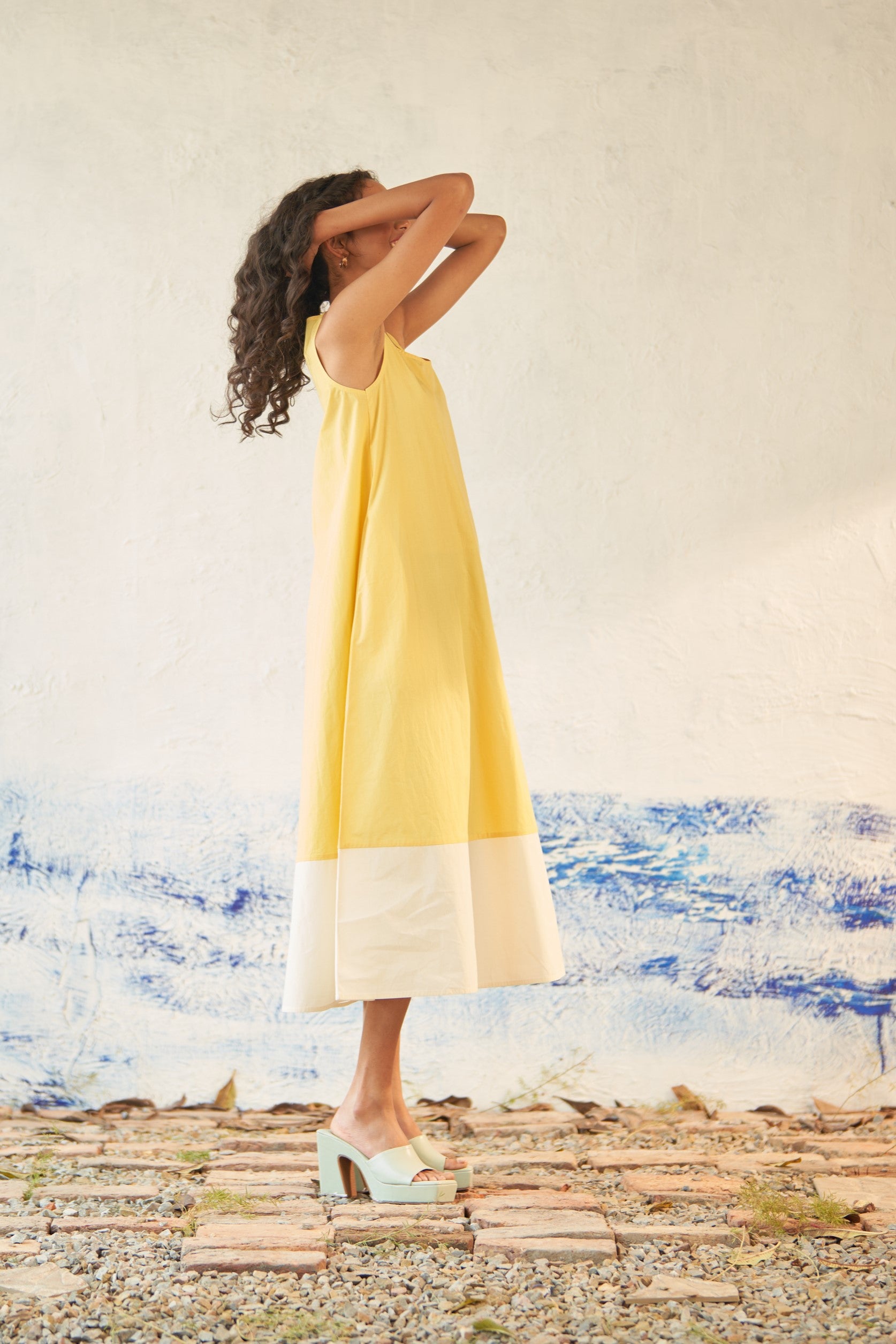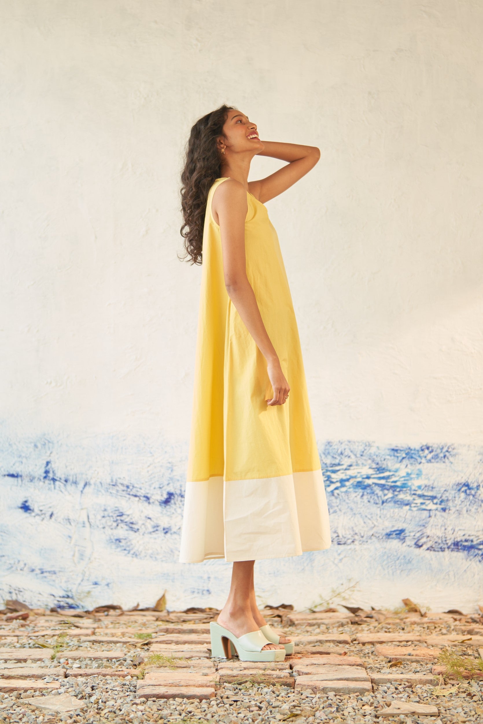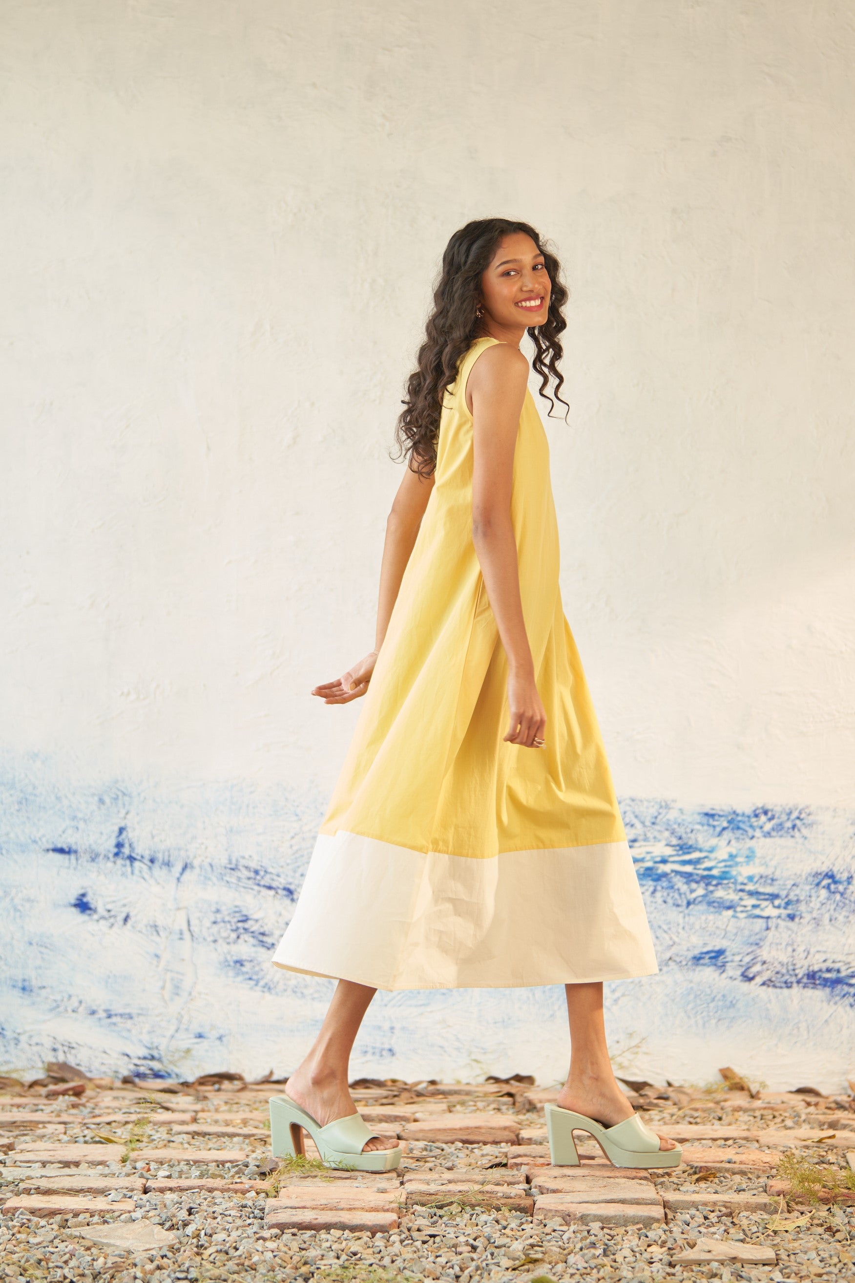 This premium cotton dual-toned dress is expertly crafted to gracefully drape through the frame, featuring a scoop neck and a curved hem. Its sleeveless design with a voluminous flare allows for effortless movement from morning to evening. A must-have addition to your collection of easy-to-wear outfits.