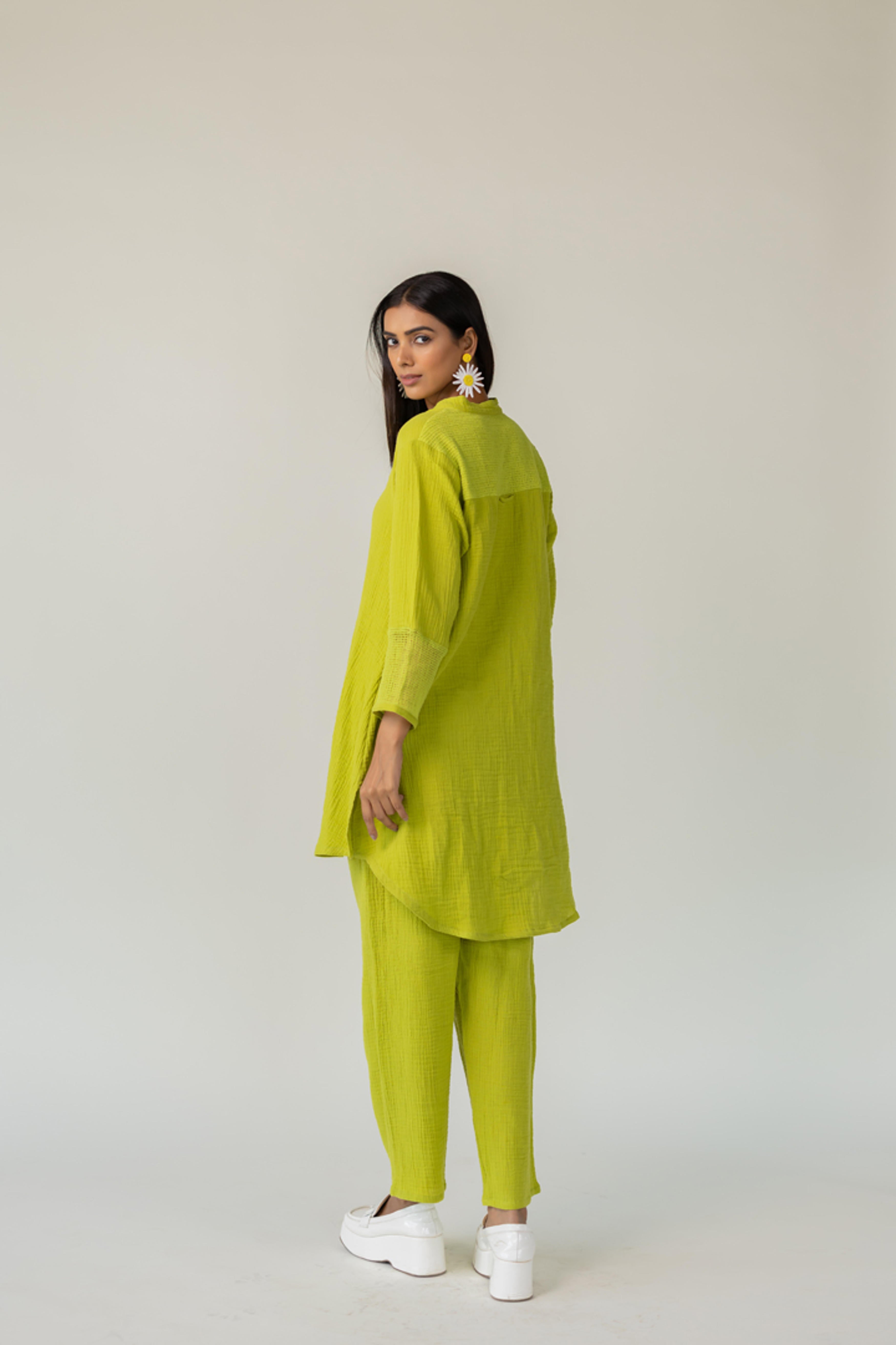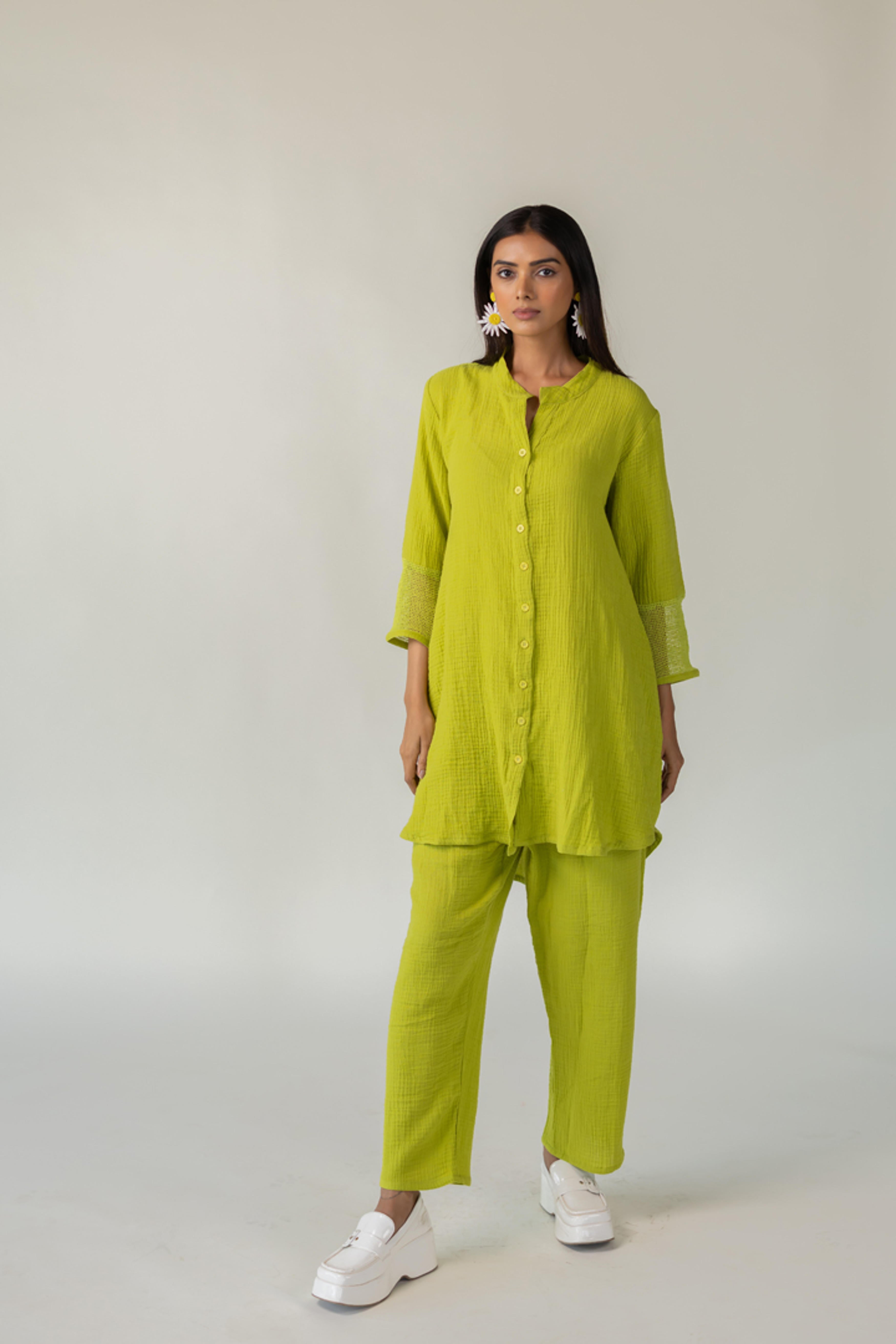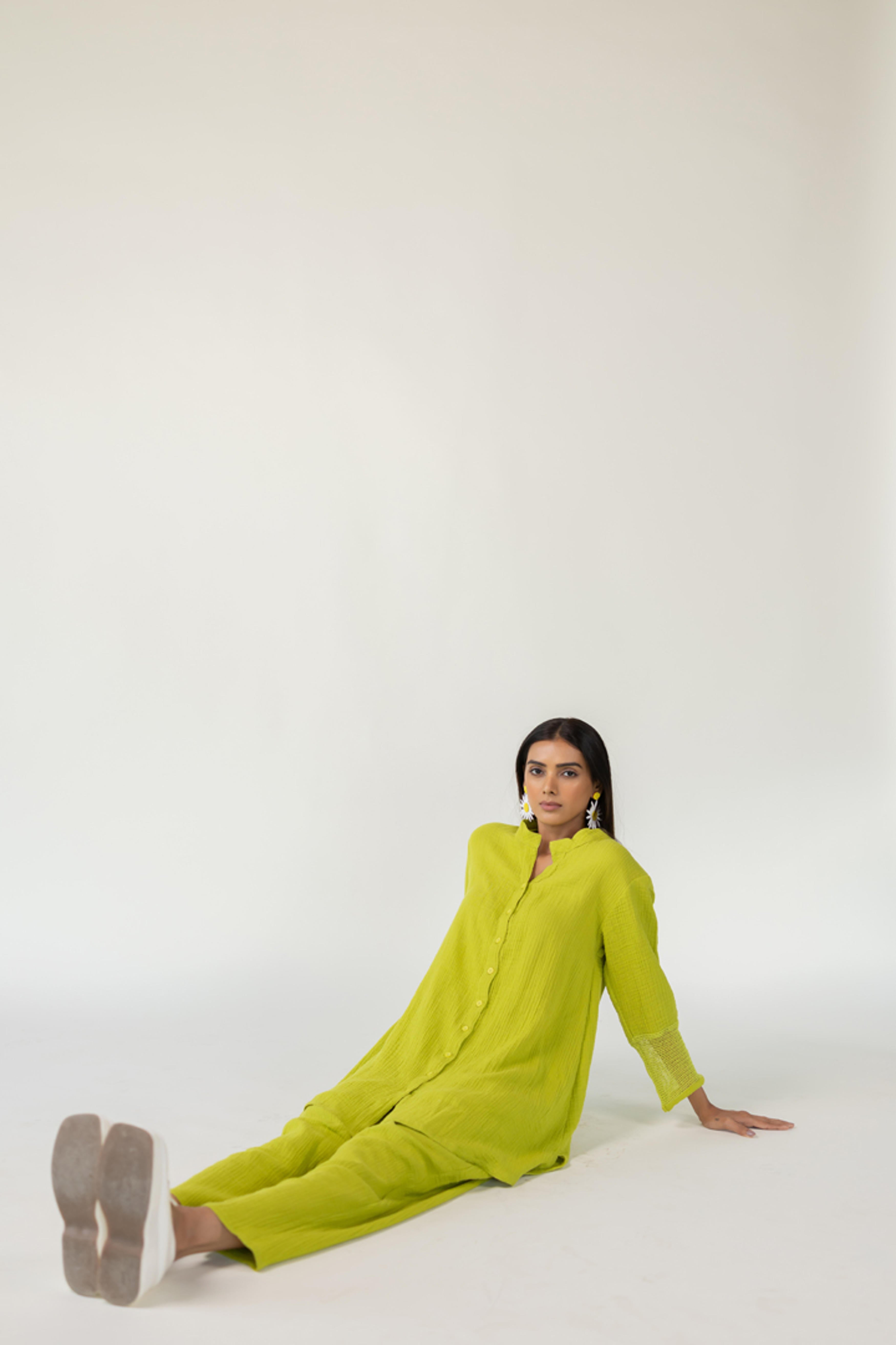 Embrace a playful yet poised look with our Matcha Mist Tunic ? where vibrant color meets effortless silhouette. Made from soft, textured cotton, this relaxed set features a long shirt with a full button-down front, and High low hem. Ideal for travel, leisure, or casual brunches ? style it with statement earrings or minimal sneakers for an elevated laid-back look. Model is 5?7? and wearing size M Length- Tunic Front - 34" Tunic Back - 38