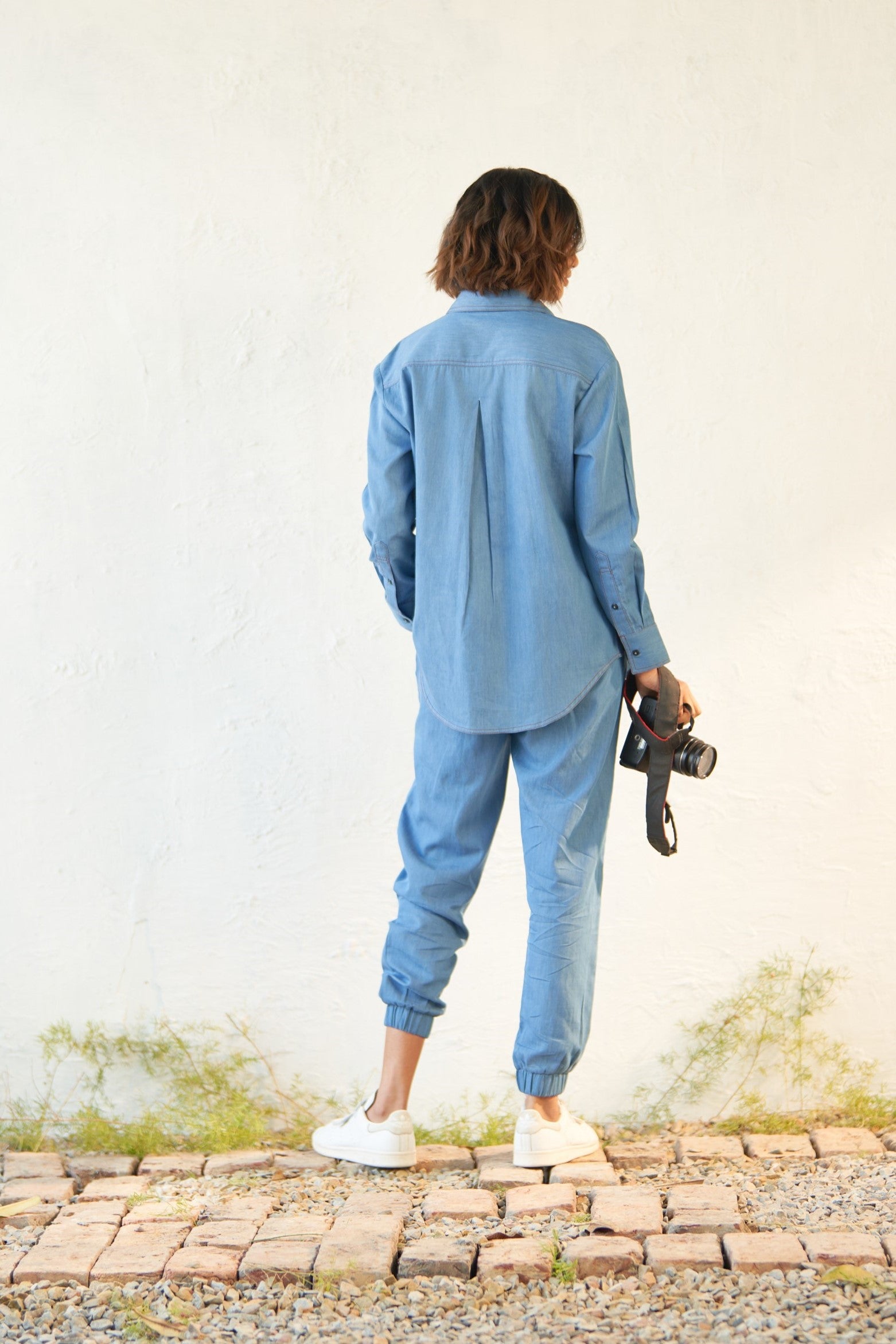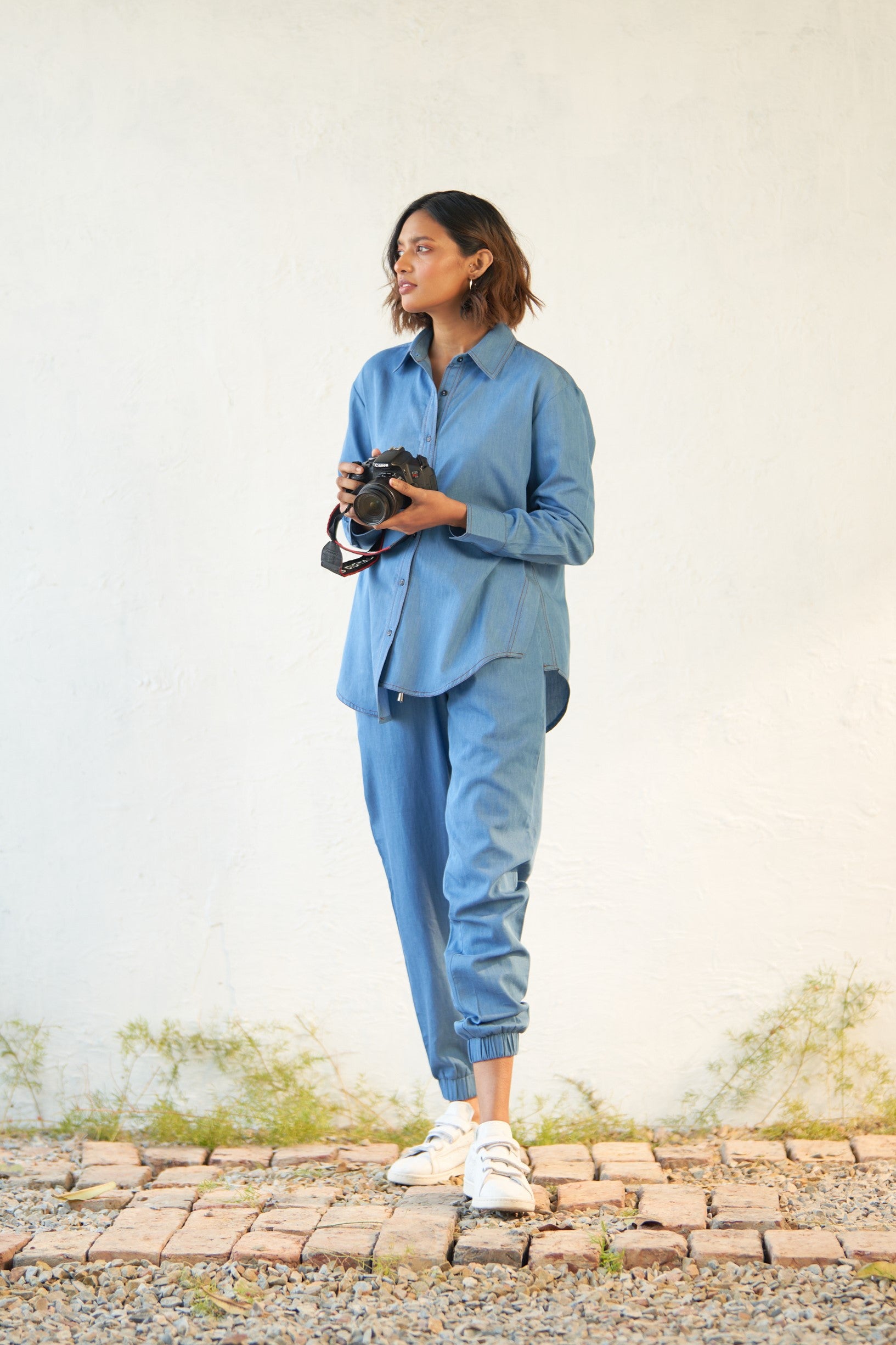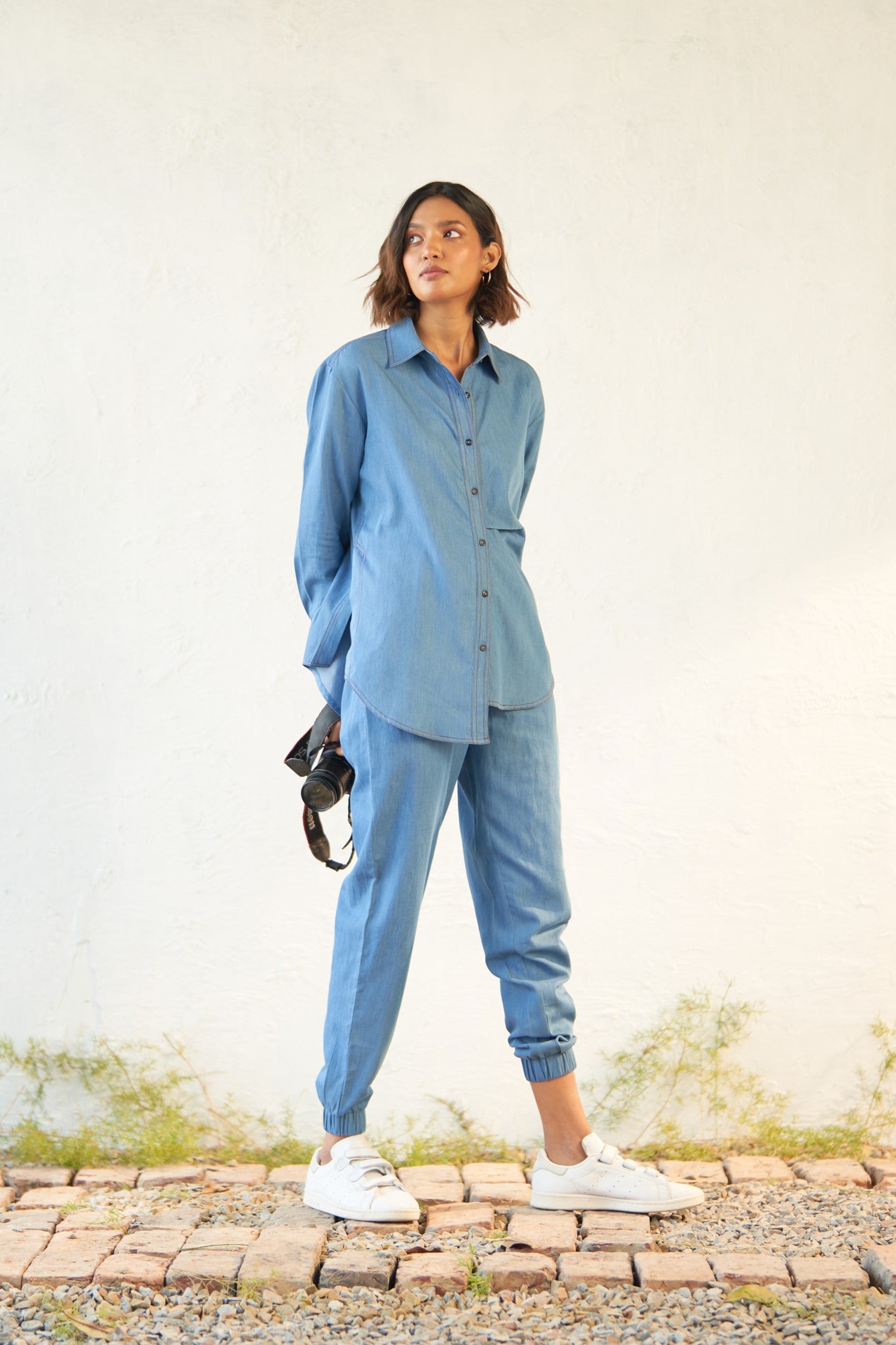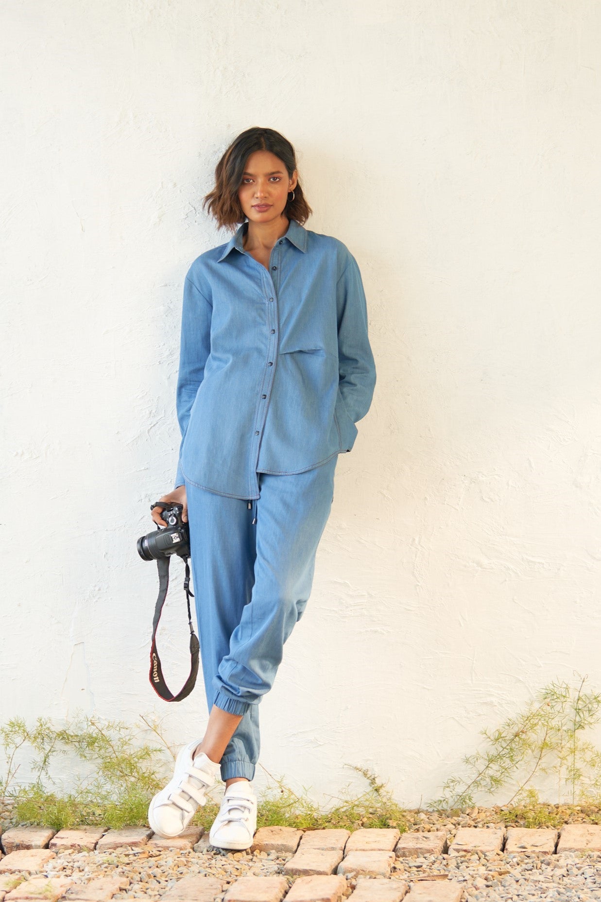 Our all-day denim set, featuring an asymmetric shirt and joggers crafted from soft denim fabric. The shirt showcases an intriguing asymmetric placket, which creates a unique pleated panel on the left side, adding a modern twist to the classic design. Paired with joggers boasting tapered legs and an elasticated waistband with metal accent drawstrings, this ensemble offers both style and comfort. The clean welt pocket detail on the joggers adds a touch of casual utility, perfect for everyday wear.