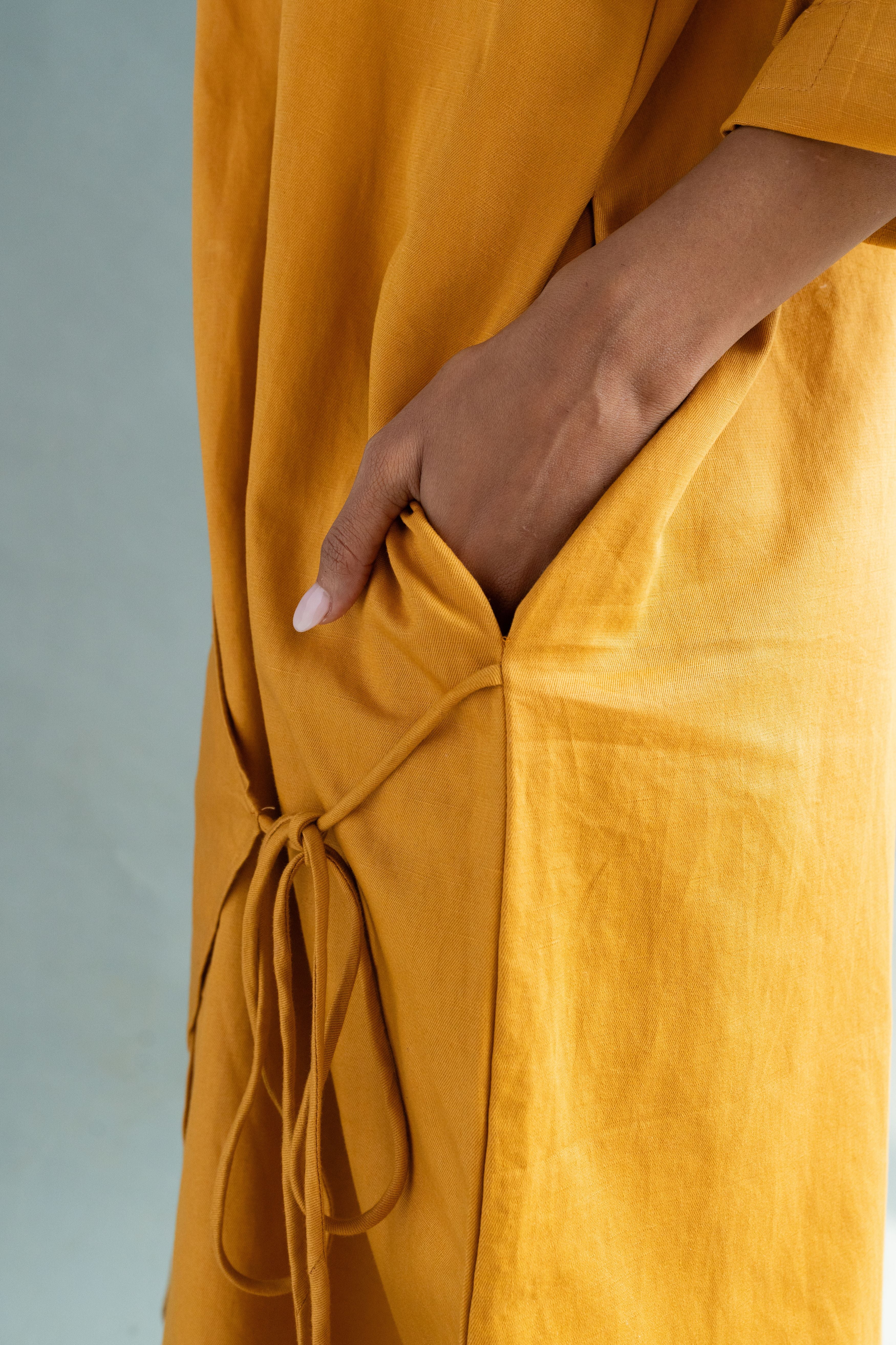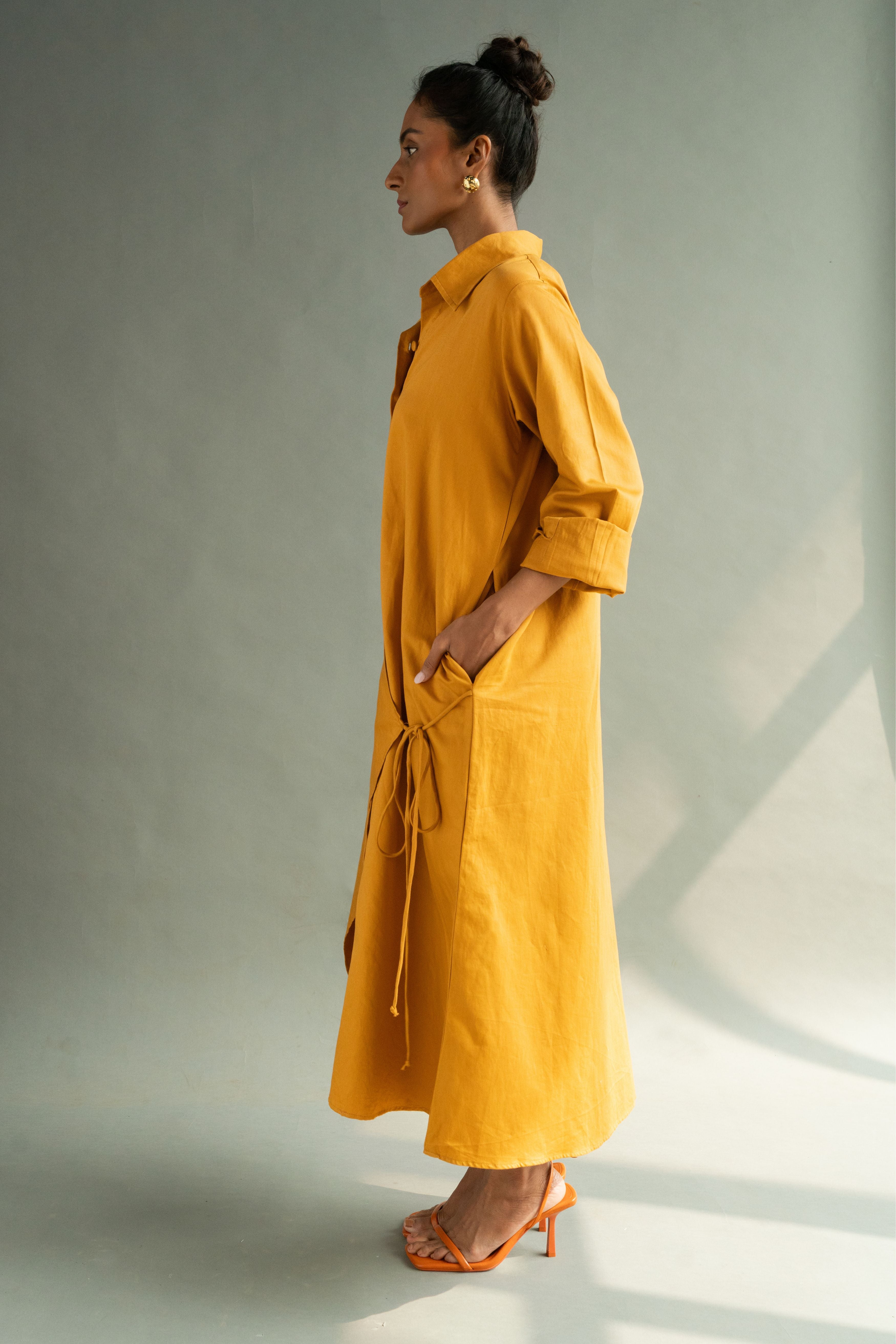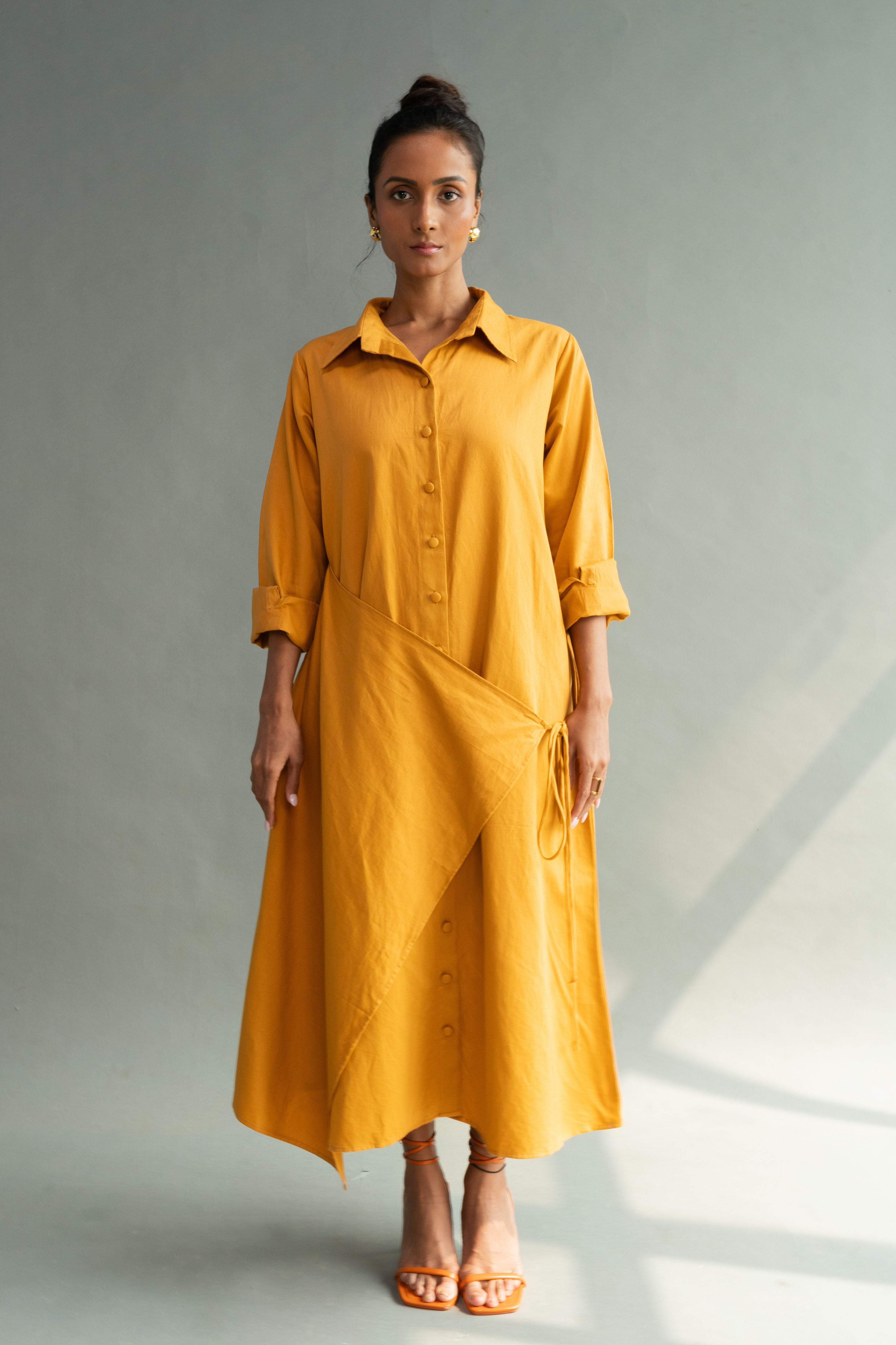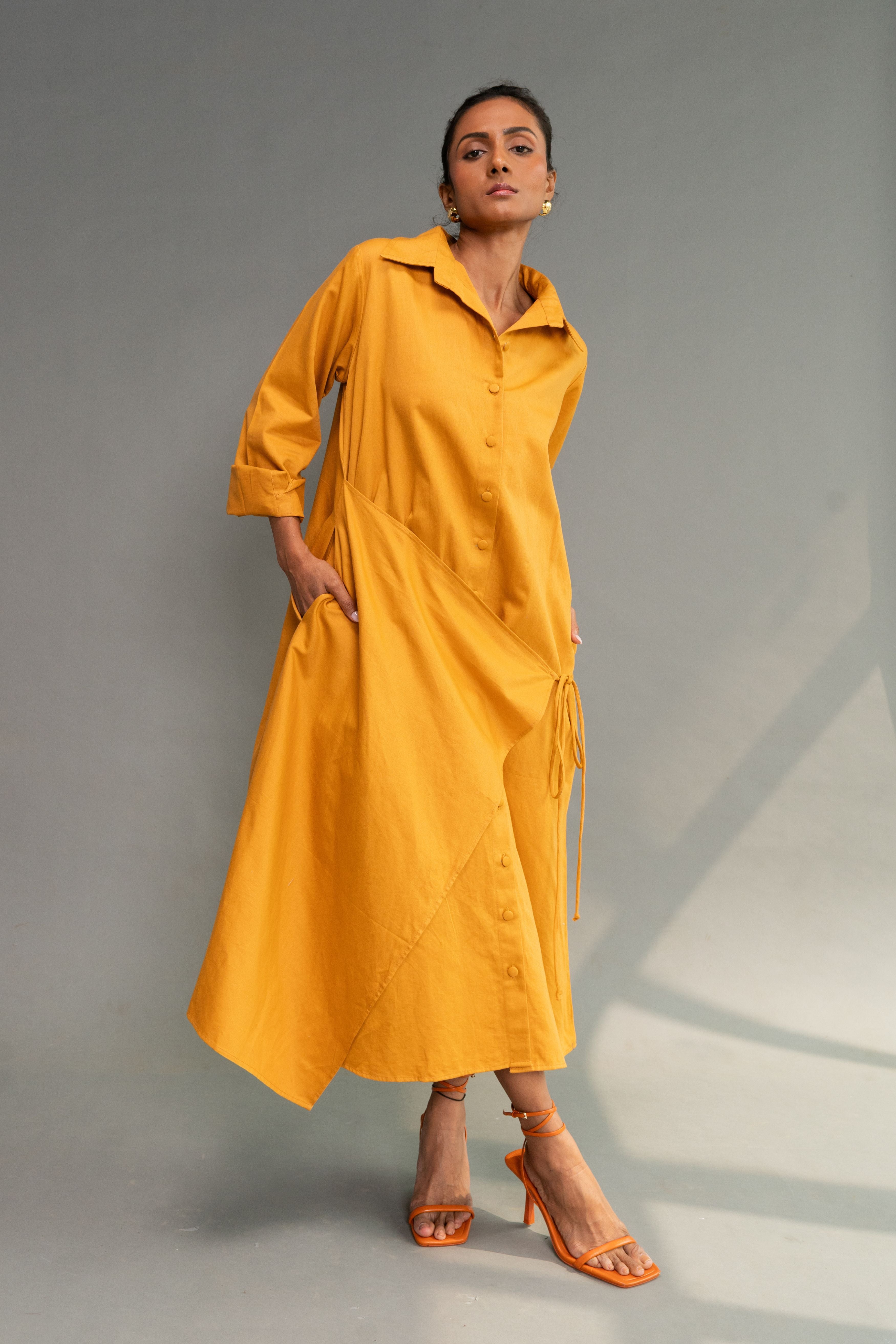 Calf length A- line shirt dress with an overlapping tie detail, featuring self fabric buttons, drop shoulders, in-seam pockets. P.S. It's bump friendly!