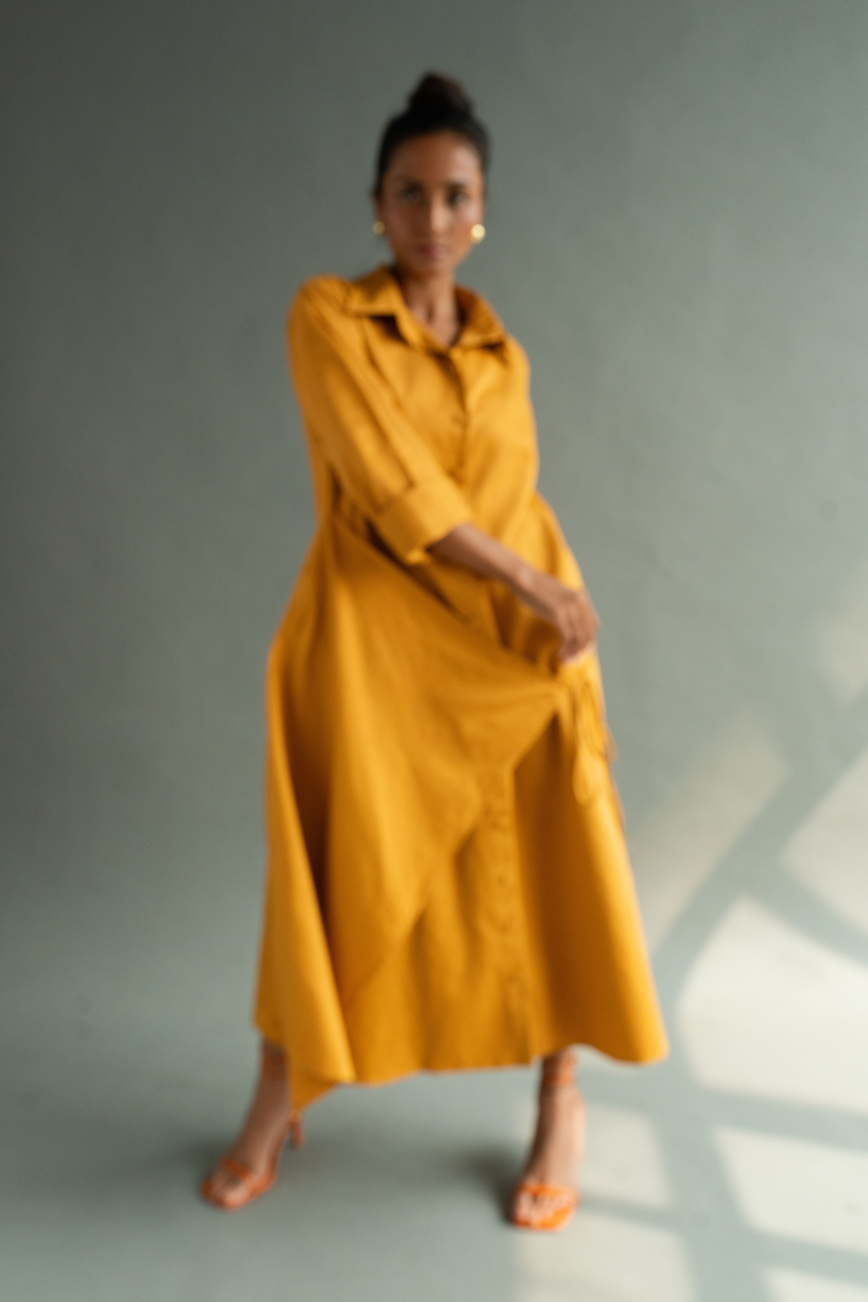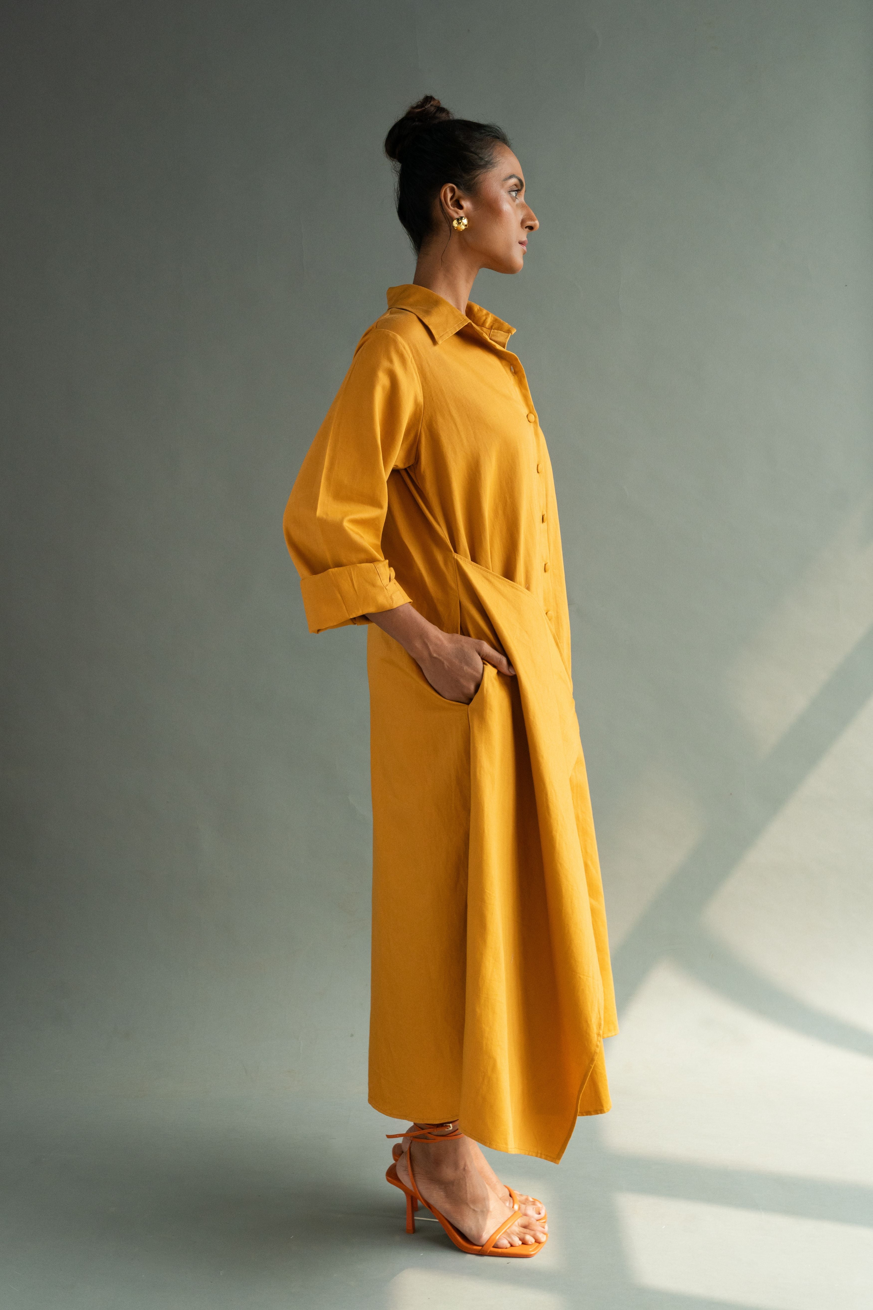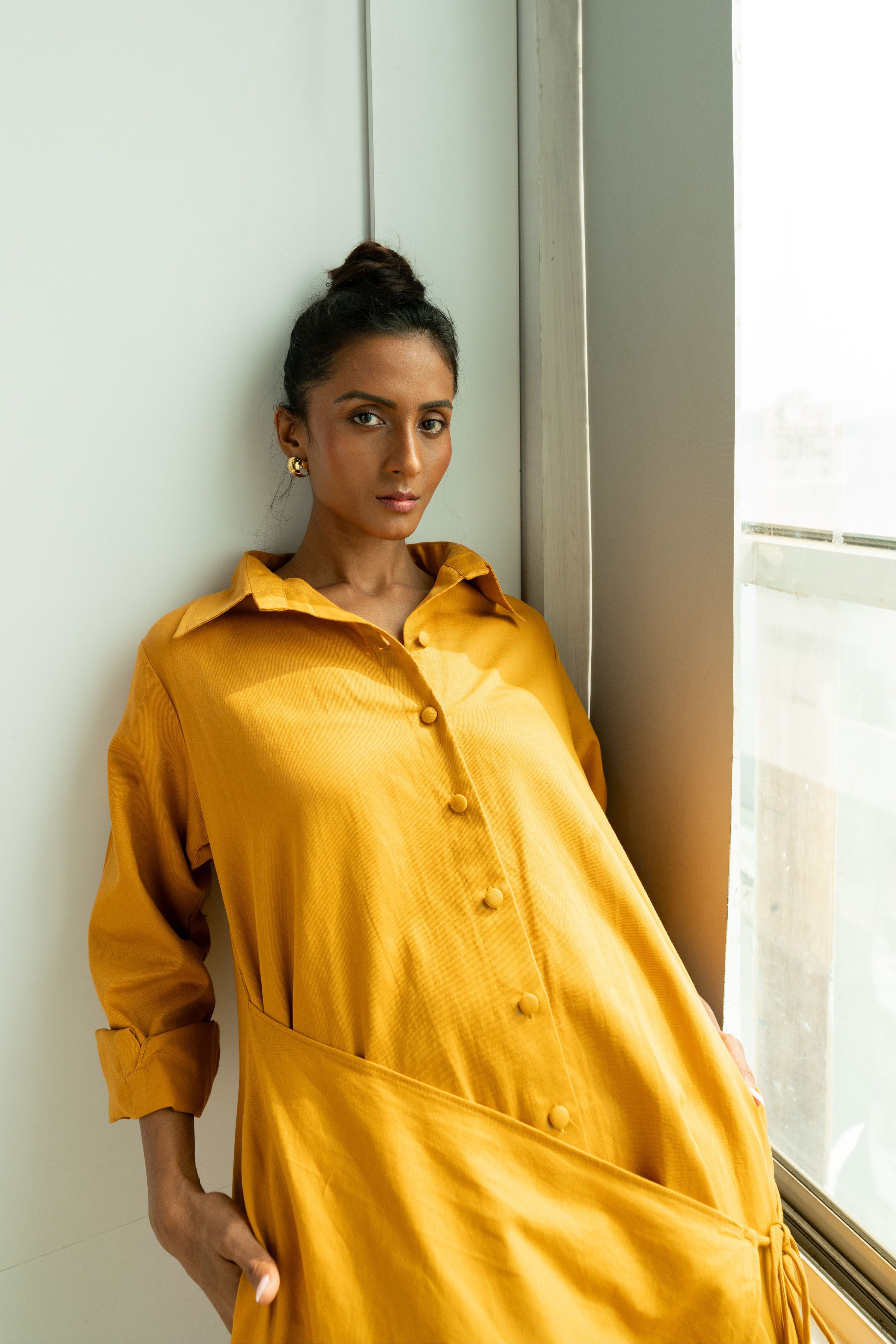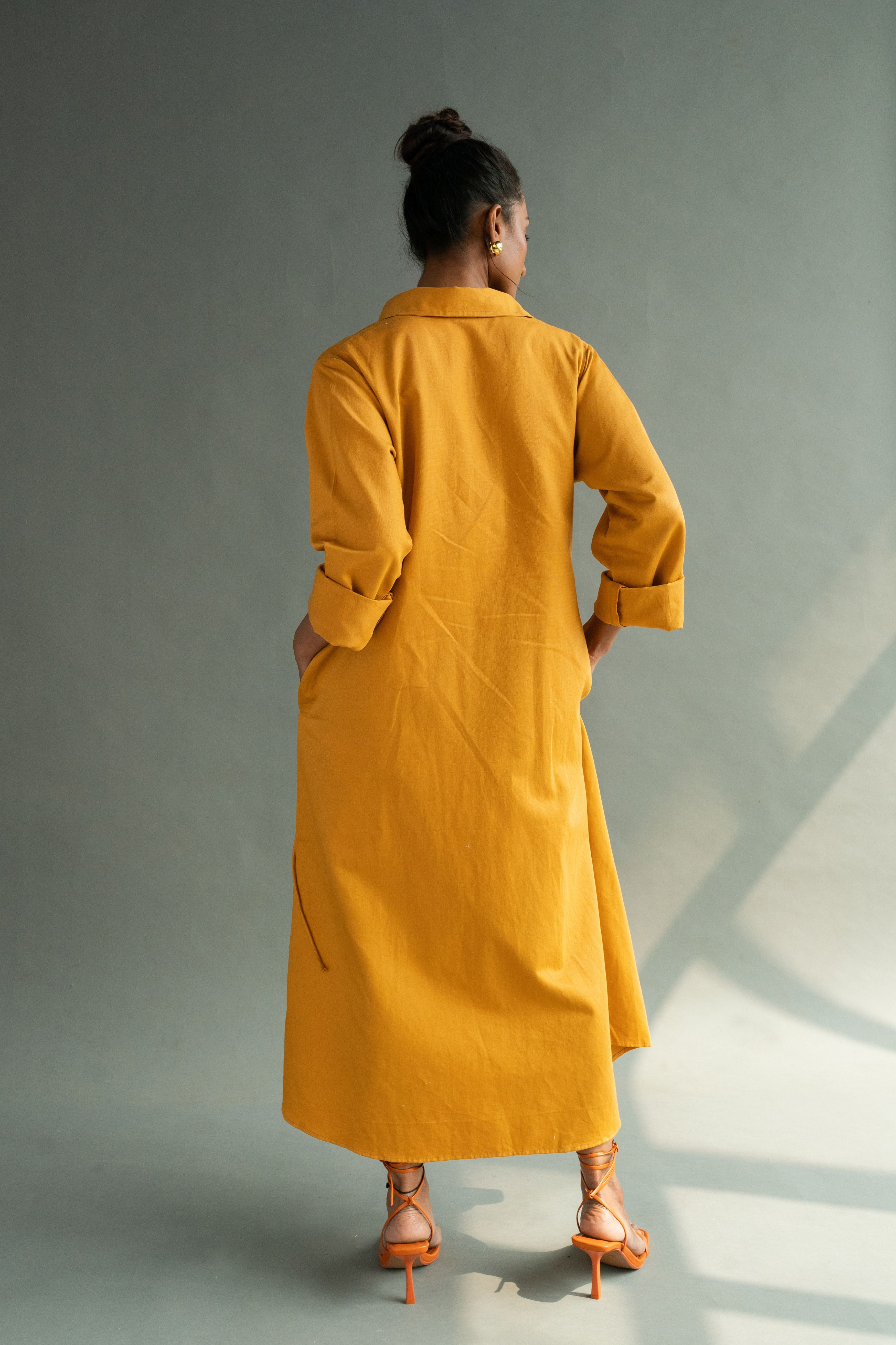 Calf length A- line shirt dress with an overlapping tie detail, featuring self fabric buttons, drop shoulders, in-seam pockets. P.S. It's bump friendly!