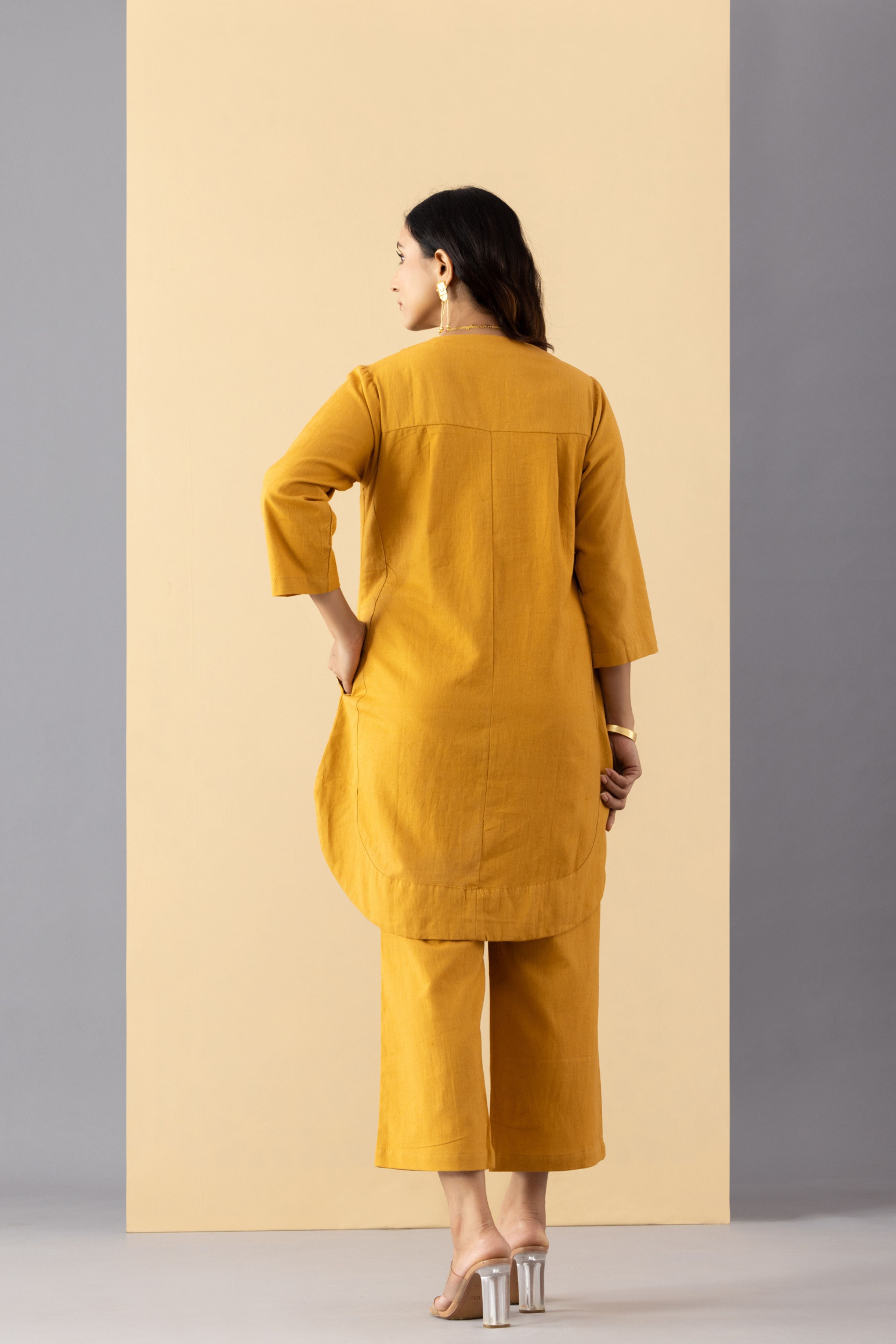 This set comprises of 'Meher monochrome tunic' paired with mustard khadi pants. Set is crafted in light weight Khadi Cotton. This set is made with breathable, comfort fabric. It is perfect for daily wear or festive occasions for that subtle minimal look. - Straight front opening tunic with side pockets - Pleats on the shoulder - high waist pants with side zipper and back elastic - Oversized fit - Model is wearing size S - This is a textile fabric. The subtle imperfections in the weave, texture and colors are a natural outcome of handcrafted textiles and not a defect.