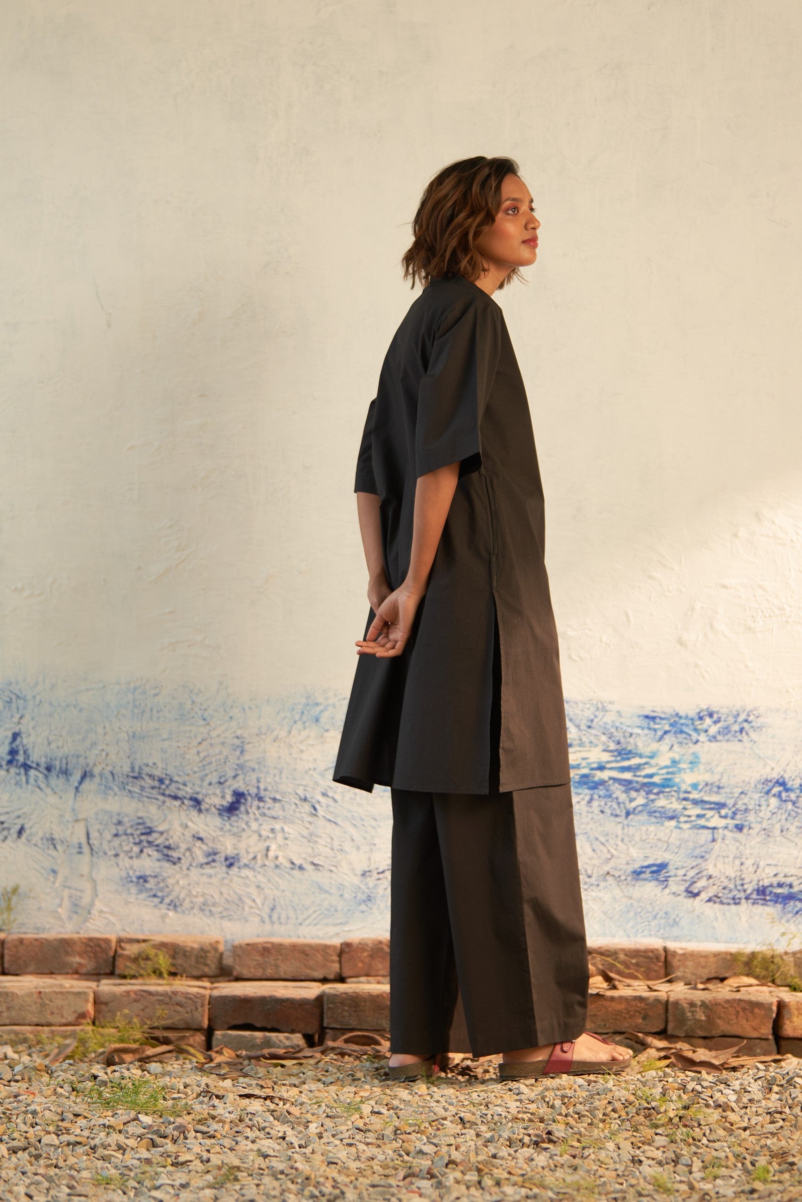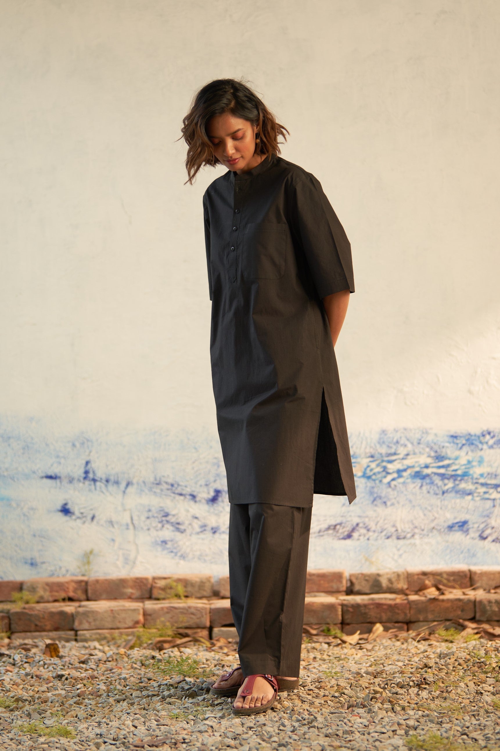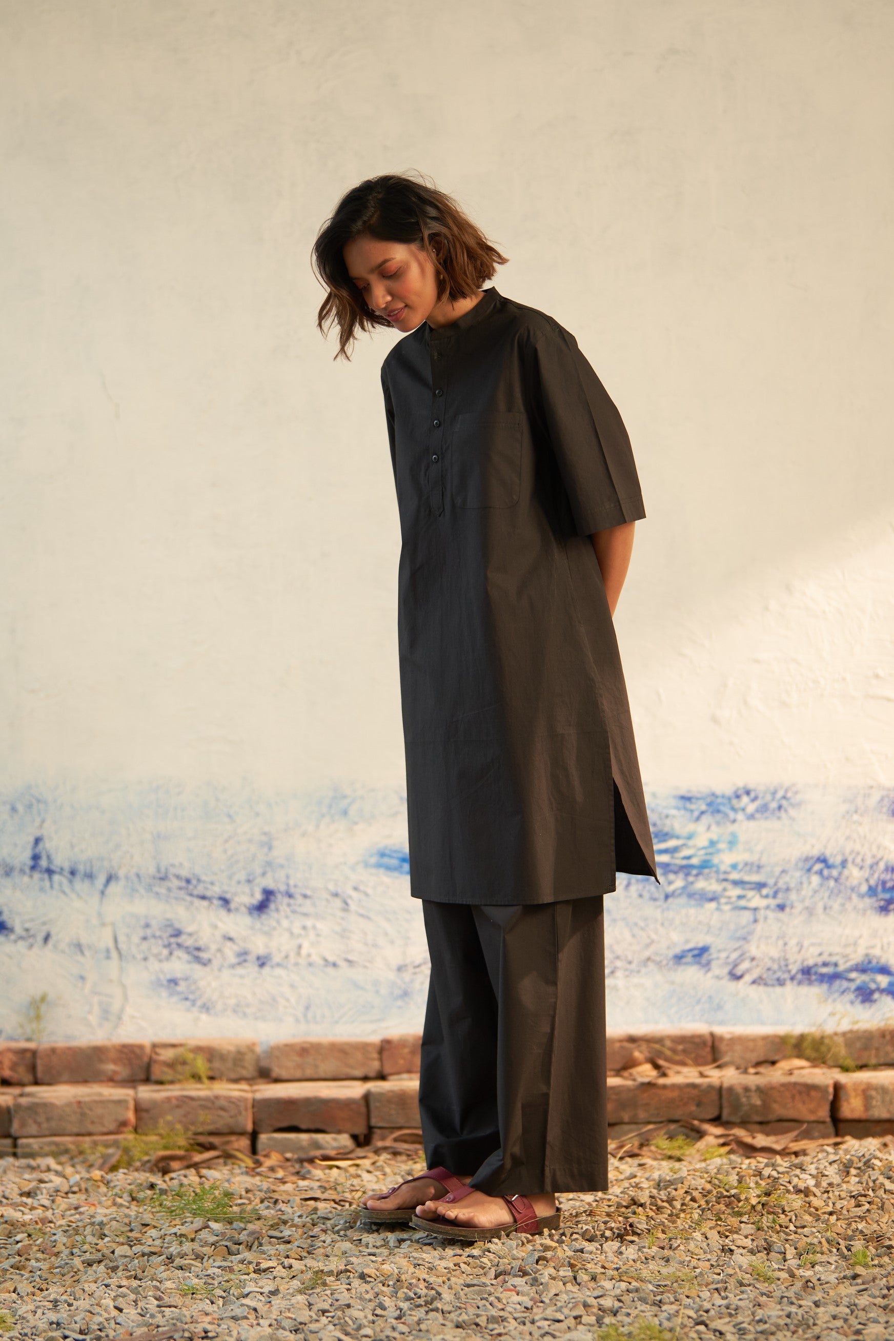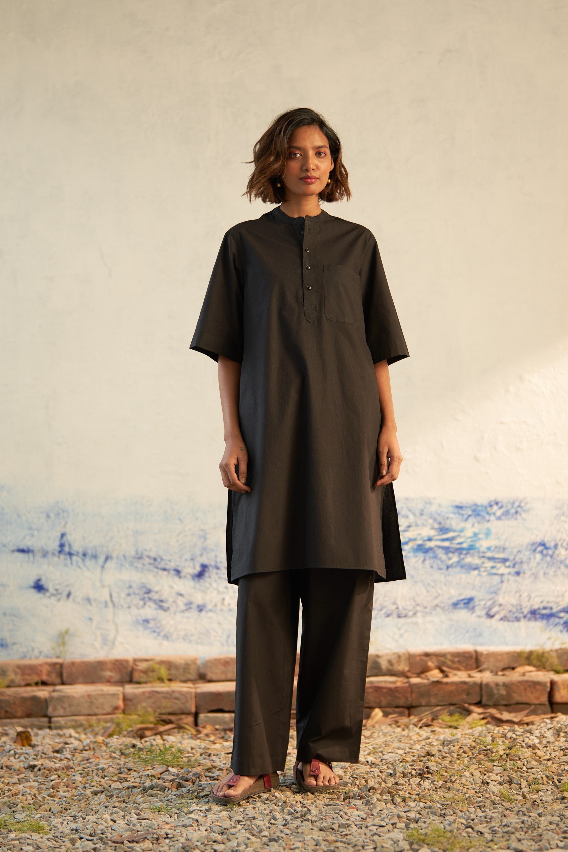 Effortlessly merging style with relaxation, this coord set embodies a spirit of ease, comfort, and spontaneity. Fashioned from premium cotton fabric, it features a band collar and tonal buttons on the placket. Designed with an oversized silhouette for maximum comfort, it effortlessly complements your laid-back vibe. Complete with matching loose elasticated bottoms, this ensemble exudes casual chic.