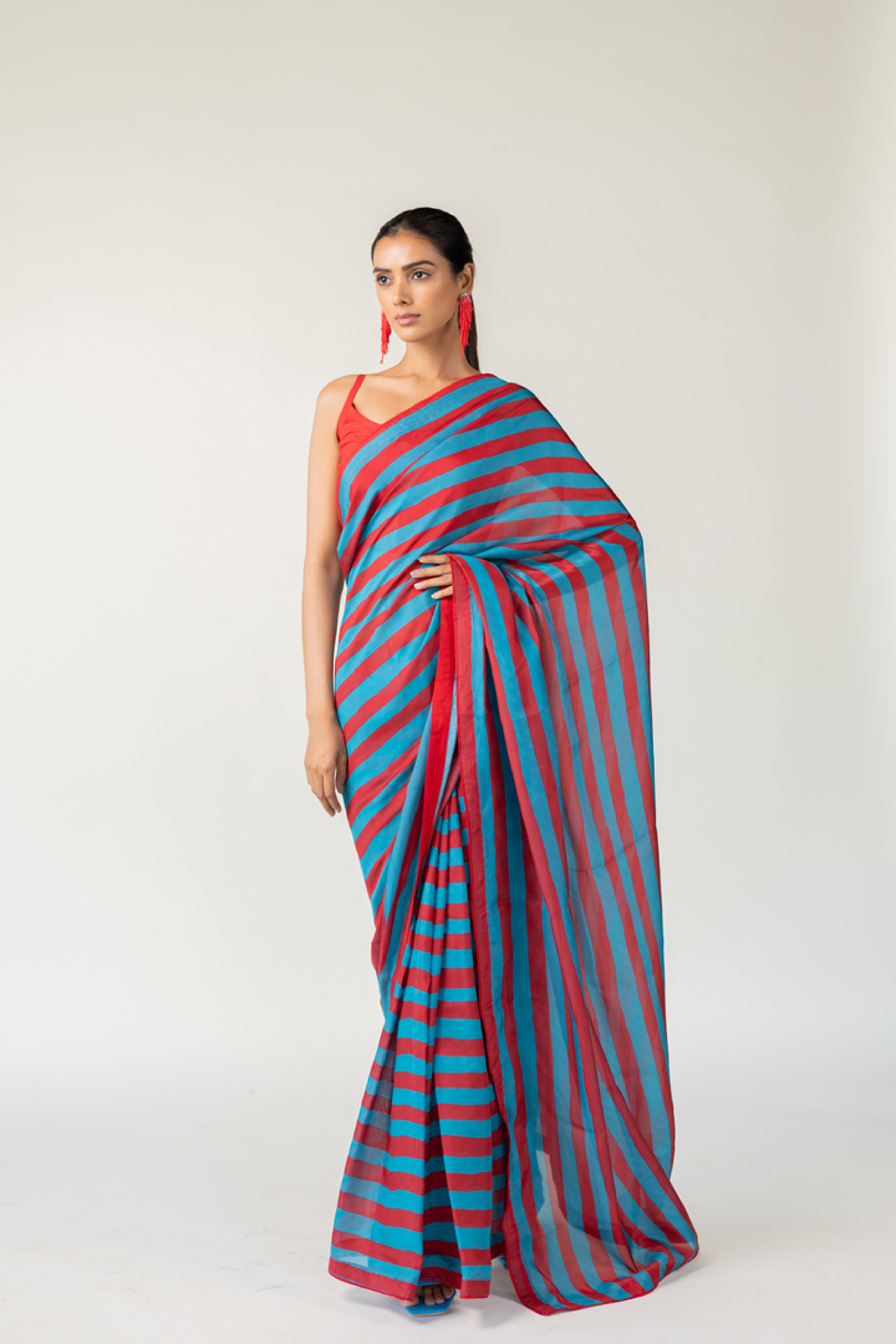 Bold, modern, and unapologetically vibrant ? the Metro Stripe Saree is where confident lines meet fluid grace. With alternating deep red and teal stripes, this saree adds rhythmic energy to a classic silhouette. The rich cotton-silk drapes effortlessly, making it perfect for day-to-night transitions. Saree Length: 5.5 meters