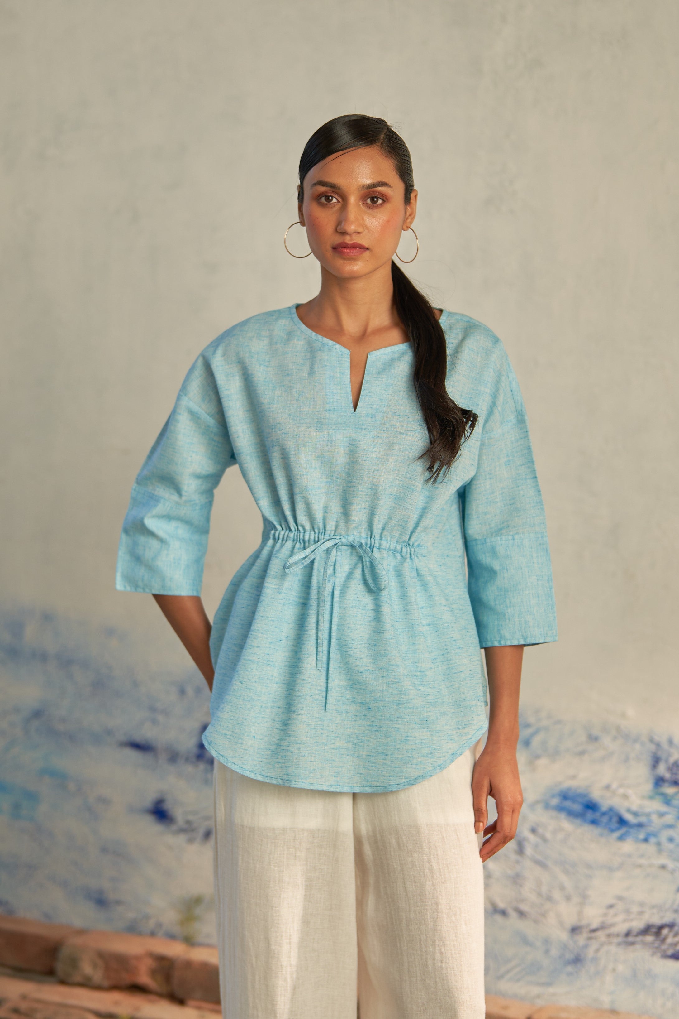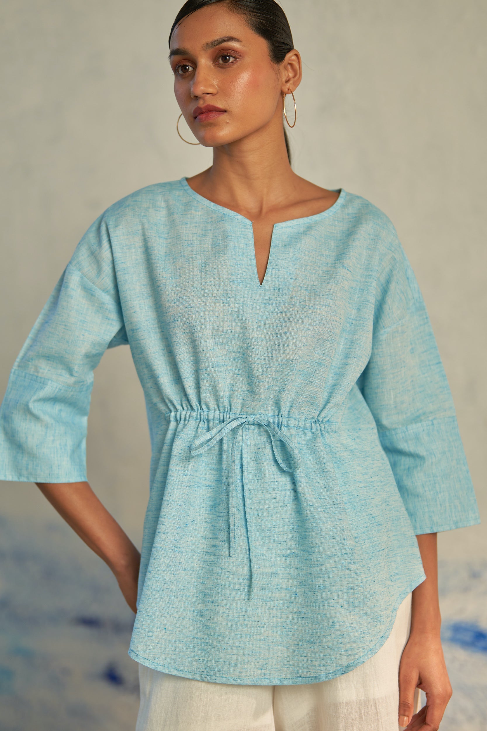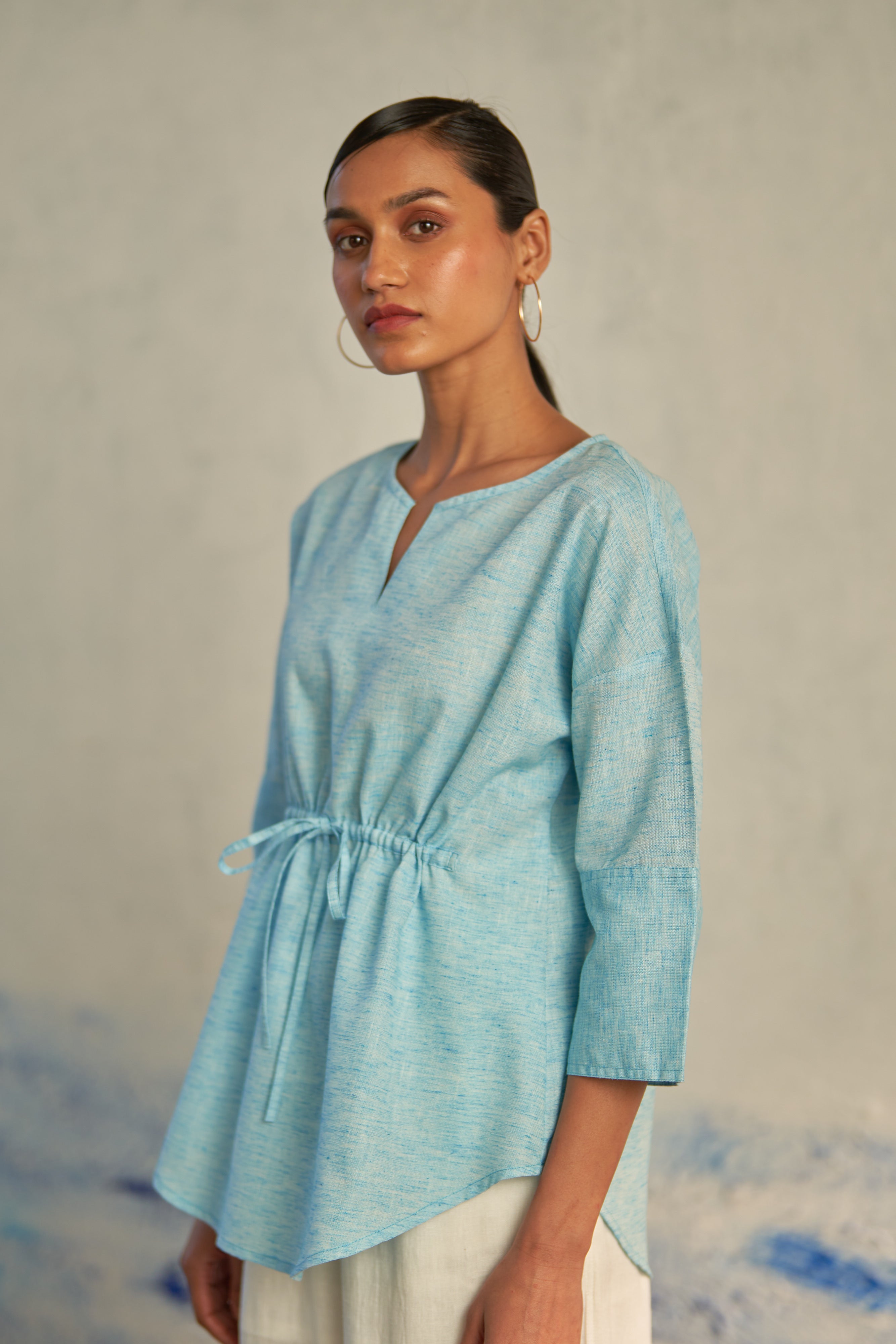 Transporting you to vibrant Miami with its captivating blue hue, this drawstring top is designed to seamlessly complement the items already gracing your wardrobe. Crafted from textured cotton, the drawstring detailing along the waistline forms intriguing gathers on top, guaranteeing a flattering fit for all body types.