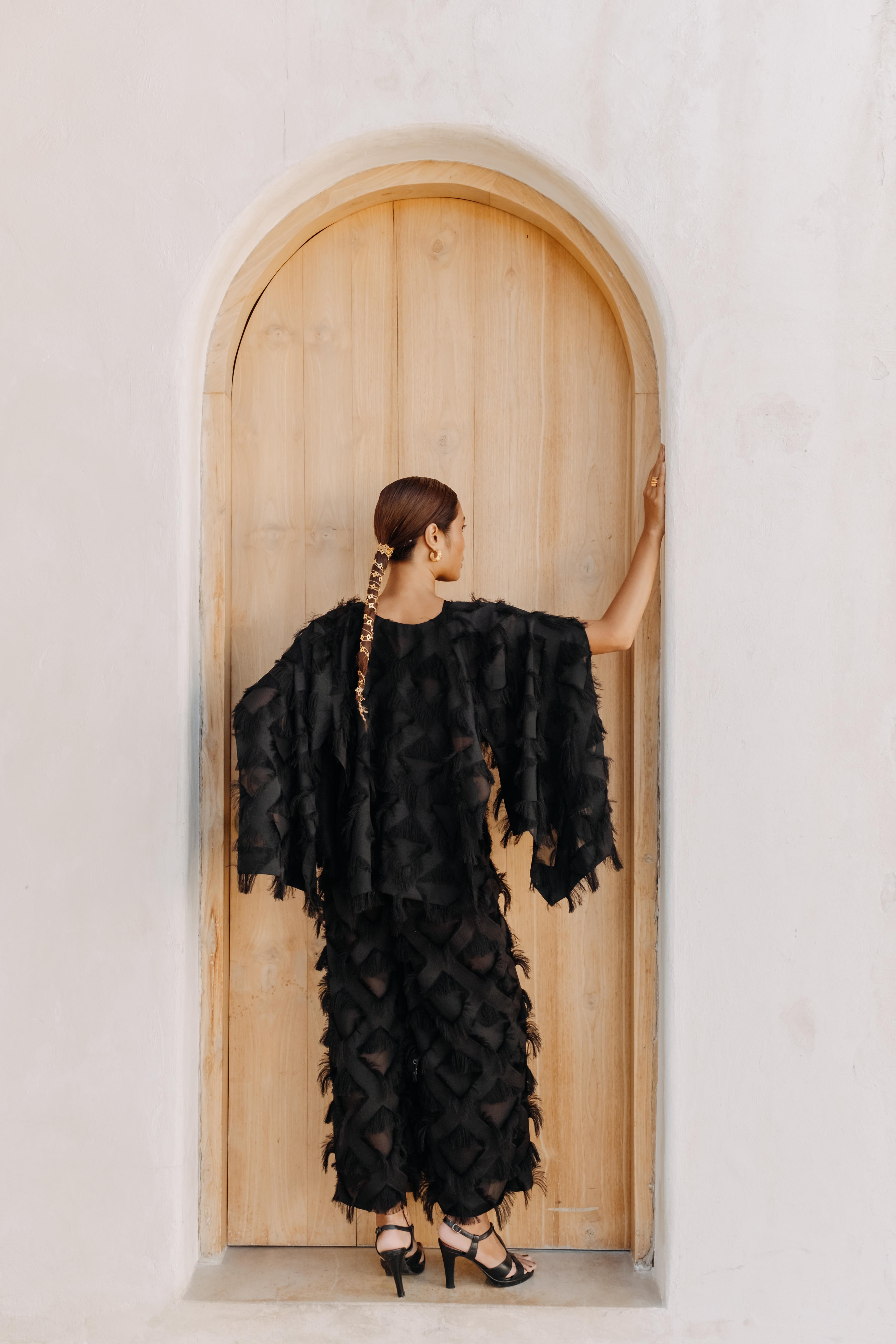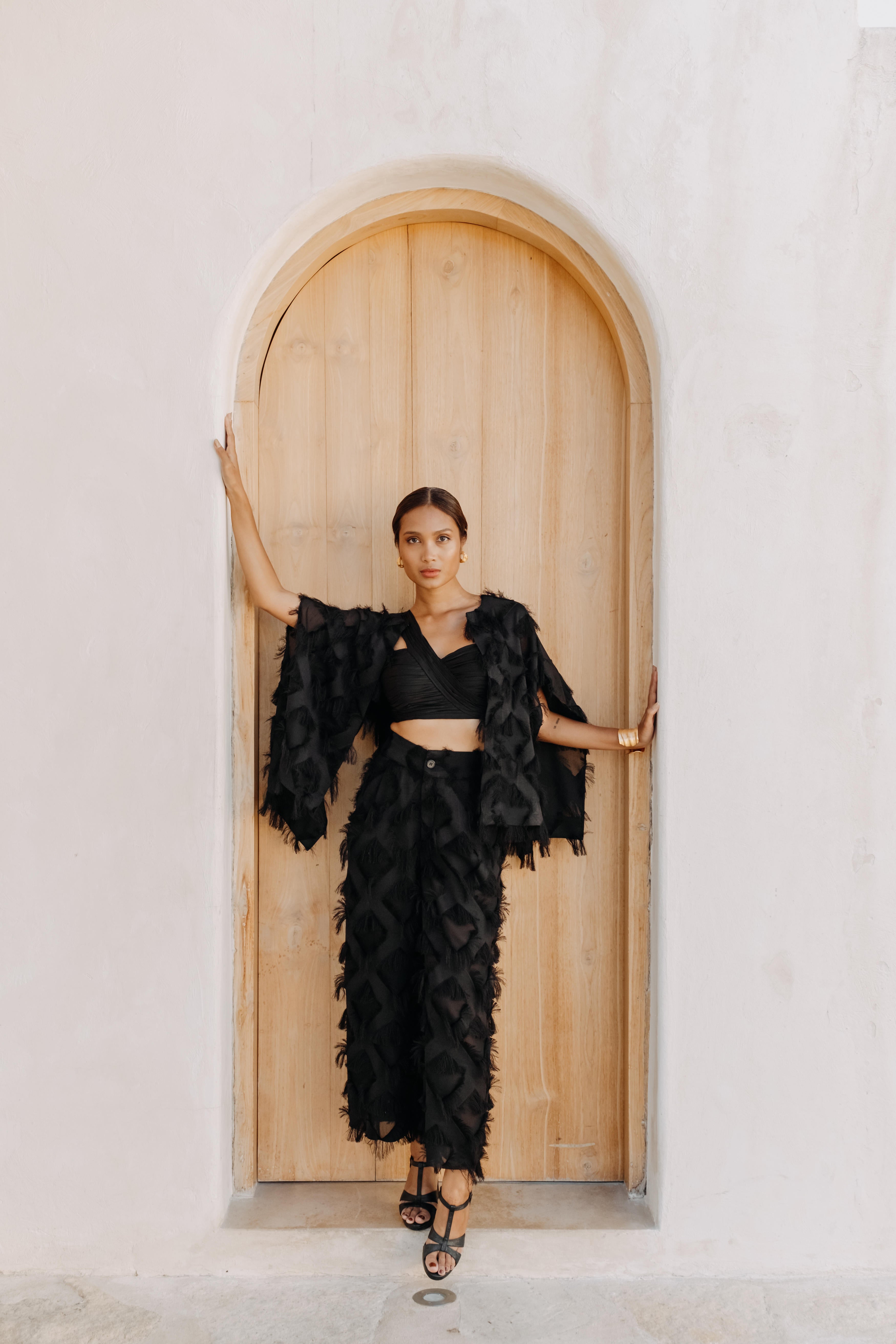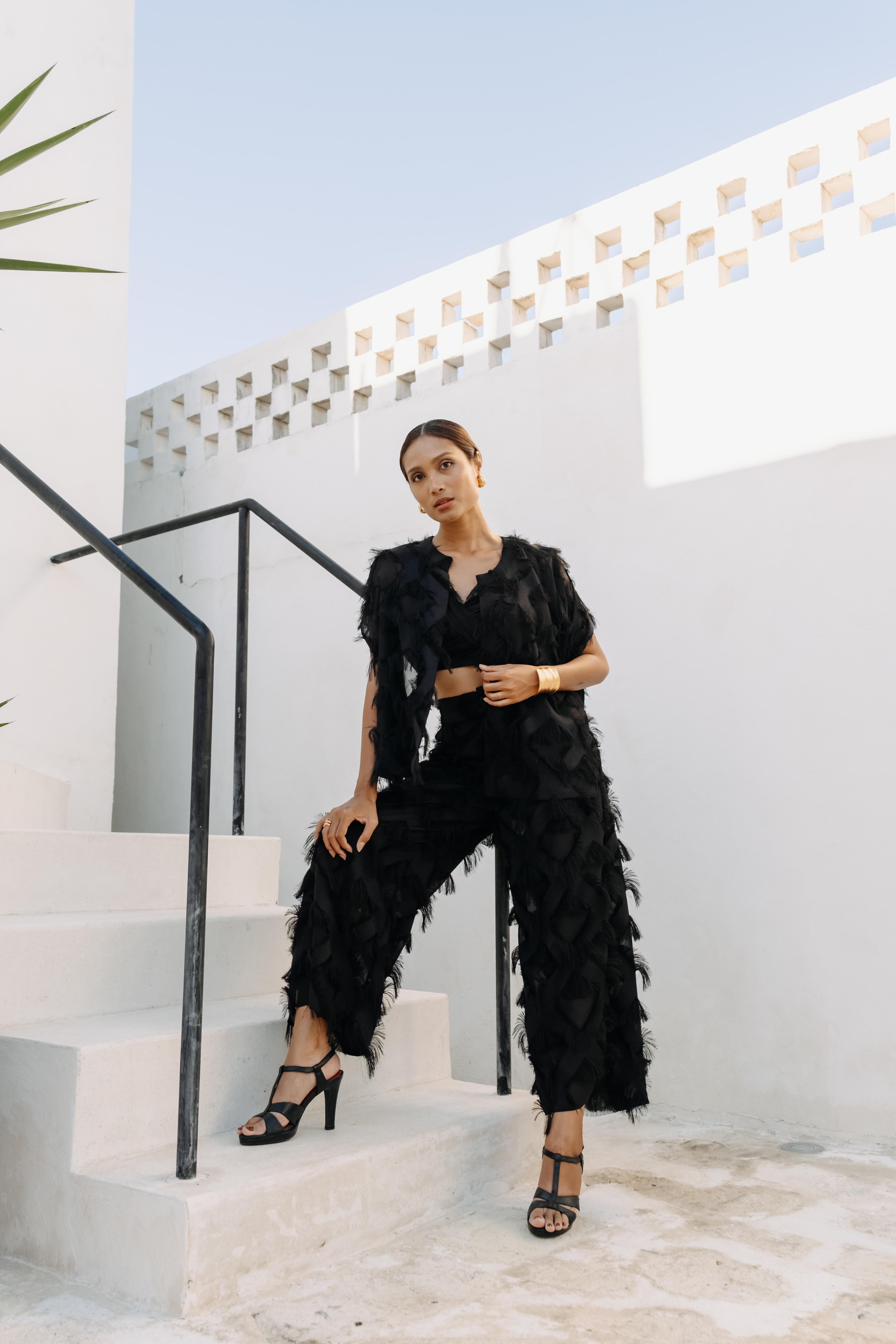 3 Piece Co-ord Set featuring hand draped bustier in silk satin, cape and pants in textured fringe detailed fabric. Discover the harmony of design in our Midnight Magic Coords. This product will be exclusively handcrafted for you, making the pattern/texture/color slightly vary from the image shown, due to multiple artisan led techniques and processes involved. Color may also slightly vary due to photographic lighting sources. Cape length :23" Pant Length :38" Bustier Length :14"