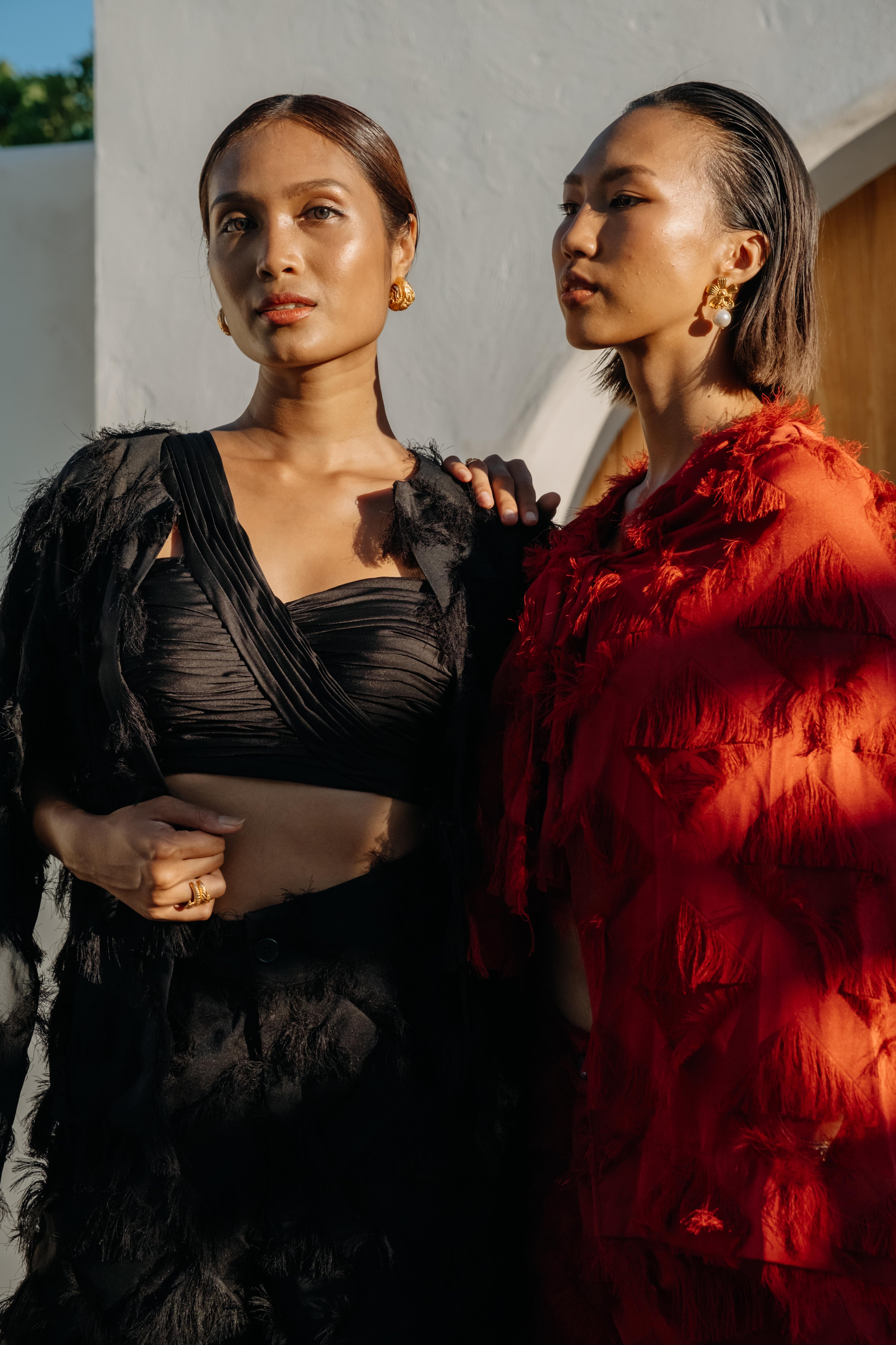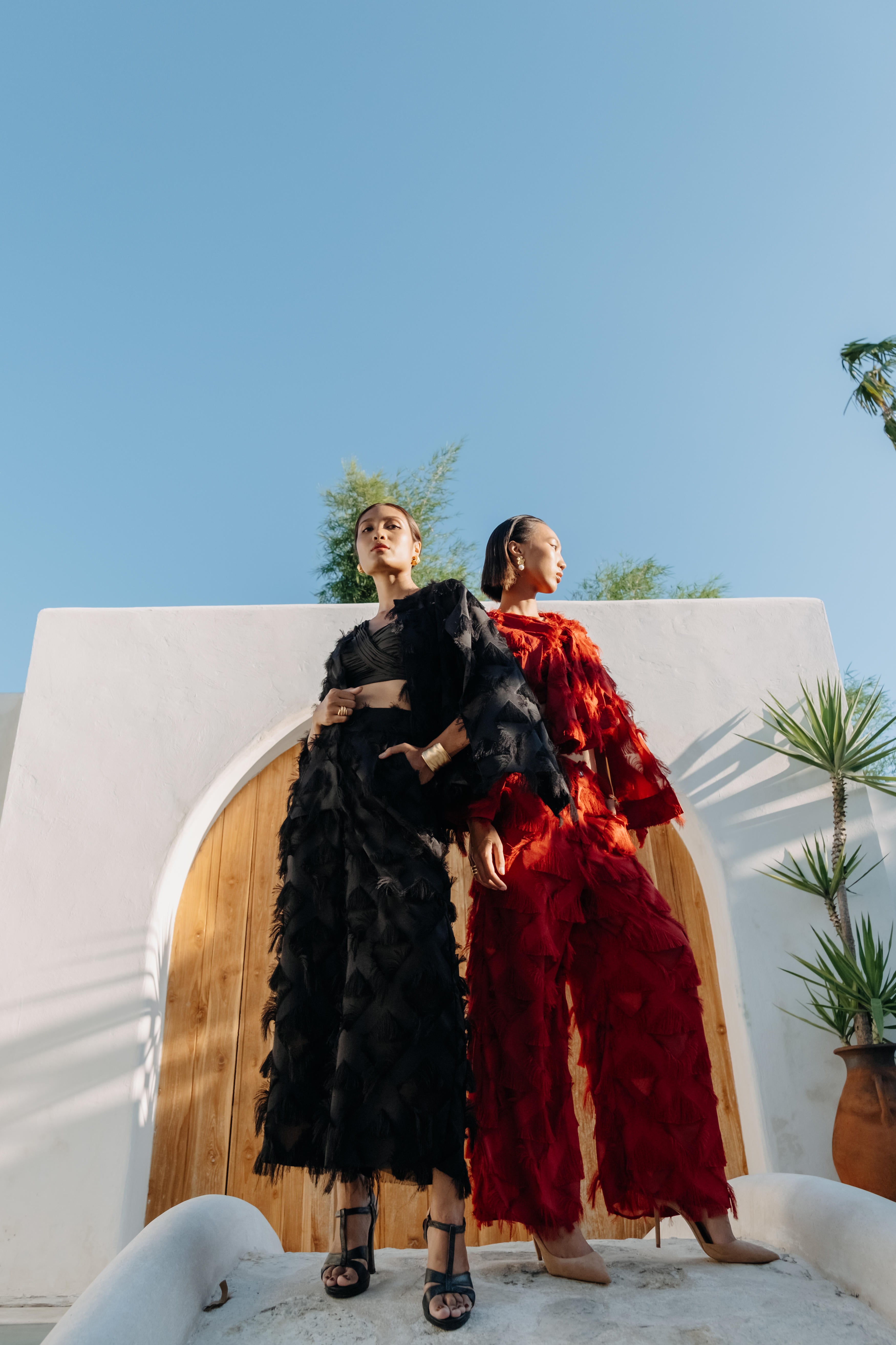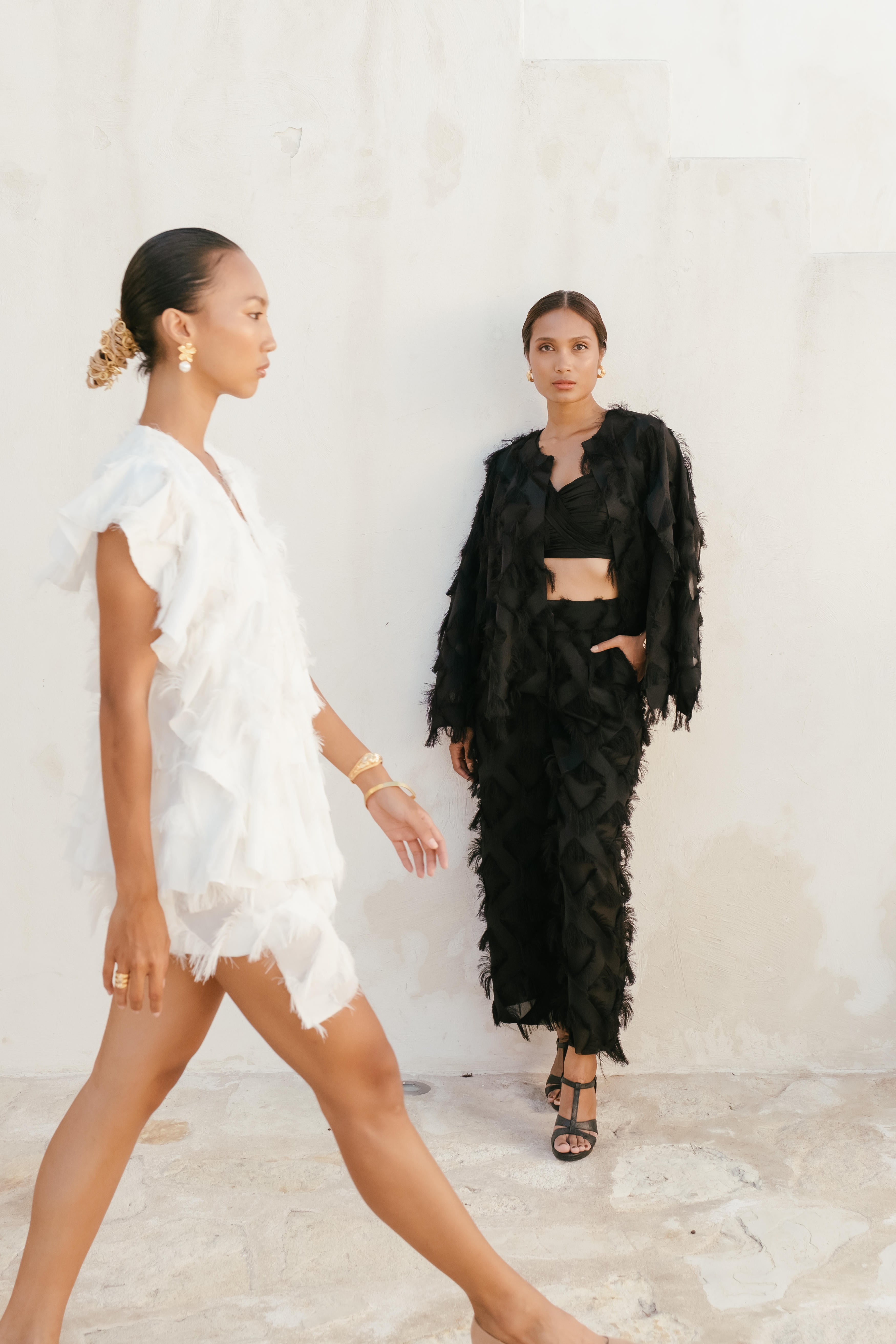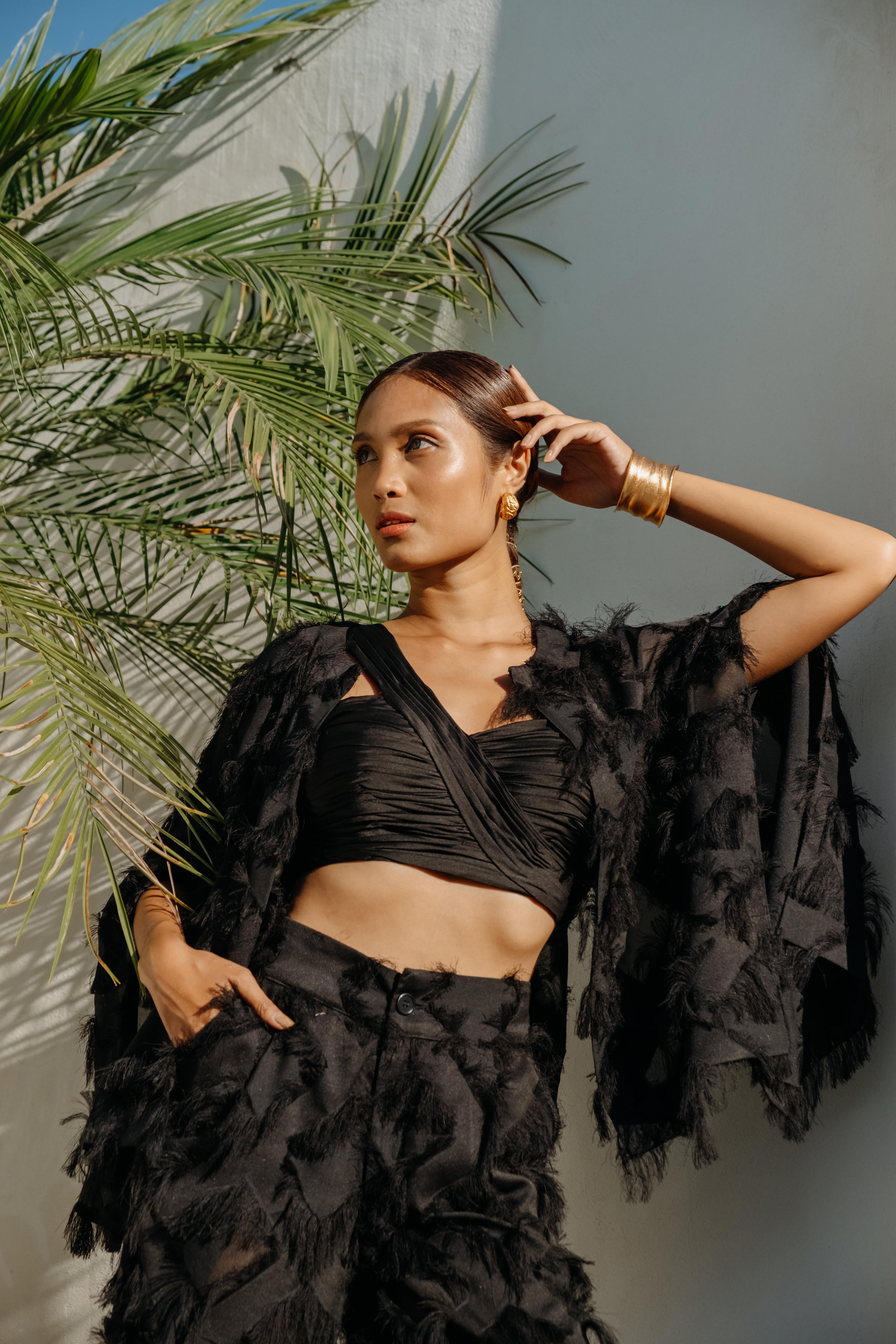 3 Piece Co-ord Set featuring hand draped bustier in silk satin, cape and pants in textured fringe detailed fabric. Discover the harmony of design in our Midnight Magic Coords. This product will be exclusively handcrafted for you, making the pattern/texture/color slightly vary from the image shown, due to multiple artisan led techniques and processes involved. Color may also slightly vary due to photographic lighting sources. Cape length :23" Pant Length :38" Bustier Length :14"