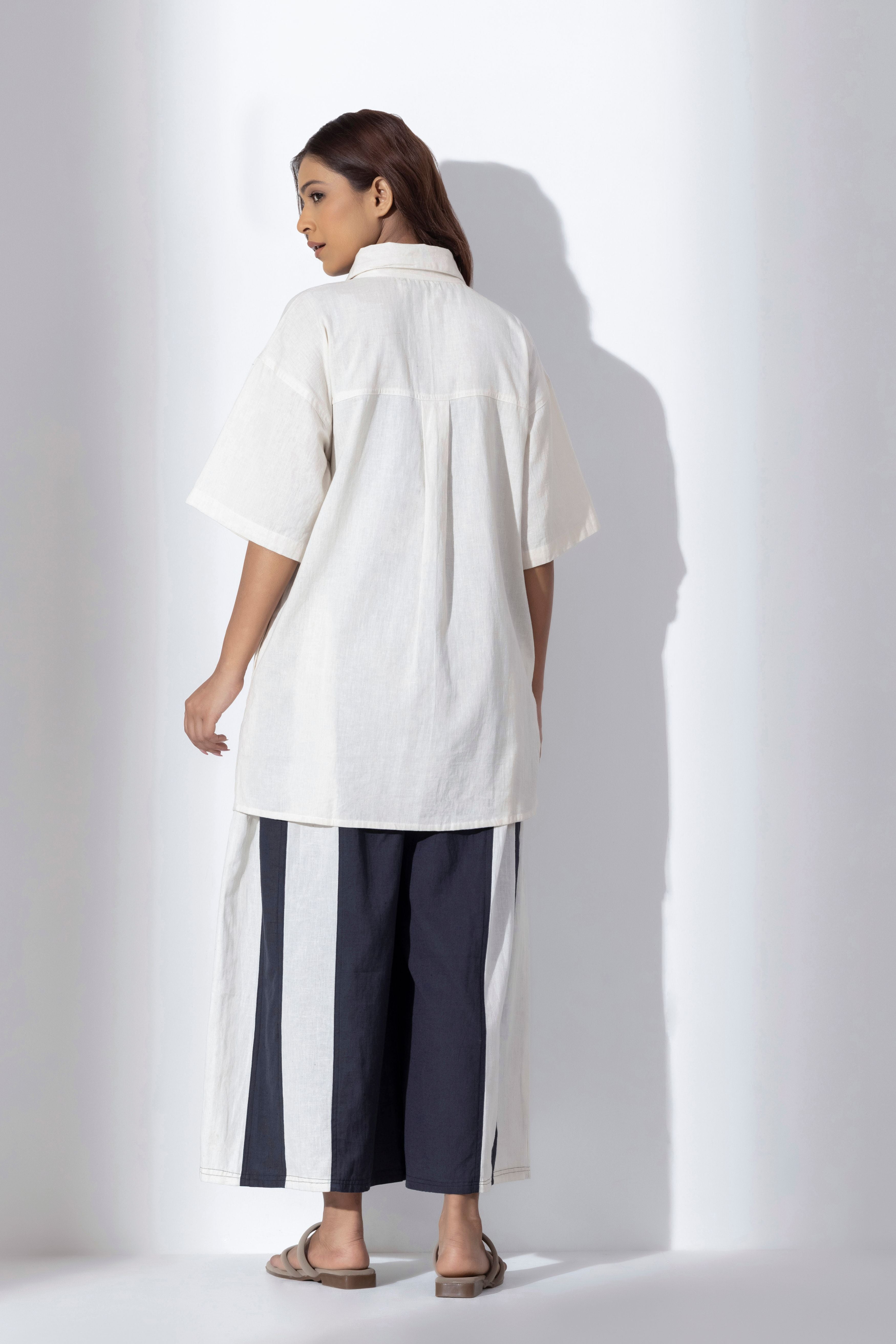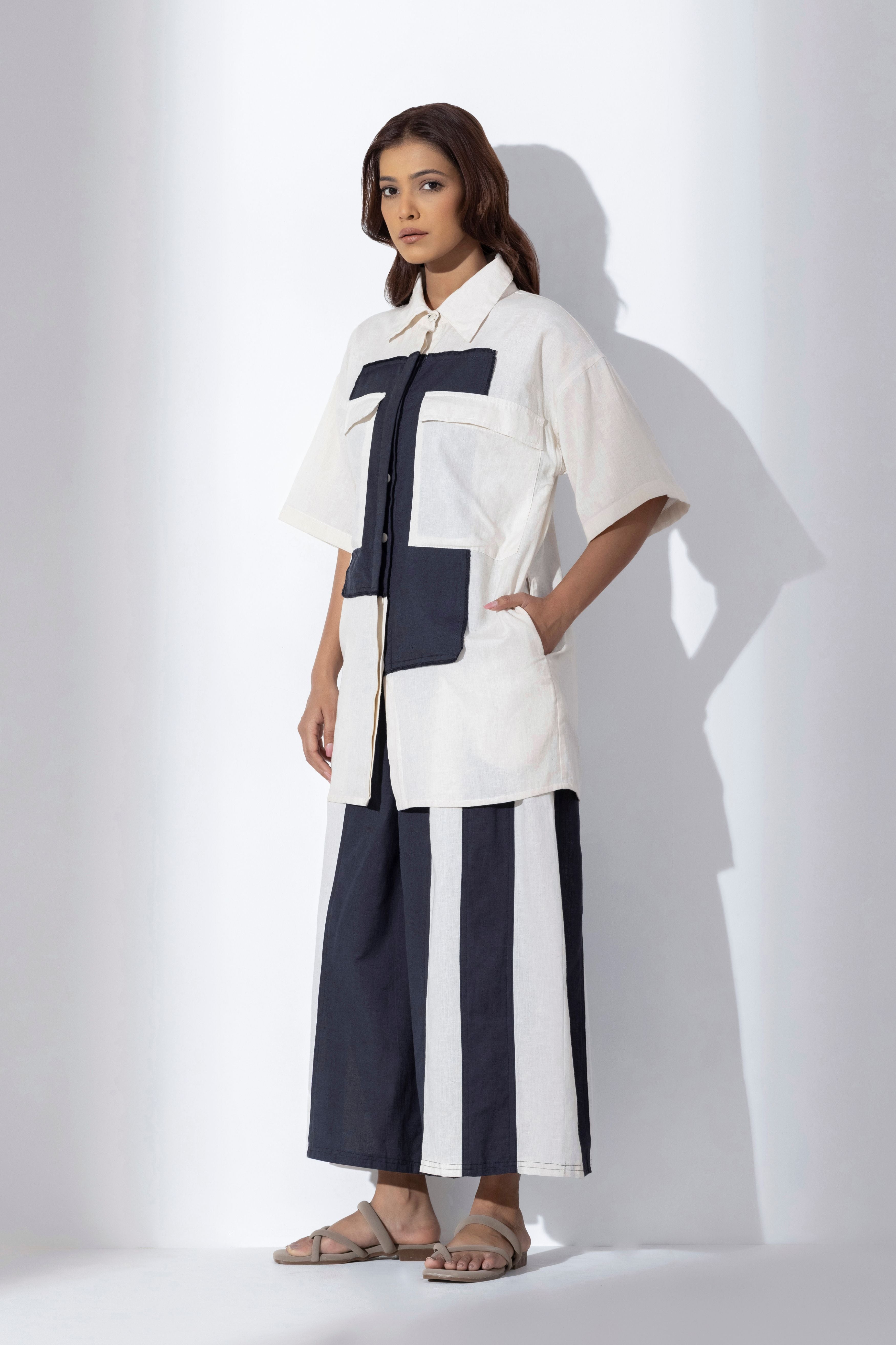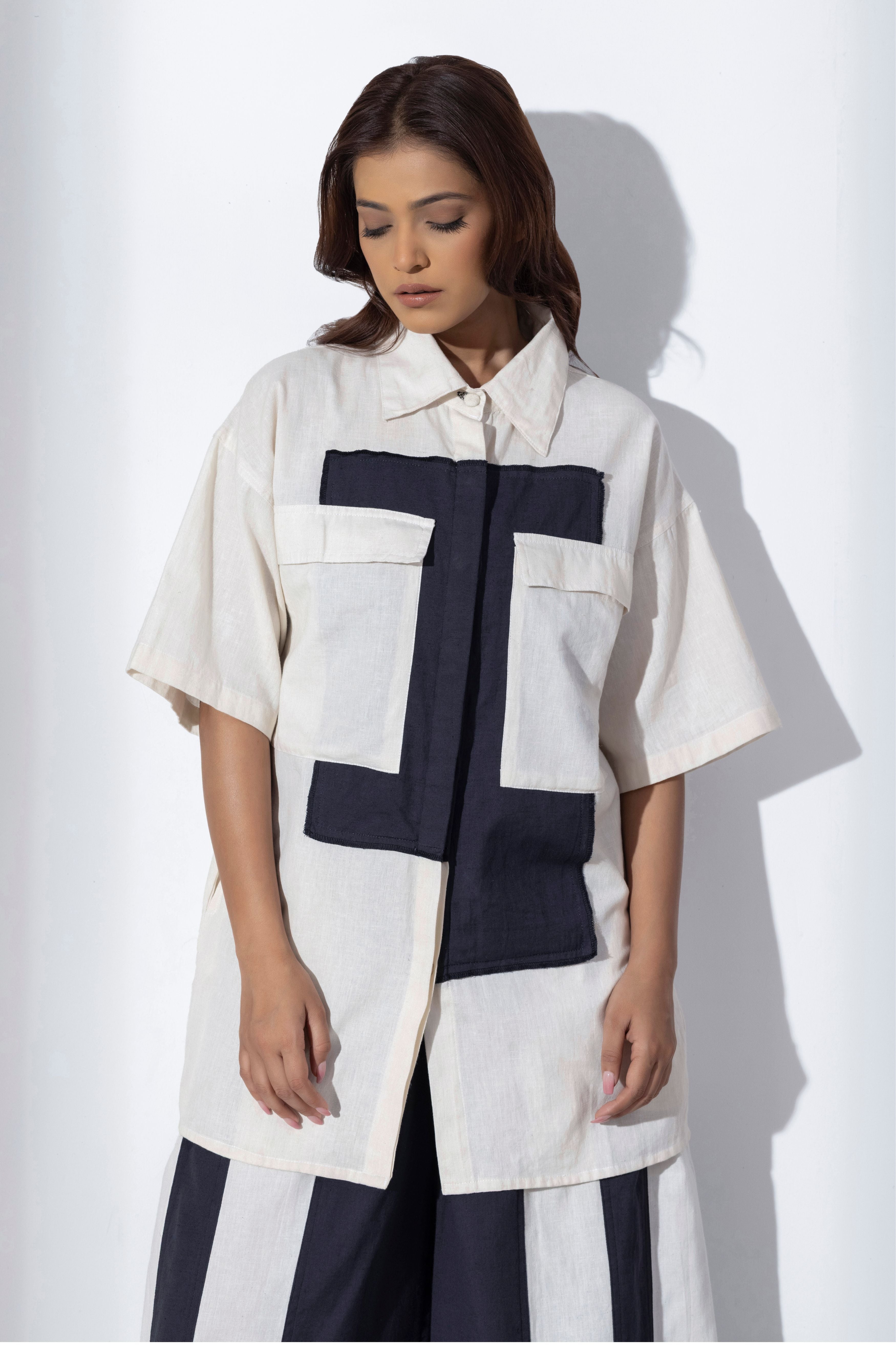 Mikaii Shirt - intricately designed button down shirt in chambray cotton with front appliqu? panels and giant pockets detailing. This shirt can be coordinated with our Mikaii high-waisted Pants. This shirt is comfort lifestyle inspired , perfect for all seasons. - Front concealed placket opening , side pockets  - Black appliqu? panelling  - Comfort oversized fit - Model is wearing size S - This is a textile fabric. The subtle imperfections in the weave, texture and colors are a natural outcome of handcrafted textiles and not a defect.