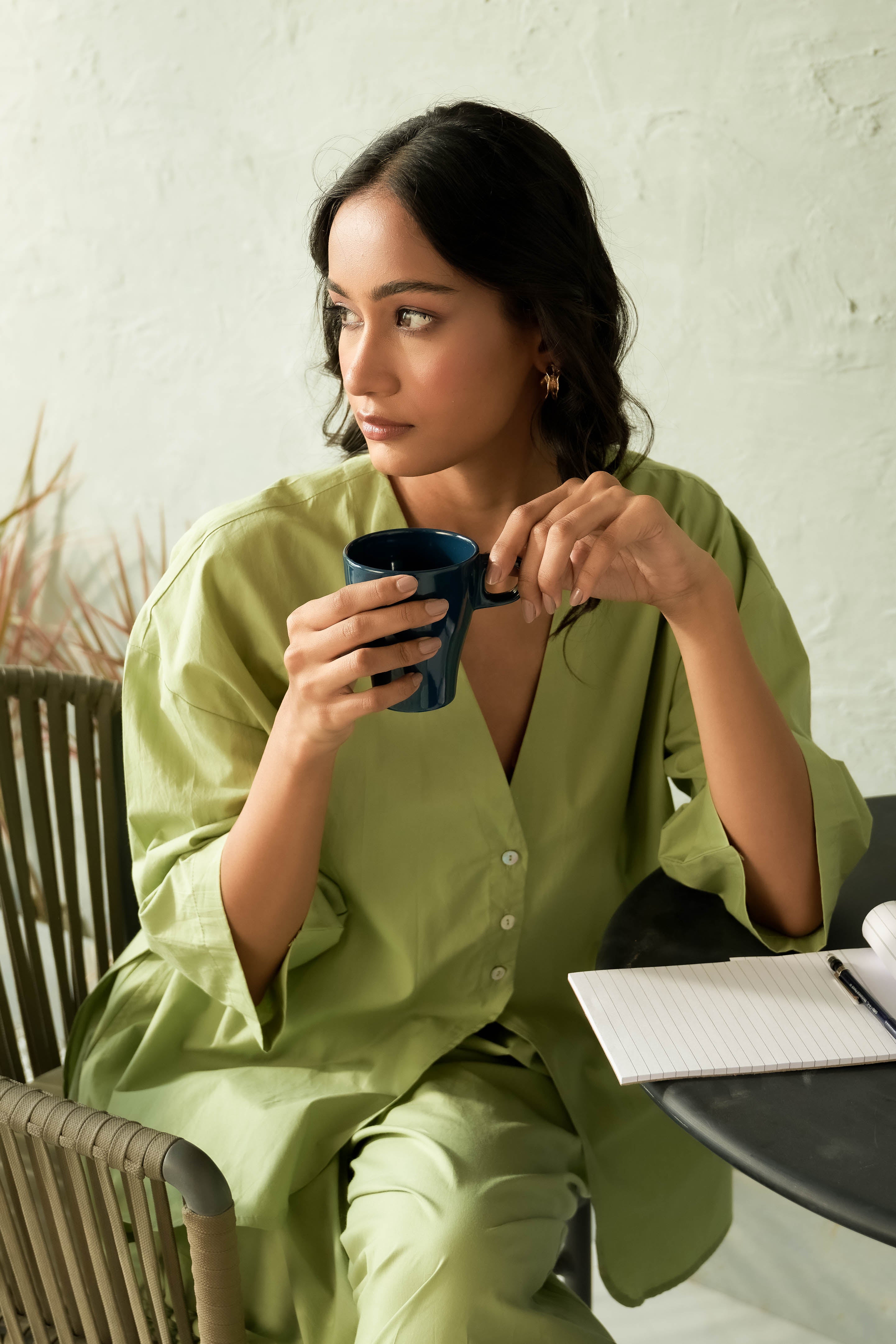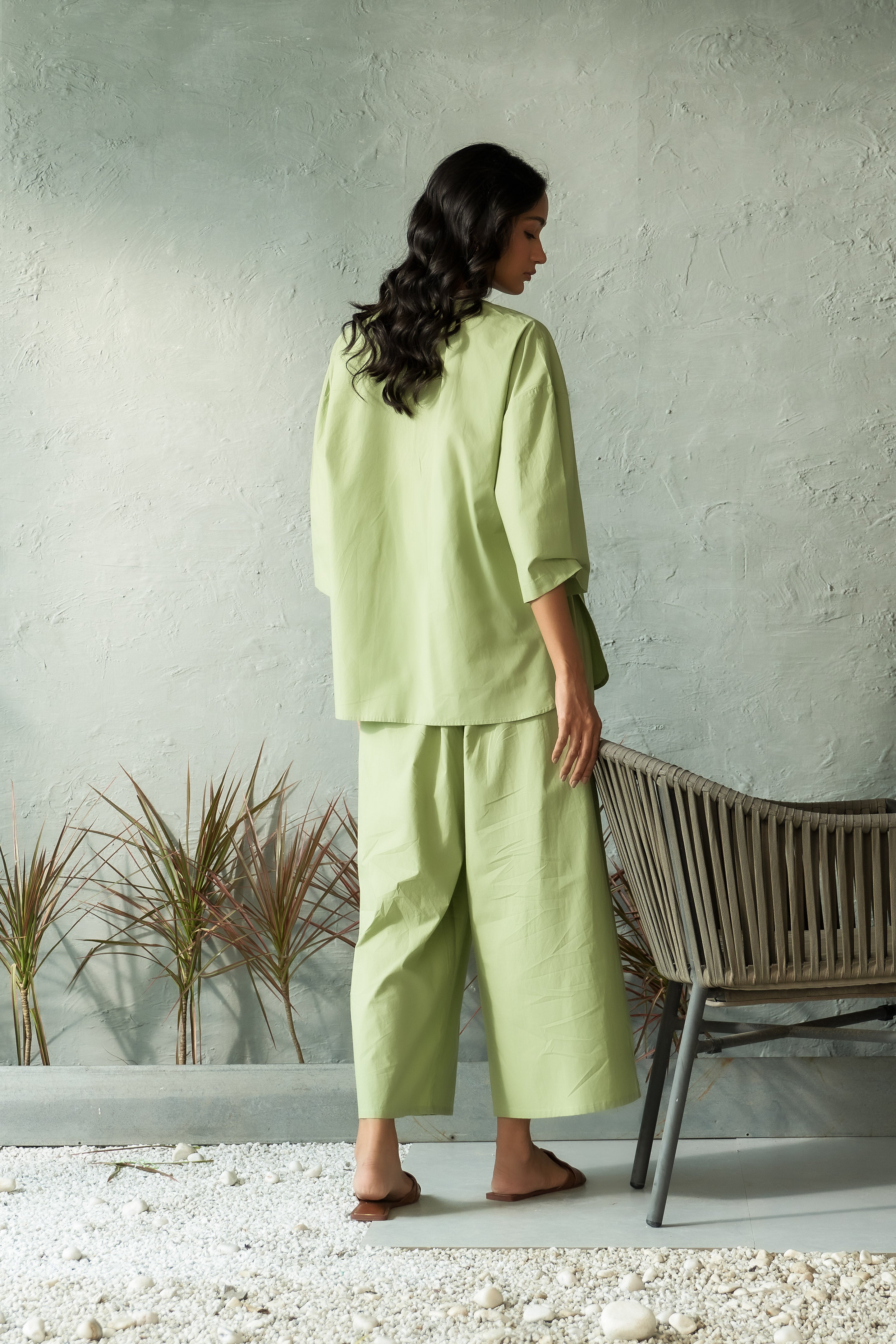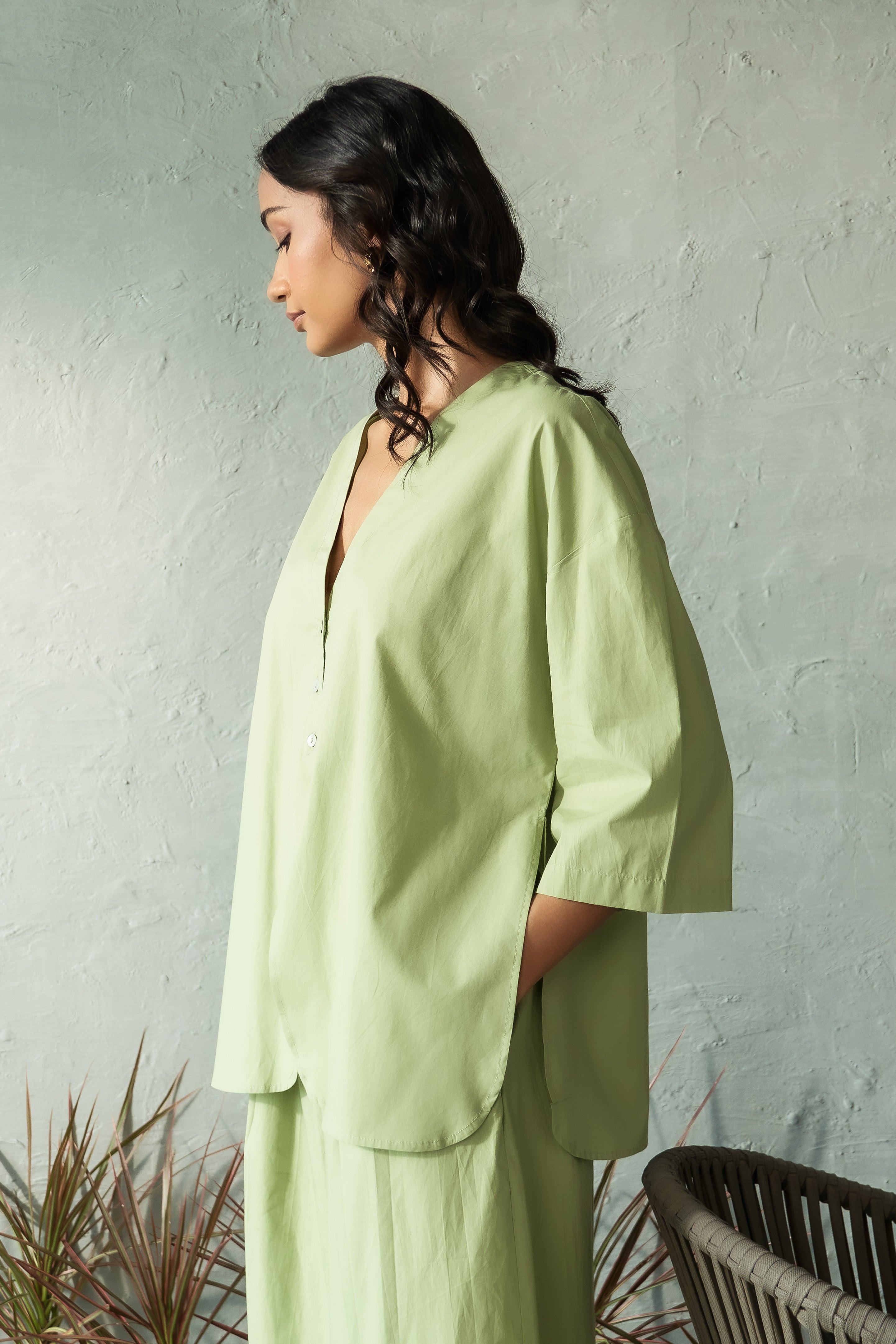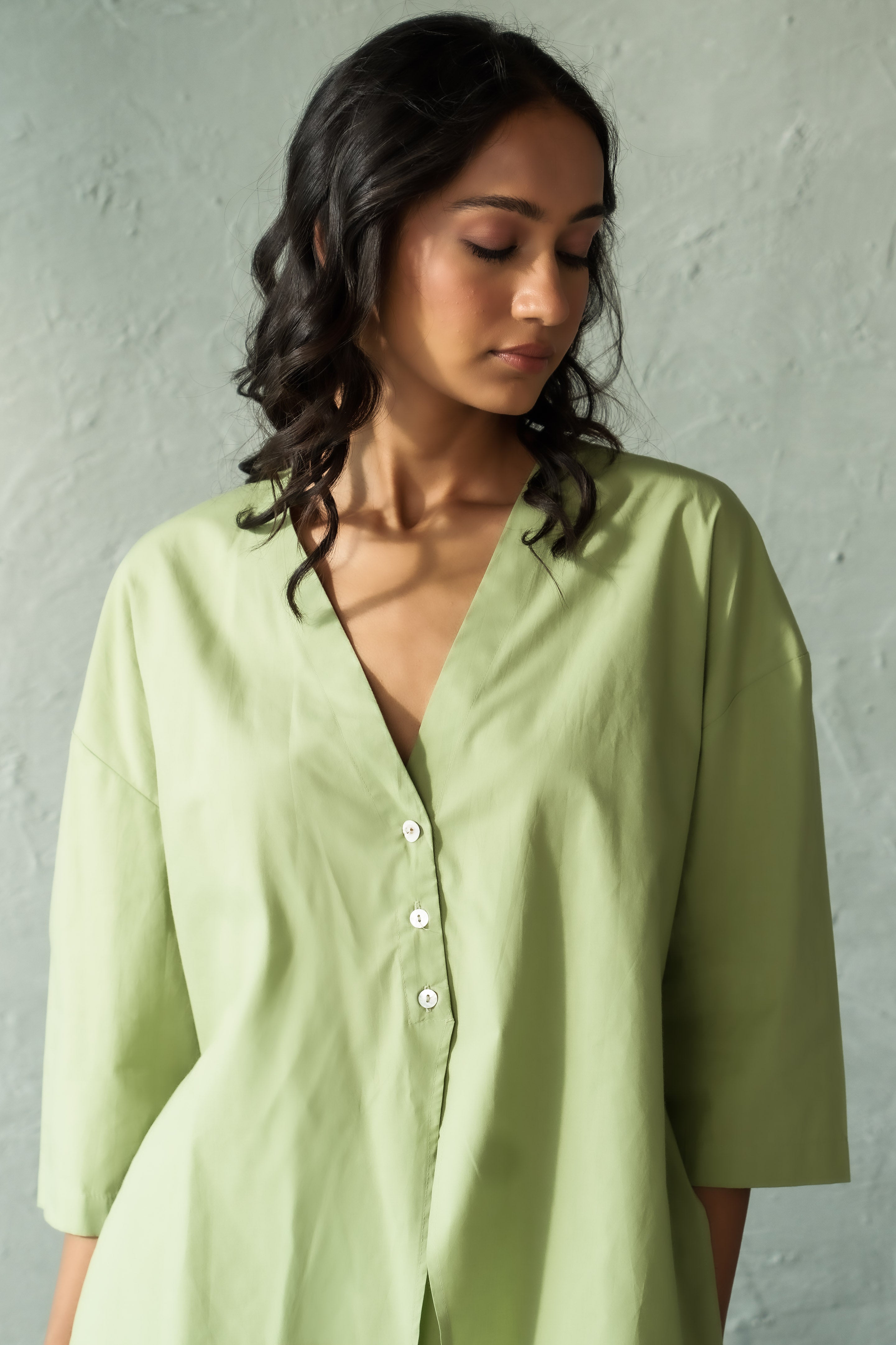Refresh your wardrobe with our chic mint unbounded shirt, designed for those who love effortless style with a relaxed fit. Made from lightweight, breathable fabric, this shirt offers maximum comfort while keeping you on-trend. Its versatile silhouette pairs perfectly with jeans, trousers, or shorts for both casual and semi-formal looks. The mint hue adds a refreshing pop of color, ideal for layering or wearing on its own. Collarless style with a V neck and shell button detailing, this oversized shirt is your go-to piece for easy, everyday elegance.