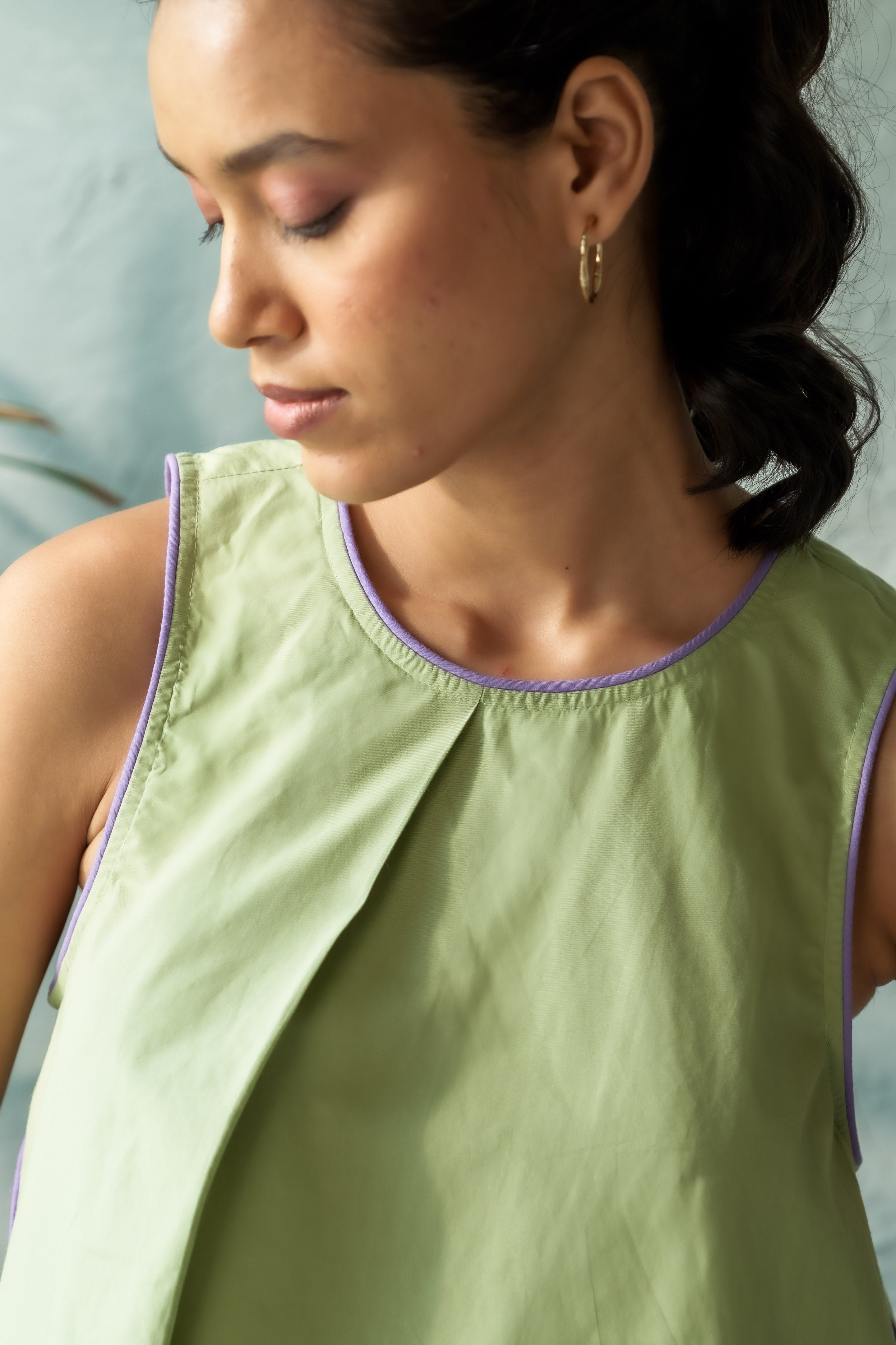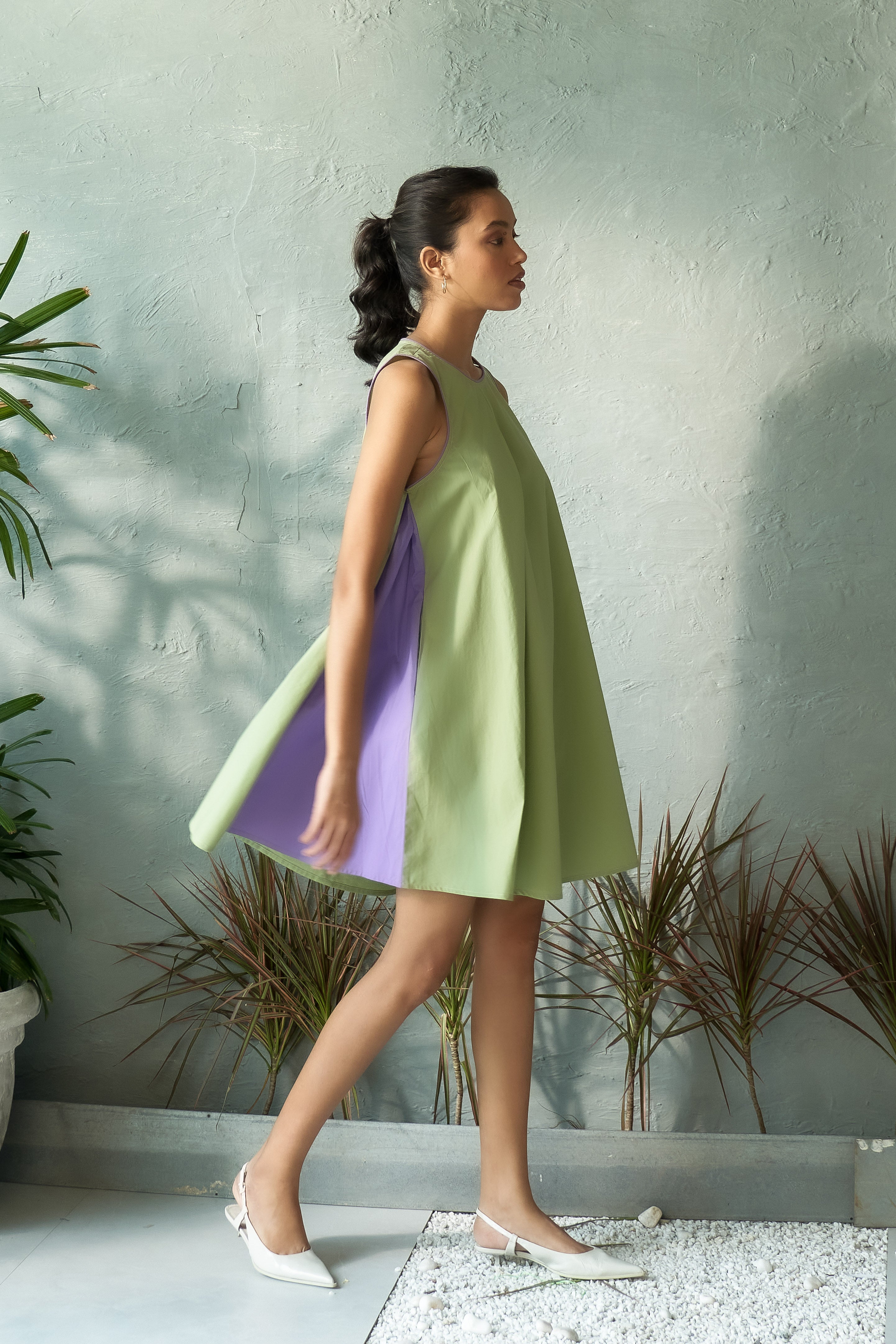 This short mint-hued dress strikes the ideal balance between minimalism and elegance, offering a relaxed yet stylish vibe. The contrast side panels and piping along the neckline and armholes lend a contemporary edge to the classic design, creating a flattering silhouette with added visual interest. Crafted from soft, flowing fabric, this dress is perfect for everything from casual outings to more refined occasions, keeping you comfortable while exuding effortless style. Just add your go-to accessories to complete the look.