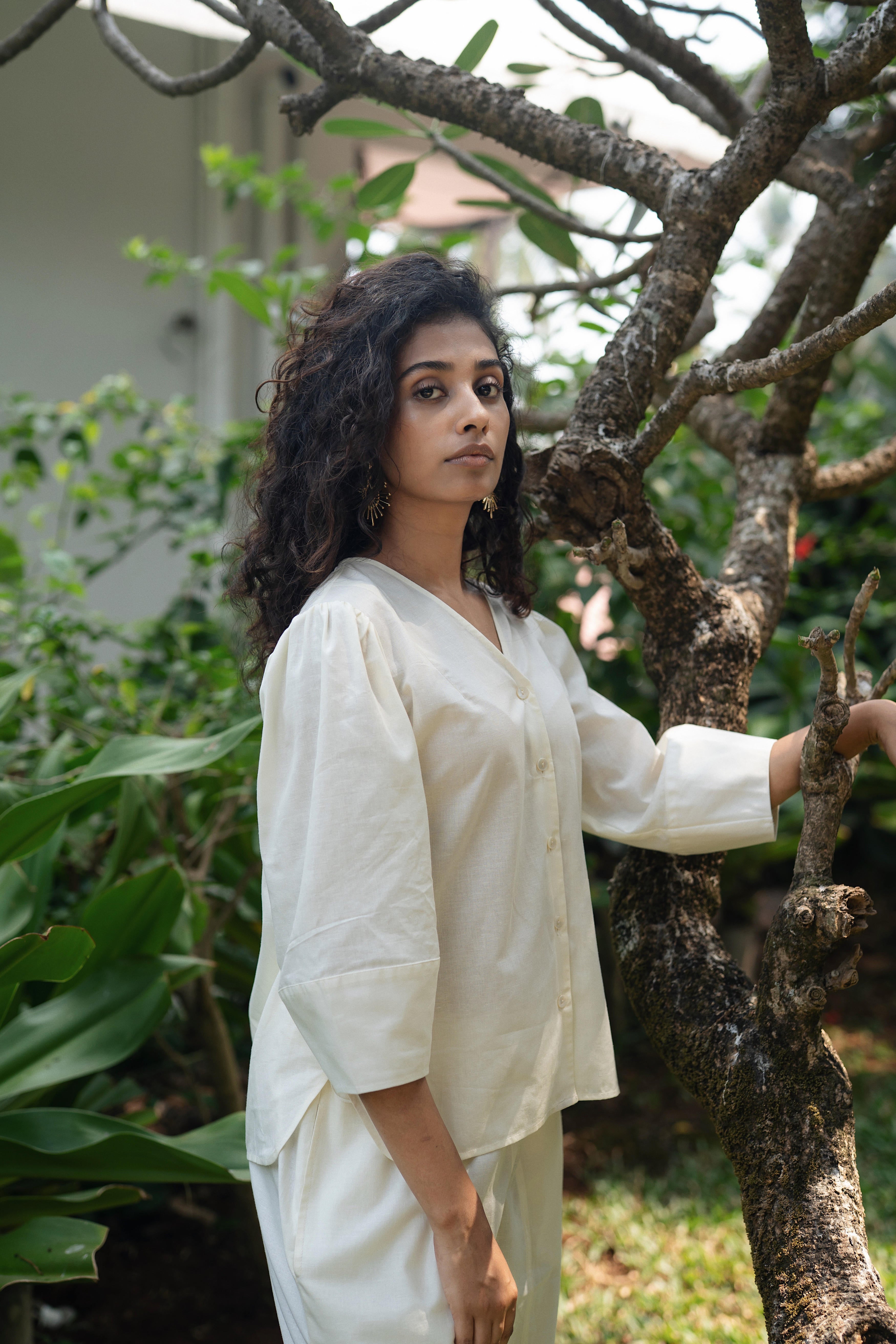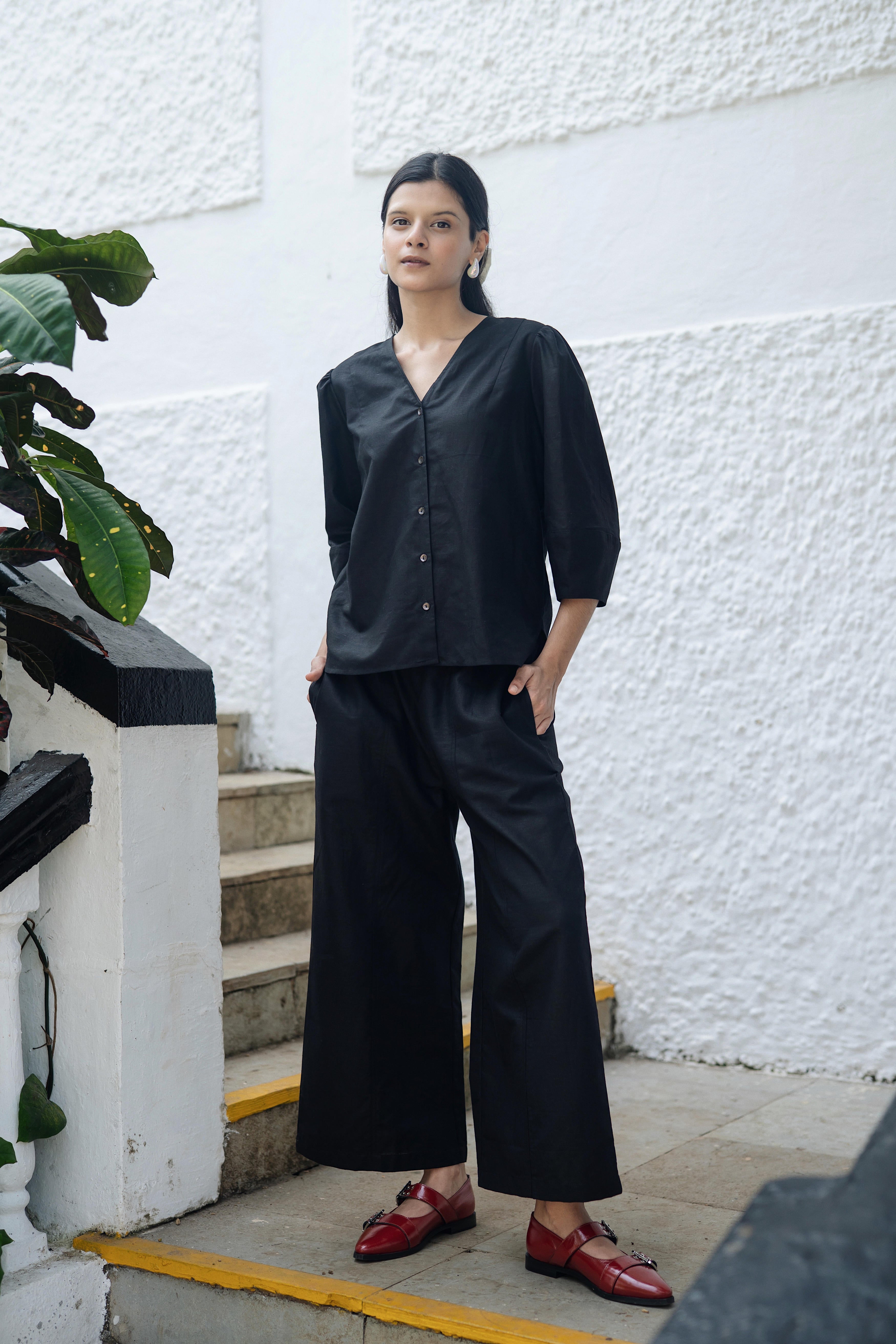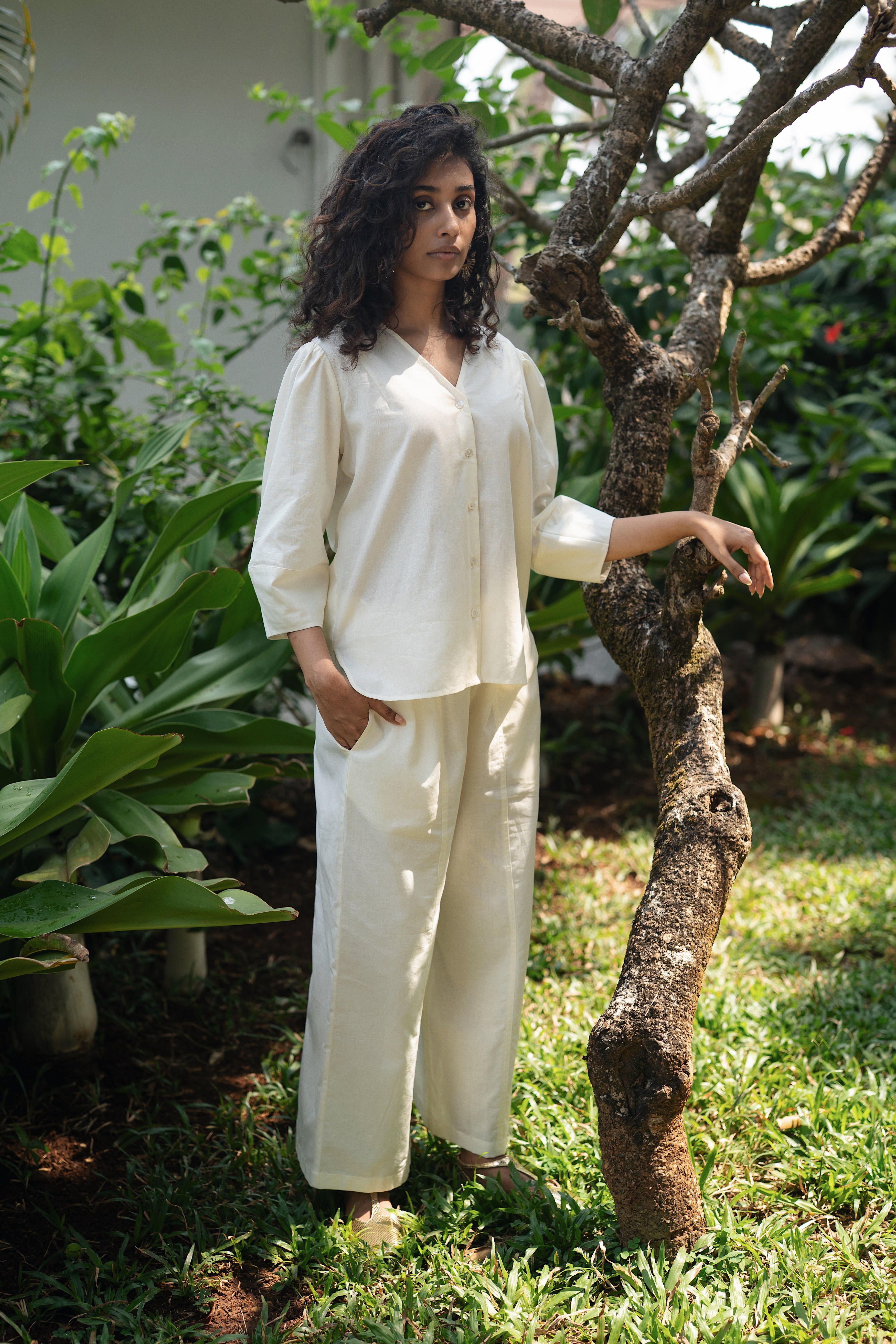 Missu coord set is made from our yarn dyed linen cotton fabrication. The top is a short sophisticated V neck blouse with a delicate sleeve.