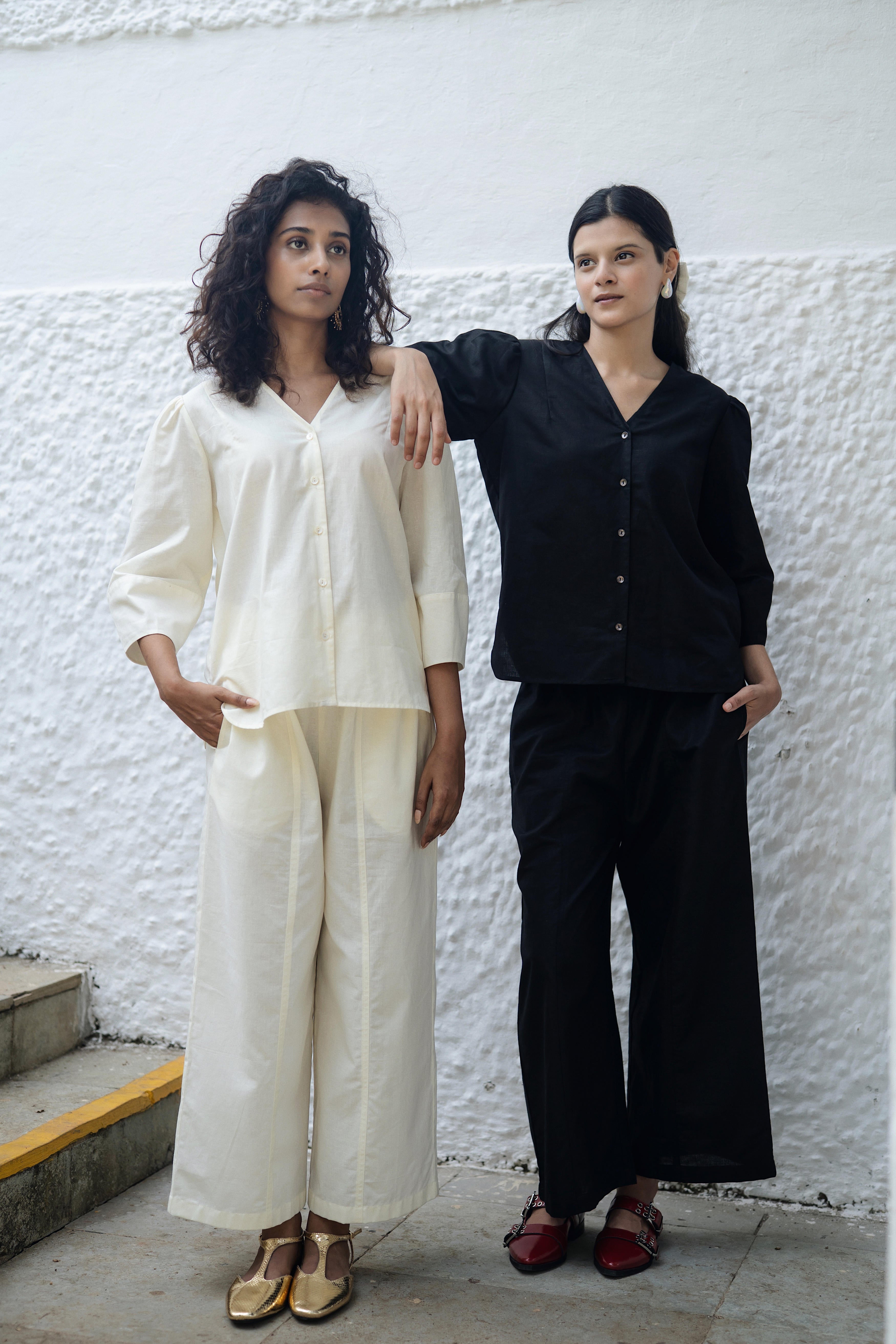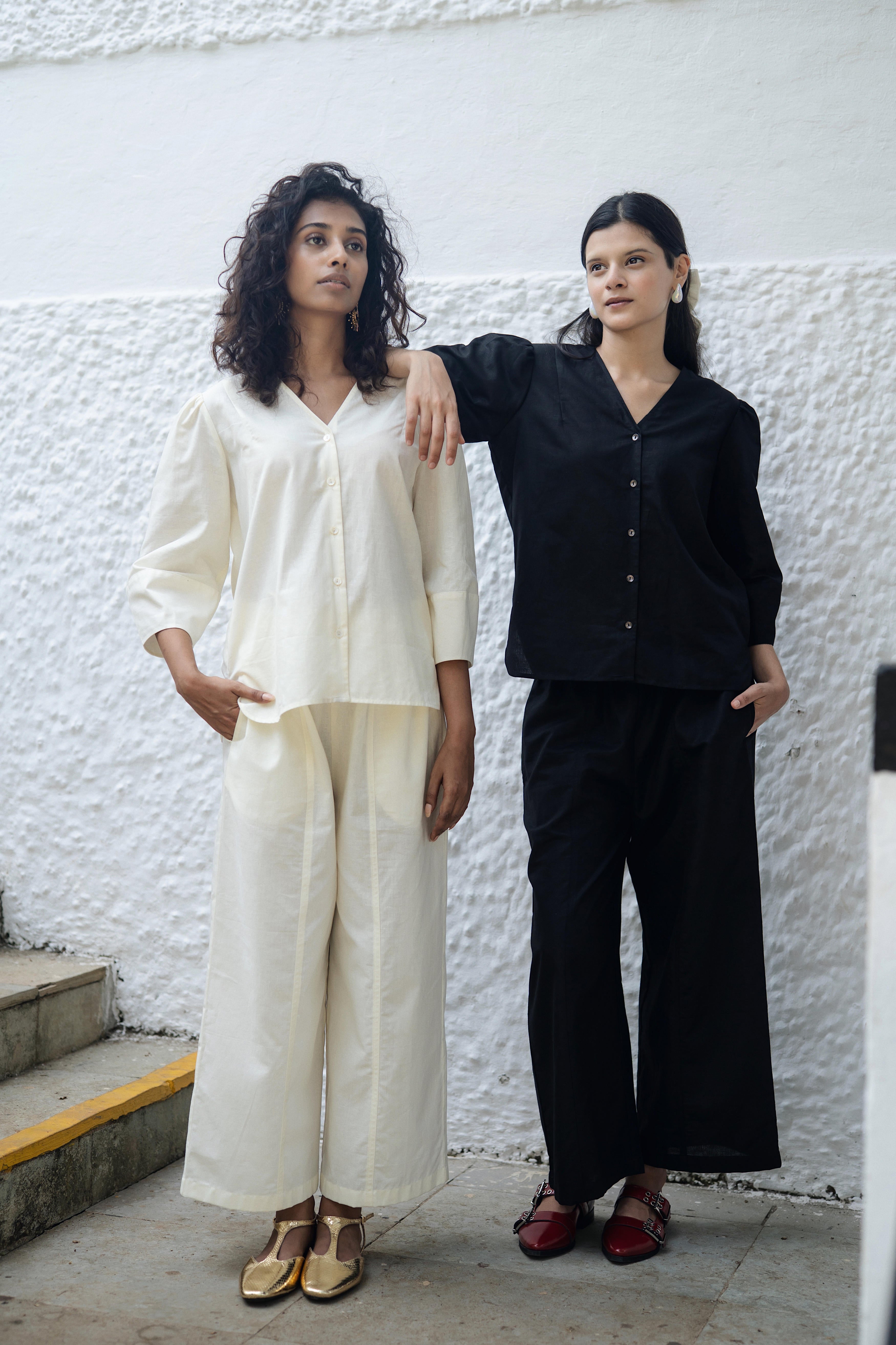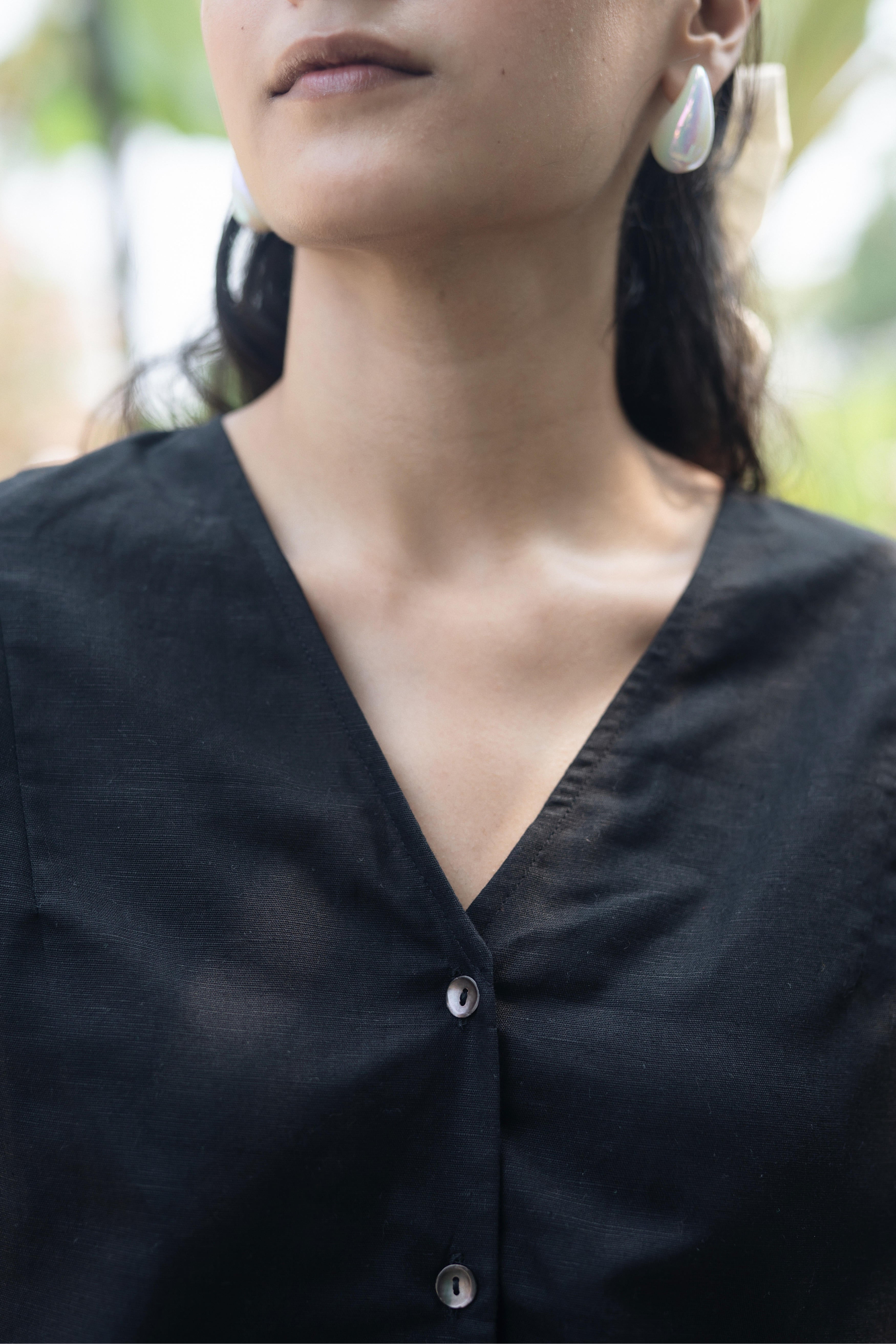 Missu coord set is made from our yarn dyed linen cotton fabrication. The top is a short sophisticated V neck blouse with a delicate sleeve.