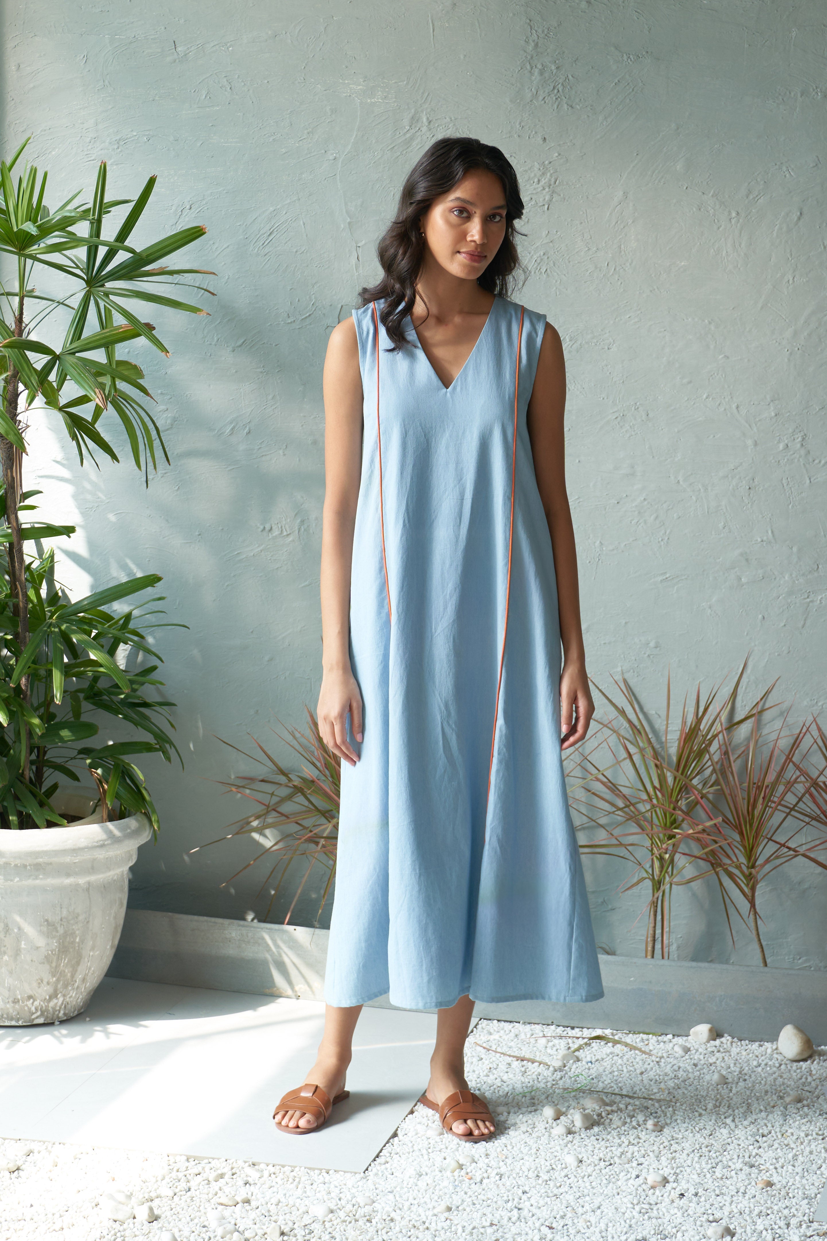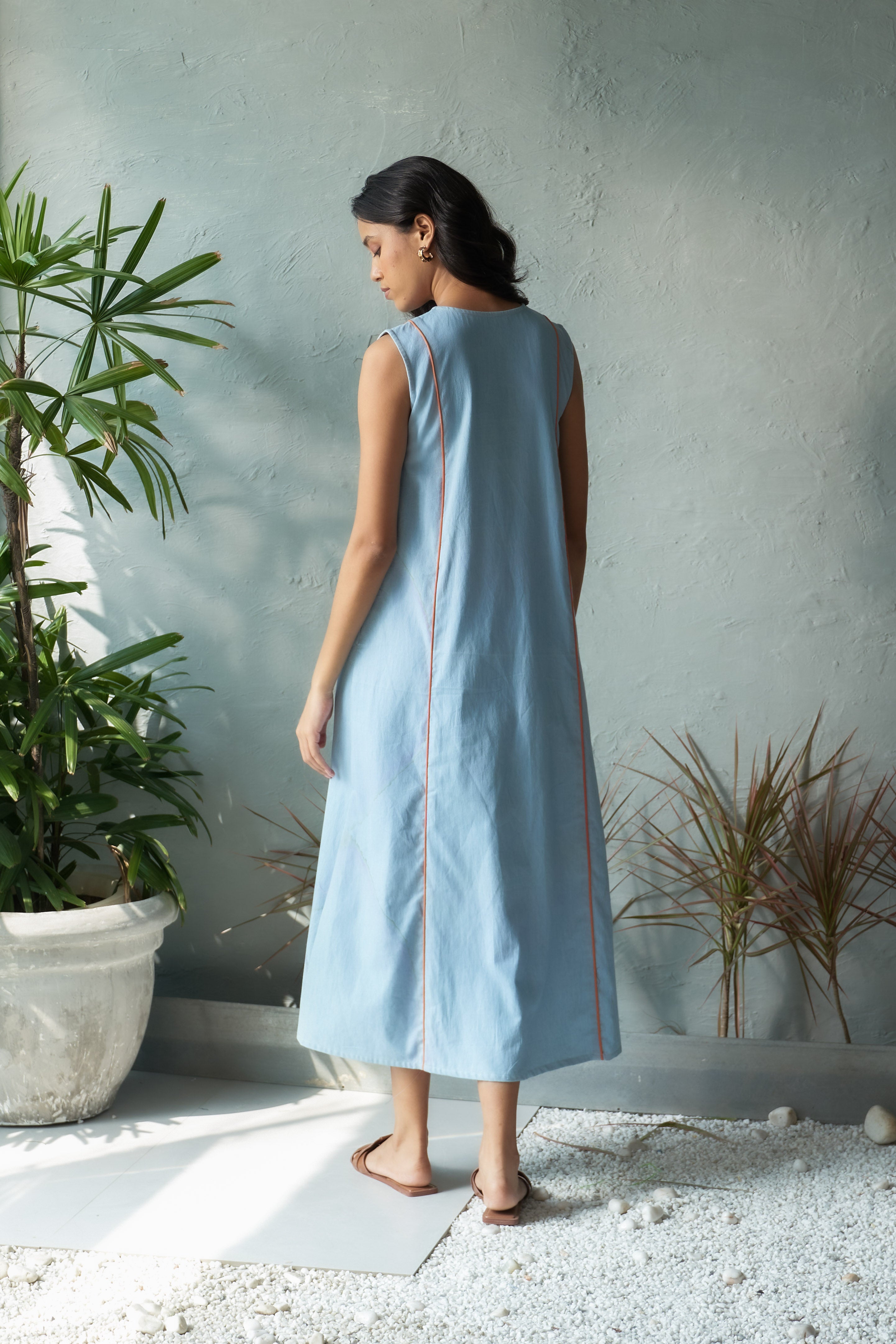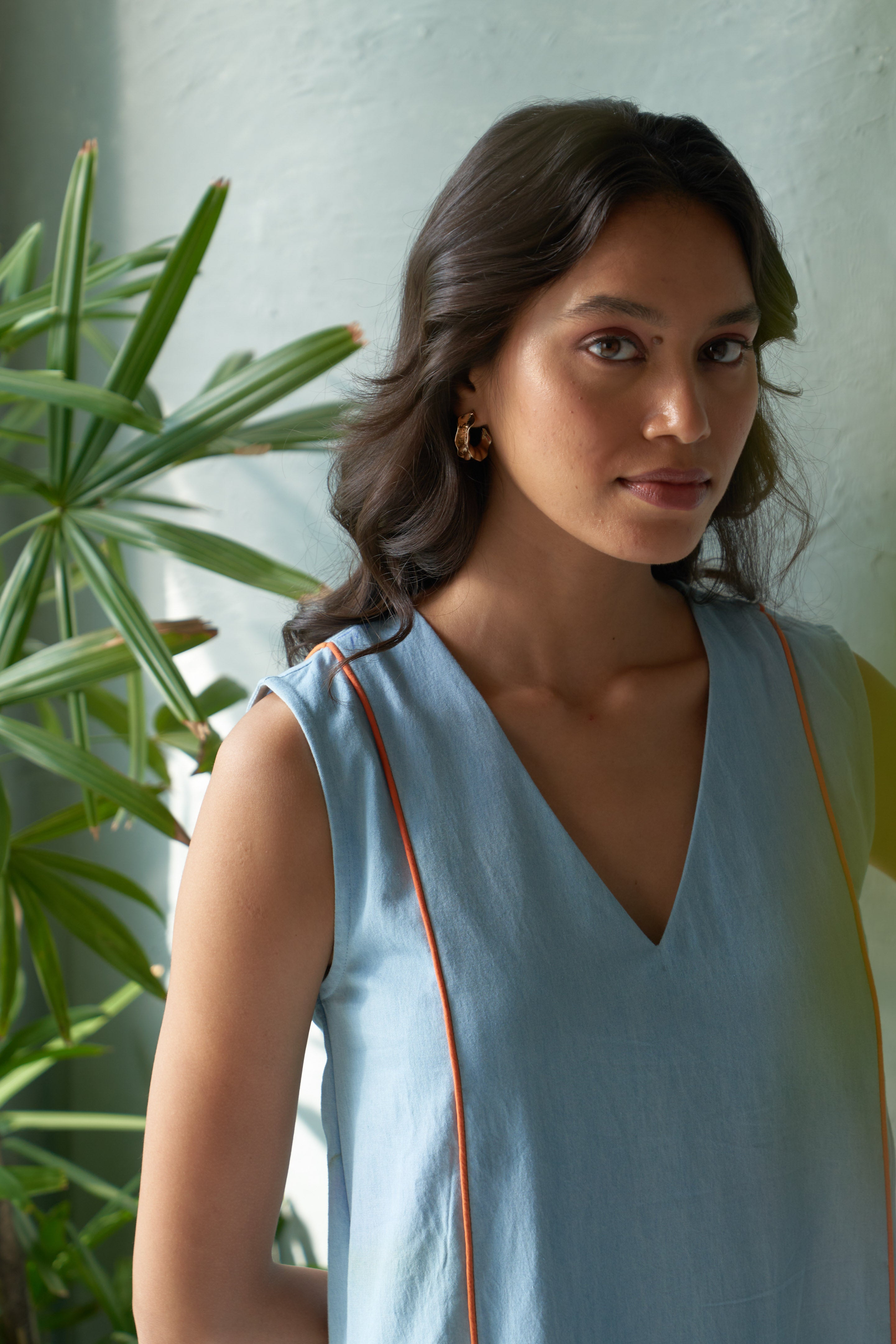 A piping dress featuring pop color accents on the front panel is a stylish and eye-catching piece. The piping detail adds structure and a dynamic contrast, making the dress stand out. This design combines sophistication with a playful touch, making it suitable for both casual and semi-formal occasions. You can style this dress with neutral accessories to let the piping take center stage or match it with complementary colors for a bold look. It pairs well with heels for a chic ensemble or flats for a more laid-back vibe. Note: Denim may exhibit natural distress marks due to the fabric's weave.