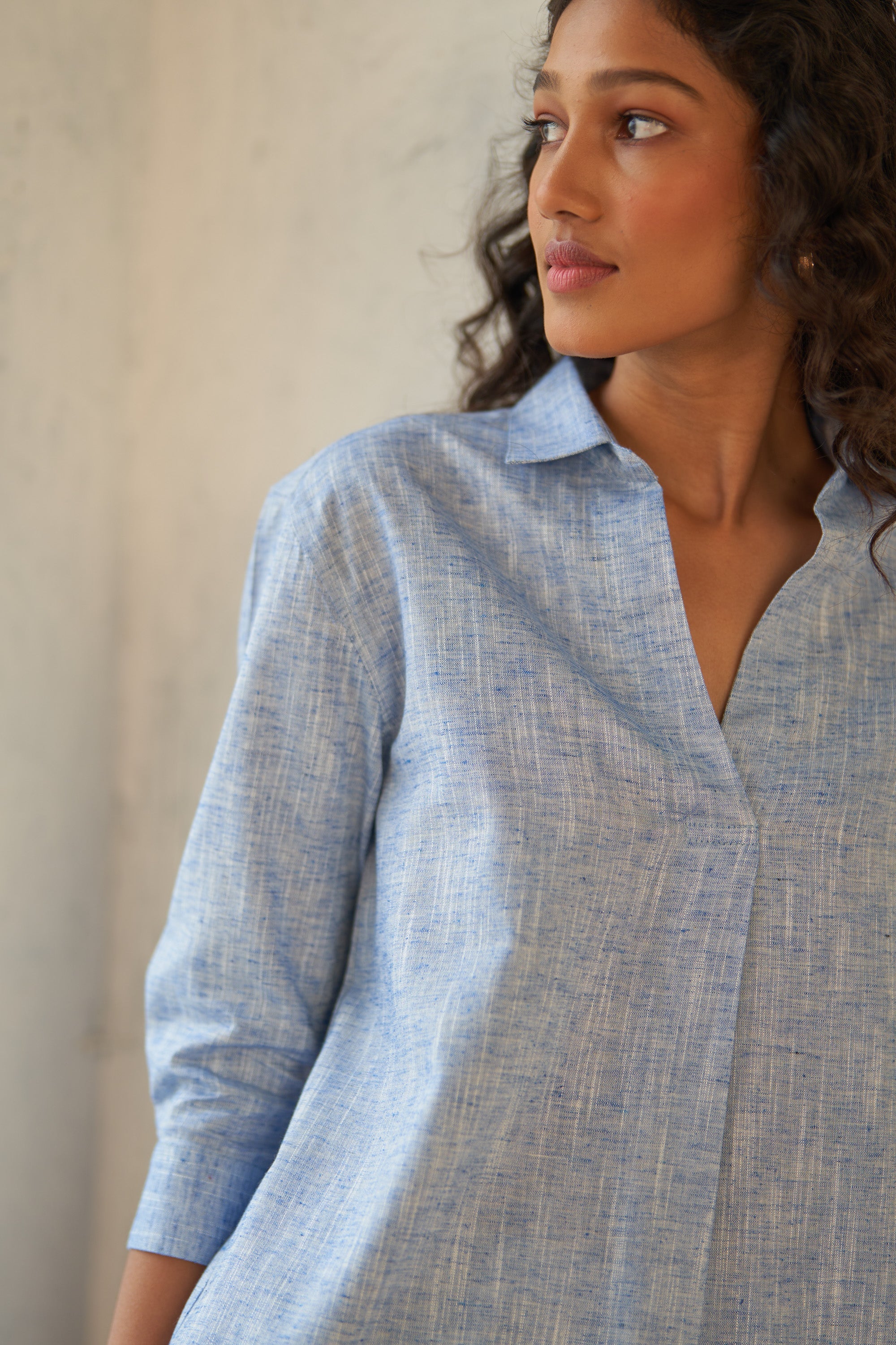Step into a beautiful carnival that extends seamlessly into the summer season with this misty combo. The top features a unique front box pleat detail, while the half-elasticated shorts come with flap pockets for added convenience. Crafted from a blue-hued textured cotton, this ensemble exudes a misty feel and ensures comfort all day long.