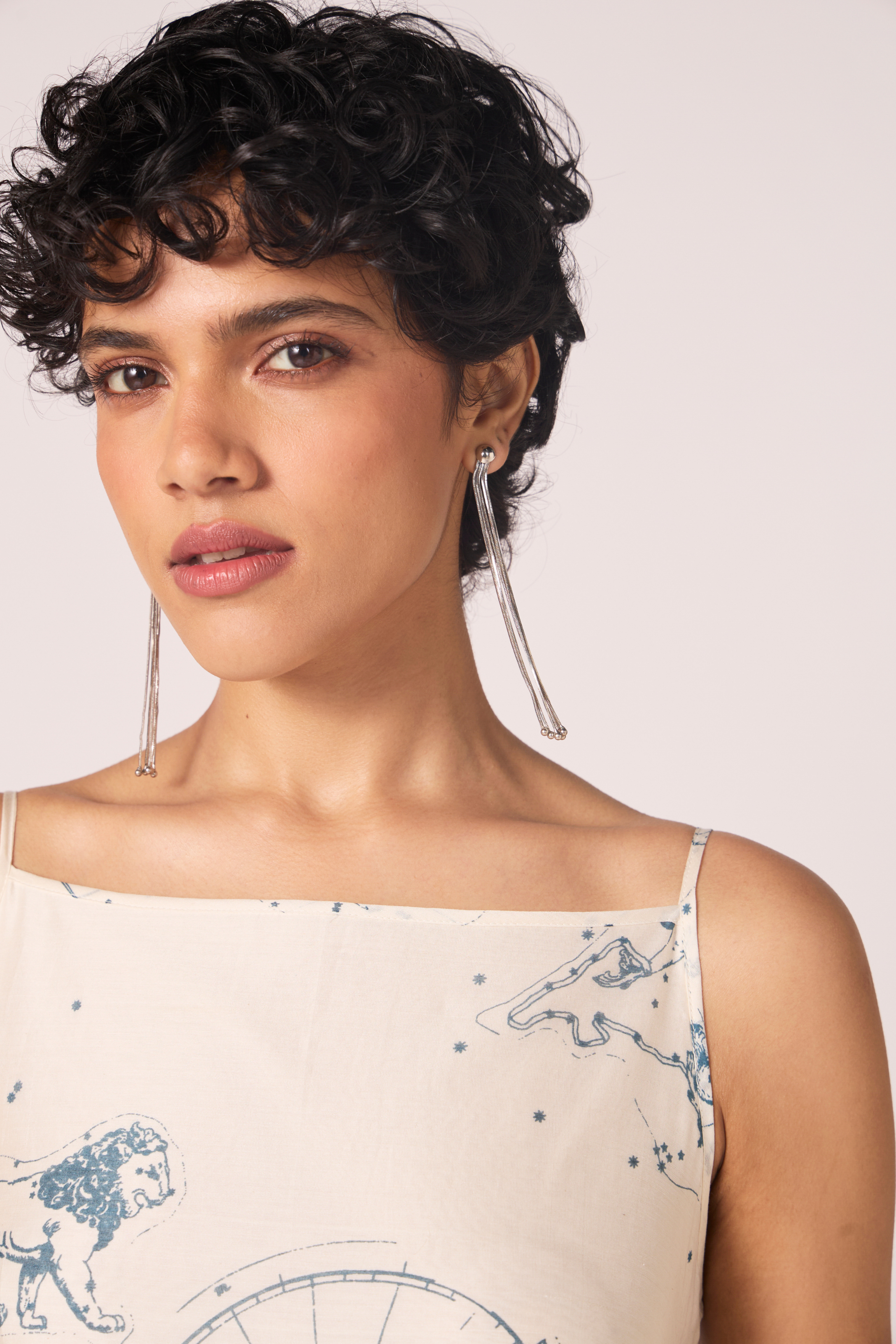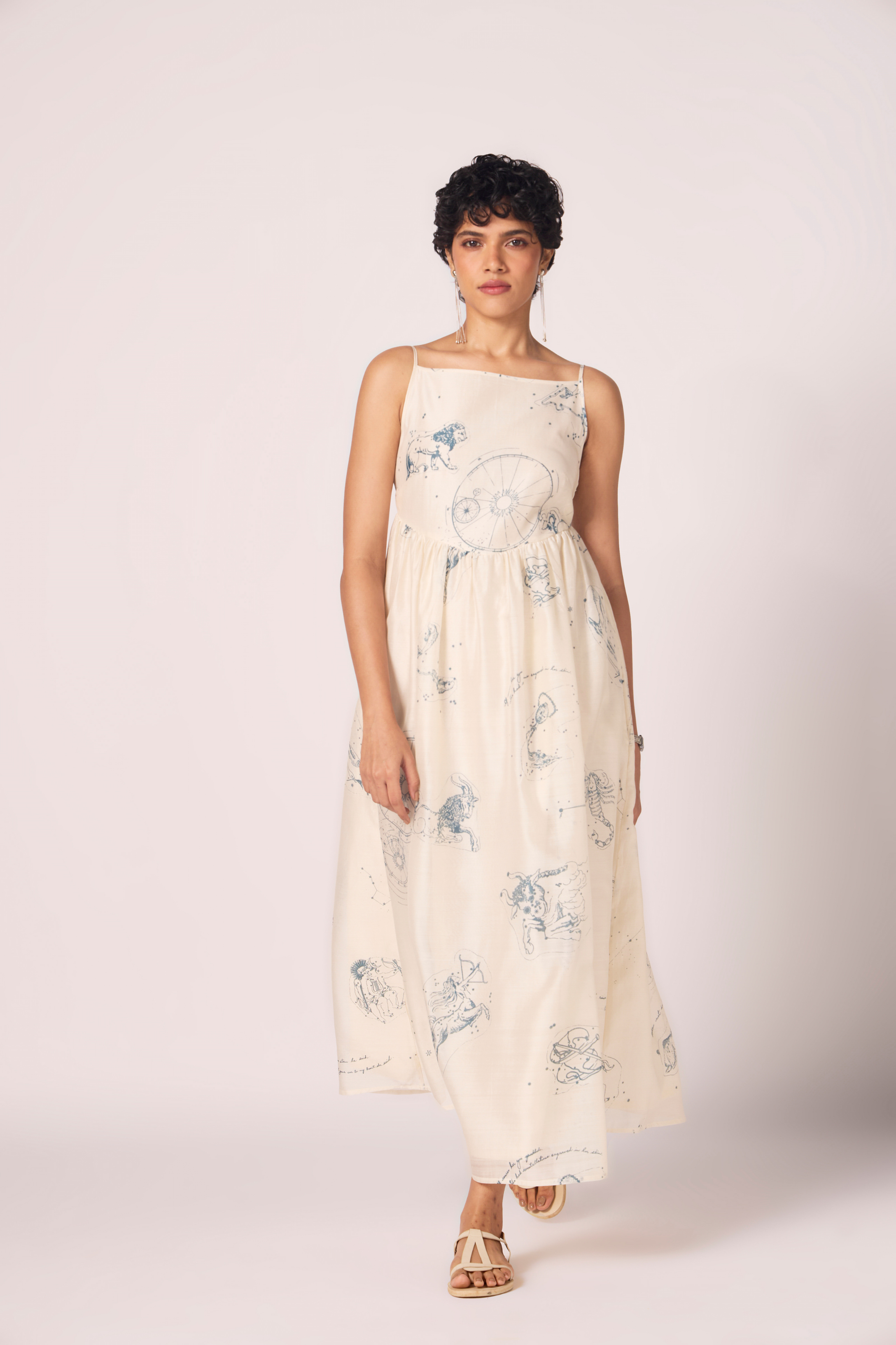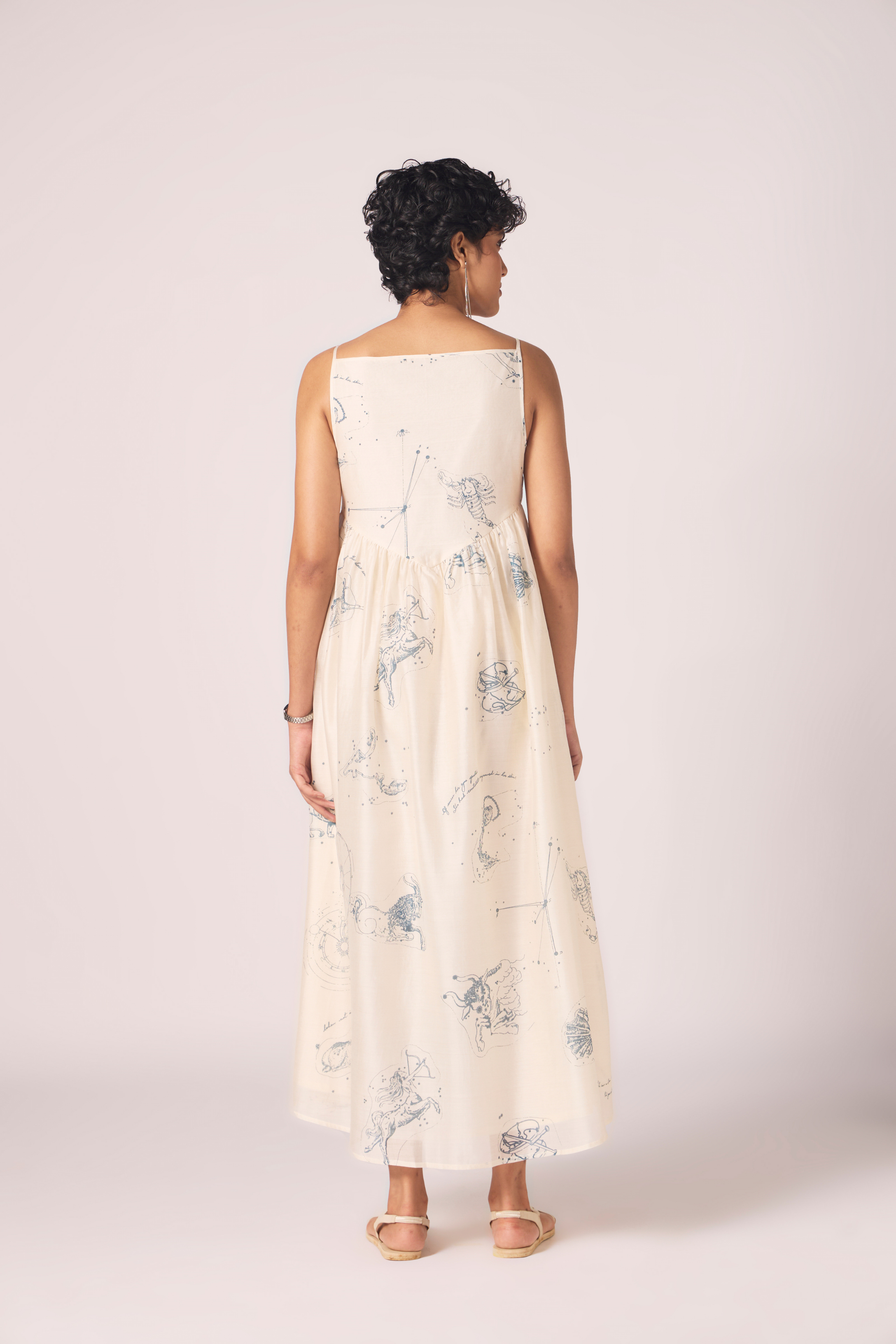 Constellations scattered across handwoven Chanderi. The fitted bodice shapes cleanly before opening into a flared hemline that holds both poise and motion. A dress that balances structure with lightness. - Regular Fit - Anushka is 5'8 and wearing S . Her body measurements are Bust: 32", Waist: 29", Hips: 36" - Handwoven Chanderi with natural sheen - Fitted bodice for definition - Flared hemline engineered for ease of movement - Sleeveless cut with bound armholes - Concealed side zip fastening - Fully lined for opacity and drape