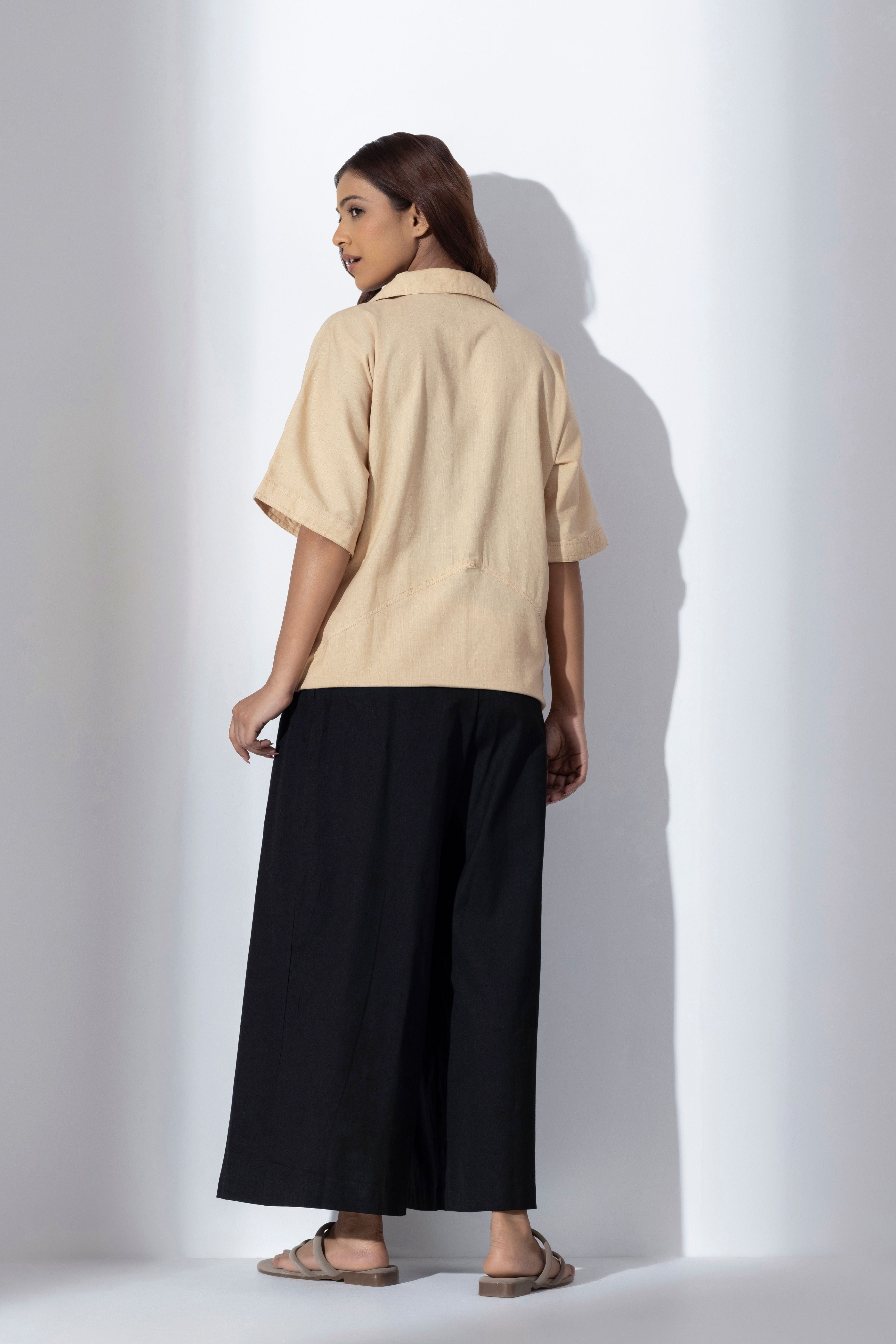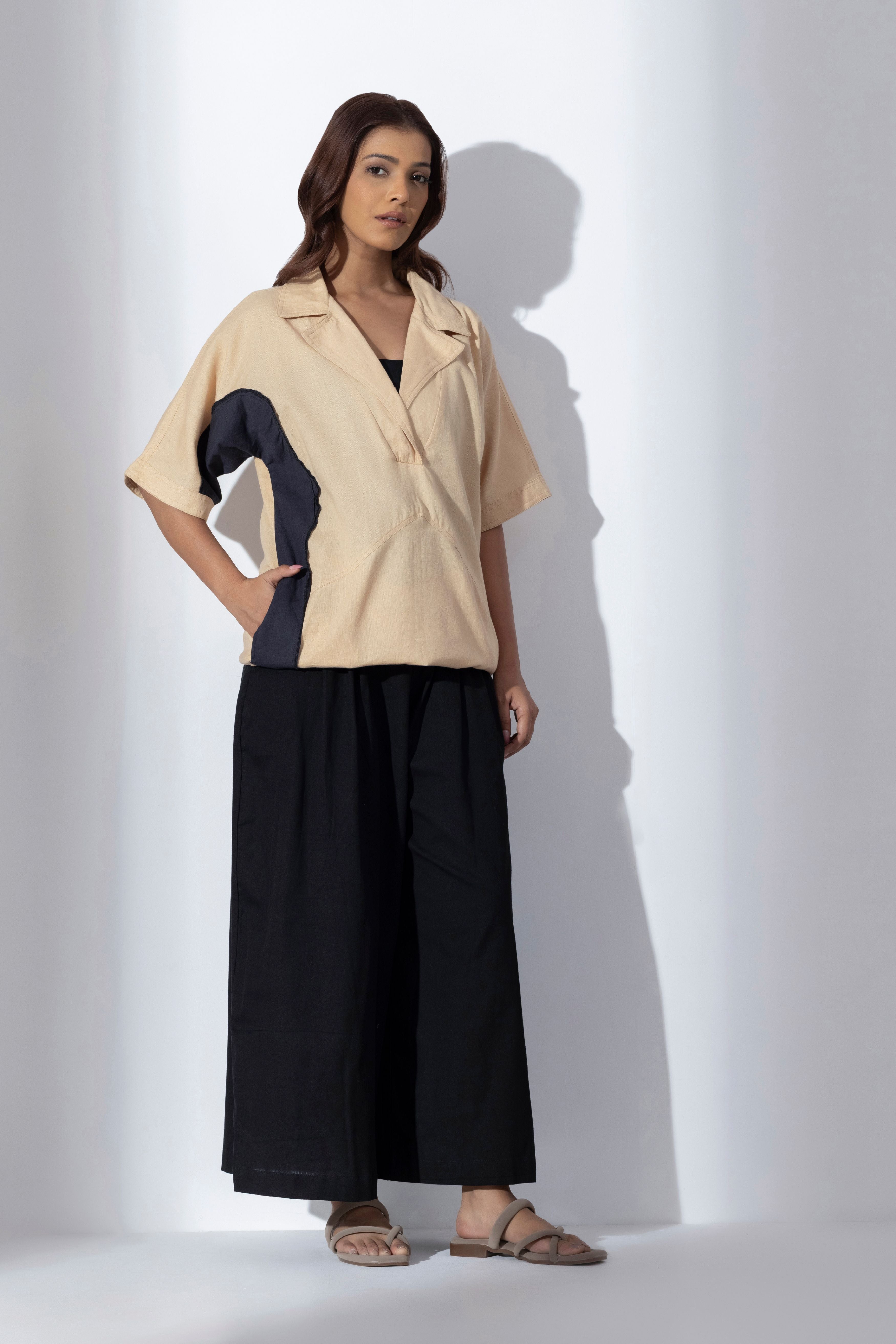 Breathe in our Mizu Co-ord set - a relaxed yet refined pairing crafted from soft, breathable cotton. The breezy, structured top comes in a soft sand-beige hue with unexpected deep black side panel patchwork paired with our signature high-waisted All Black paper pants. This ensemble moves with you, offering comfort, versatility, and timeless Japandi-inspired elegance.  - Mizu shirt - notched collar, relaxed fit and black applique patchwork detail - All black high-waisted paper pants with side pockets, side zip and wide-leg hem - Model is wearing a size S - This is textile fabric, subtle imperfections in the weave, texture and color is natural outcome of handcrafted textiles and not a defect.