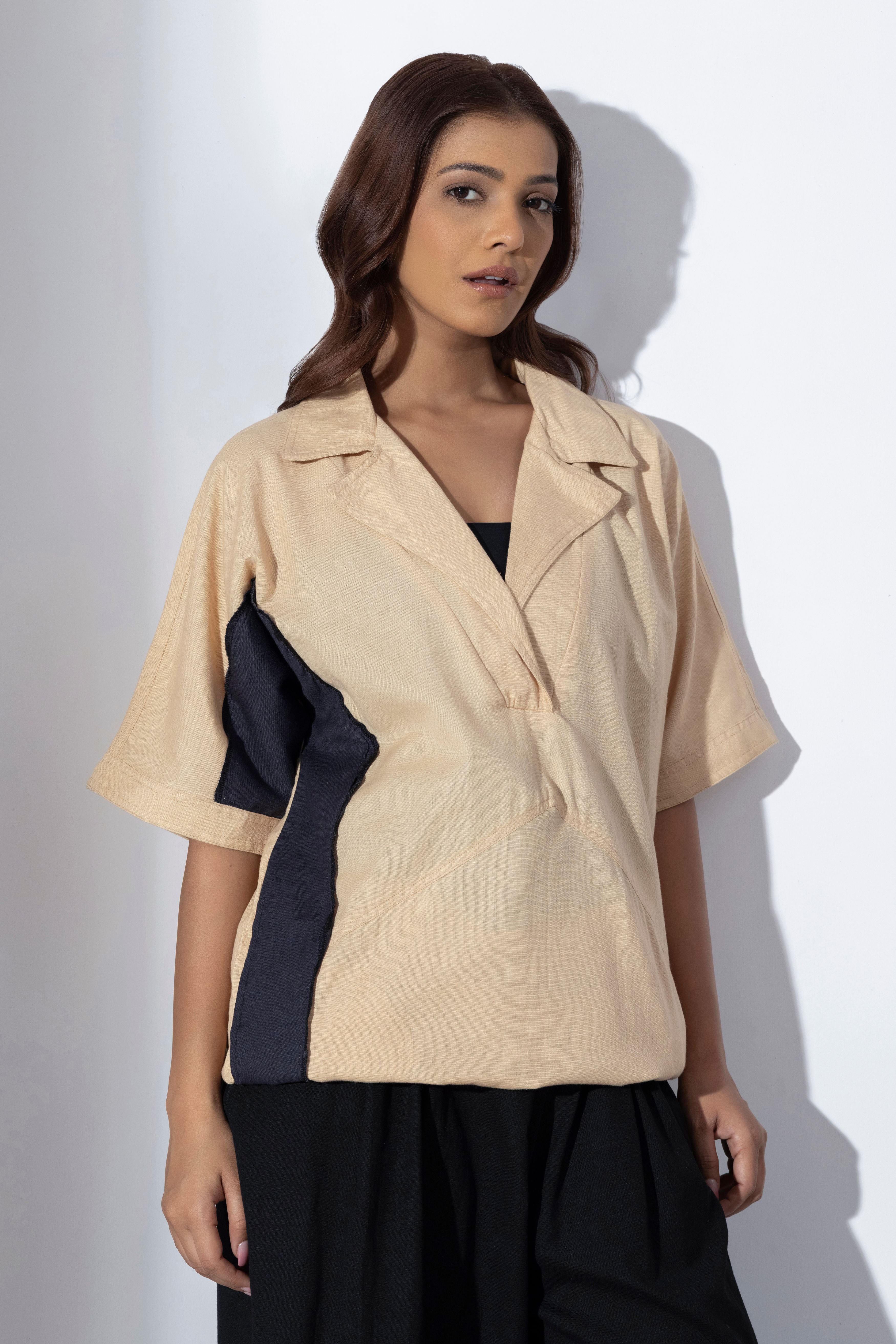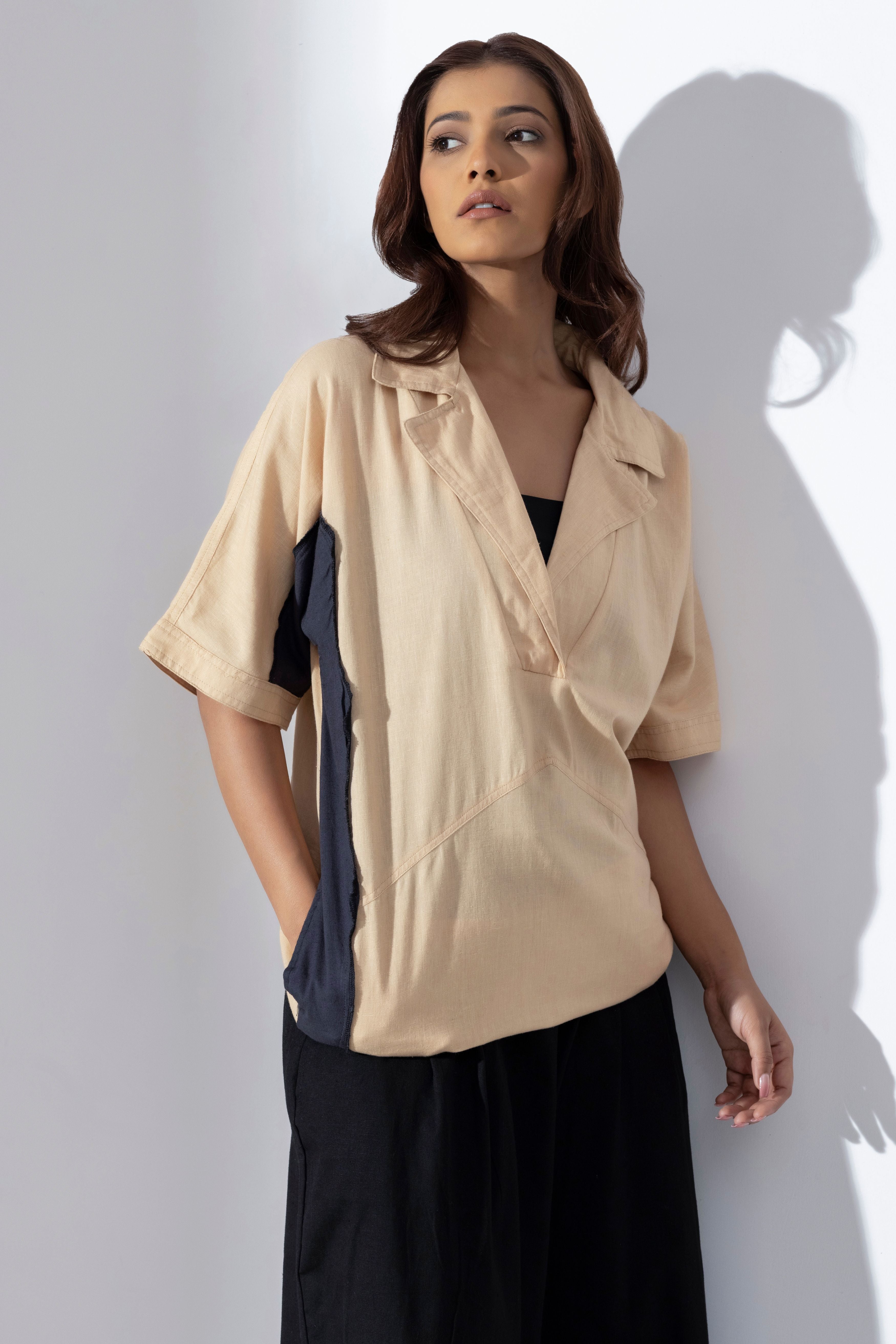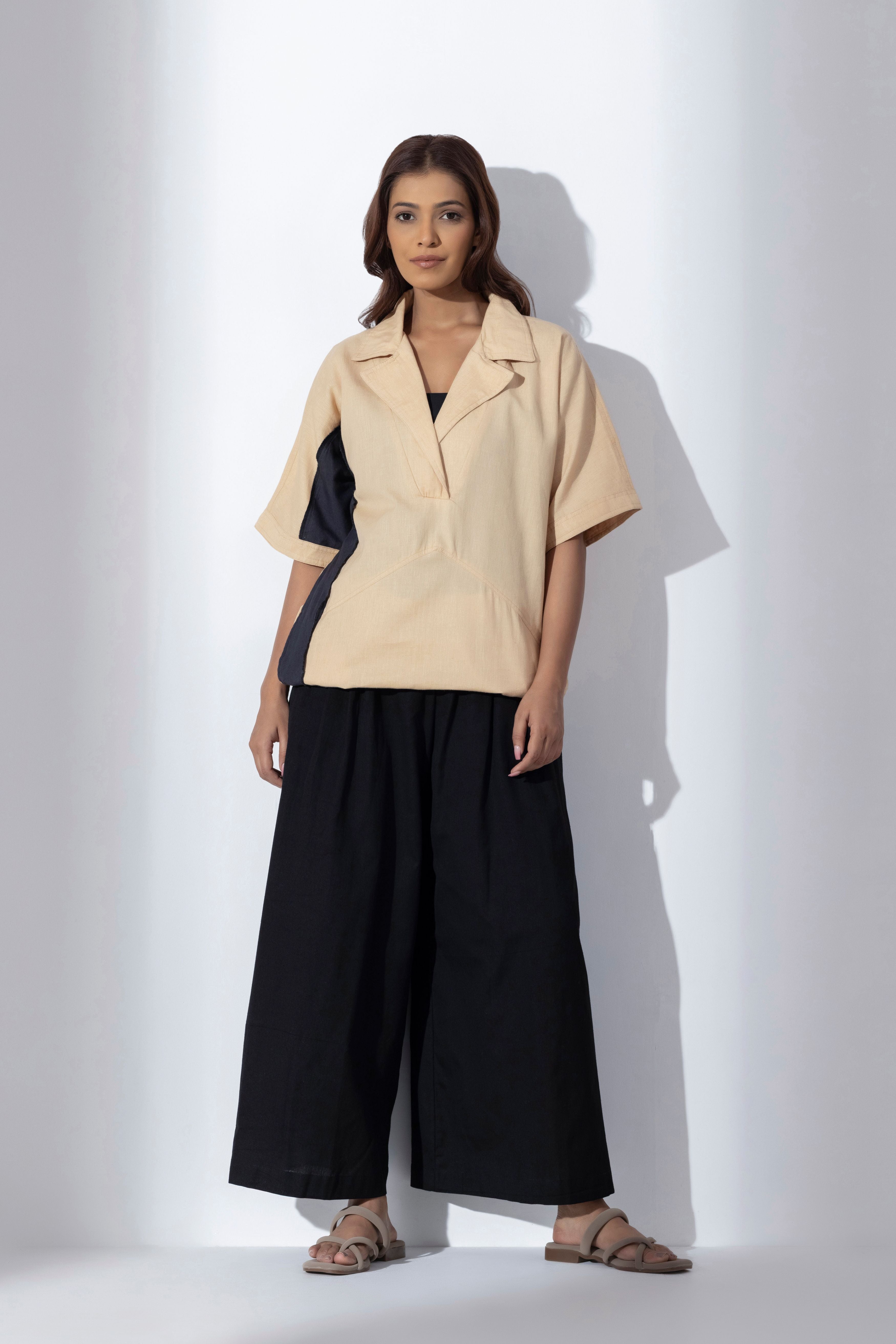 Breathe in our Mizu shirt - a relaxed yet refined pairing crafted from soft, breathable cotton. The breezy, structured top comes in a soft sand-beige hue with unexpected deep black side panel patchwork. This ensemble moves with you, offering comfort, versatility, and timeless Japandi-inspired elegance.  - Mizu shirt - notched collar, relaxed fit and black applique patchwork detail - Model is wearing a size S - This is textile fabric, subtle imperfections in the weave, texture and color is natural outcome of handcrafted textiles and not a defect.