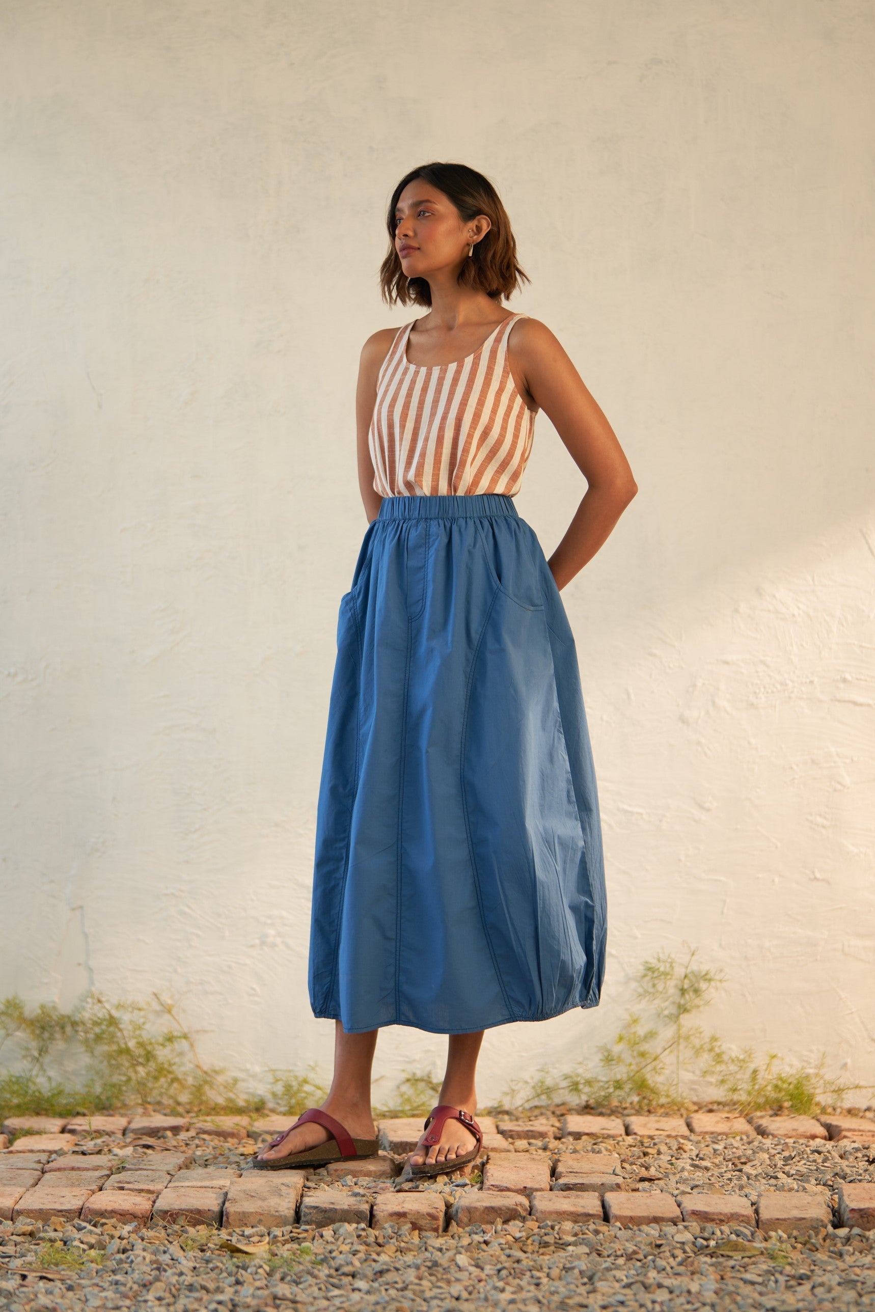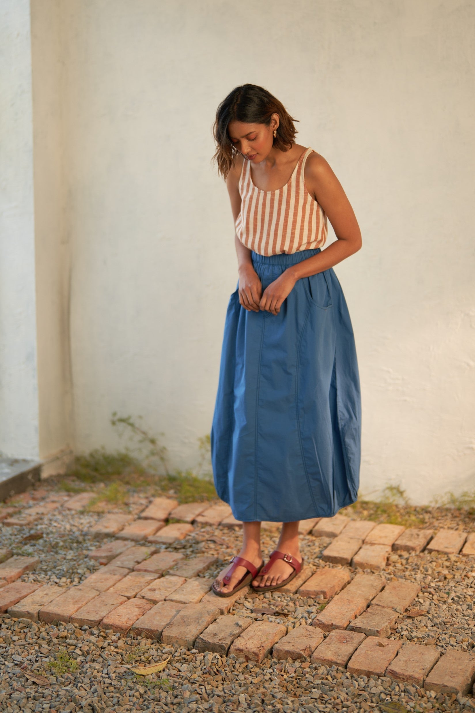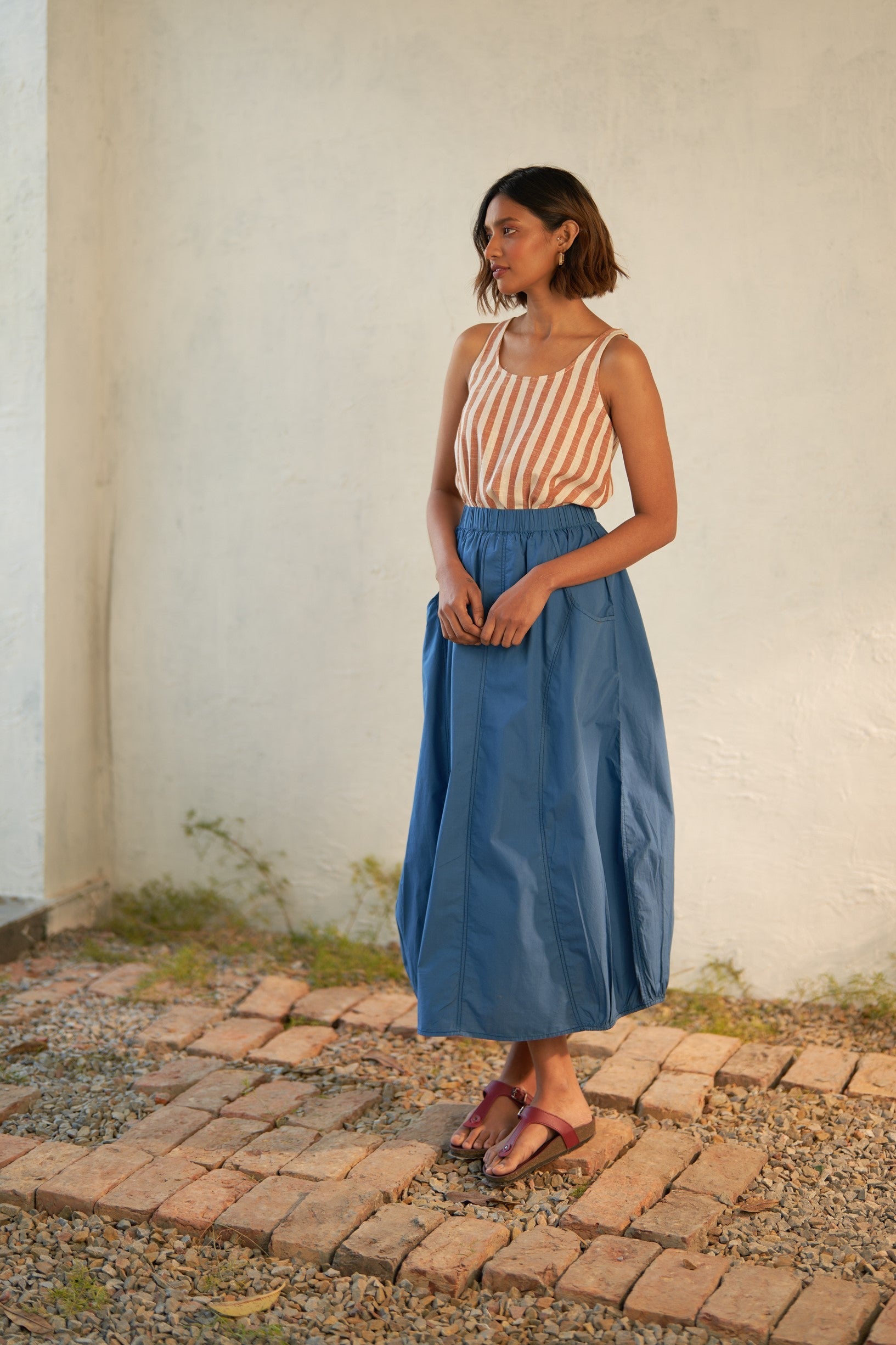 When you feel like exploring city cafes, this striped tank top combined with a unique skirt is your go-to outfit. The A-line silhouette and versatile design make it the perfect choice for a top, while the skirt is crafted for comfort and versatility. It features a unique elasticated hem on both sides, along with an elasticated waist and intricate stitch detailing.