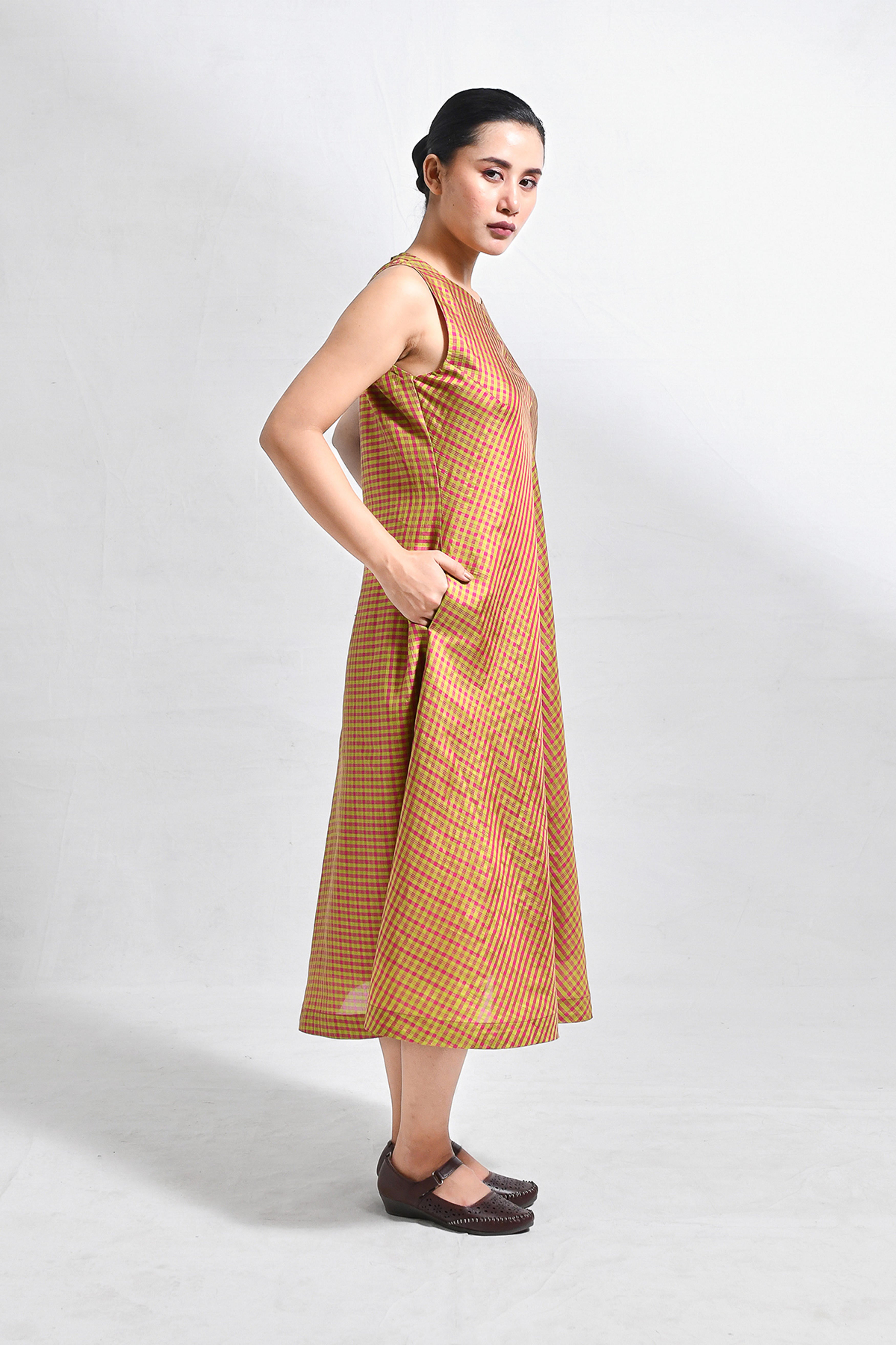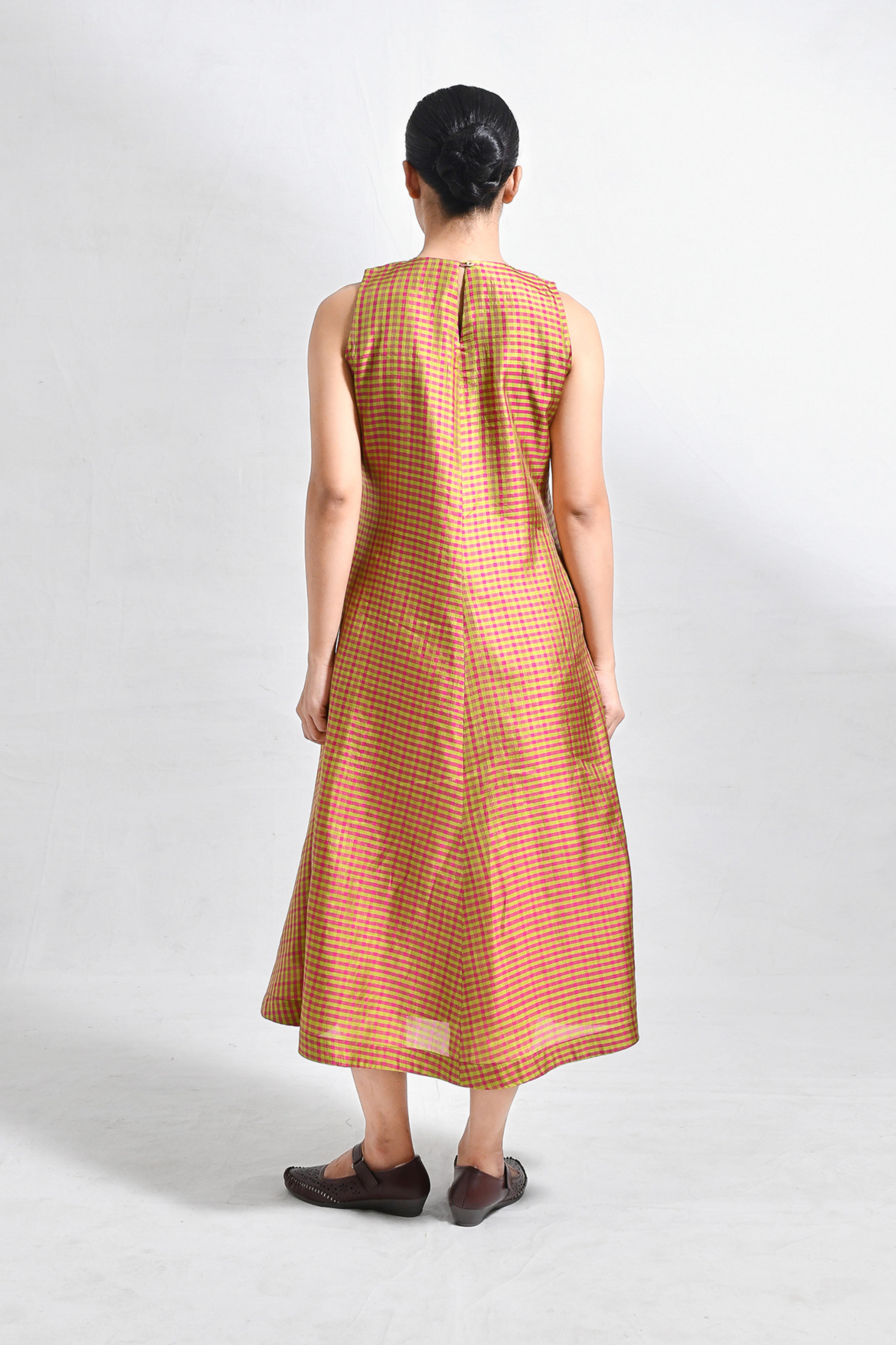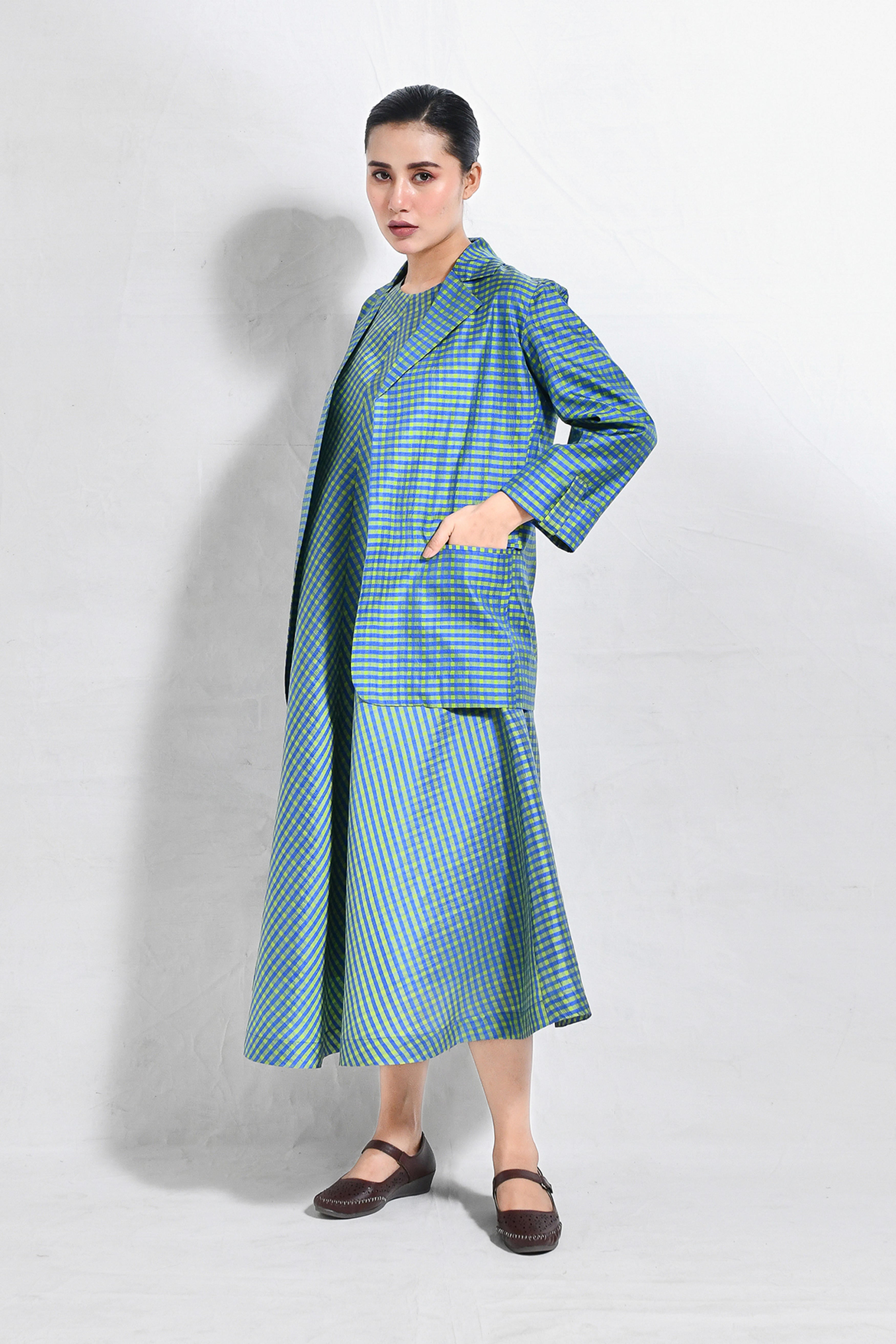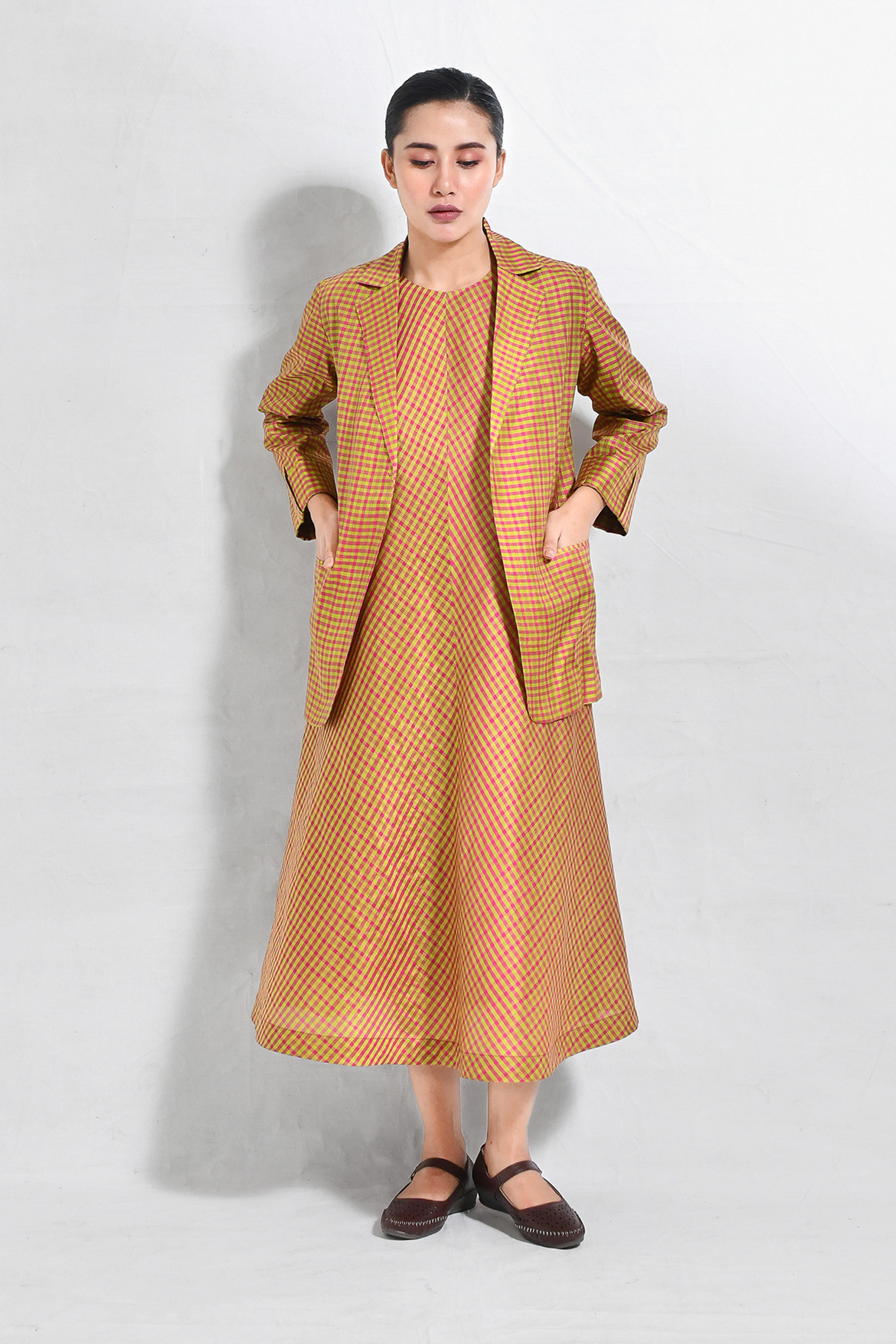 Crafted from luxurious handwoven Bangalore silk in pink and olive checks, this elegant co-ord set features a sleeveless A-line dress paired with a structured blazer. The dress offers a slimmer fit with a subtle flare, complete with pockets and an attached lining for all-day comfort. The matching blazer adds a touch of tailored sophistication with its classic notch lapels, full-length sleeves, and functional front pockets. Together, they form a refined and versatile ensemble — perfect for both daytime elegance and evening polish. Model is 5'5, wearing a Size S.