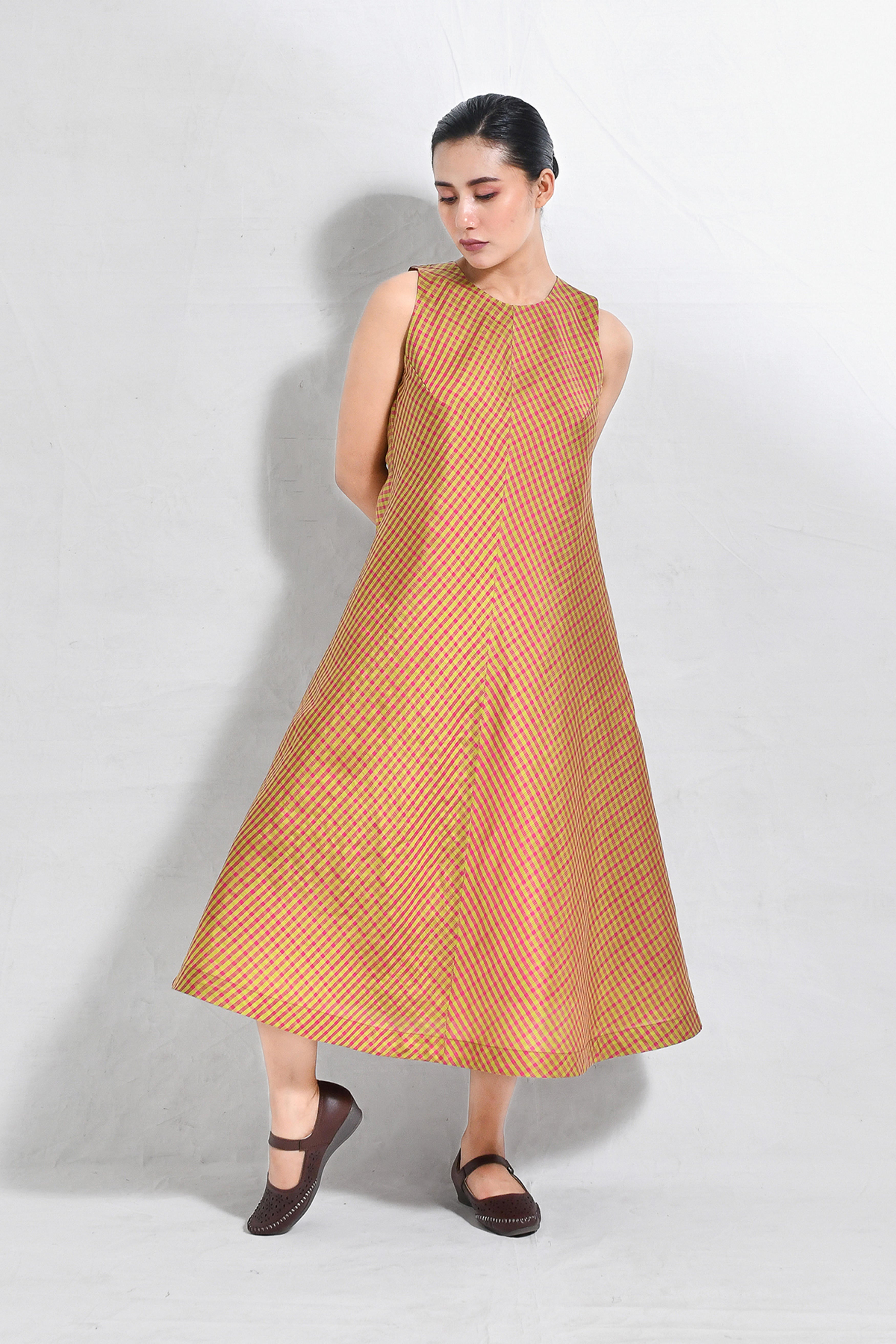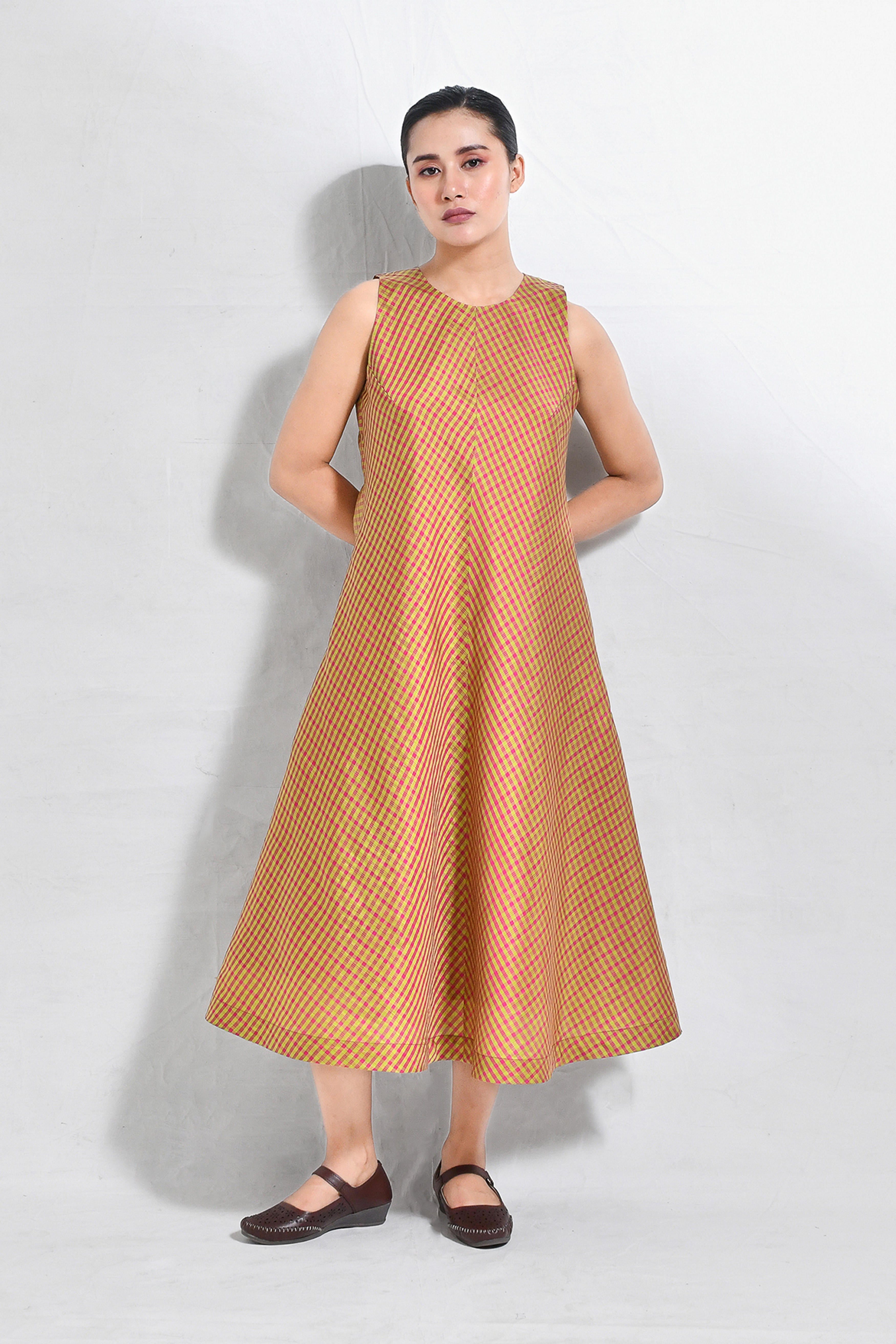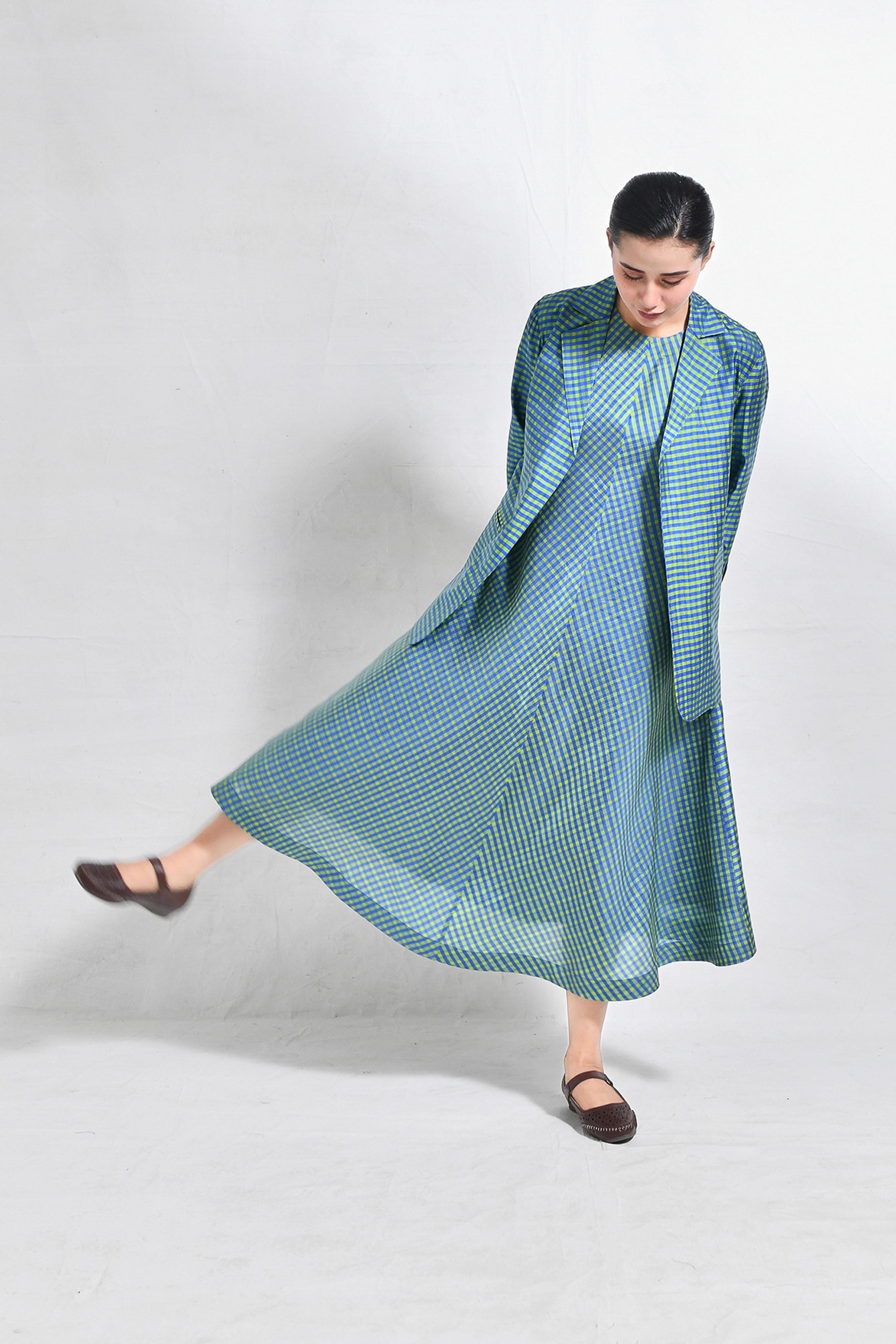 Crafted from luxurious handwoven Bangalore silk in pink and olive checks, this elegant co-ord set features a sleeveless A-line dress paired with a structured blazer. The dress offers a slimmer fit with a subtle flare, complete with pockets and an attached lining for all-day comfort. The matching blazer adds a touch of tailored sophistication with its classic notch lapels, full-length sleeves, and functional front pockets. Together, they form a refined and versatile ensemble — perfect for both daytime elegance and evening polish. Model is 5'5, wearing a Size S.