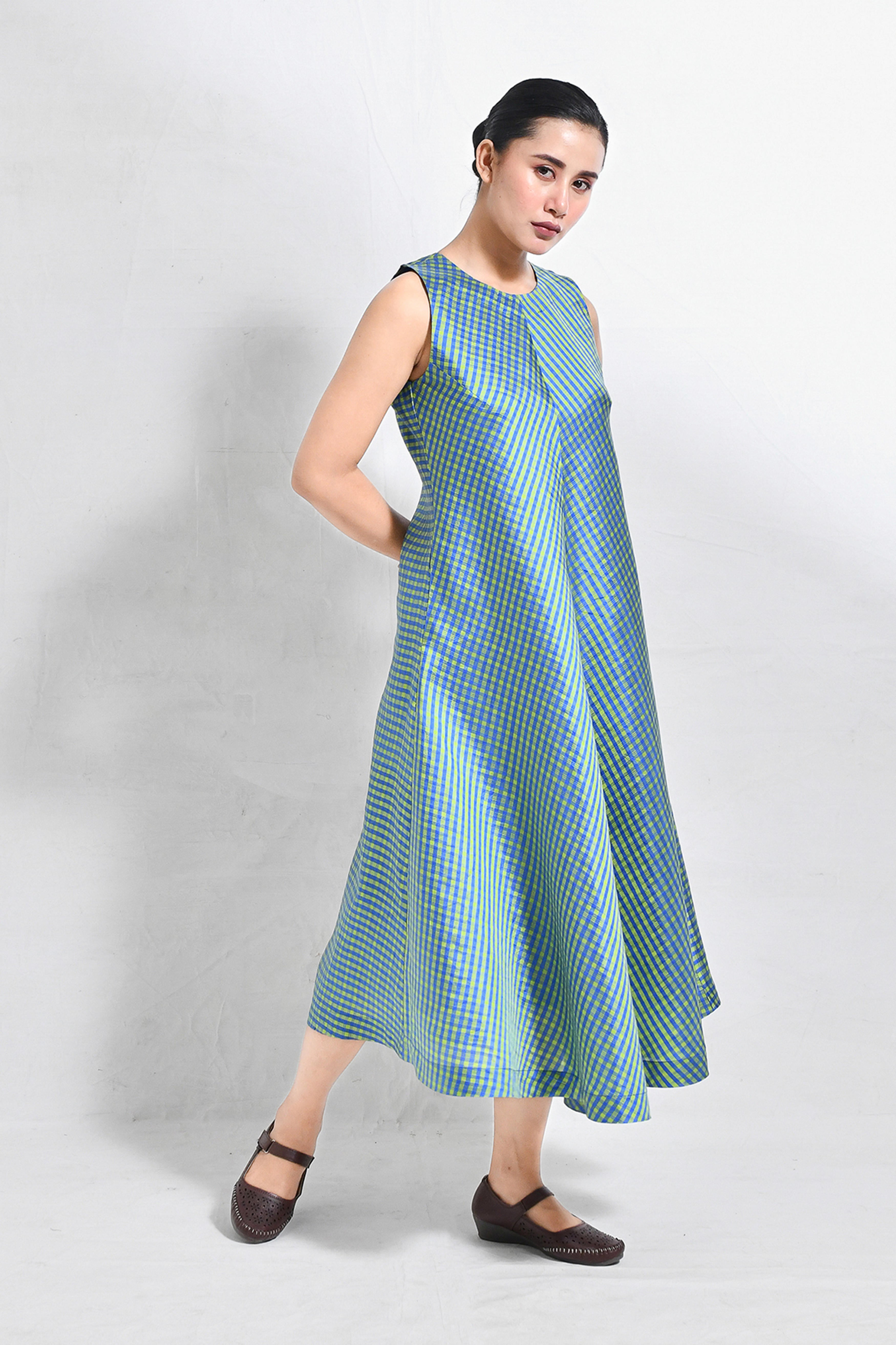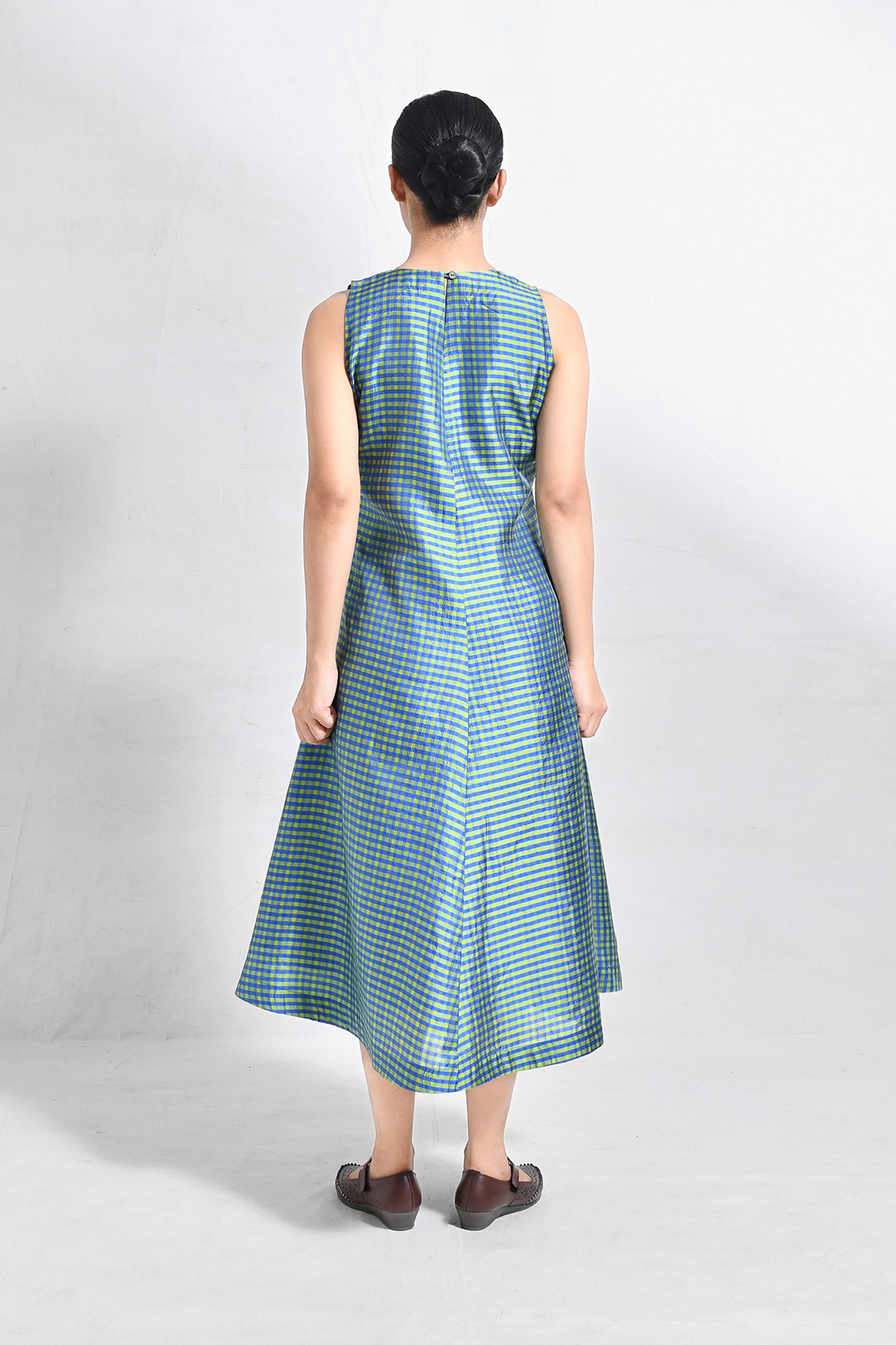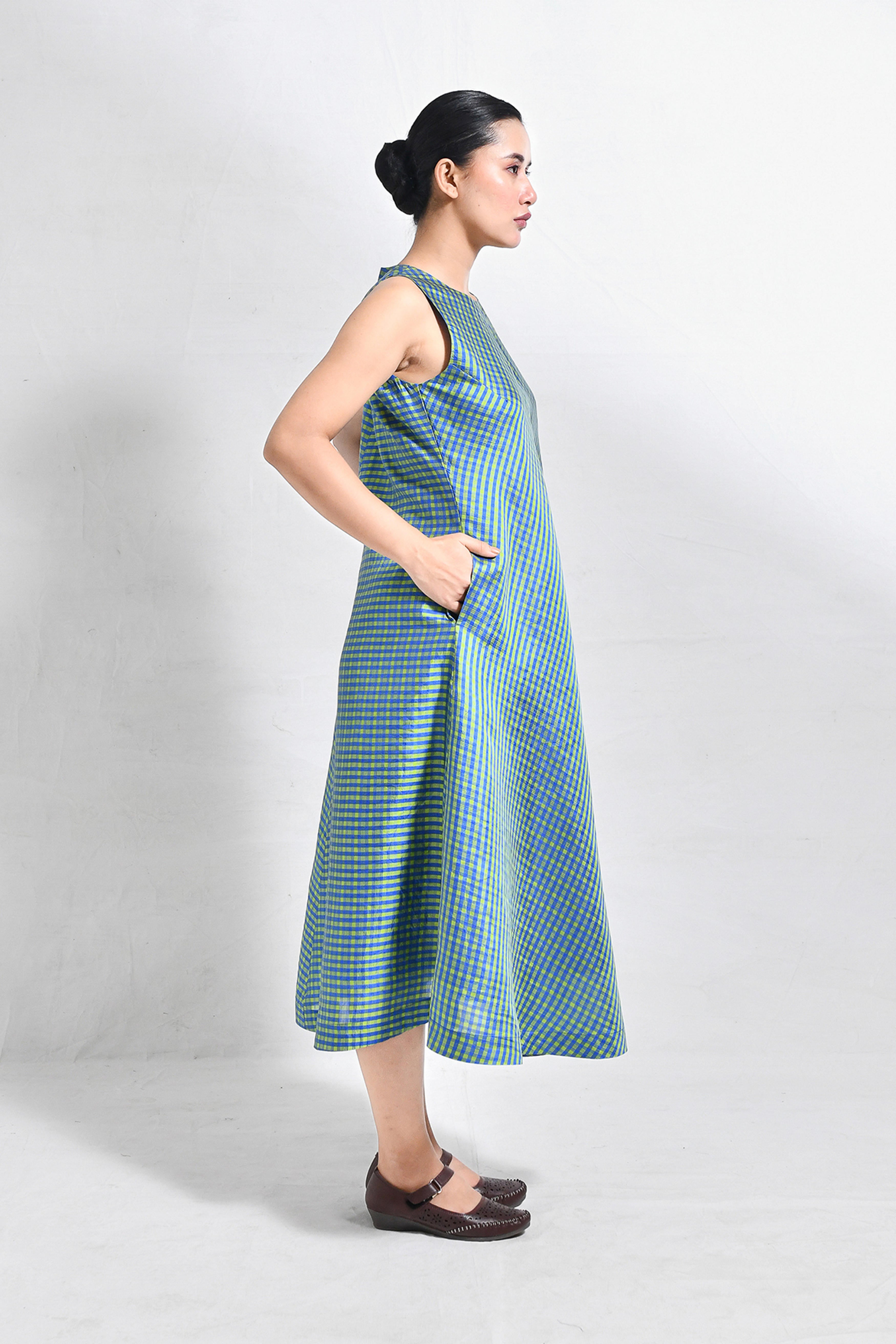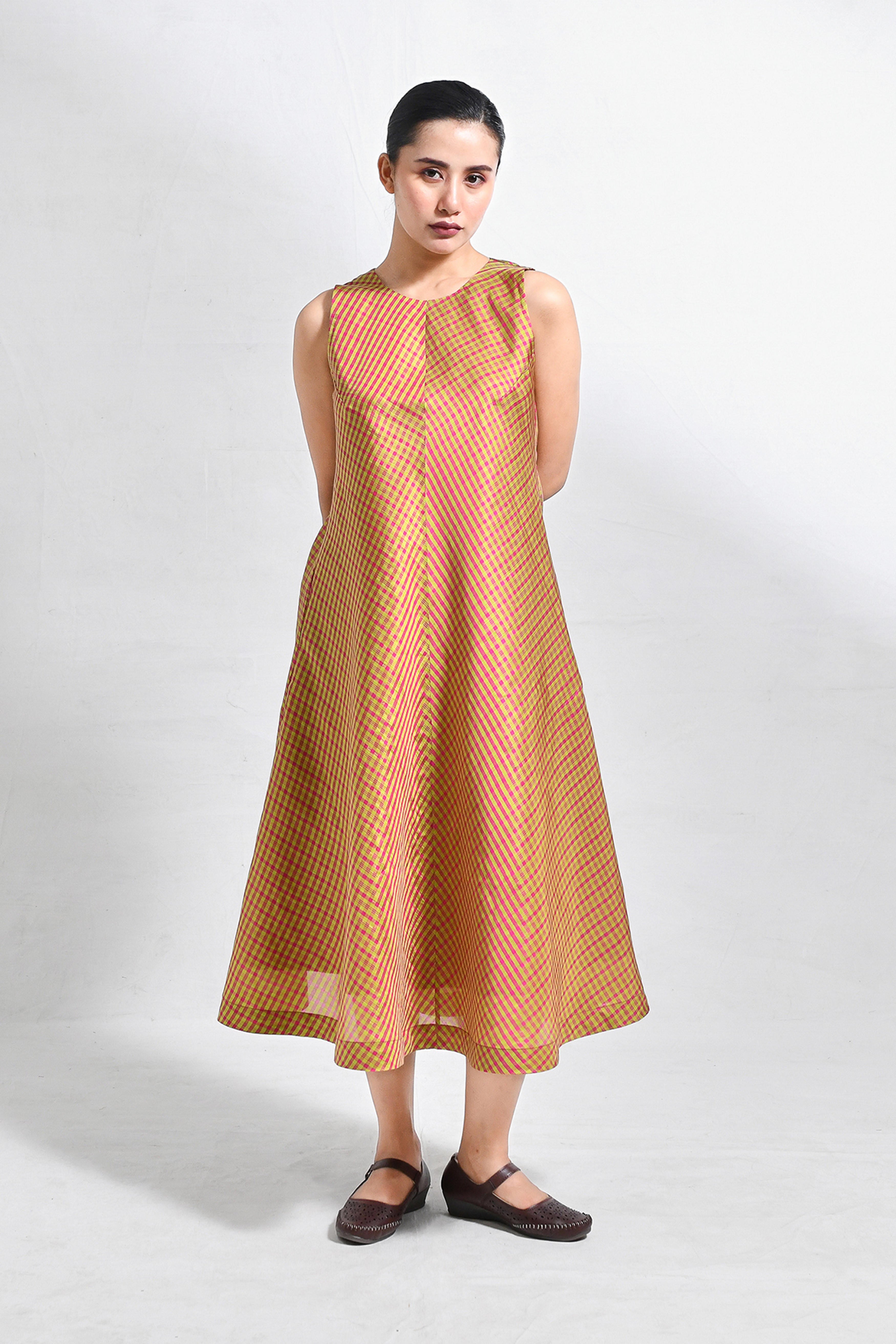 Crafted from luxurious handwoven Bangalore silk in pink and olive checks, this elegant co-ord set features a sleeveless A-line dress paired with a structured blazer. The dress offers a slimmer fit with a subtle flare, complete with pockets and an attached lining for all-day comfort. The matching blazer adds a touch of tailored sophistication with its classic notch lapels, full-length sleeves, and functional front pockets. Together, they form a refined and versatile ensemble — perfect for both daytime elegance and evening polish. Model is 5'5, wearing a Size S.