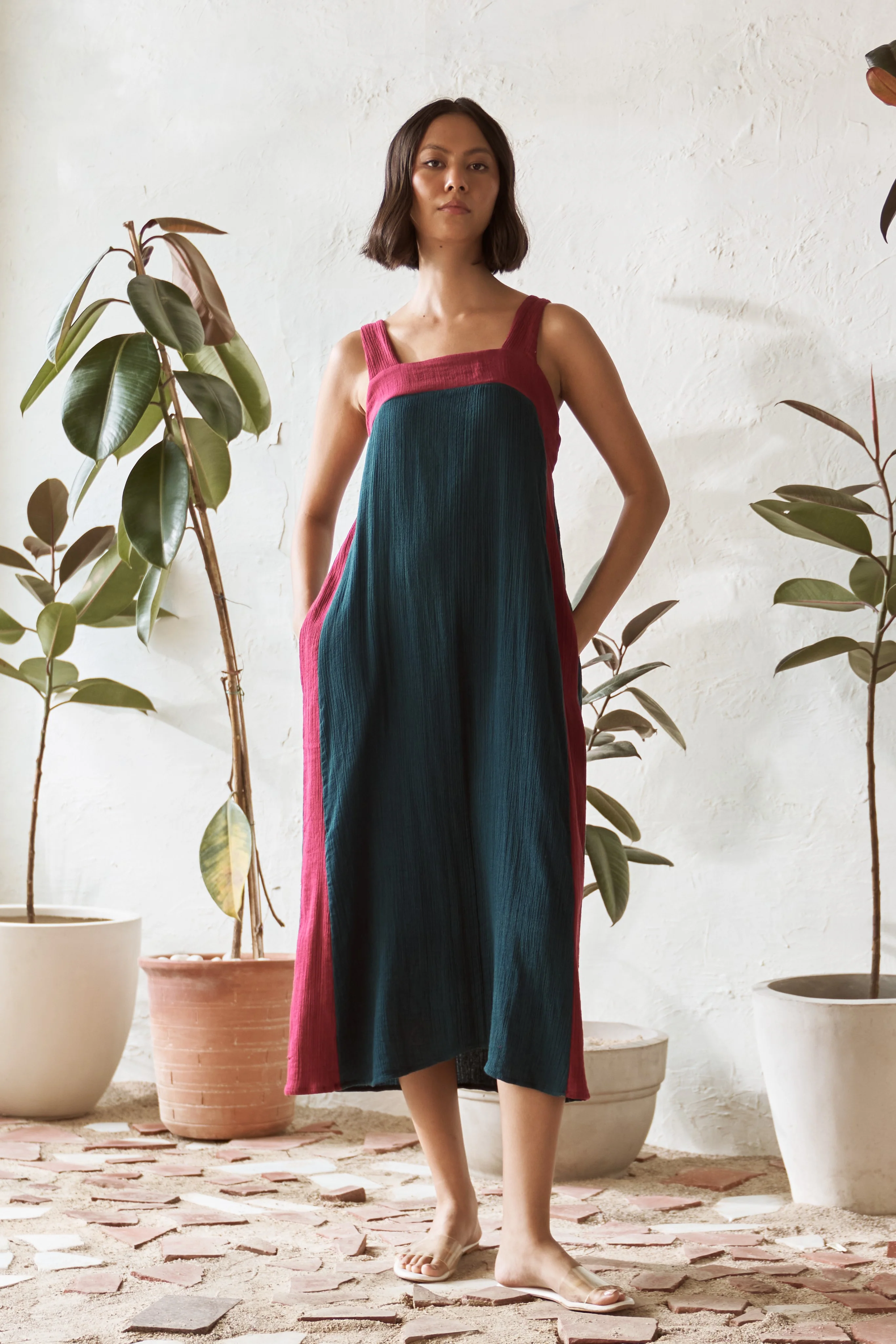Slip into effortless style with our breezy, mid-length square neck dress in a teal color. The square neckline, accented with a contrasting pop of crimson color, adds a fresh twist to this classic silhouette. Subtle contrast along the side seams enhances the boldness of the look, giving it a distinct flair. Designed for comfort, this dress flows gently with every step, making it a versatile go-to piece for any occasion. With its blend of comfort and style, this teal dress is the perfect addition to your wardrobe for a standout yet relaxed appearance.