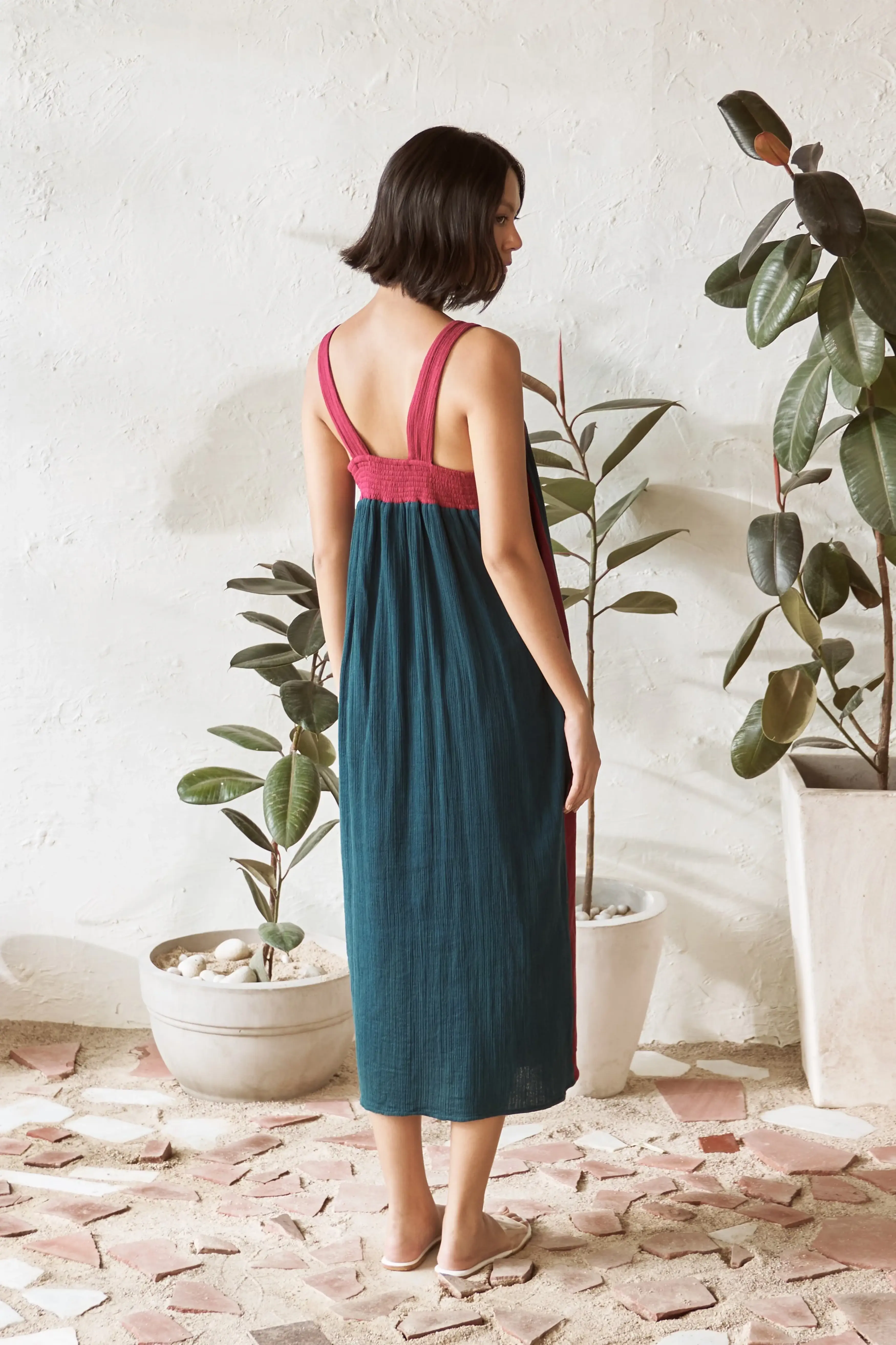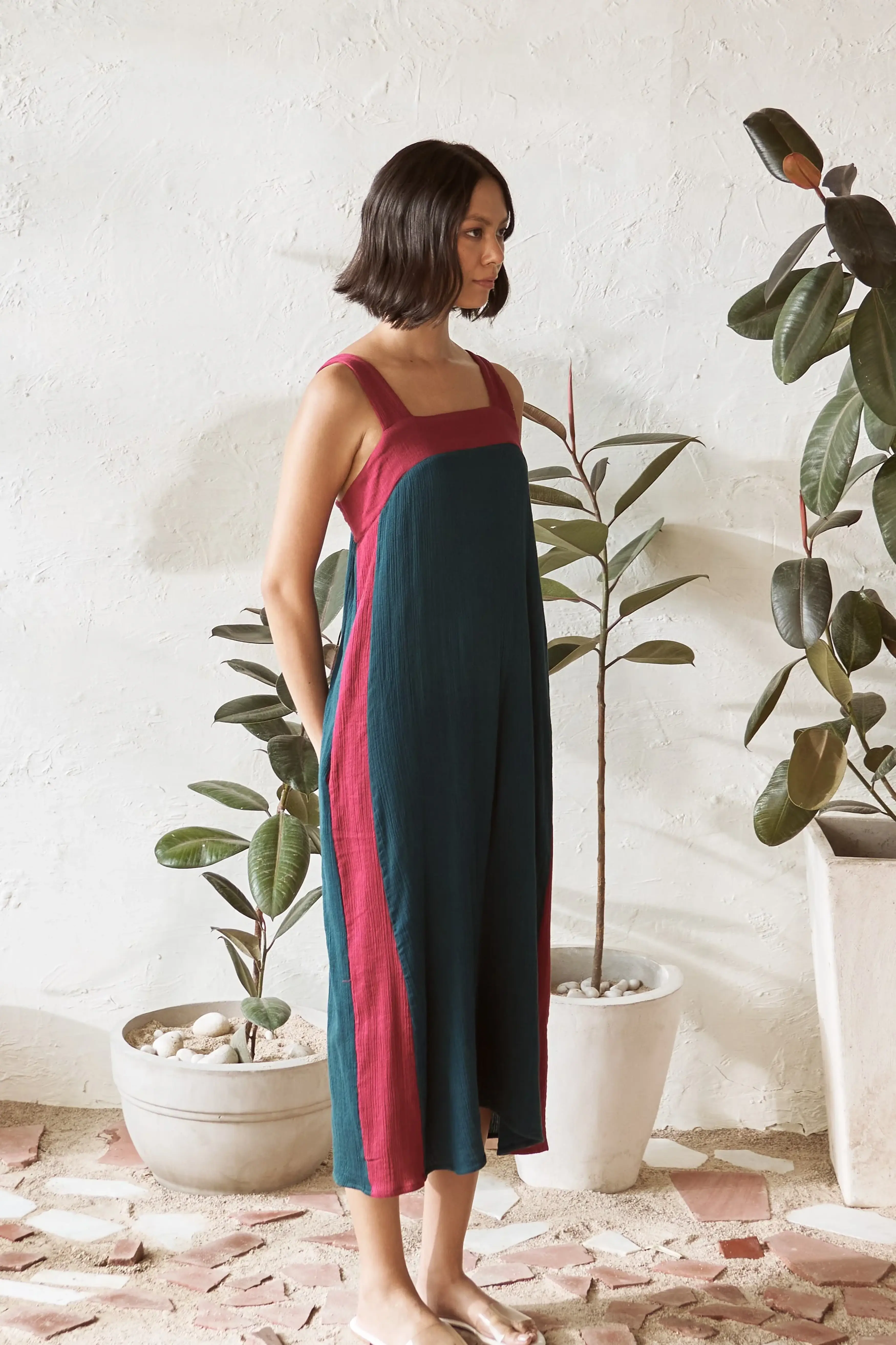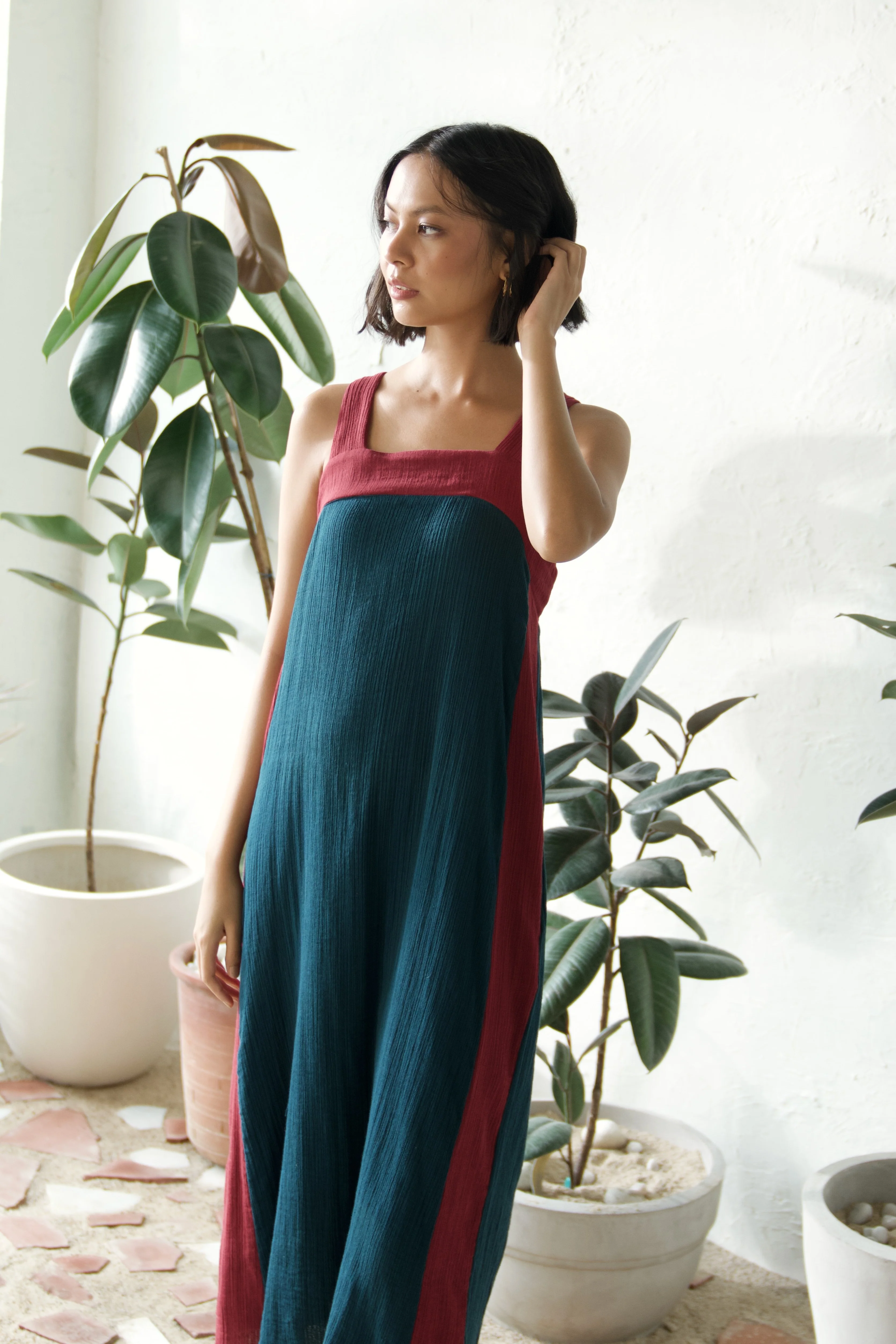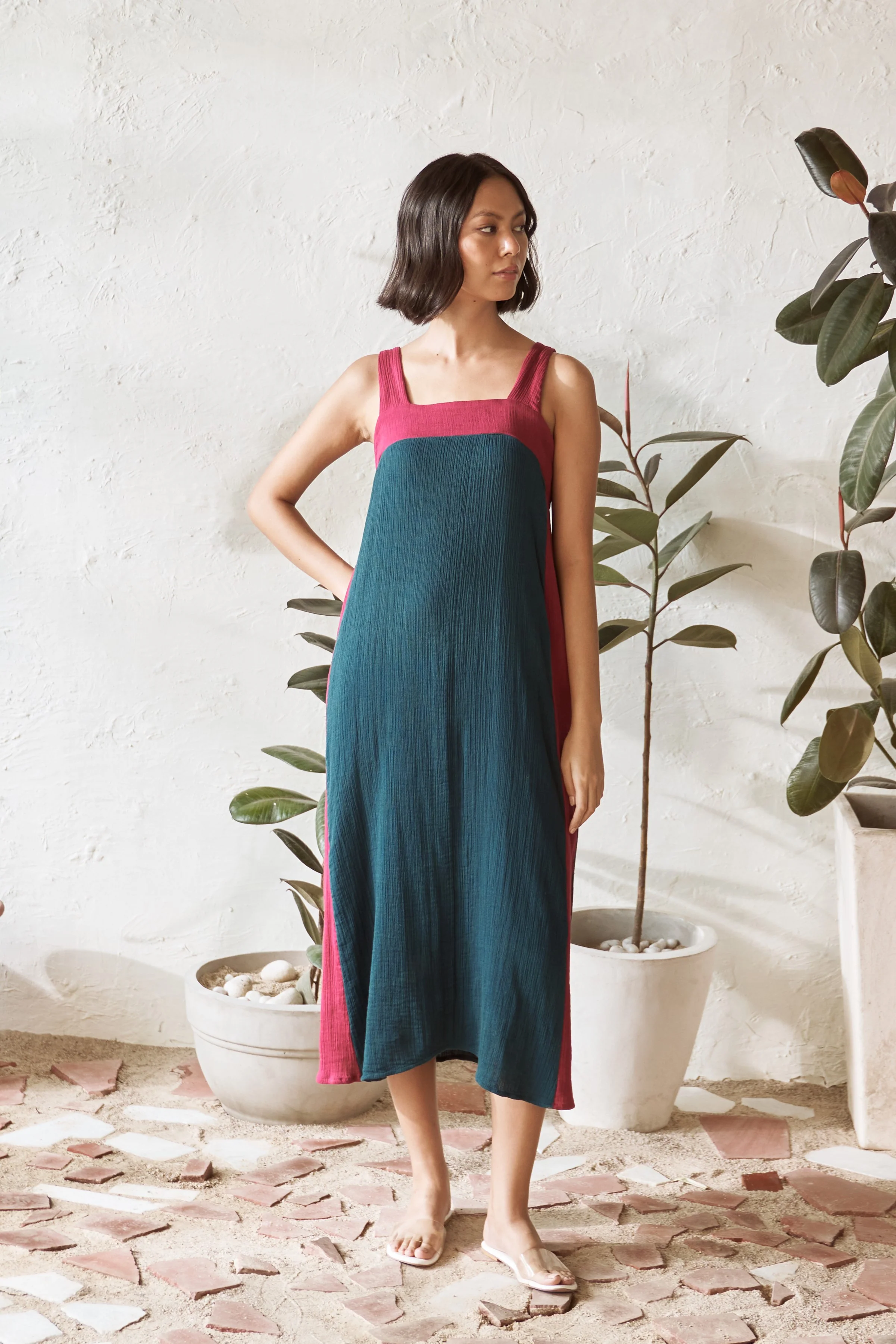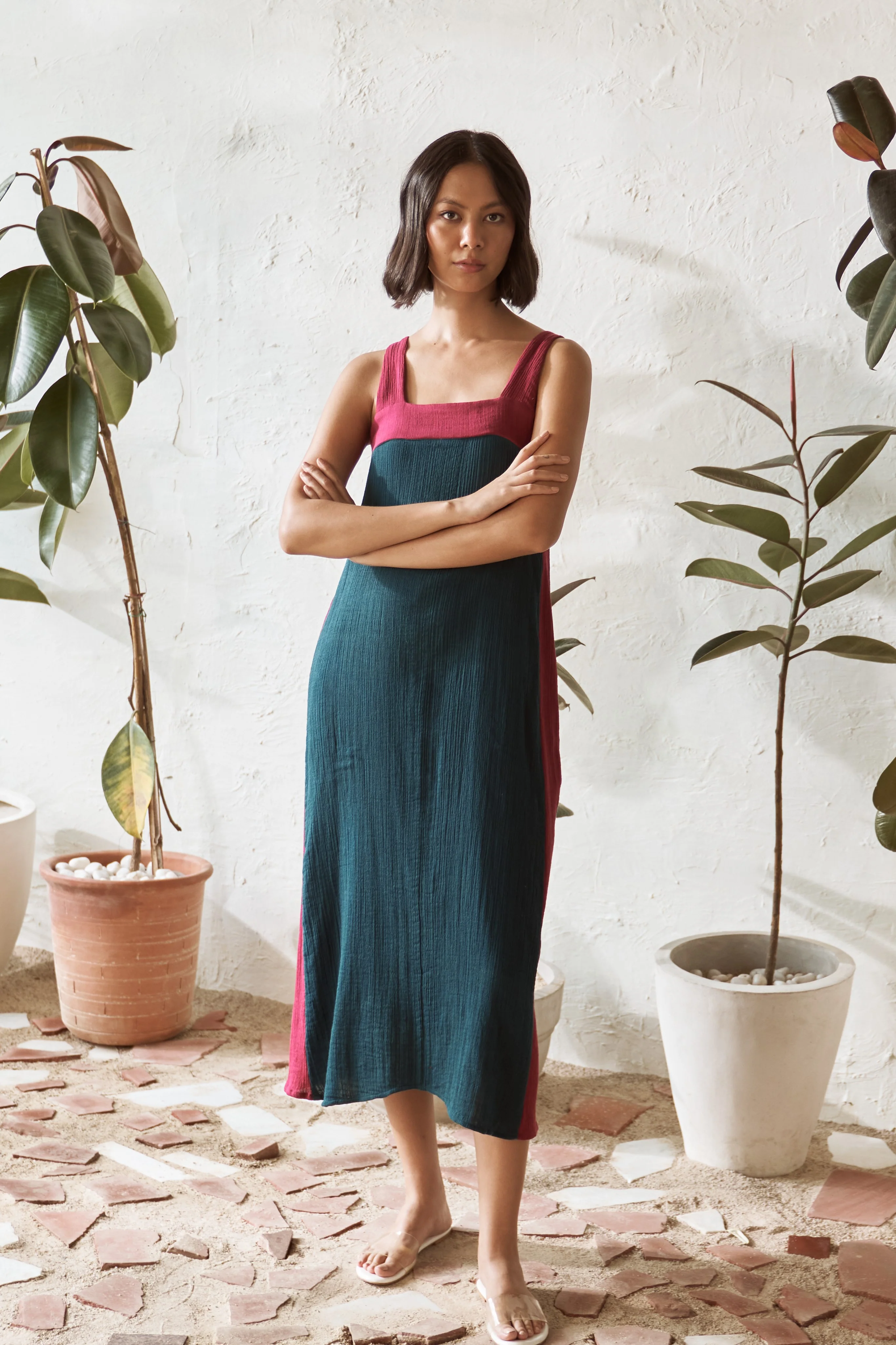 Slip into effortless style with our breezy, mid-length square neck dress in a teal color. The square neckline, accented with a contrasting pop of crimson color, adds a fresh twist to this classic silhouette. Subtle contrast along the side seams enhances the boldness of the look, giving it a distinct flair. Designed for comfort, this dress flows gently with every step, making it a versatile go-to piece for any occasion. With its blend of comfort and style, this teal dress is the perfect addition to your wardrobe for a standout yet relaxed appearance.