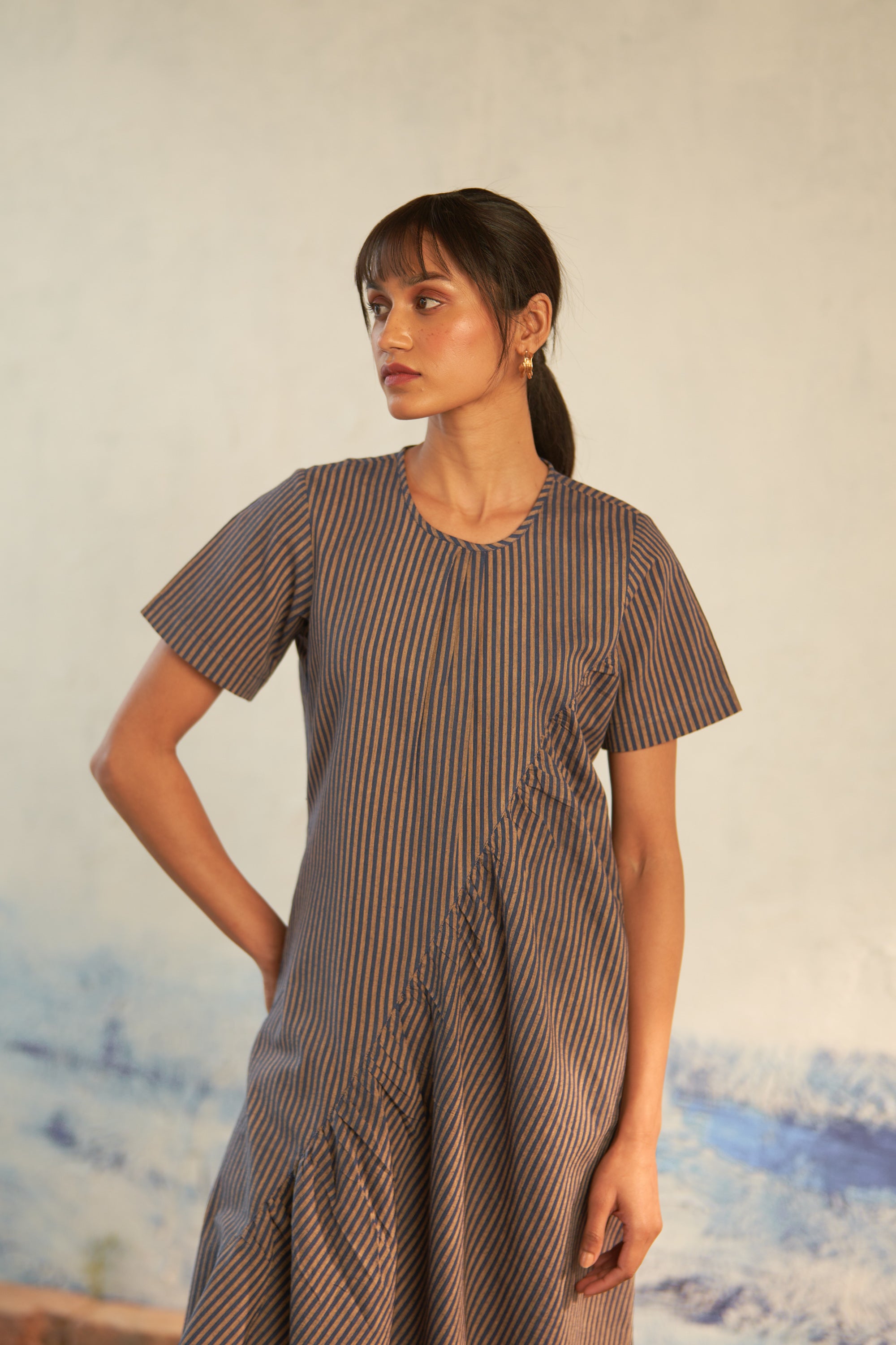 The kurta set epitomizes a timeless essential for every modern woman's wardrobe, ideal for a carefree casual day. Falling gracefully at knee length, it boasts an asymmetric gathered waistline, adorned with an intriguing interplay of stripes for a subtle touch of uniqueness. Keeping things laid-back yet stylish, it sports a crew neck and short sleeves. Complete the effortless ensemble by pairing it with matching pants featuring an elasticated waistband and drawstring for ultimate comfort and ease.