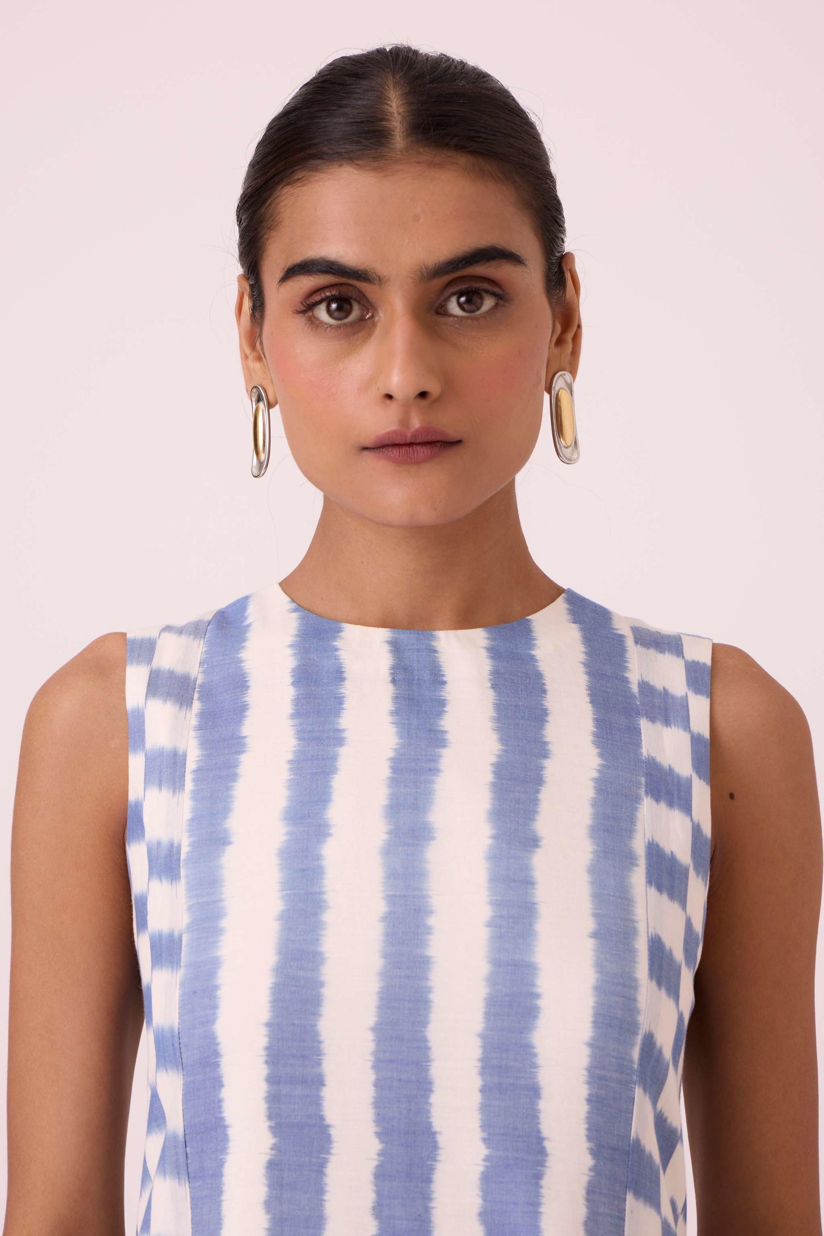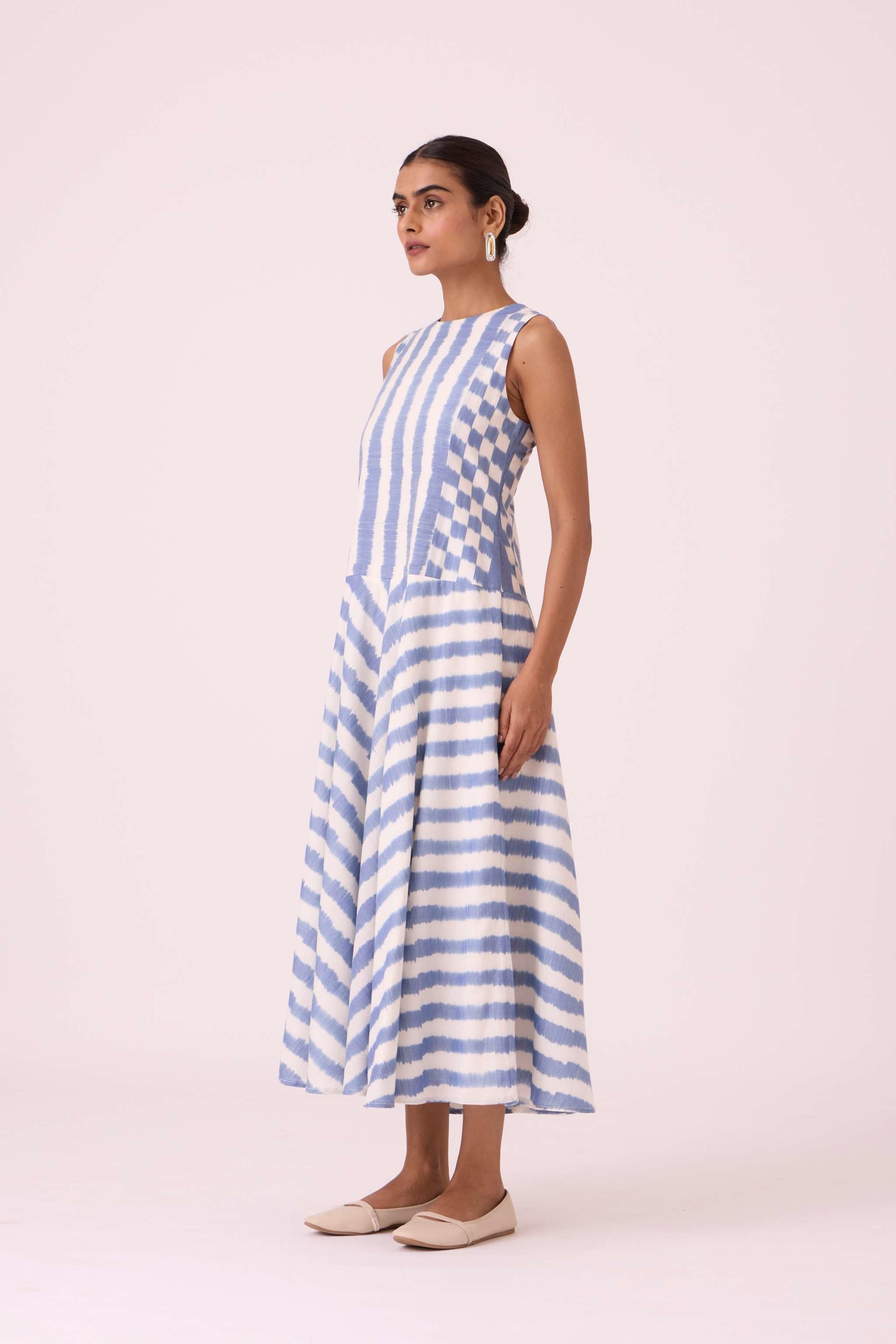 This is a *sleeveless, regular-fit dress* with a distinctive *drop waist* and *panelled* design. It features a convenient *back zip*, along with practical *in-seam pockets*, and is *fully lined*. The dress is made from a studio-developed *Ikat design* that is *handwoven by artisans in Telangana*. The text notes that any slight irregularities in the fabric are a natural characteristic of the handmade process. For sizing, Chhavi, who is 5'6", is wearing an XS.