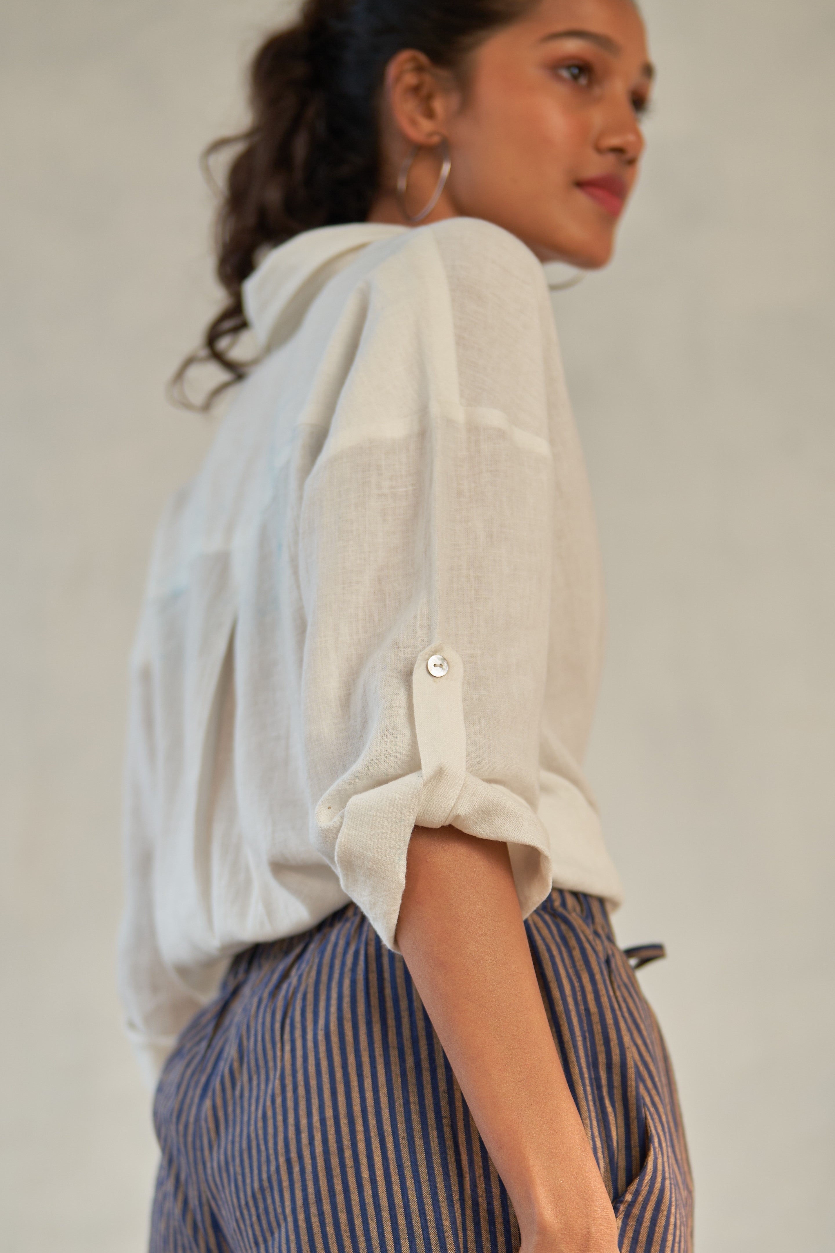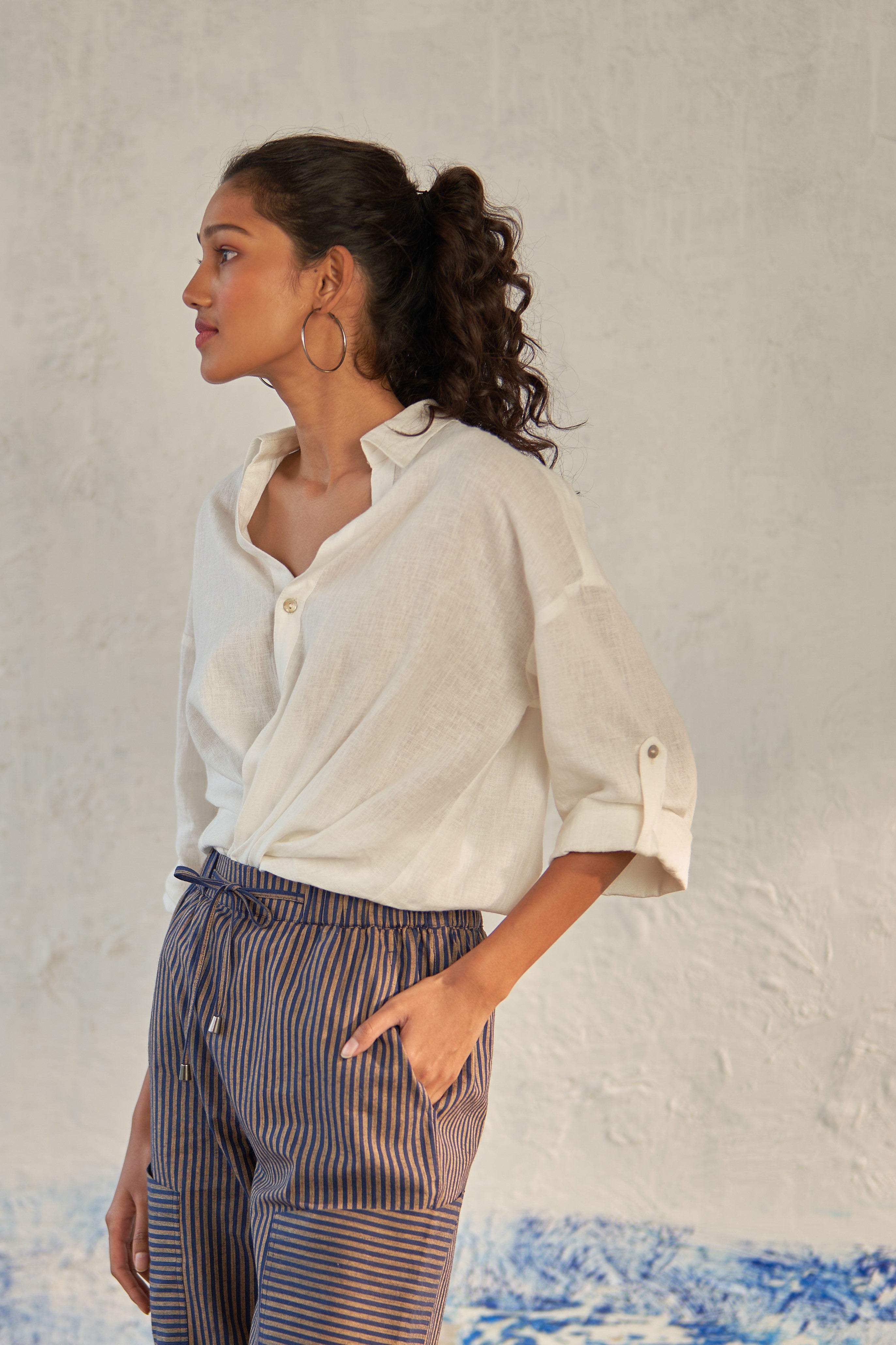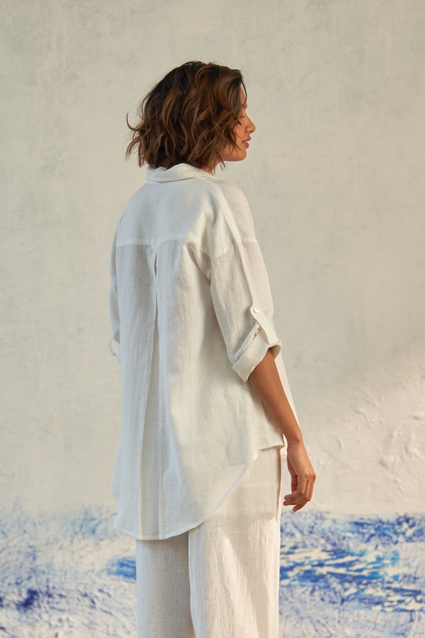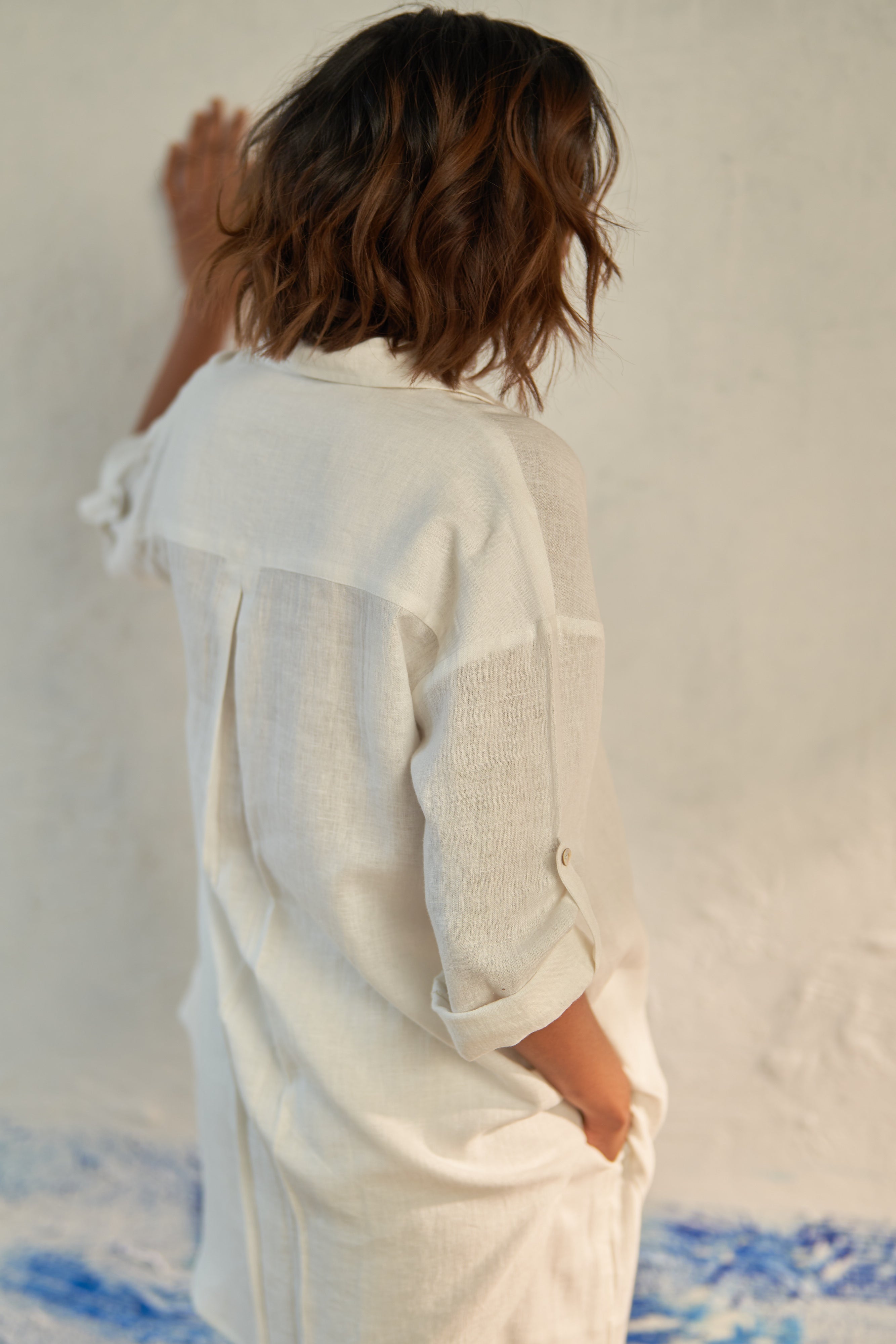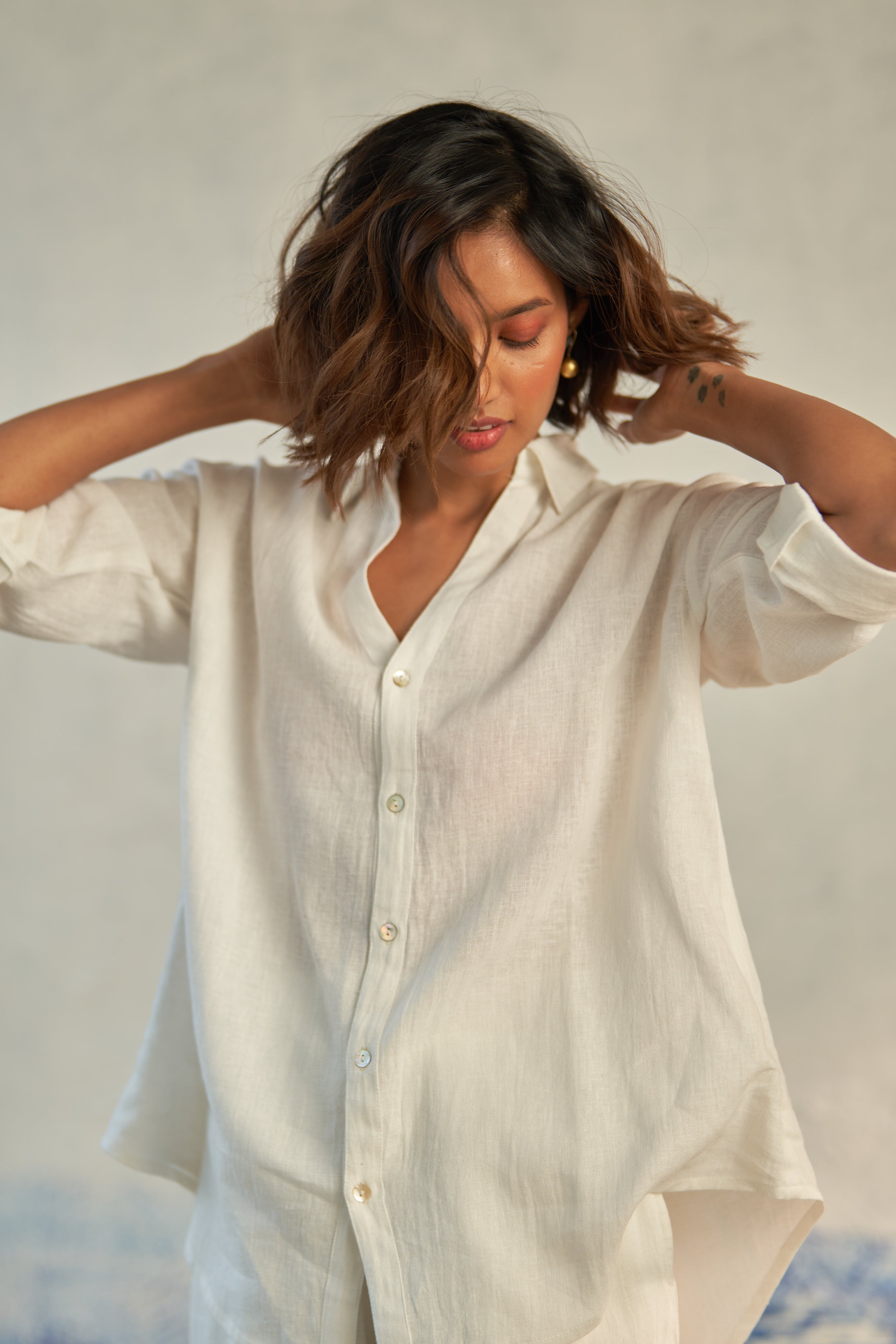 Crafted from natural flex fabric, this flowing white shirt boasts an oversized silhouette, a flattering V-neck, a gently curved hemline, and exquisite shell buttons. Versatile and chic, it effortlessly pairs with any bottom of your choice. For the ultimate summer ensemble, style it with our matching pajamas.