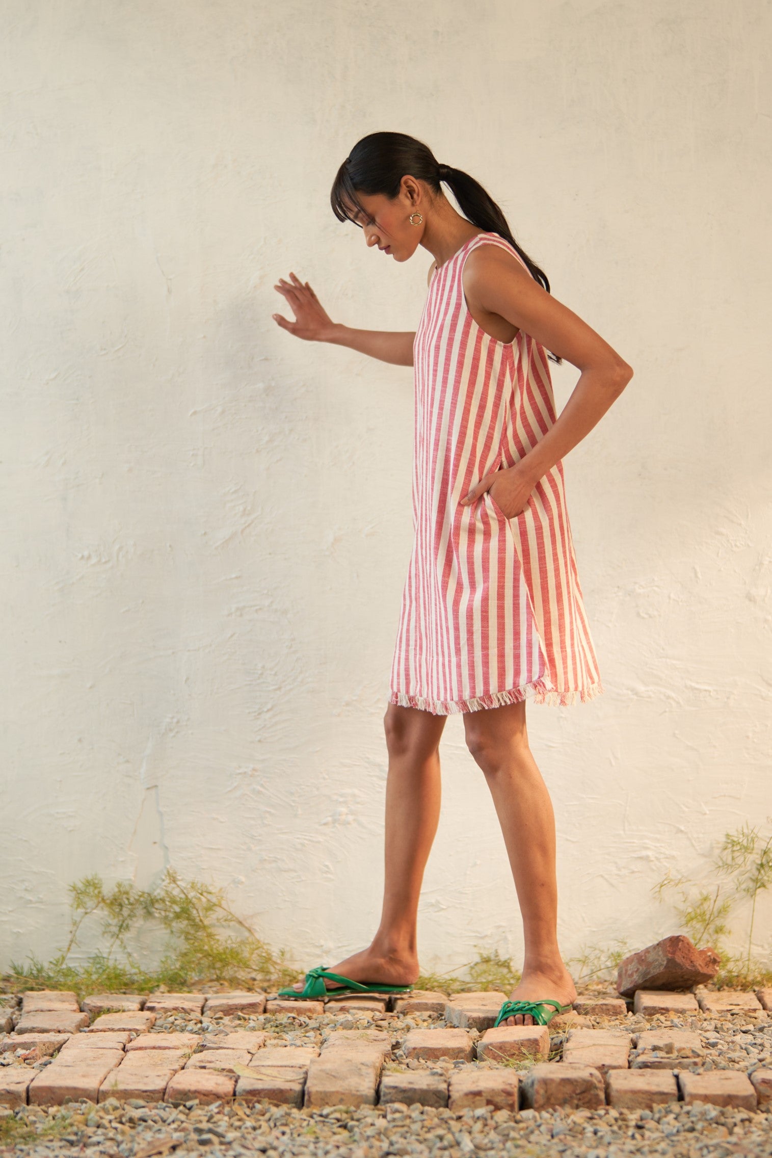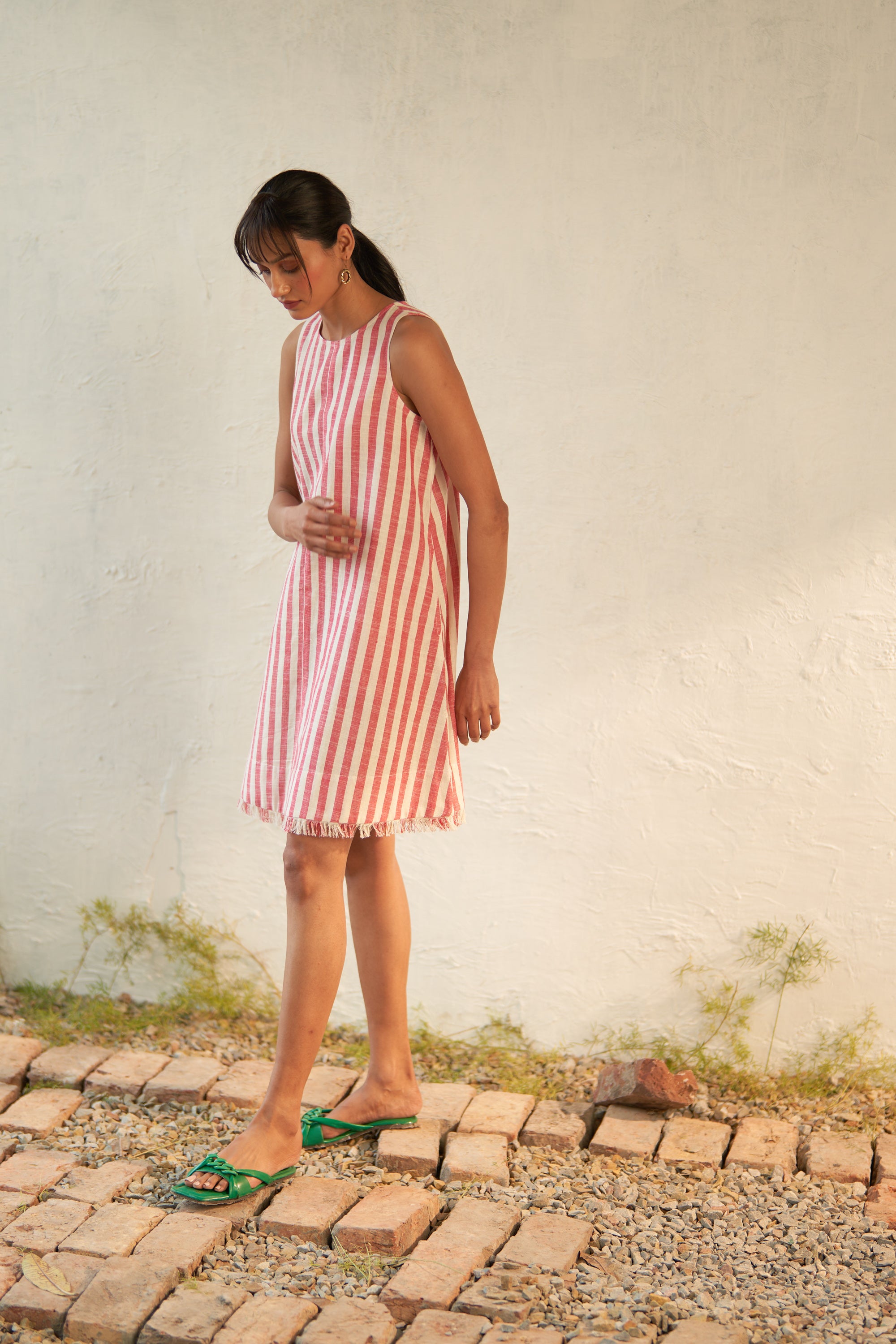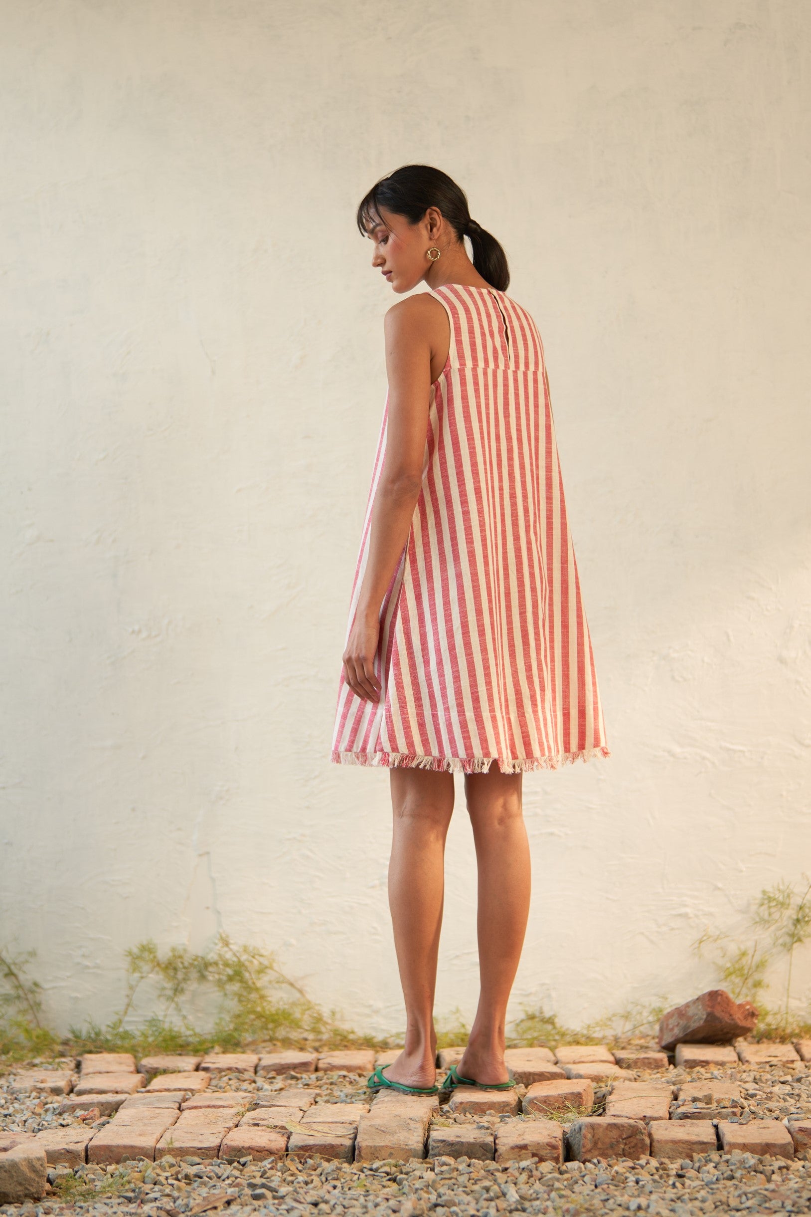The classic mini takes on a new guise with Canoopi's striped fringed short dress. This dress nods to all things cool with its round neck, deep arm cuts, fringed hem, and breezy silhouette. Perfect for a leisurely day out or a stylish lunch.