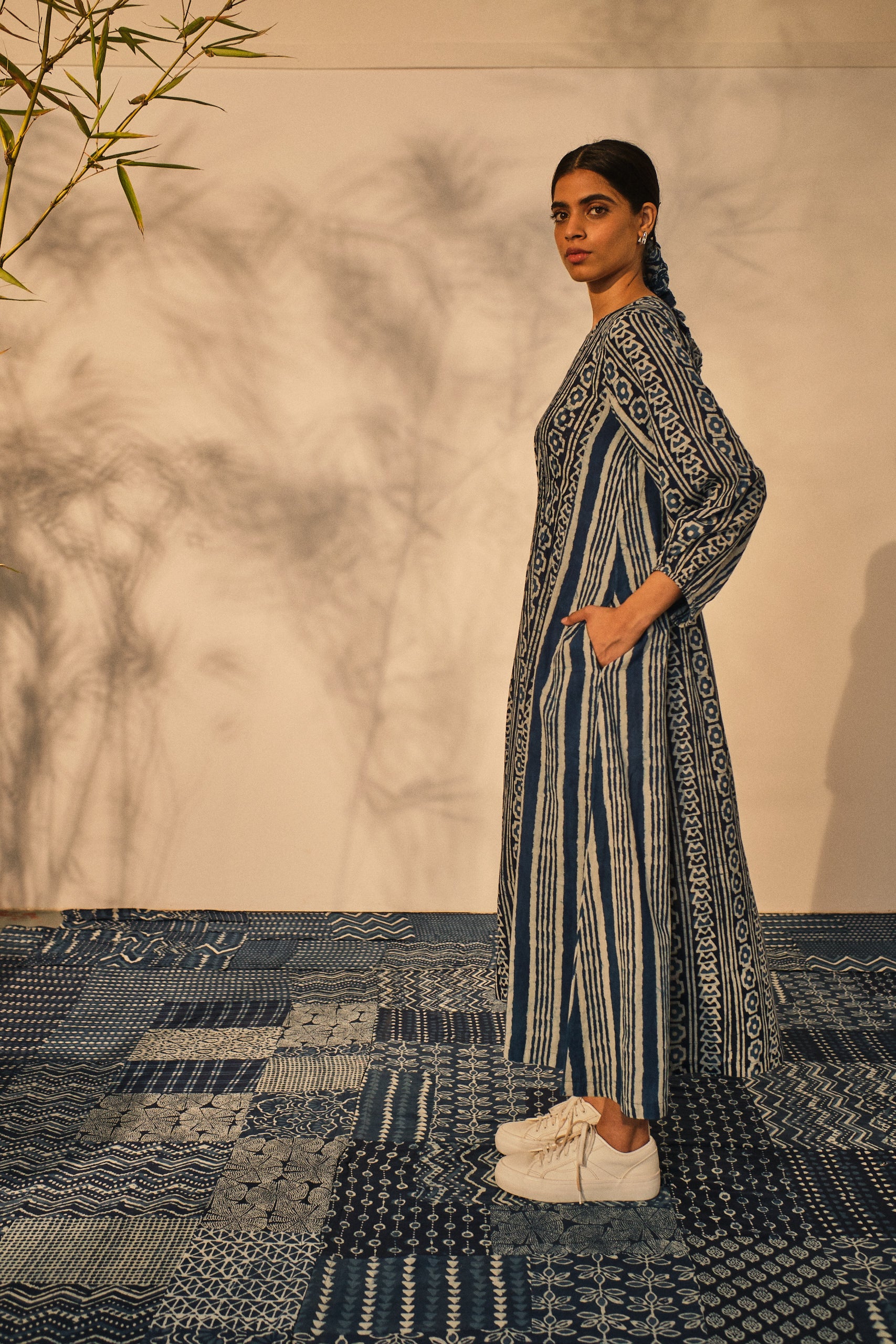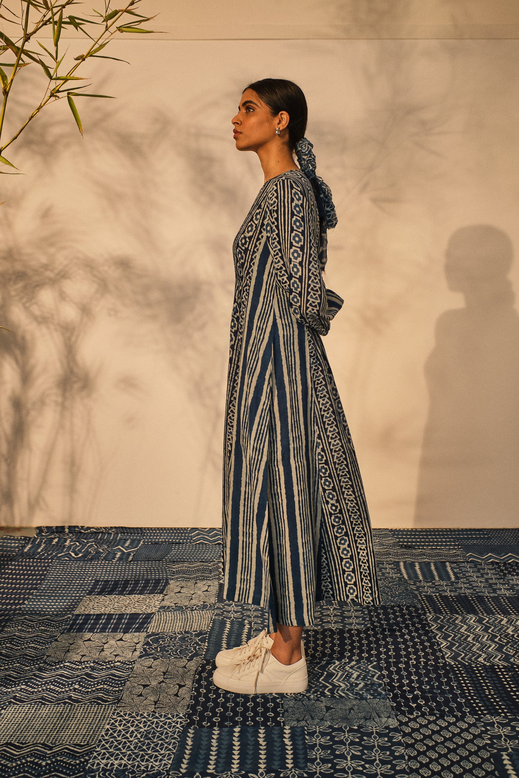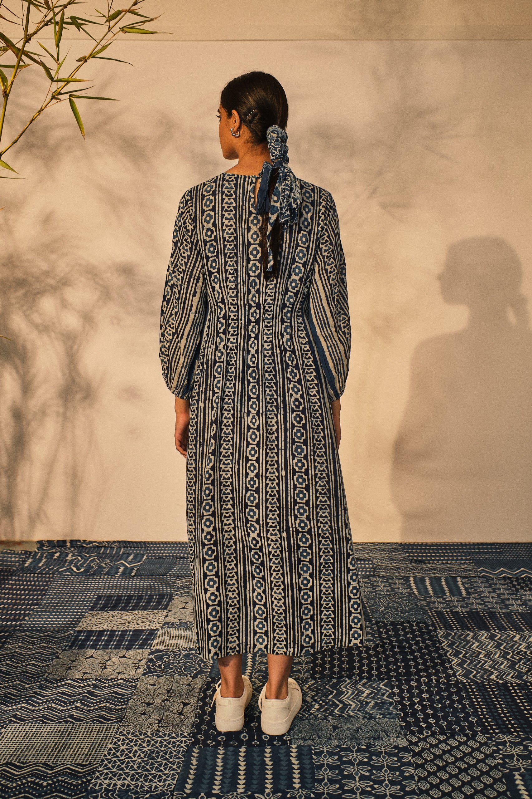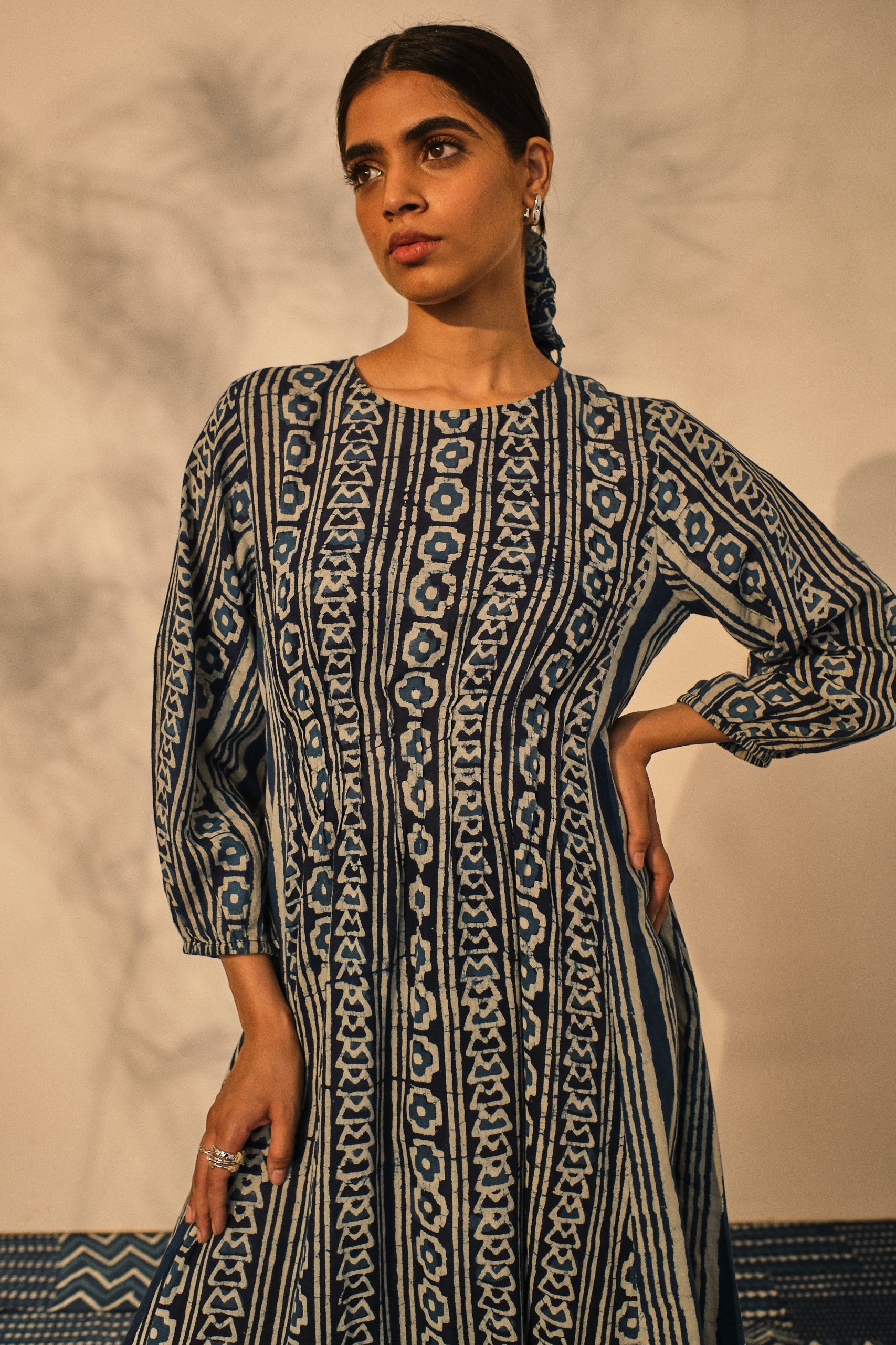 Geometric print pleat detailing dress with side stripe panel detail. Full sleeves, U neck dress with pockets.