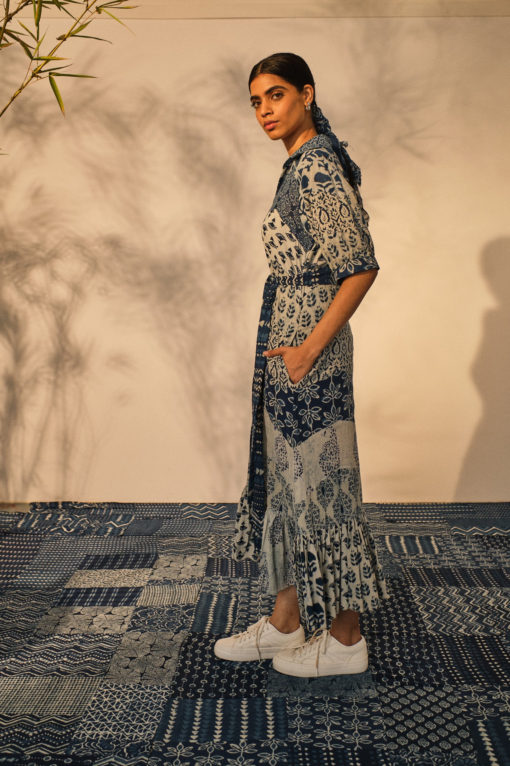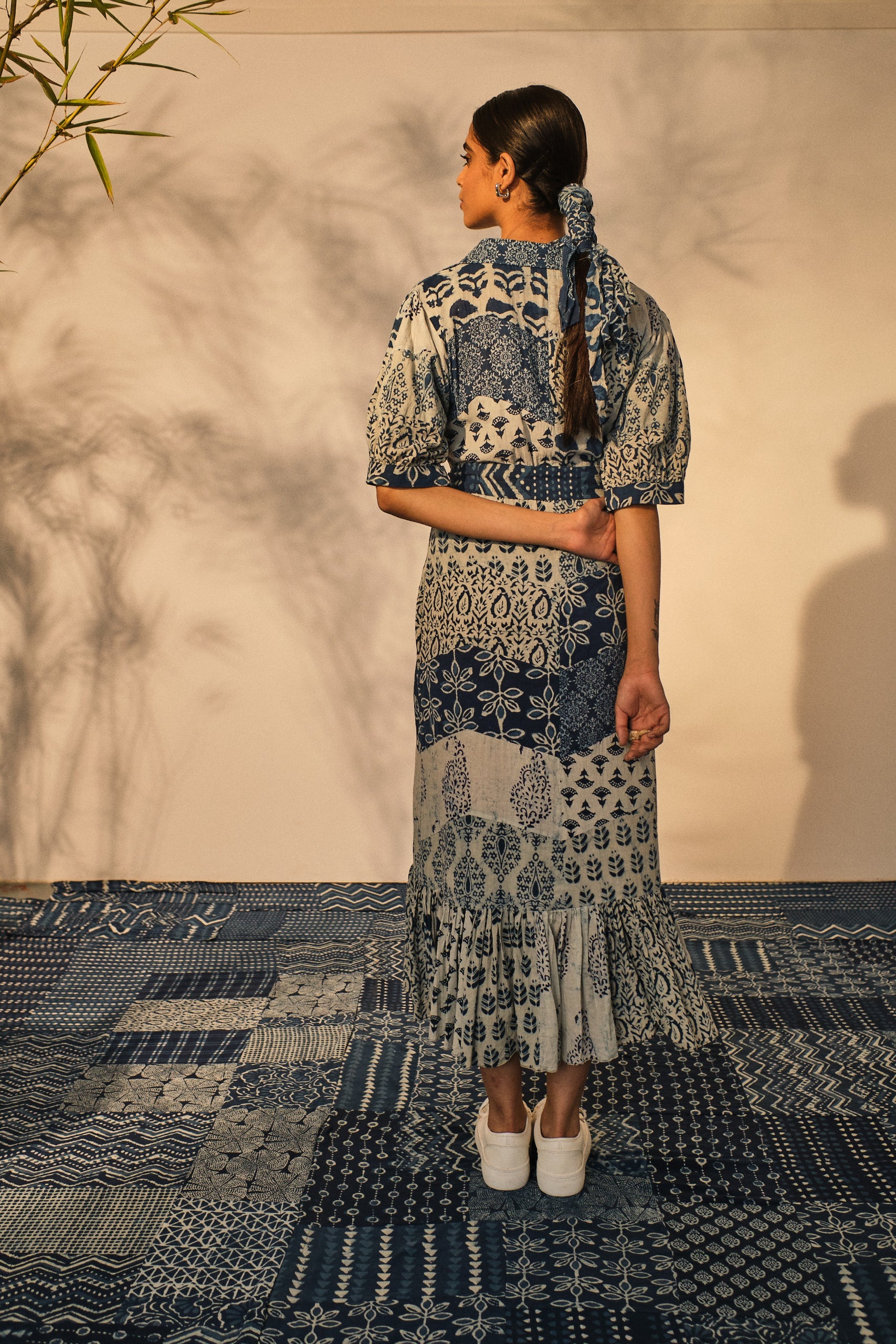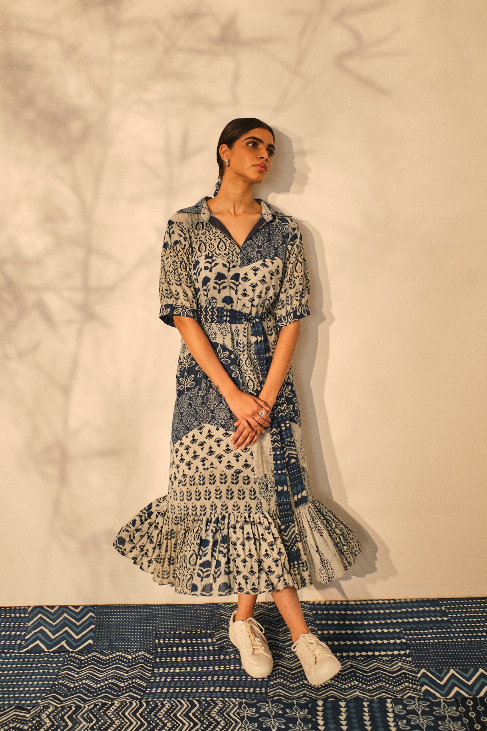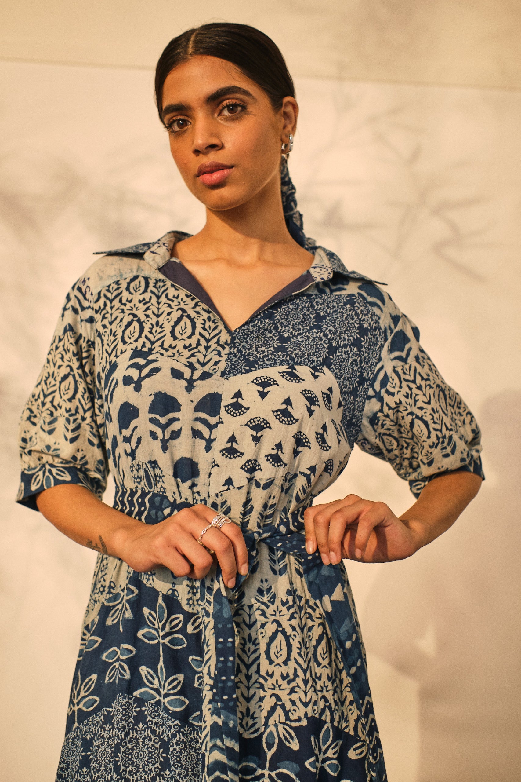 Patchwork collared dress with hemline gathers, half sleeves and belt. Pockets on either sides.