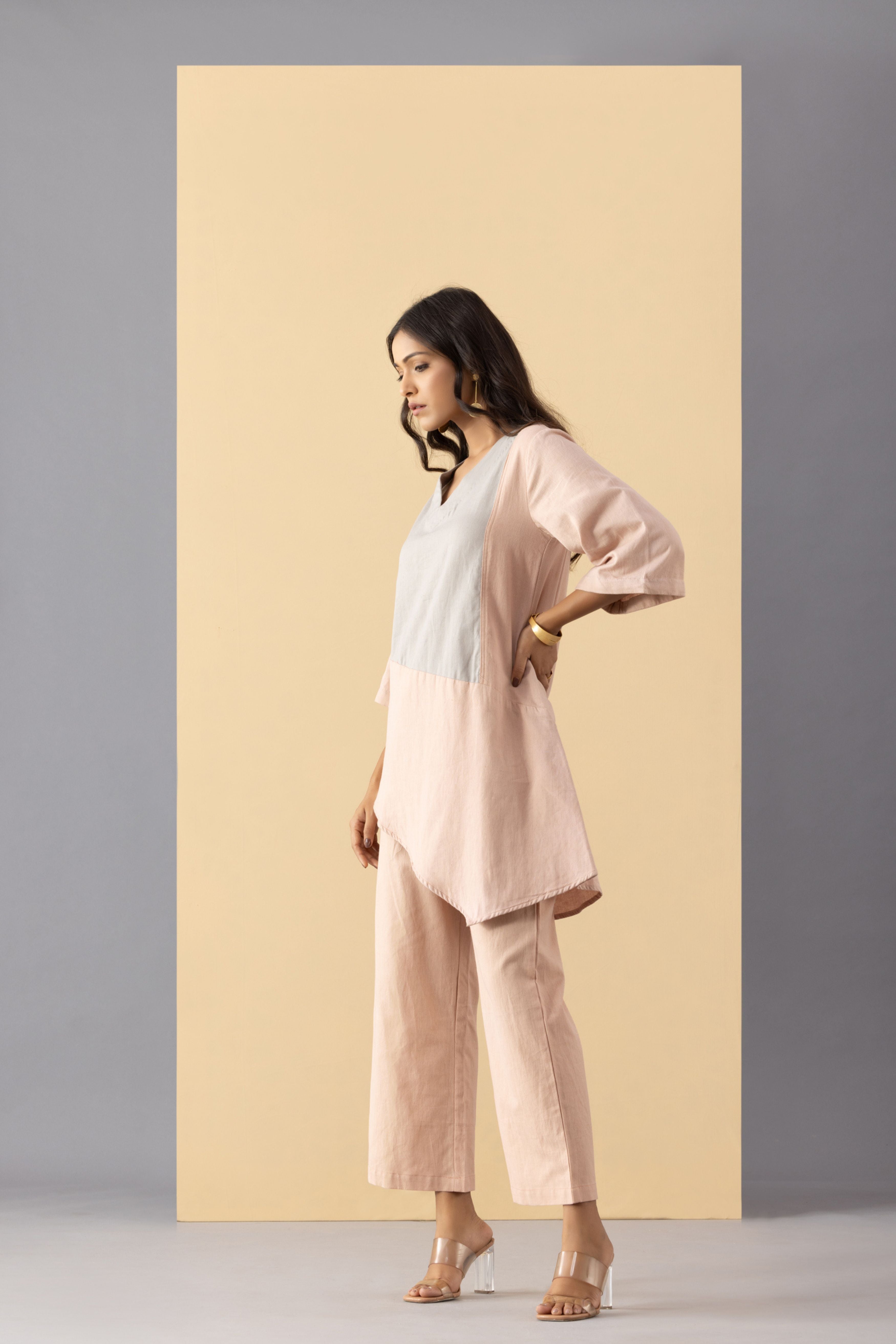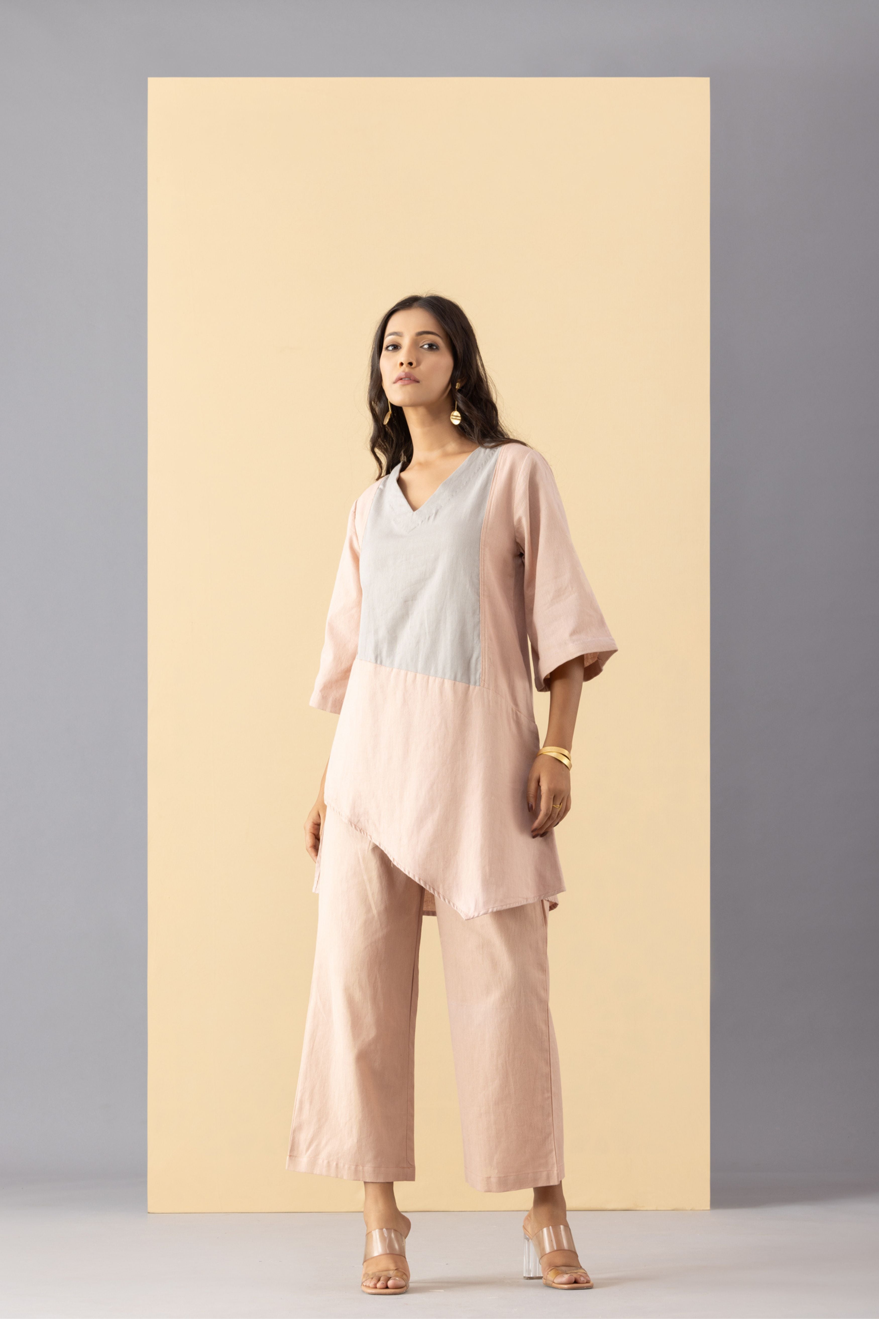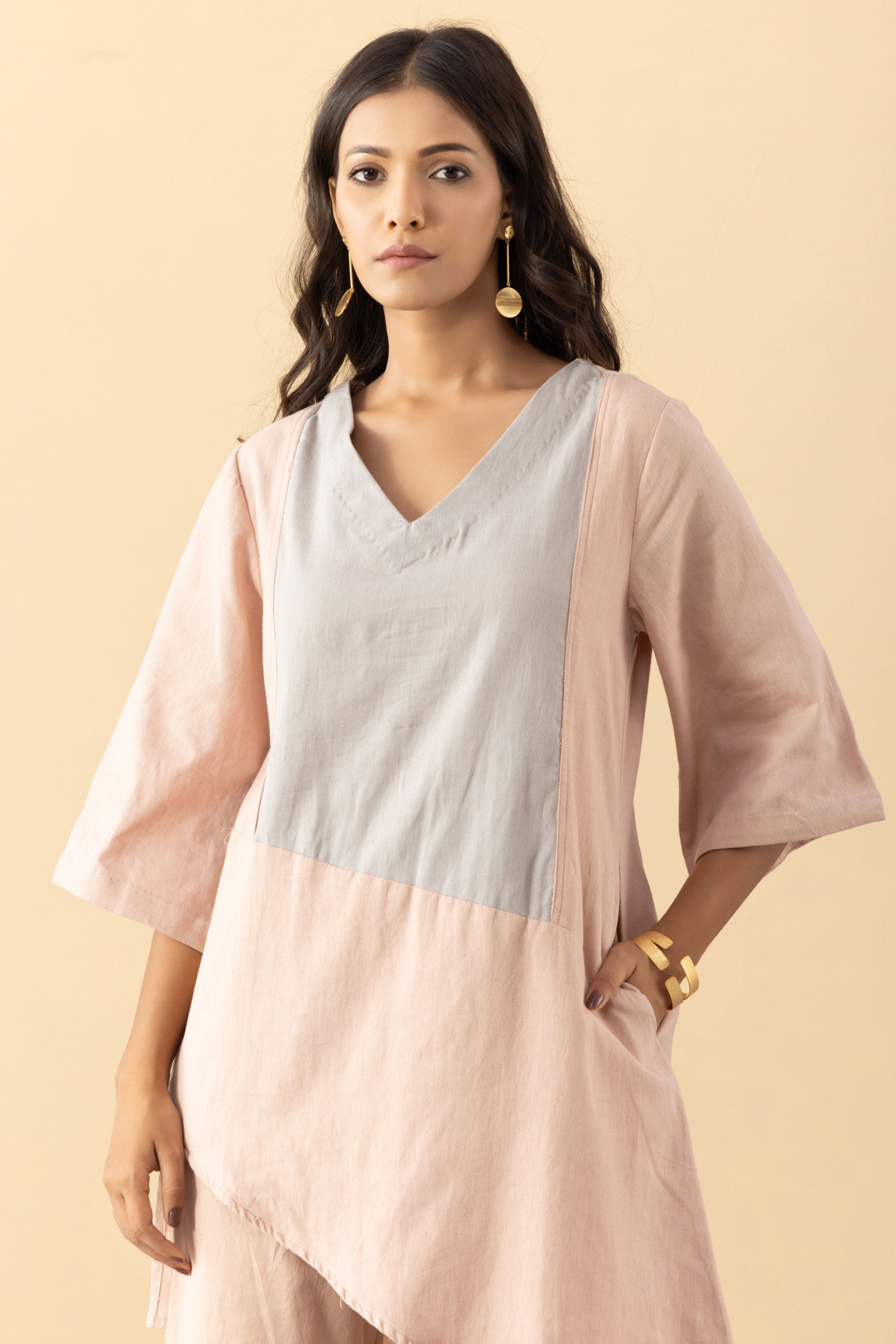 This two toned asymmetric tunic is crafted in light weight Khadi Cotton. Designed to be worn with our dusty pink khadi pants . This tunic is made with breathable, comfort fabric. It is perfect for daily wear or festive occasions for that subtle minimal look. - Asymmetric a-line tunic with side pockets - Regular fit - Model is wearing size S - This is a textile fabric. The subtle imperfections in the weave, texture and colors are a natural outcome of handcrafted textiles and not a defect.