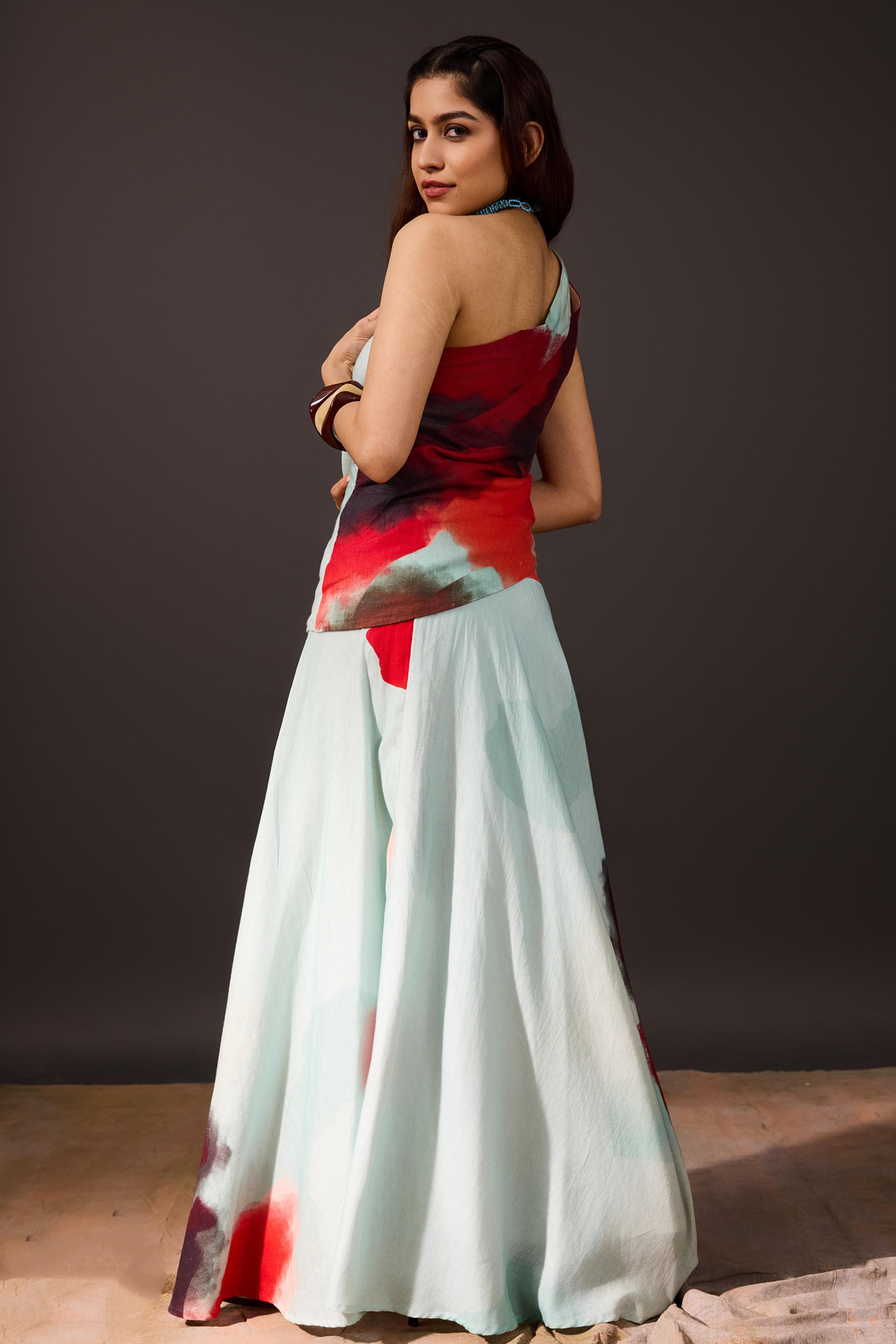 The Nirmala Set in Lagoon is a bold and contemporary take on traditional separates. Crafted from 100% linen, the two-piece set features an asymmetrical one-shoulder blouse with sculpted cut-out details at the waist, held together with a fabric ring. Paired with a flowing, high-waisted skirt, the silhouette balances structure with fluidity. The Lagoon colour story blends soft aqua hues with vivid bursts of crimson and deep maroon, to mimic organic brushstrokes. Perfect for festive evenings or statement occasions, the Nirmala Set exudes effortless drama while remaining rooted in comfort.