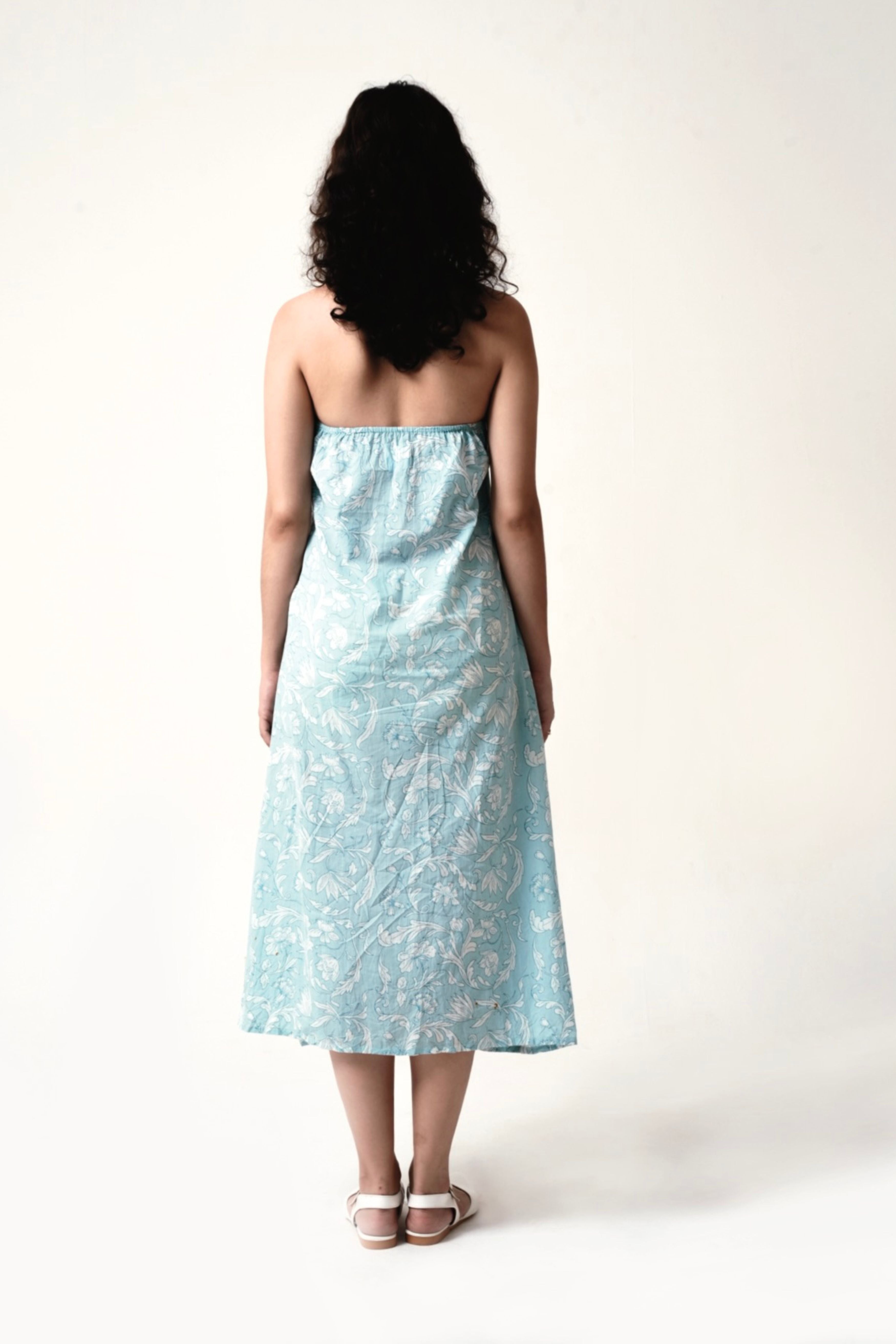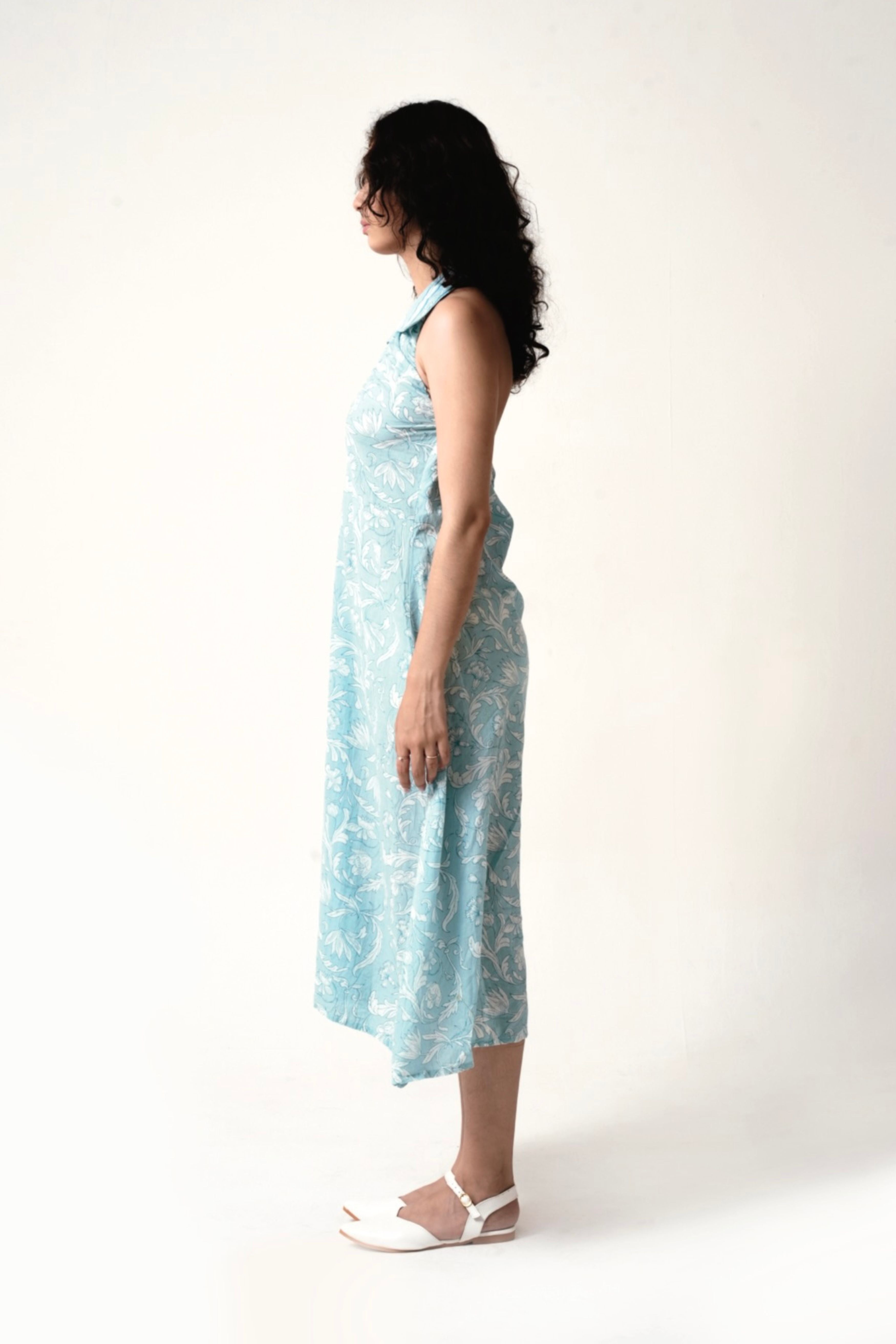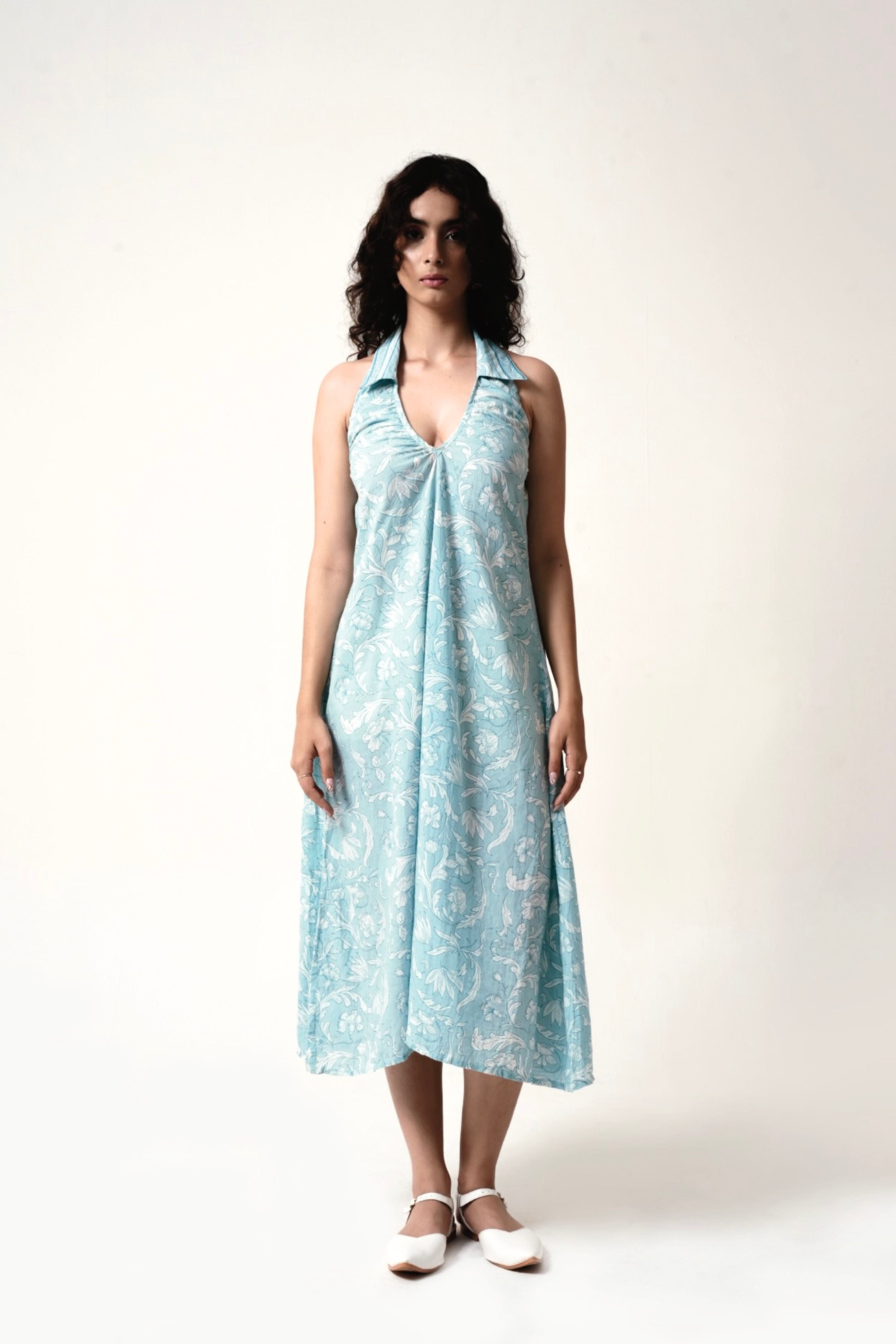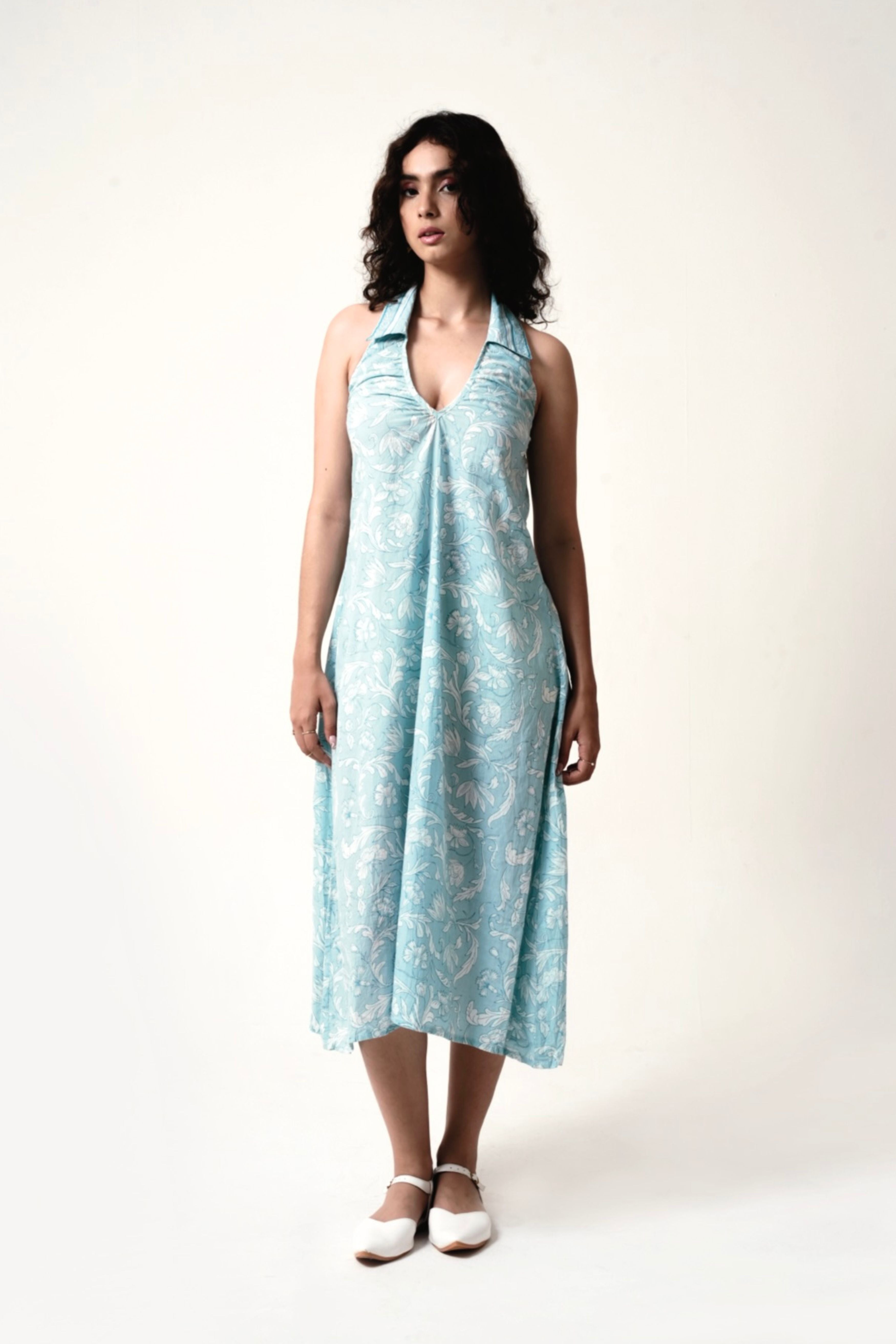 This Halter-Neck Maxi Dress in a serene blue hue embodies understated elegance with its flowing silhouette and delicate hand-screen print. The two-piece collar adds a structured touch to the neckline, while the backless design enhances its modern allure. The flattering A-line silhouette enhances the figure, while the soft, breathable fabric provides all-day comfort. Model is 5'8 and is wearing a size XS.