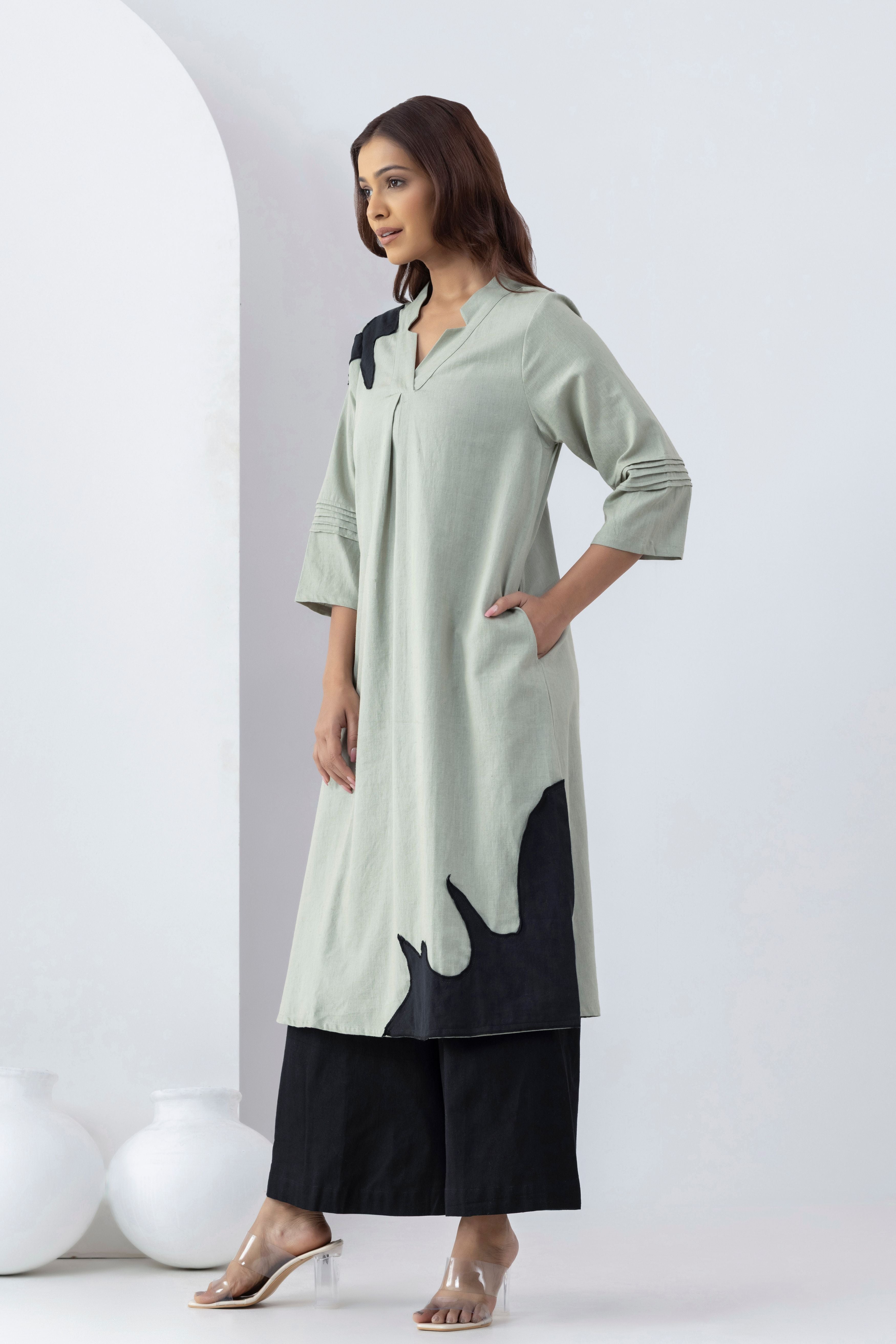 Noa Tunic Set crafted from 100% organic chambray cotton fabric combines an elegant A-line tunic in sage green colour capturing black applique patchwork detail and centre front pleat in the tunic paired with all black high waist pants. The relaxed silhouette, clean lines and subtle movement give Noa Tunic Set a sophisticated yet effortless appeal - perfect for days when you want to feel comfortable yet stylish. You can carry it as a dress or pair it with black pants for a more formal setup. - Noa Tunic Dress consists of A-line silhouette with centre front pleat and doodle applique patchwork. - Tunic also features our signature V-shaped neckline, pin tuck pleats on the sleeves and side pockets. - All black pants have side zipper and wide legged hem Model is wearing a size S - This is textile fabric, subtle imperfections in the weave, texture and colours are natural outcome of handcrafted textiles and not a defect.