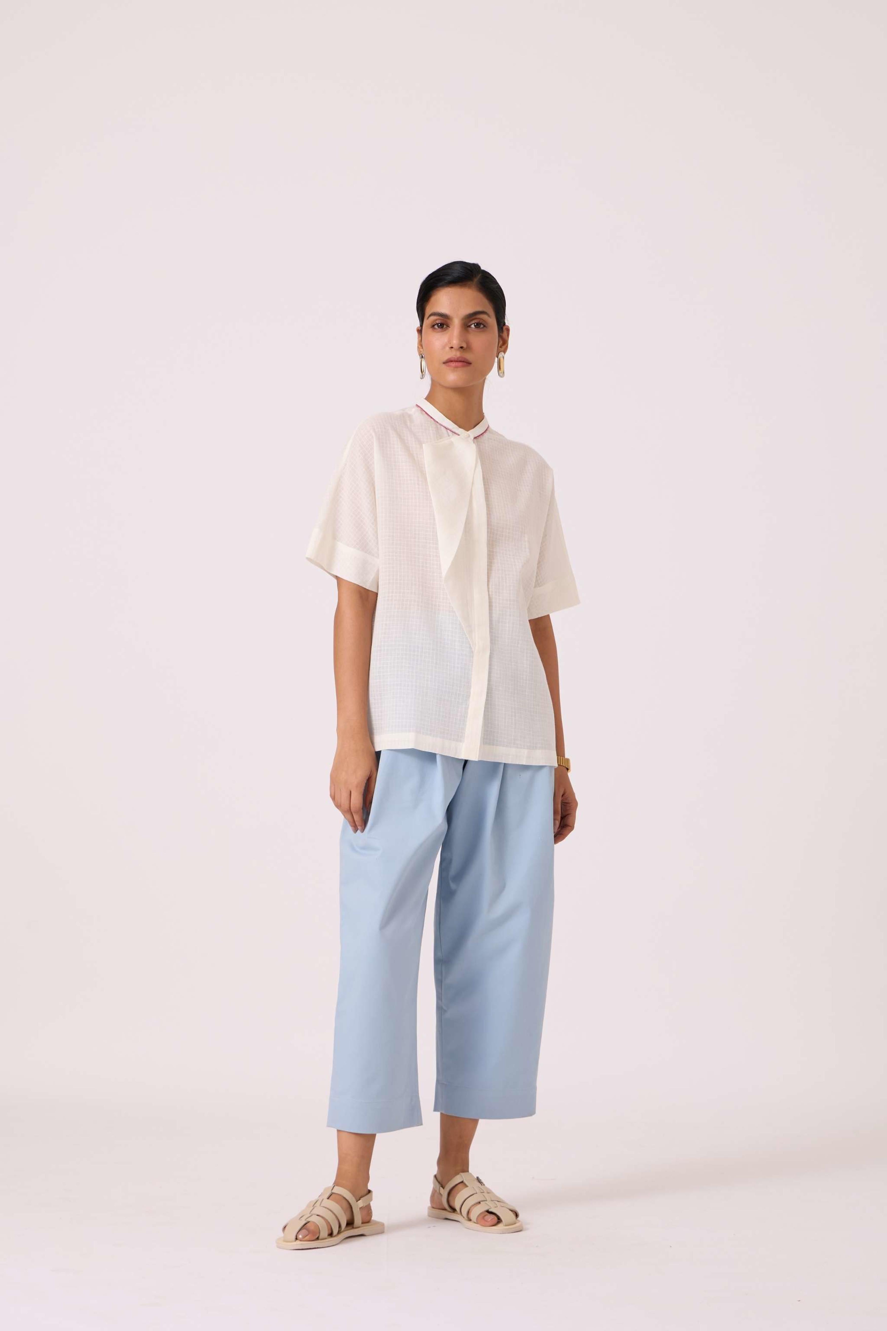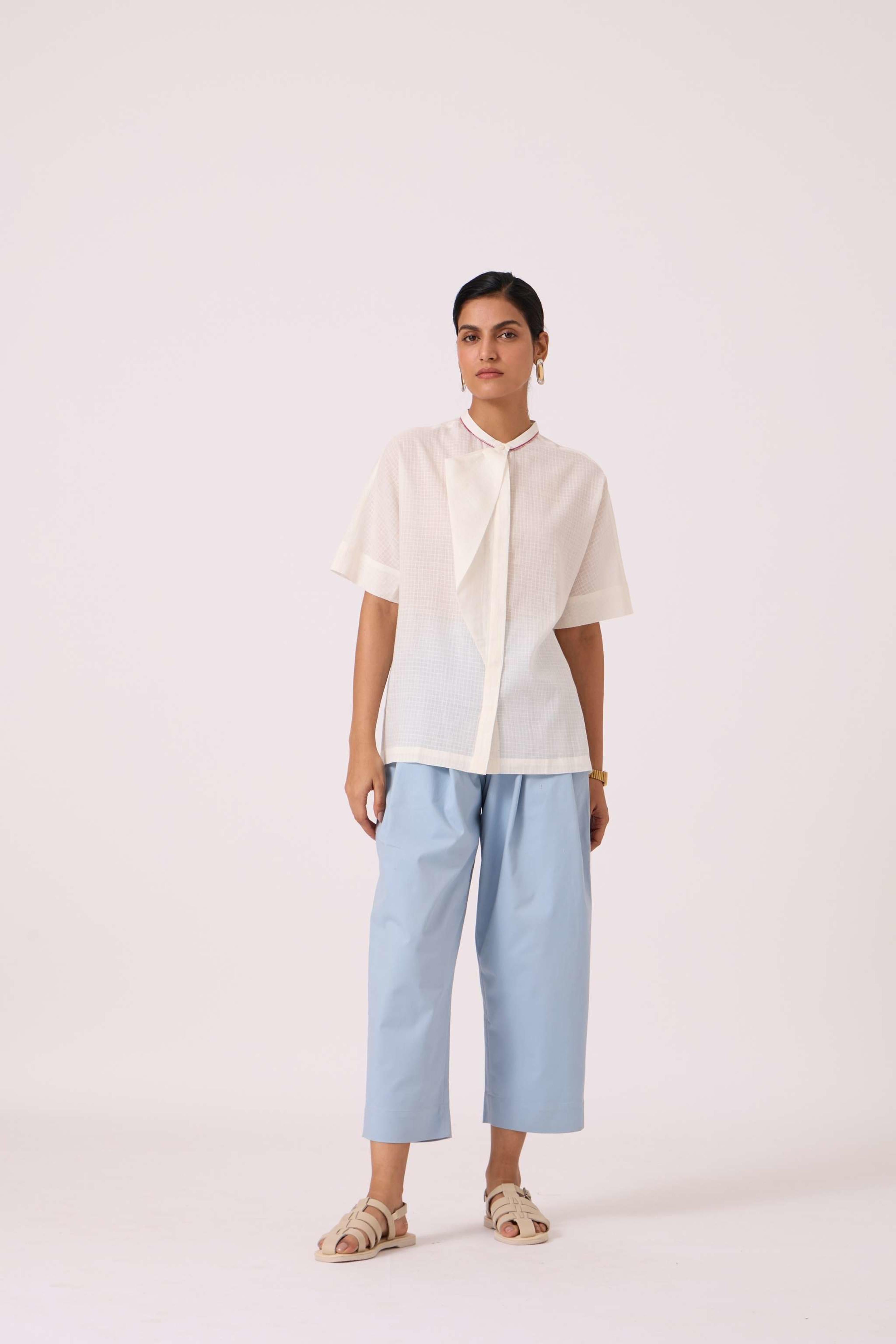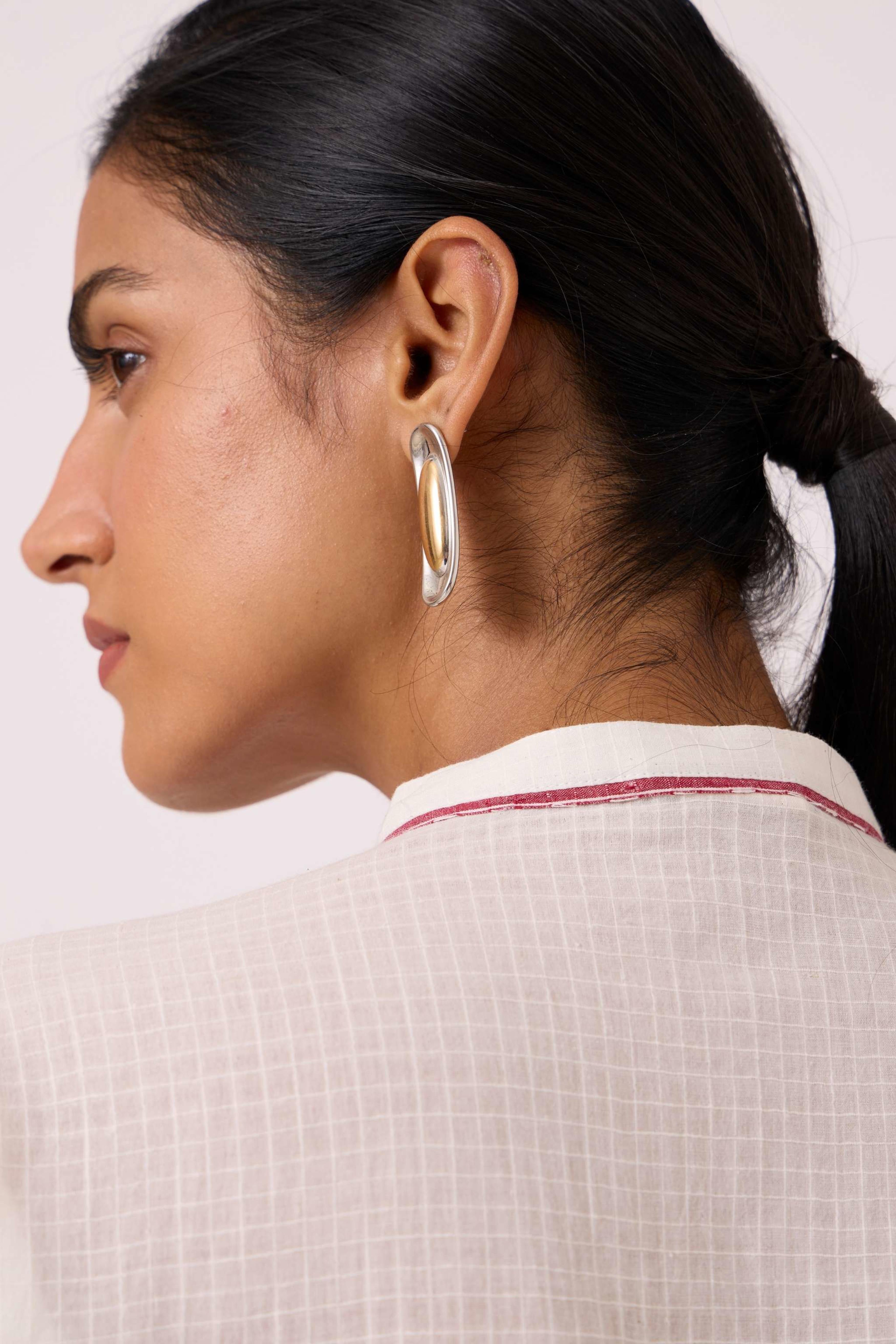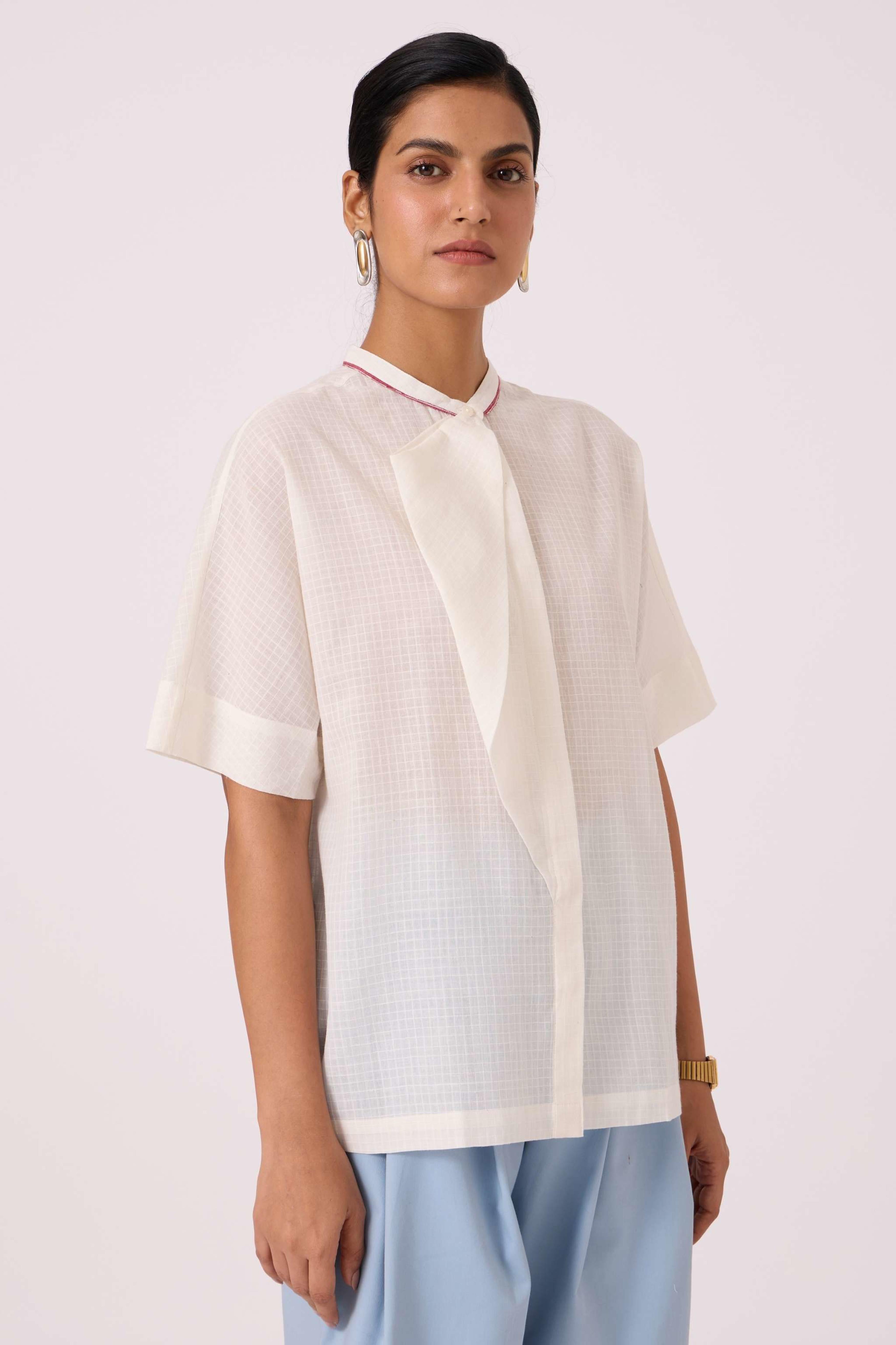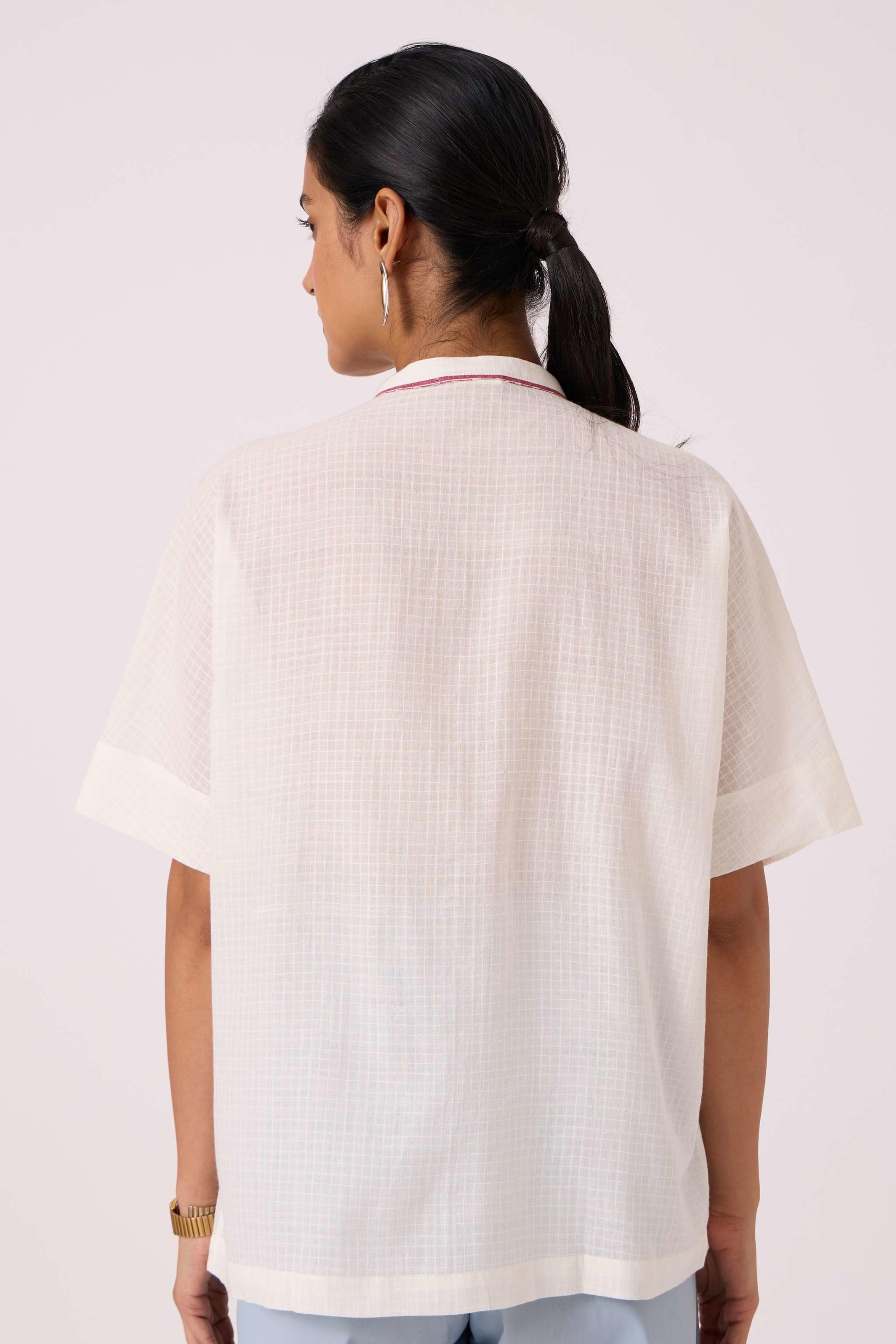This is a tailored, regular-fit *button-down shirt* with a distinctive *statement detail* along the placket. It features *elbow-length drop shoulder sleeves*, giving it a modern and relaxed silhouette. As with their other pieces, the fabric is a unique design developed in-house and *handwoven by artisans in Bengal*. The model, Chhavi, is 5'6" and is wearing a size XS.