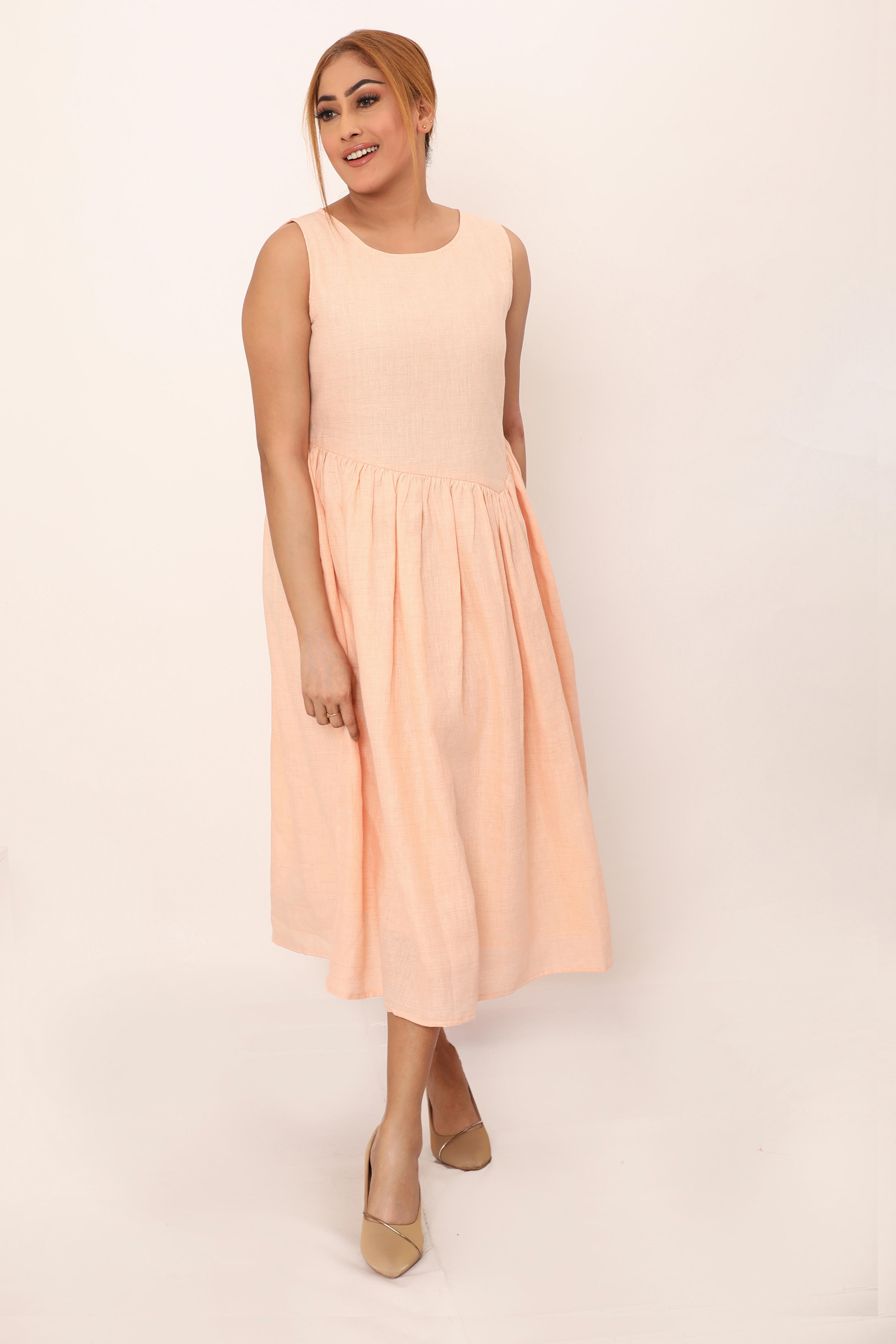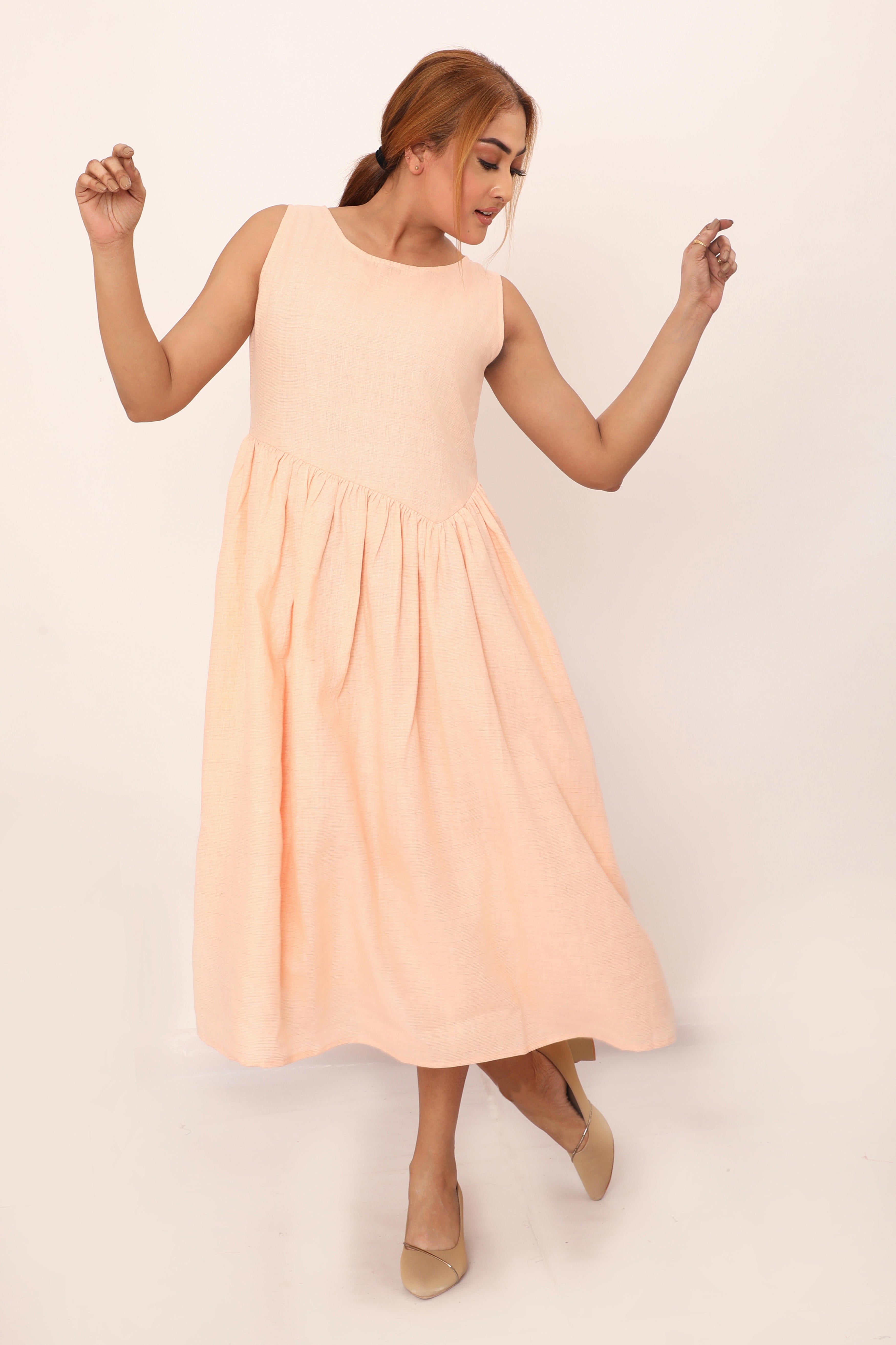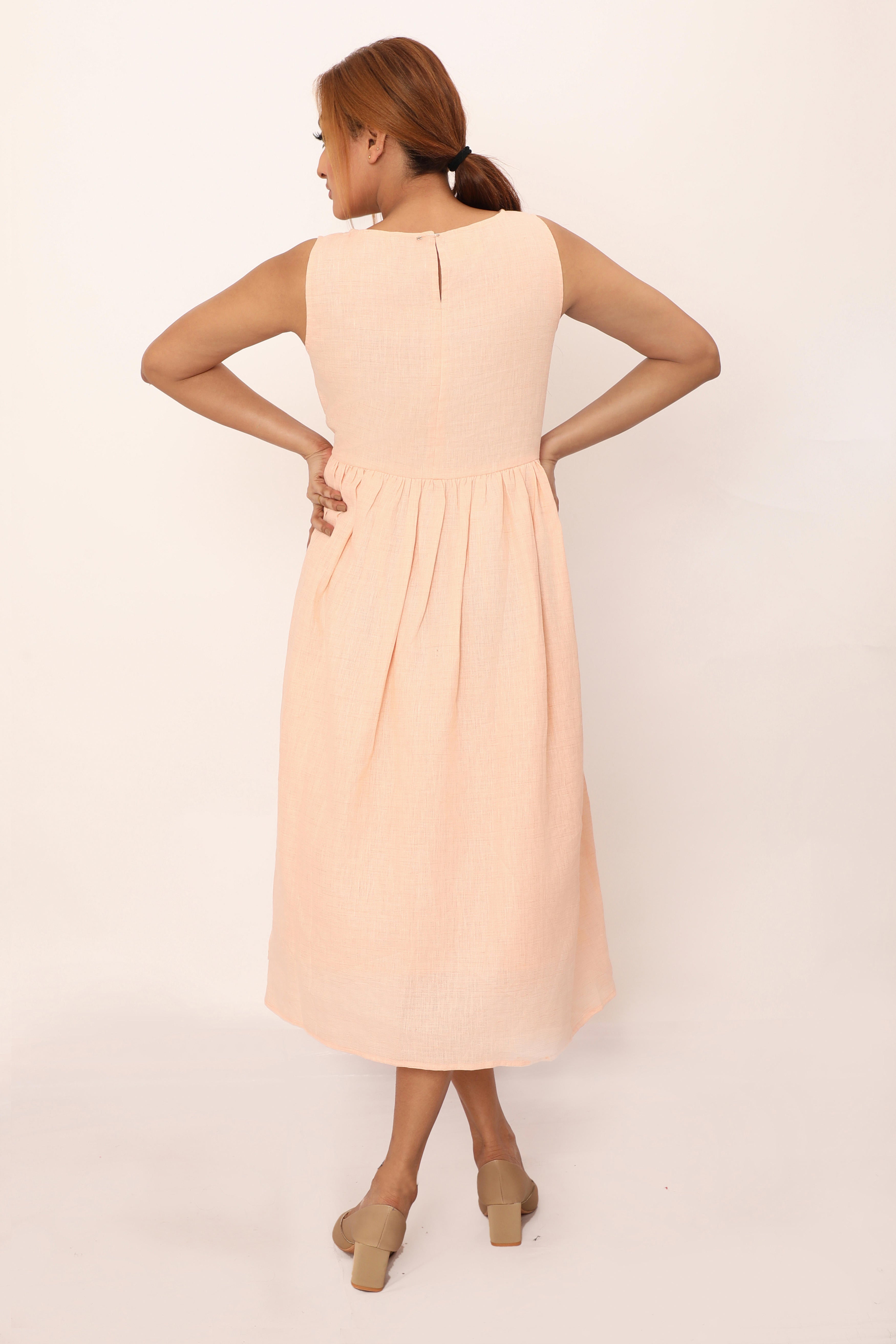 The Nyla dress is a timeless blend of simplicity and grace. Featuring a sleeveless design and a fitted bodice that flows into a softly gathered skirt, this midi dress offers a flattering silhouette perfect for any occasion. Its lightweight, breathable fabric ensures comfort throughout the day, while the clean lines and minimalistic cut make it a versatile piece you?l reach for time and time again. Pair it with sandals or heels to create a look that? effortlessly chic.