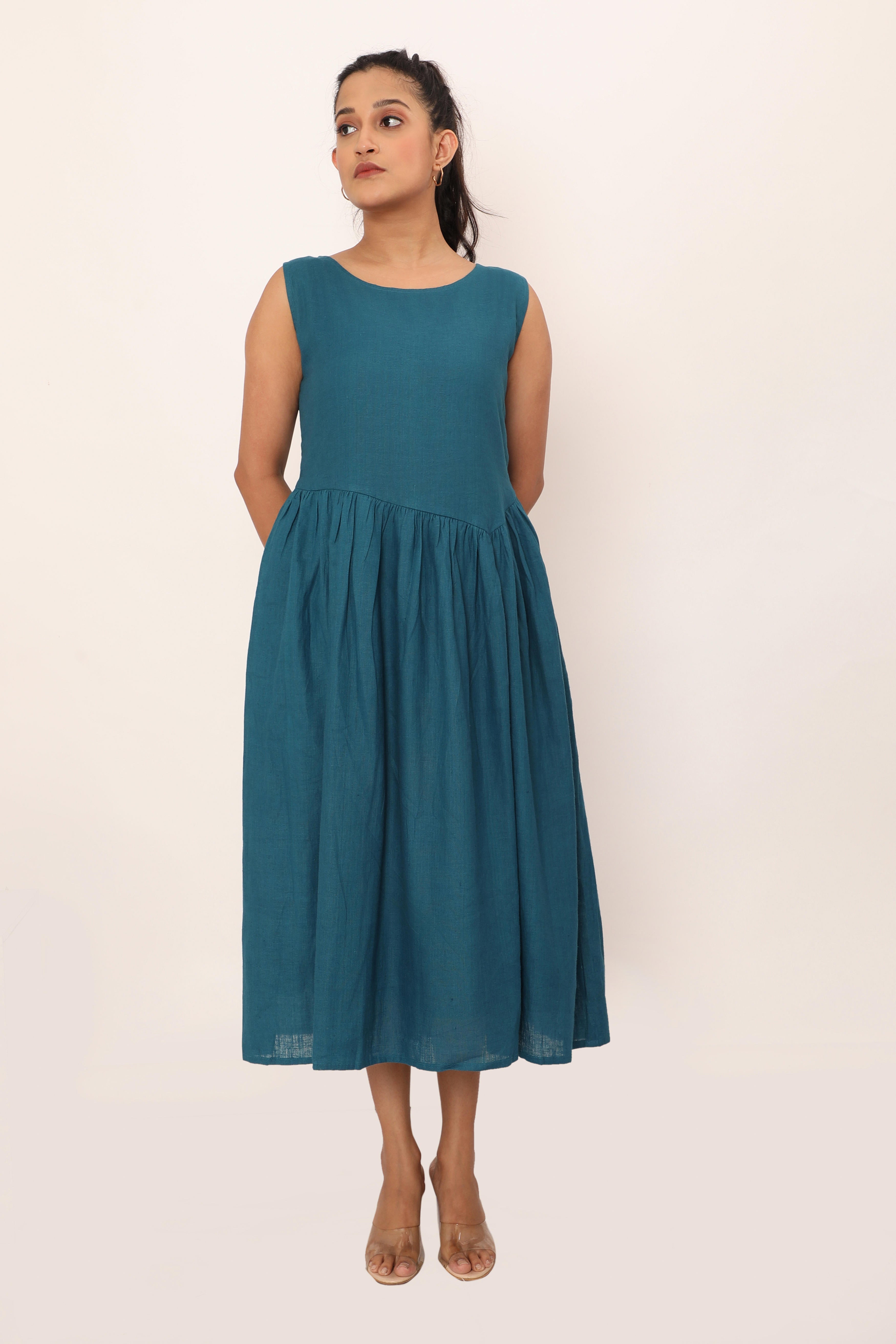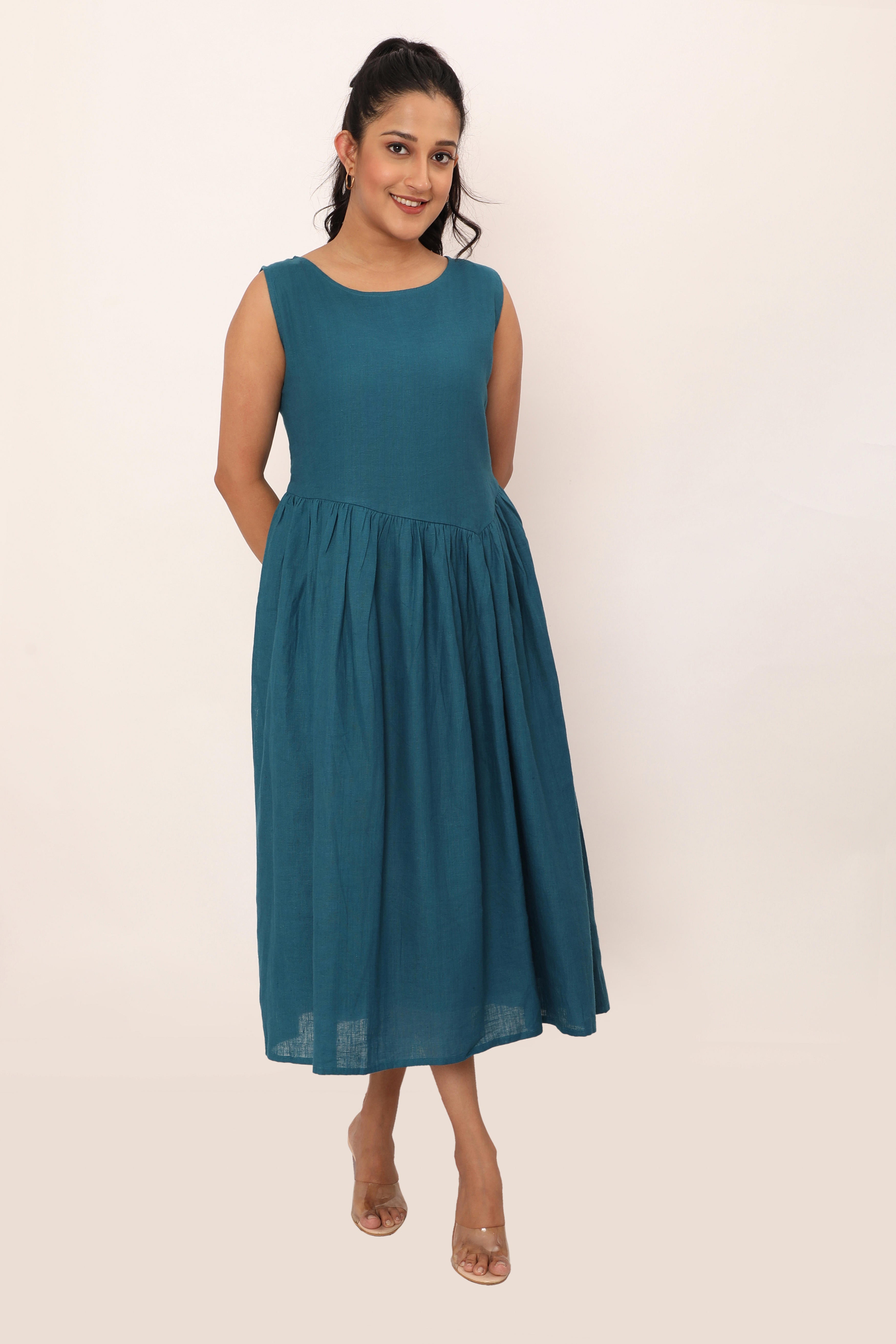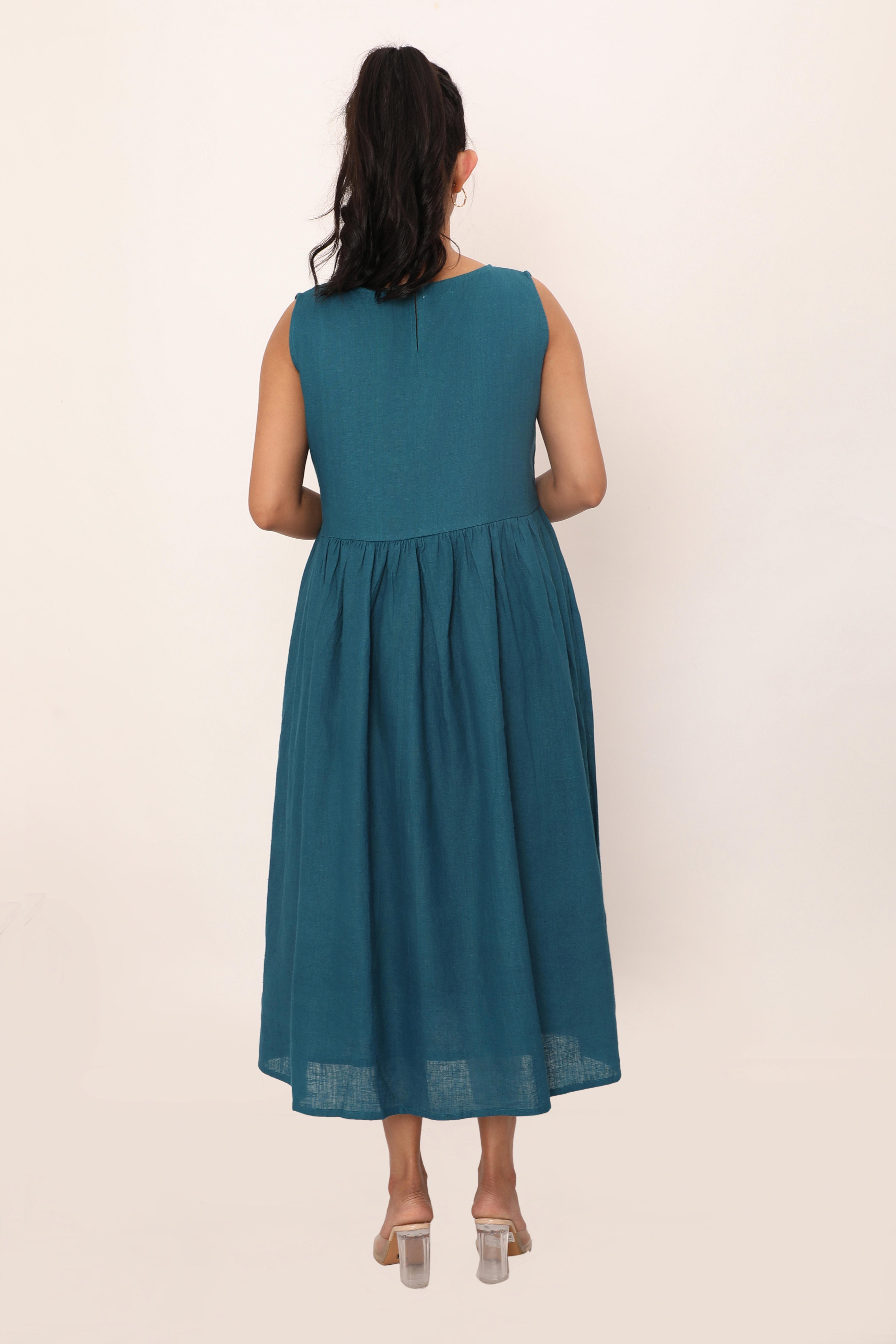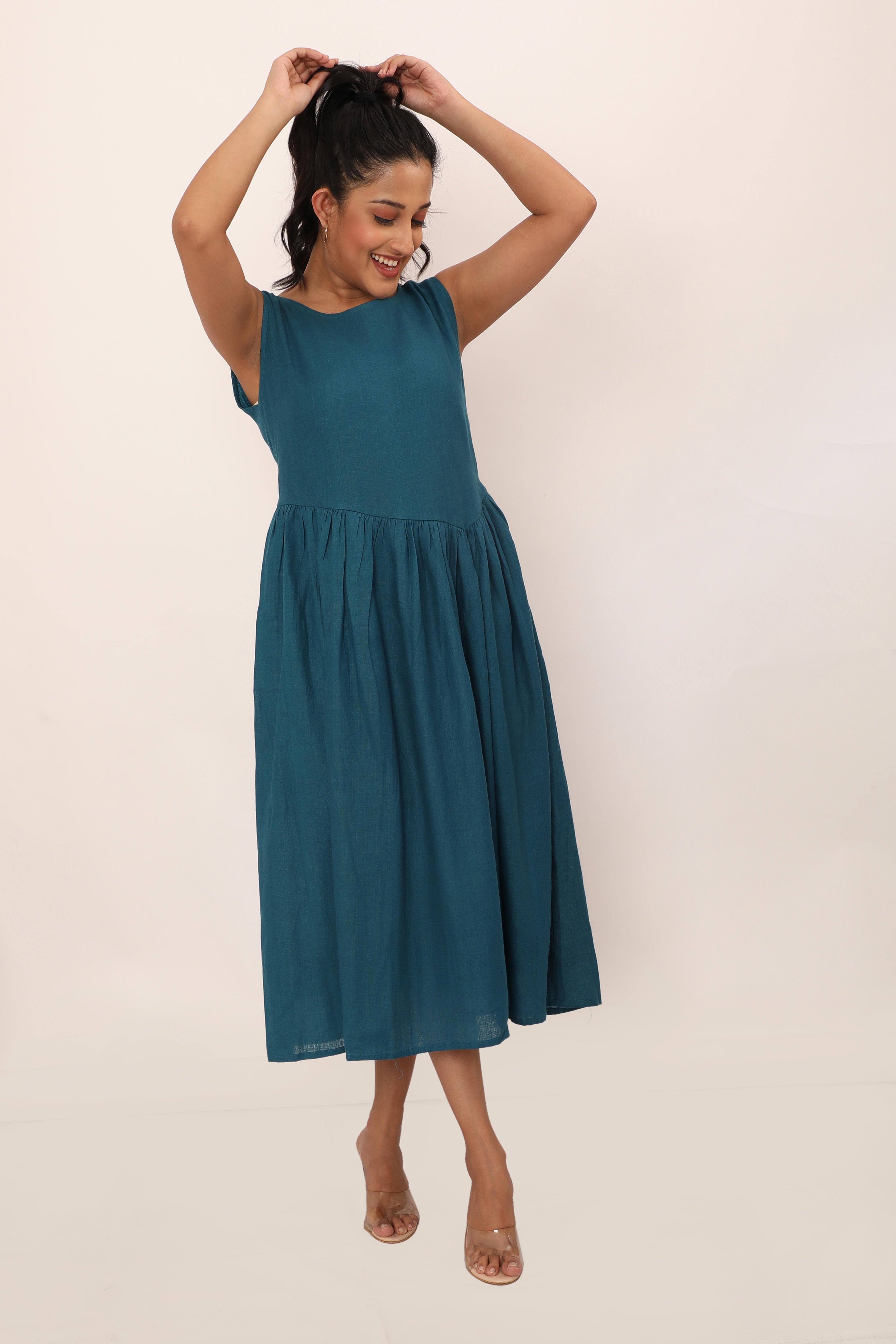 The Nyla dress is a timeless blend of simplicity and grace. Featuring a sleeveless design and a fitted bodice that flows into a softly gathered skirt, this midi dress offers a flattering silhouette perfect for any occasion. Its lightweight, breathable fabric ensures comfort throughout the day, while the clean lines and minimalistic cut make it a versatile piece you?l reach for time and time again. Pair it with sandals or heels to create a look that? effortlessly chic.