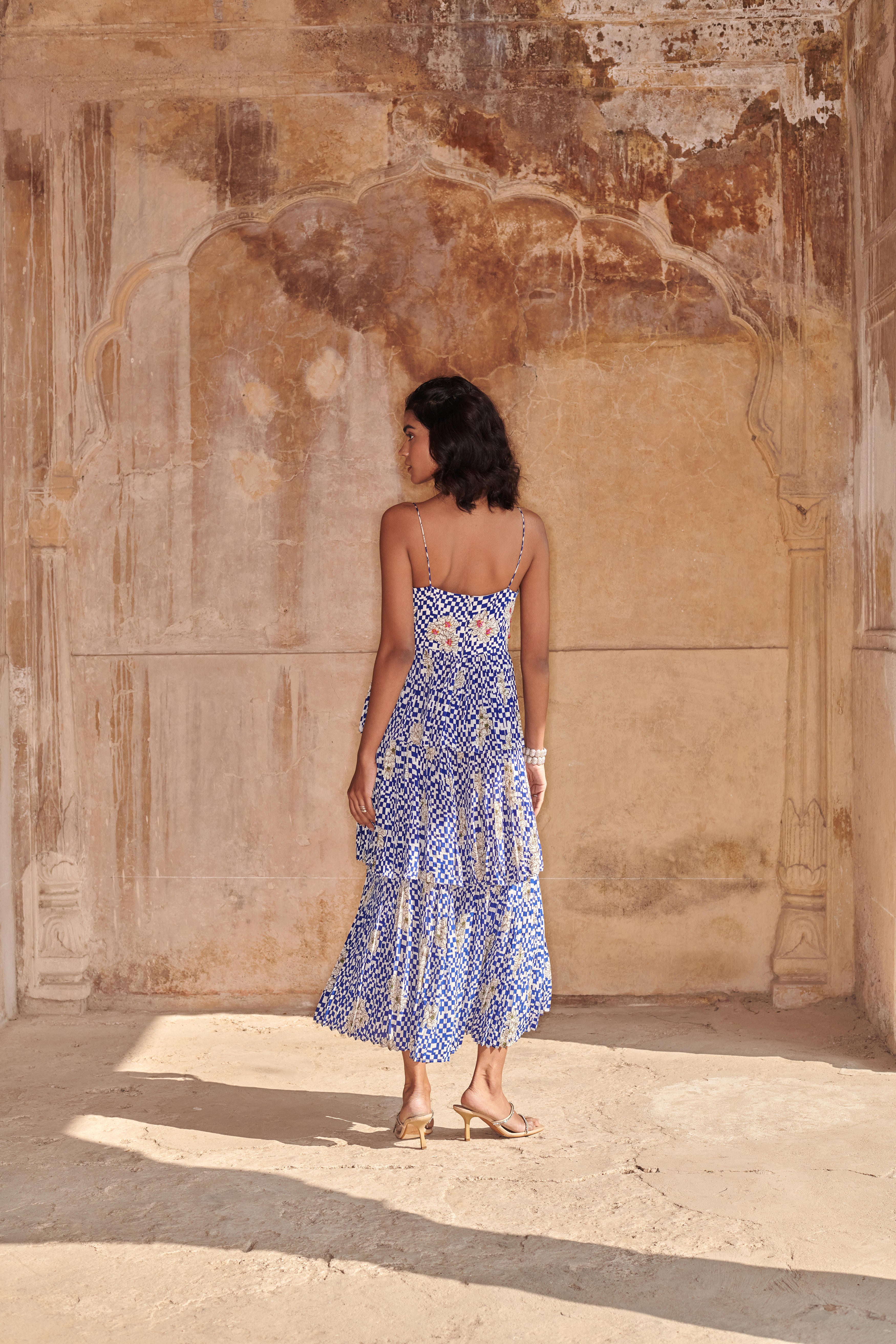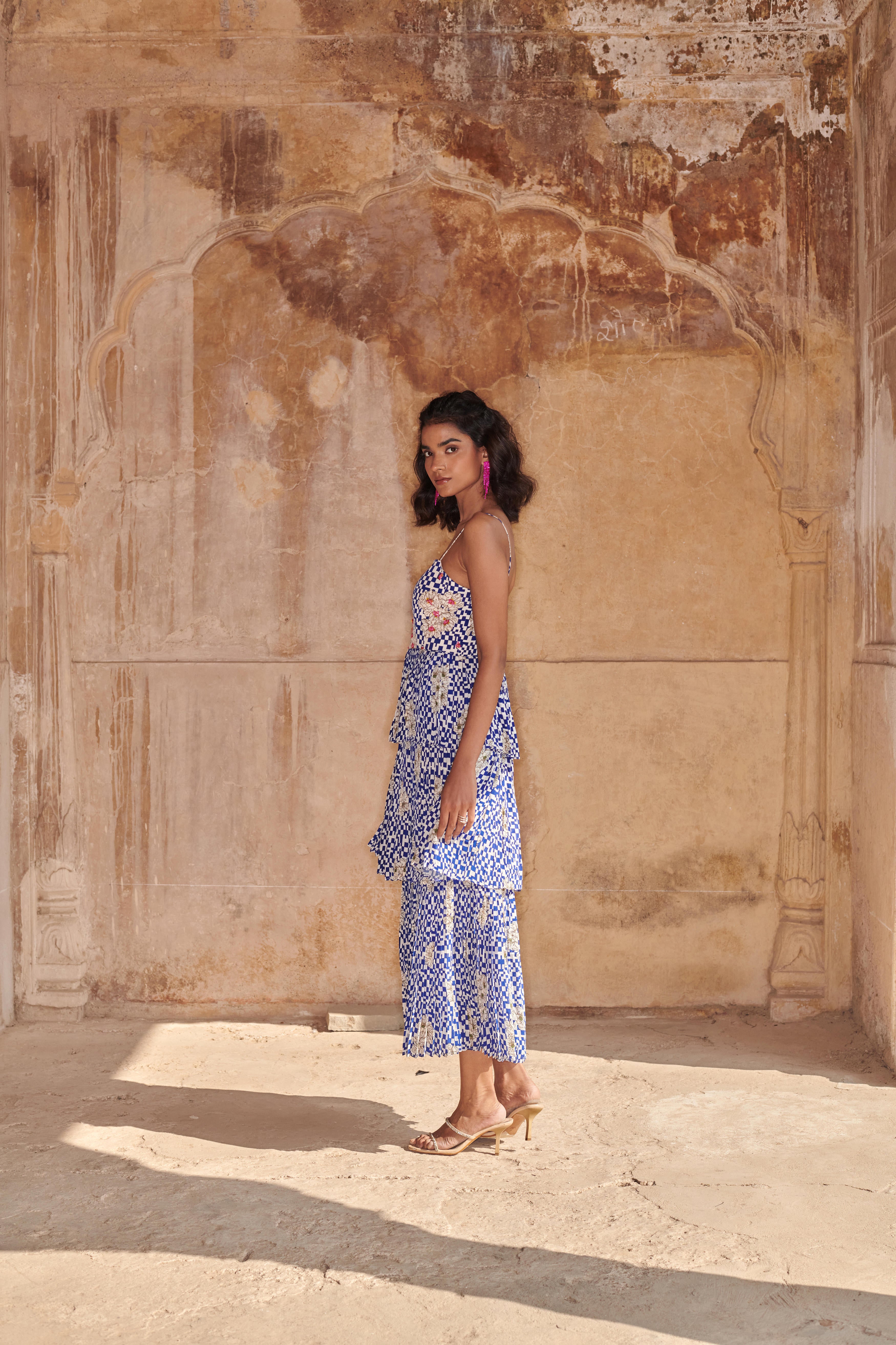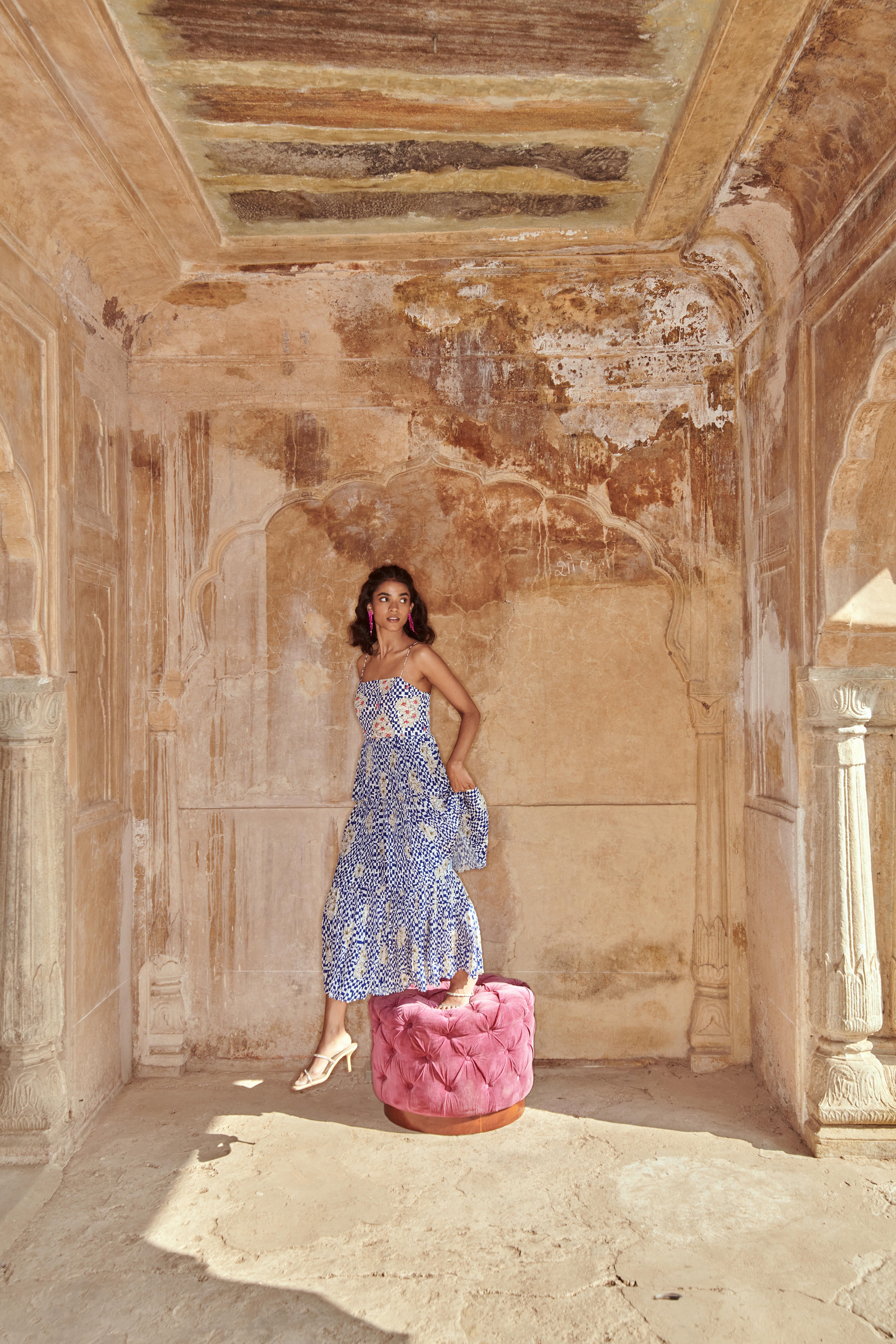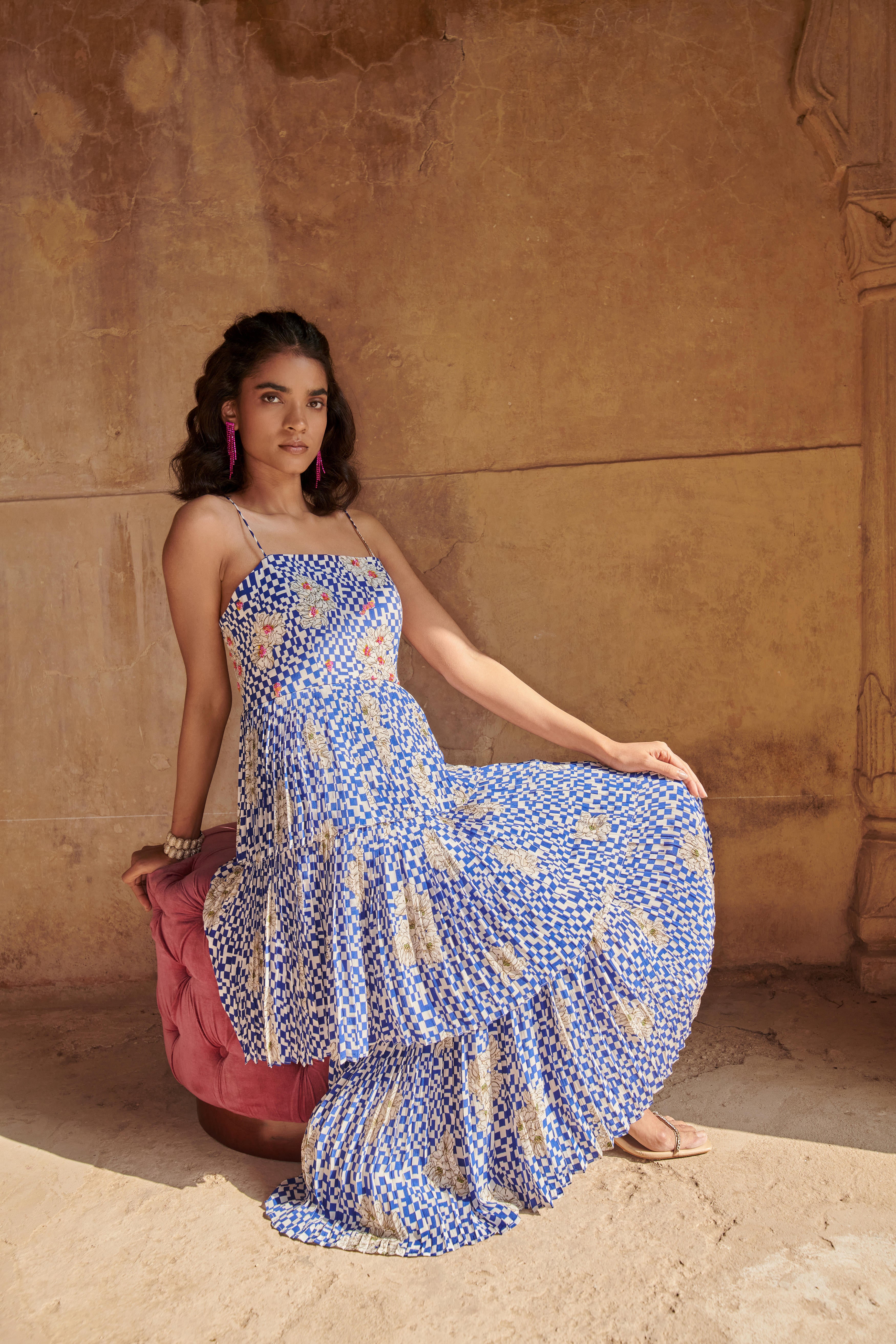 The dress showcases a long silhouette with cinched waist and corset bodice highlighted with vibrant hand embroidery. The corset dress features pleated tiered pannels, spaghetti straps and a back zip closure. Dress length: 52"