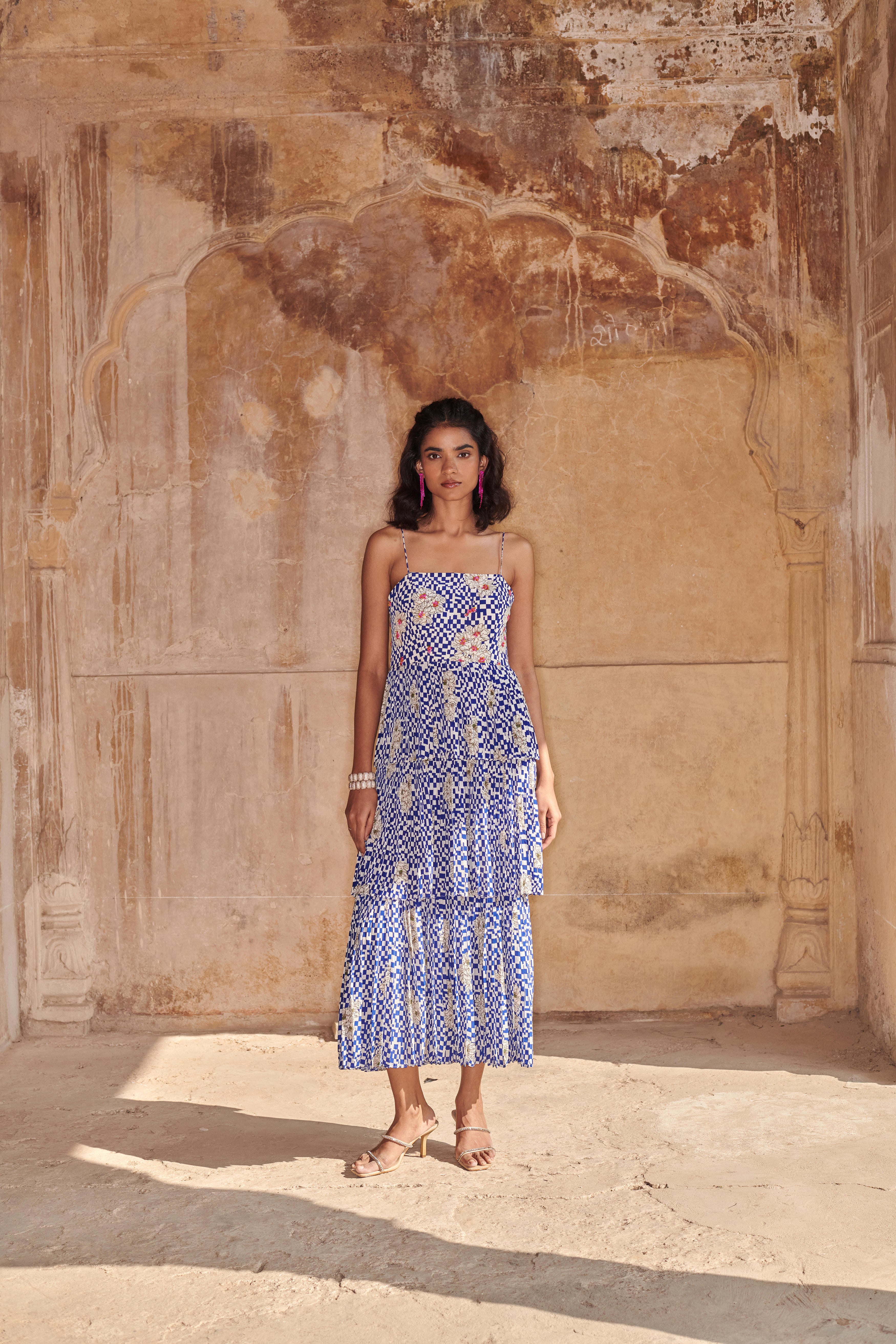 The dress showcases a long silhouette with cinched waist and corset bodice highlighted with vibrant hand embroidery. The corset dress features pleated tiered pannels, spaghetti straps and a back zip closure. Dress length: 52"