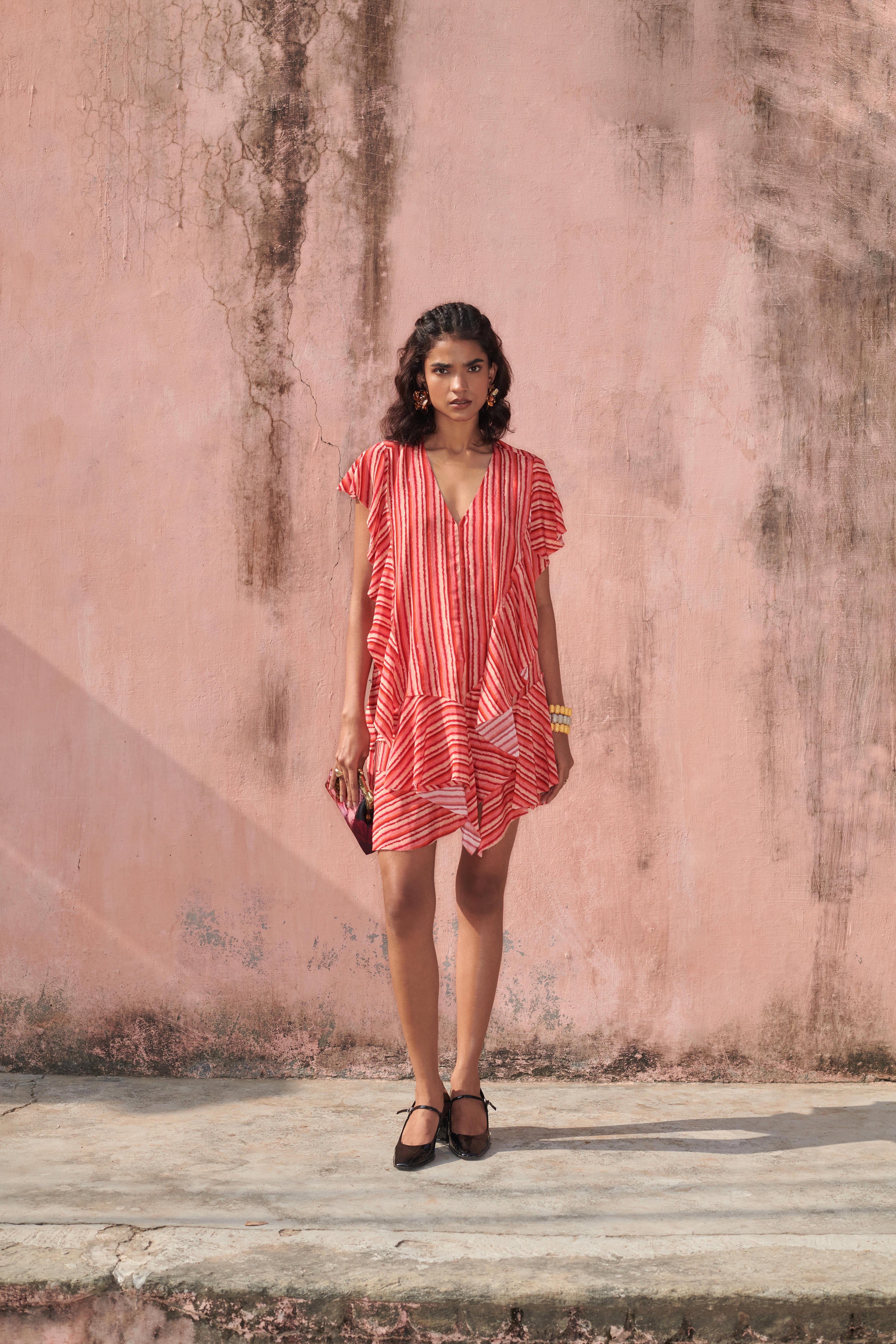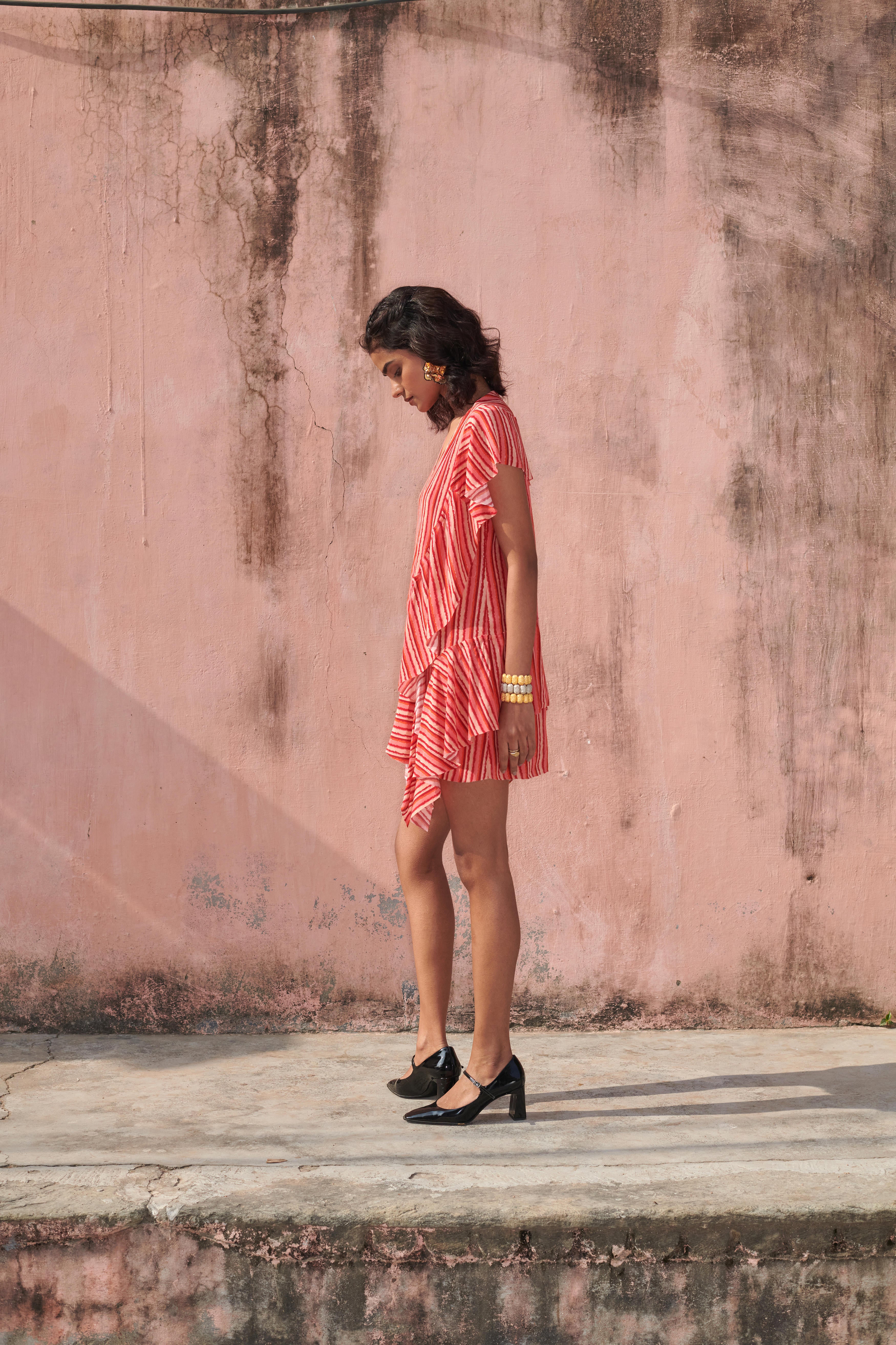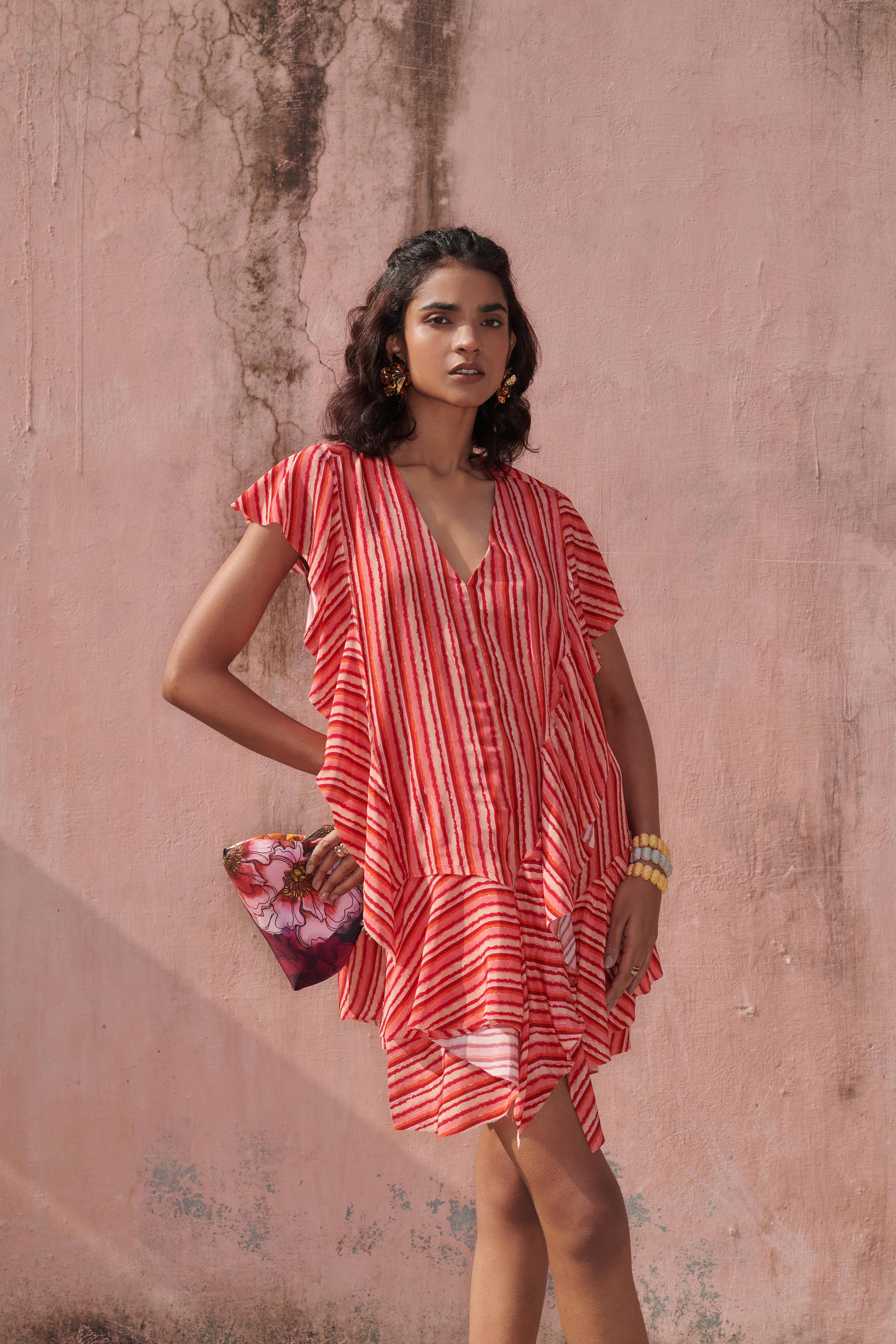 Straight Fit Short Dress in striped fabric is detailed with the same fabric ruffle trims. Embrace the charm of reds. Dress front length [XS-M]: 35" Back length [XS-M]: 32.5" Dress front length [L-XL]: 36" Back length [L-XL]: 33.5"