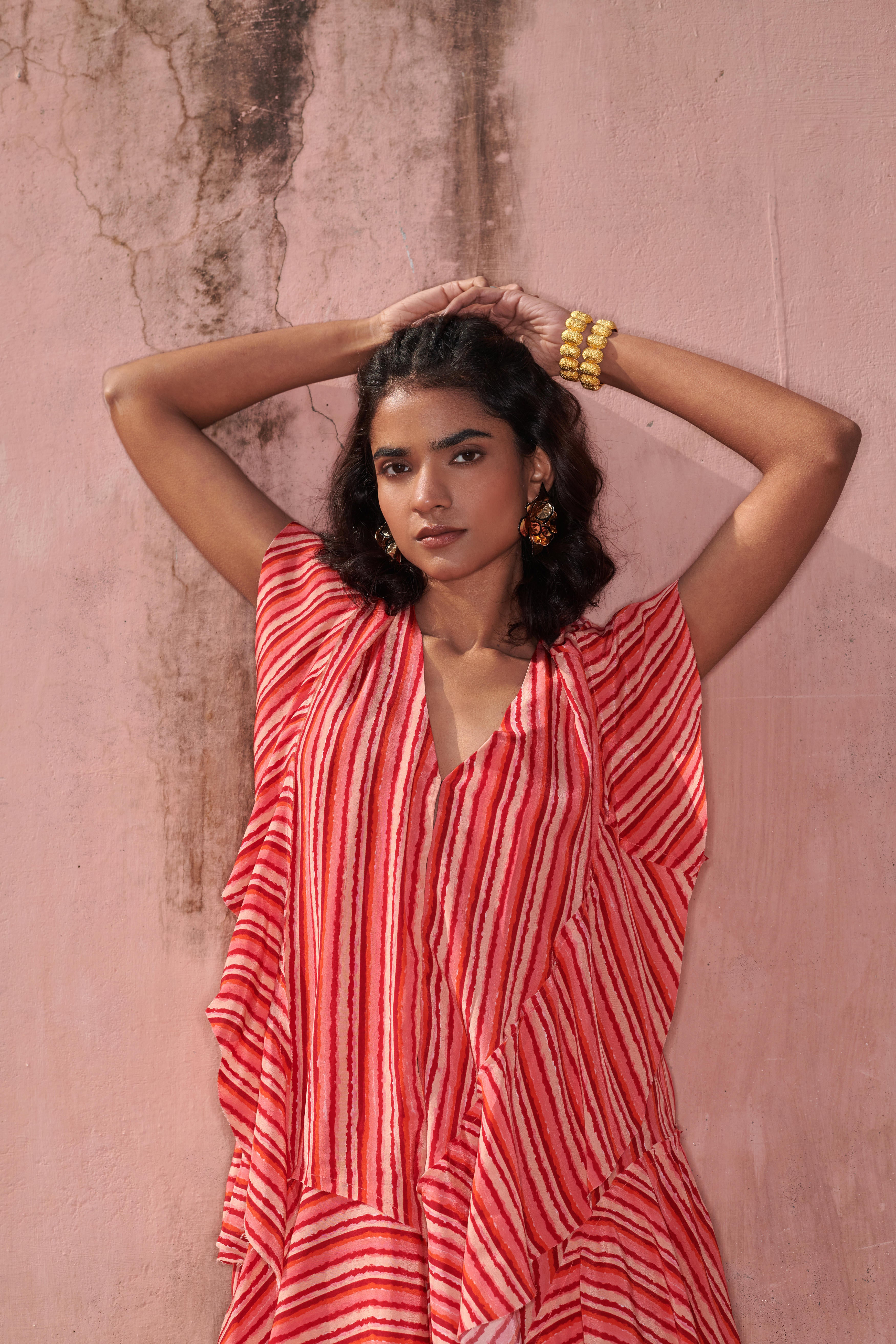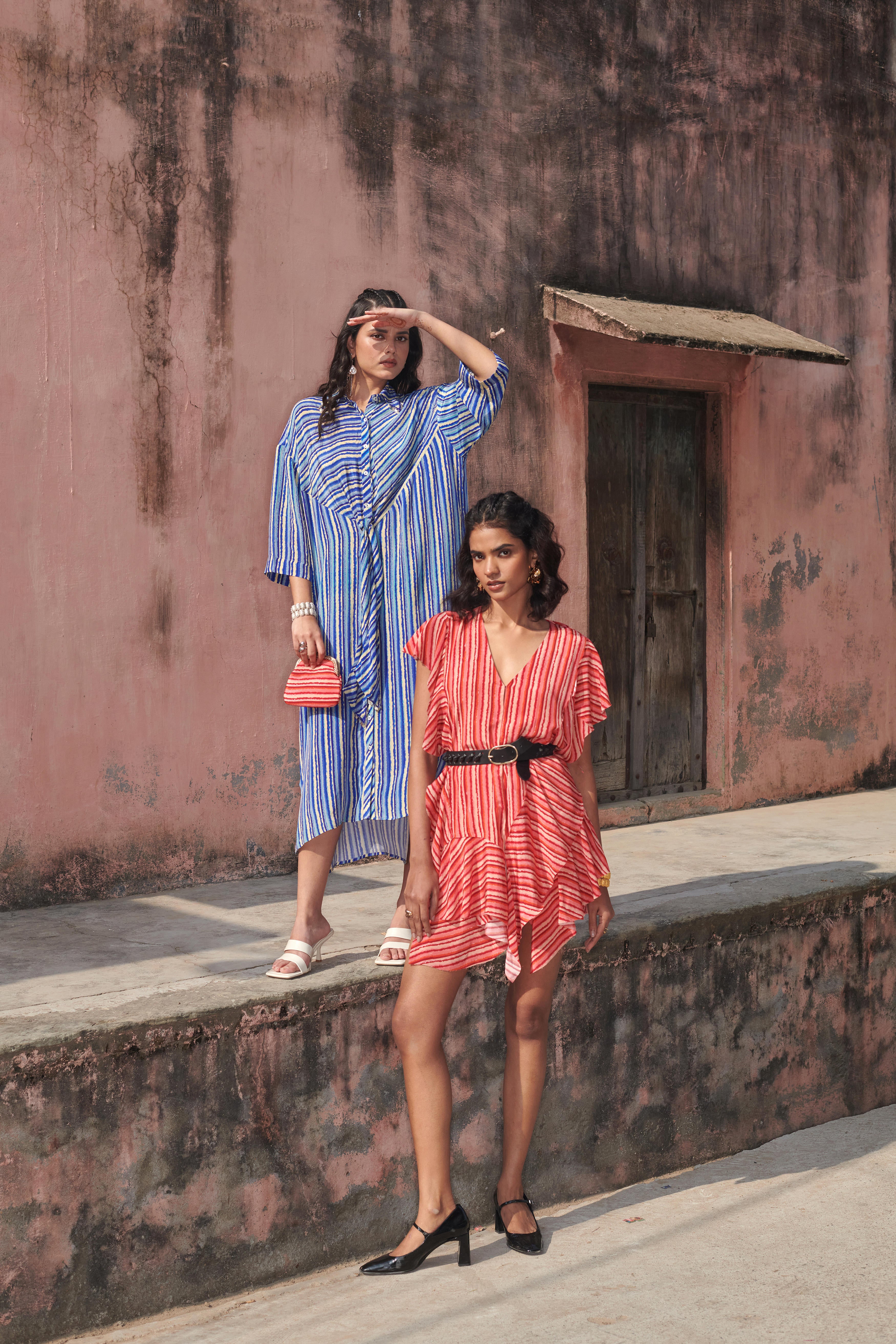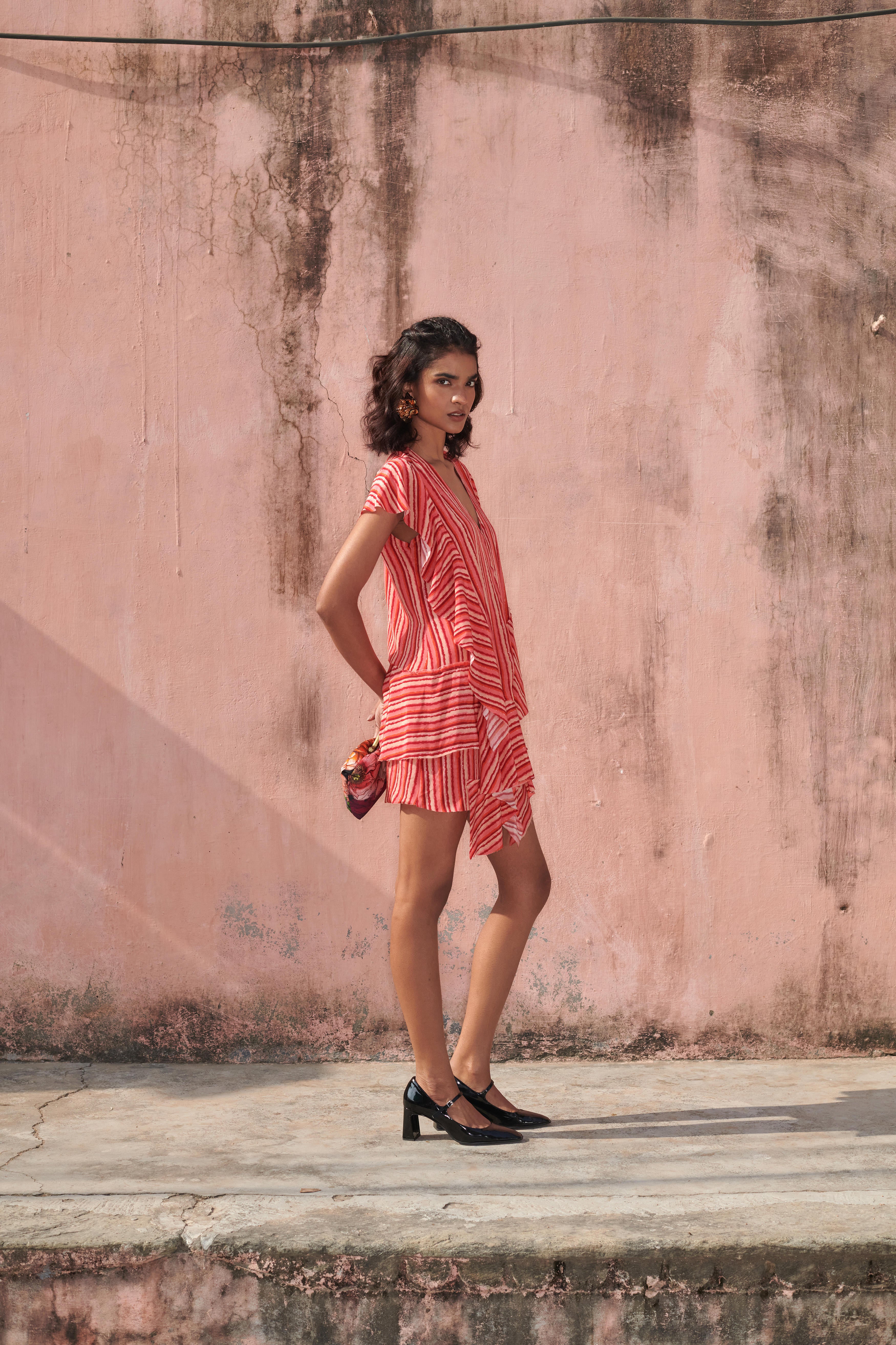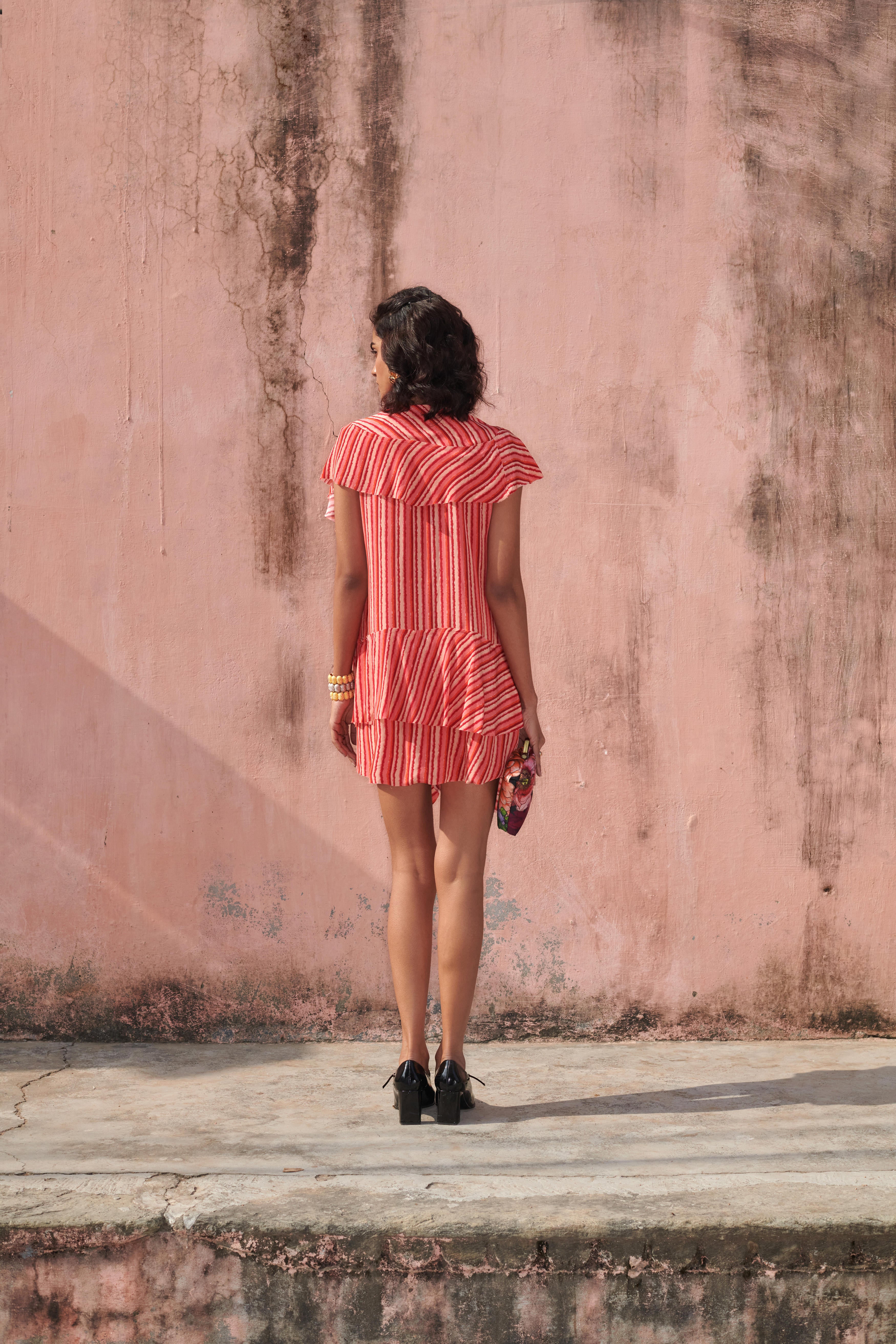 Straight Fit Short Dress in striped fabric is detailed with the same fabric ruffle trims. Embrace the charm of reds. Dress front length [XS-M]: 35" Back length [XS-M]: 32.5" Dress front length [L-XL]: 36" Back length [L-XL]: 33.5"