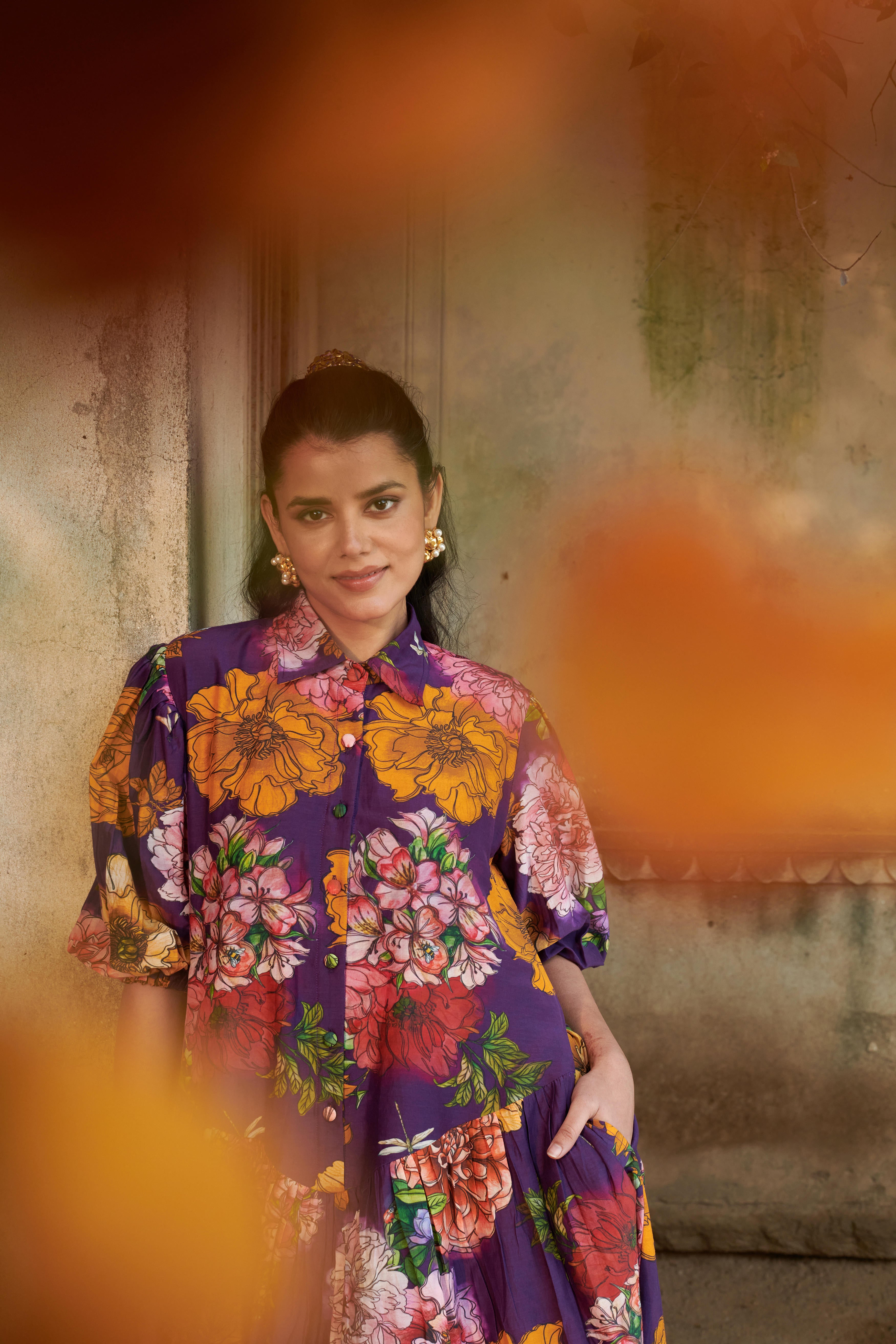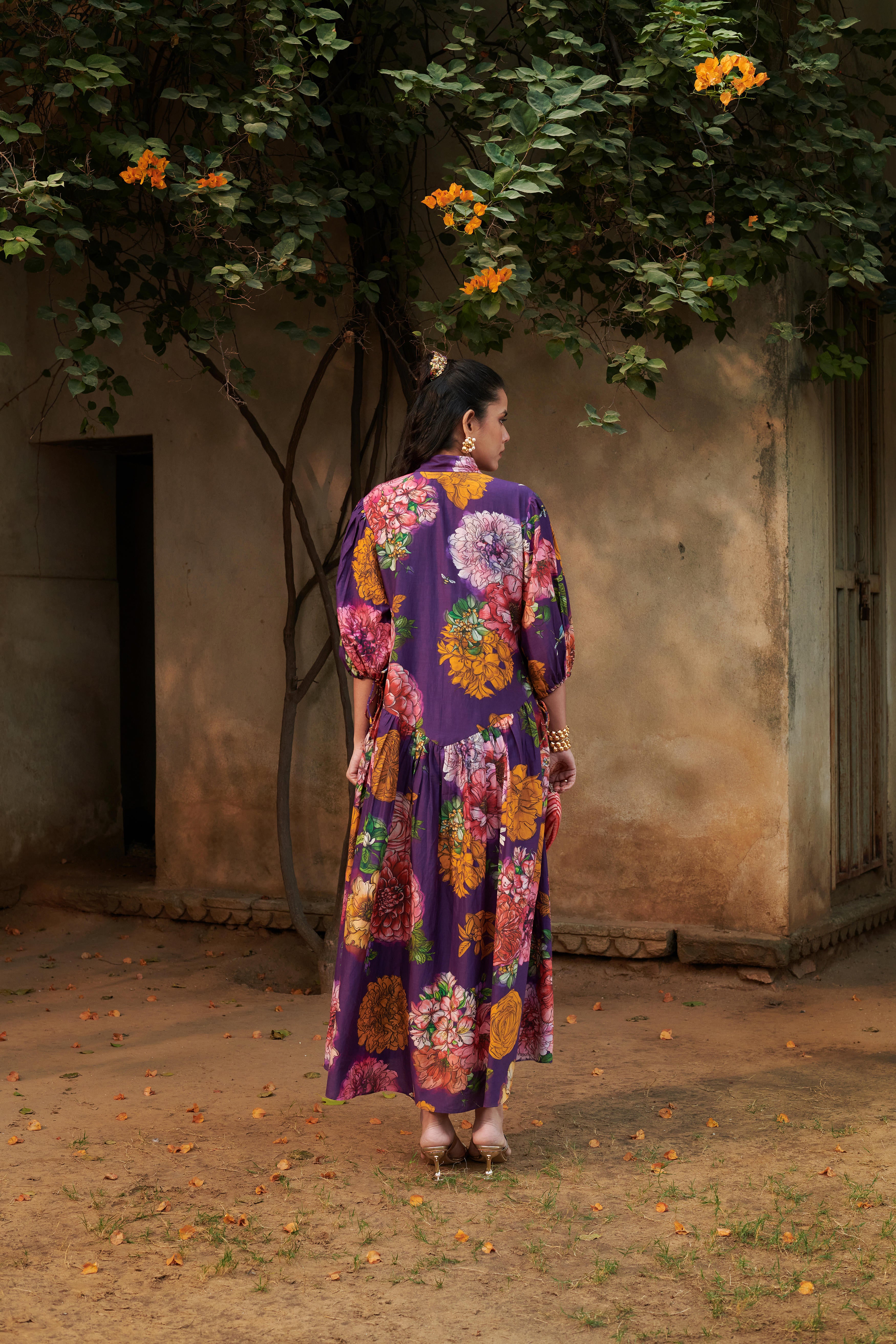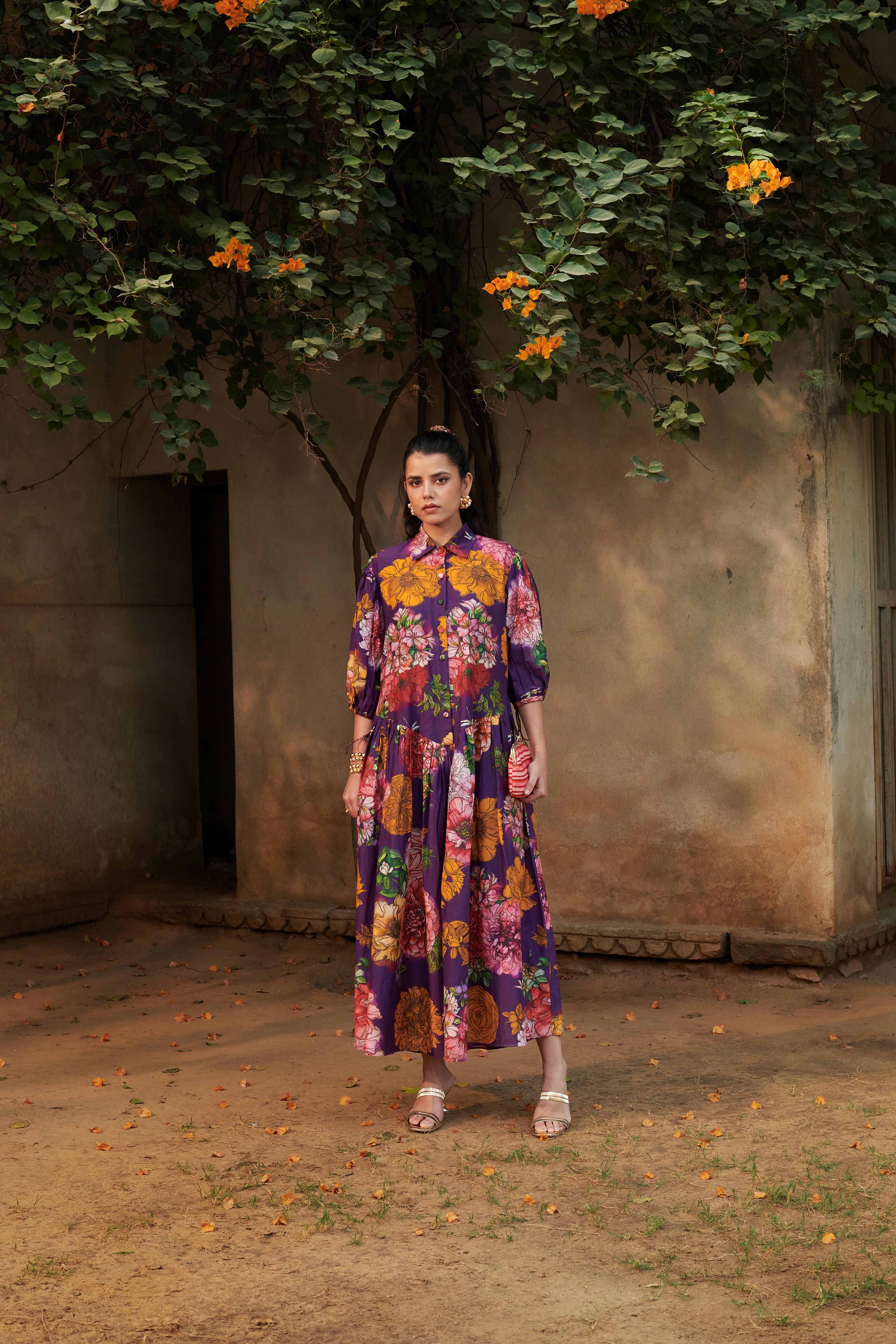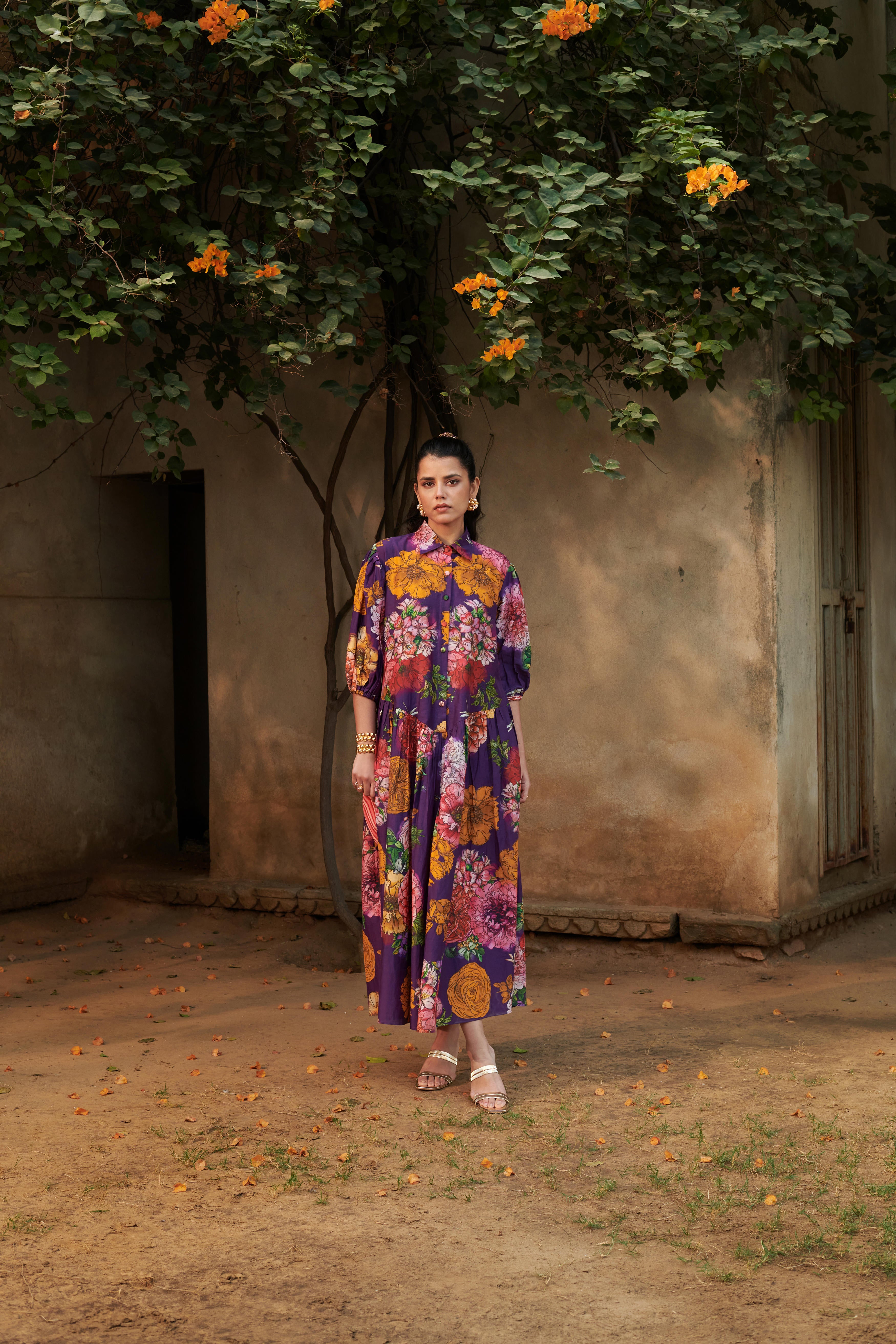 A relaxed fit drop-waist dress with shirt collar featuring a front button placket, with puff tie-up sleeves, gathers at the lower waist, and inseam side pockets. Dress length: 53"