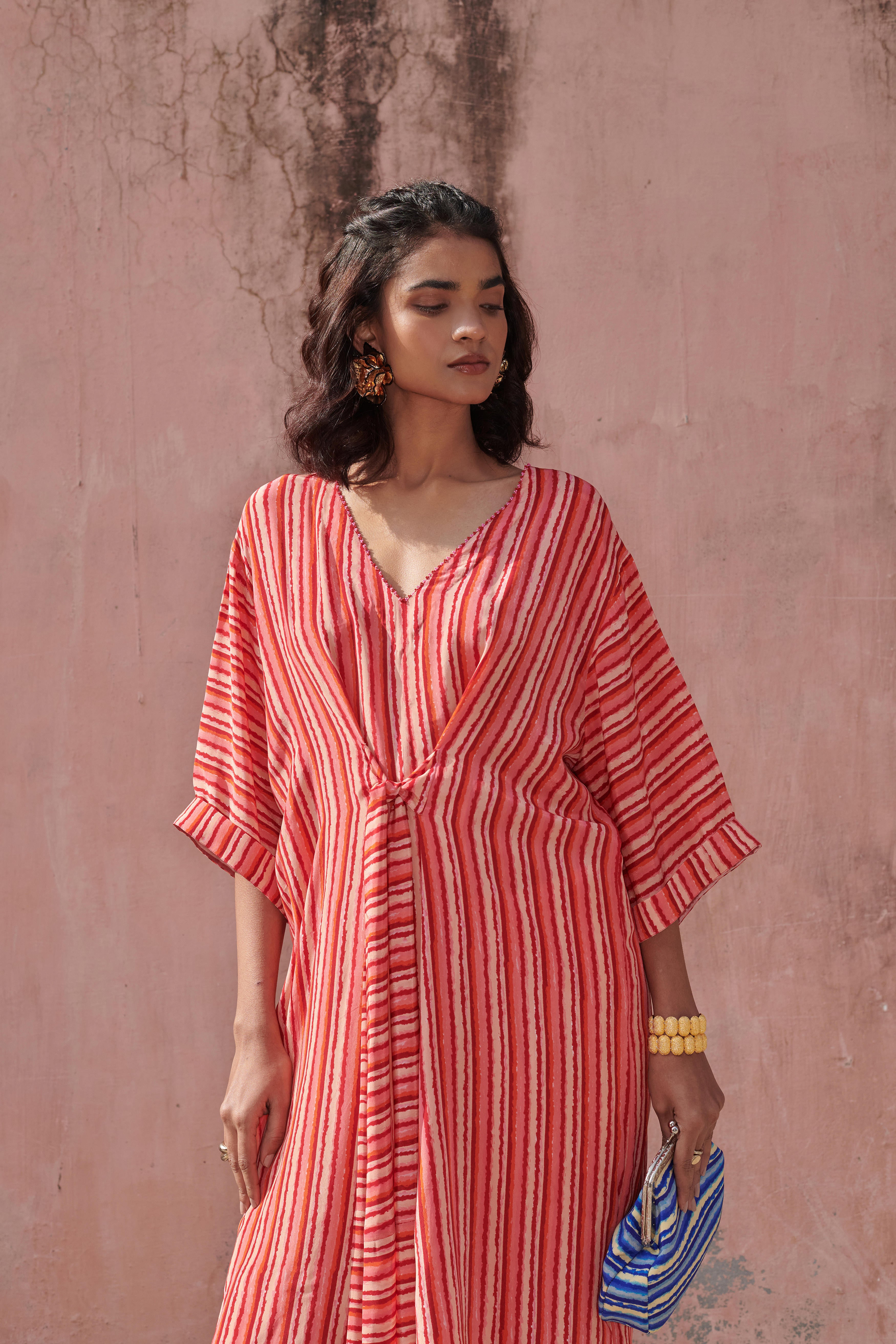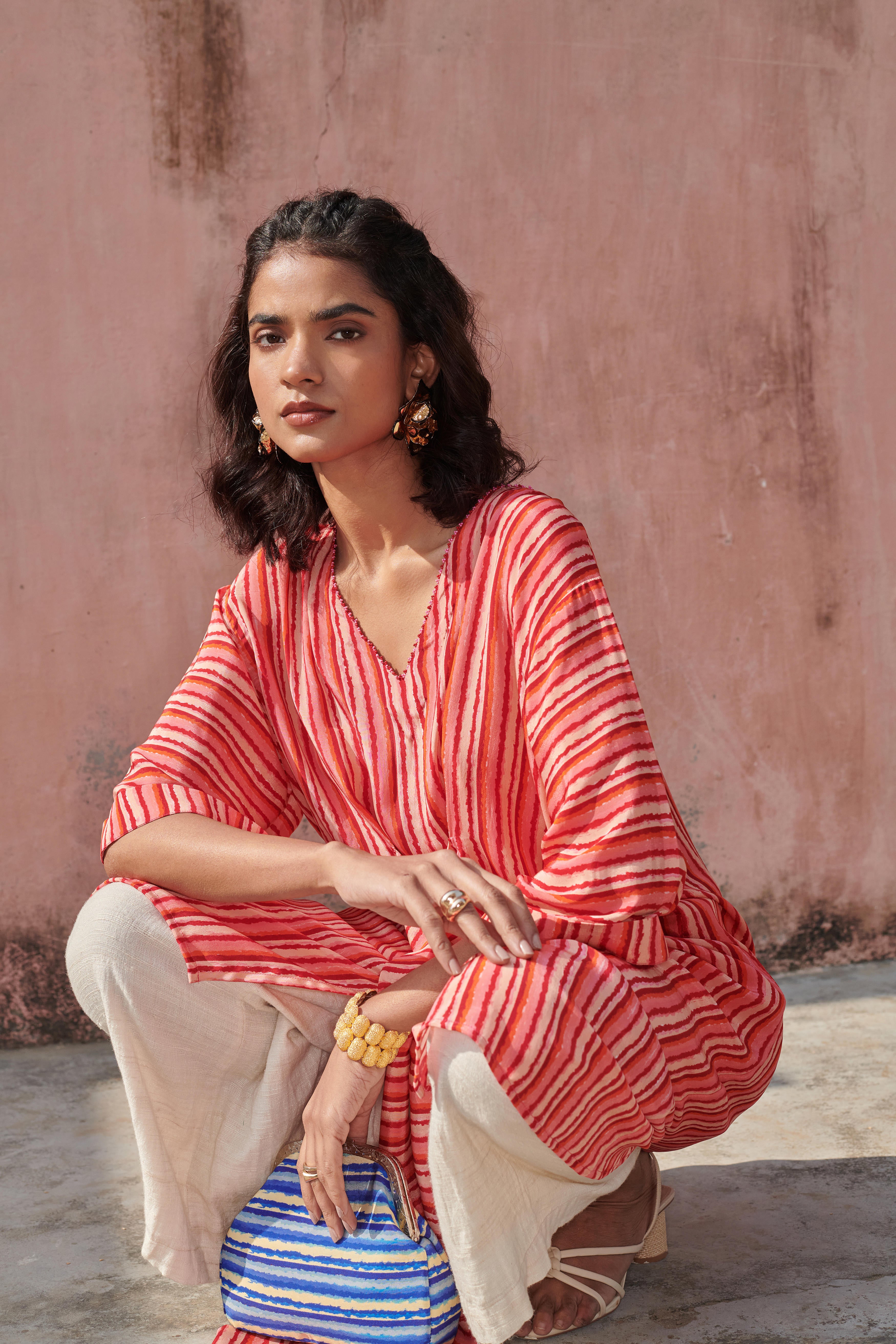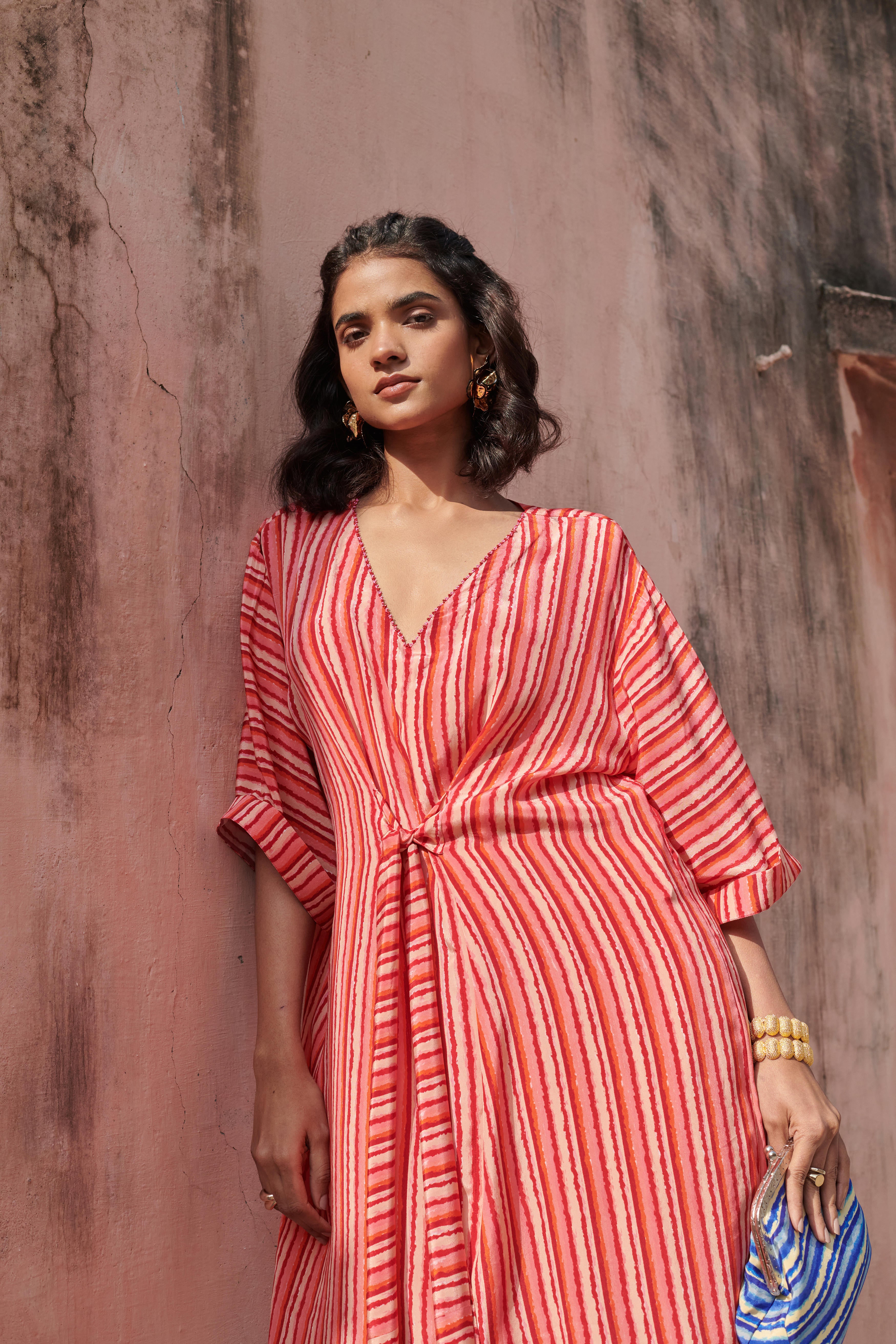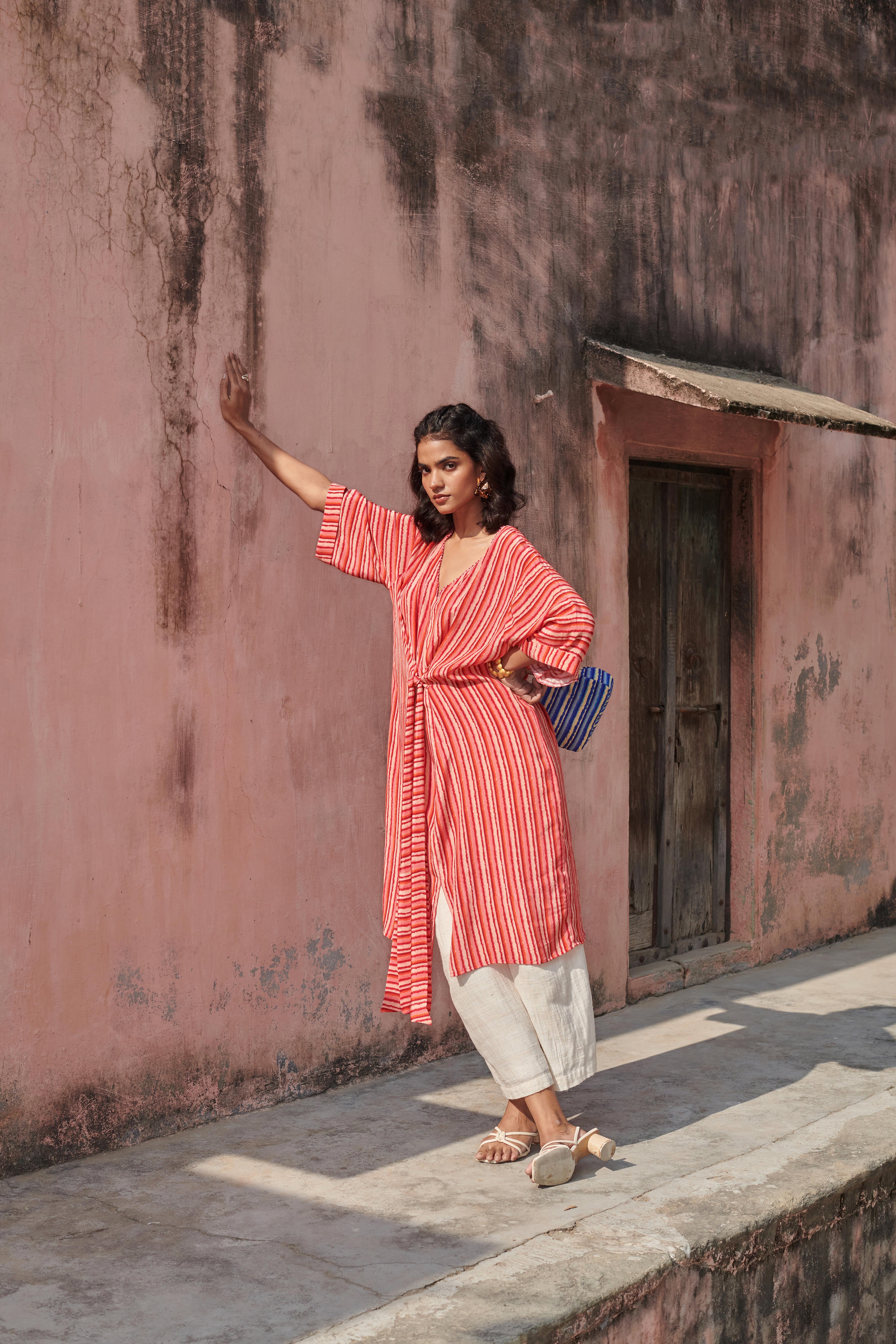 The tunic crafted from our Blush rush print for a comfortable look. The tunic is designed with knot detail in the front, drop down shoulder and side inseam pockets. The tunic is adorned with hand detailing on front neck. Tunic Length: 42"