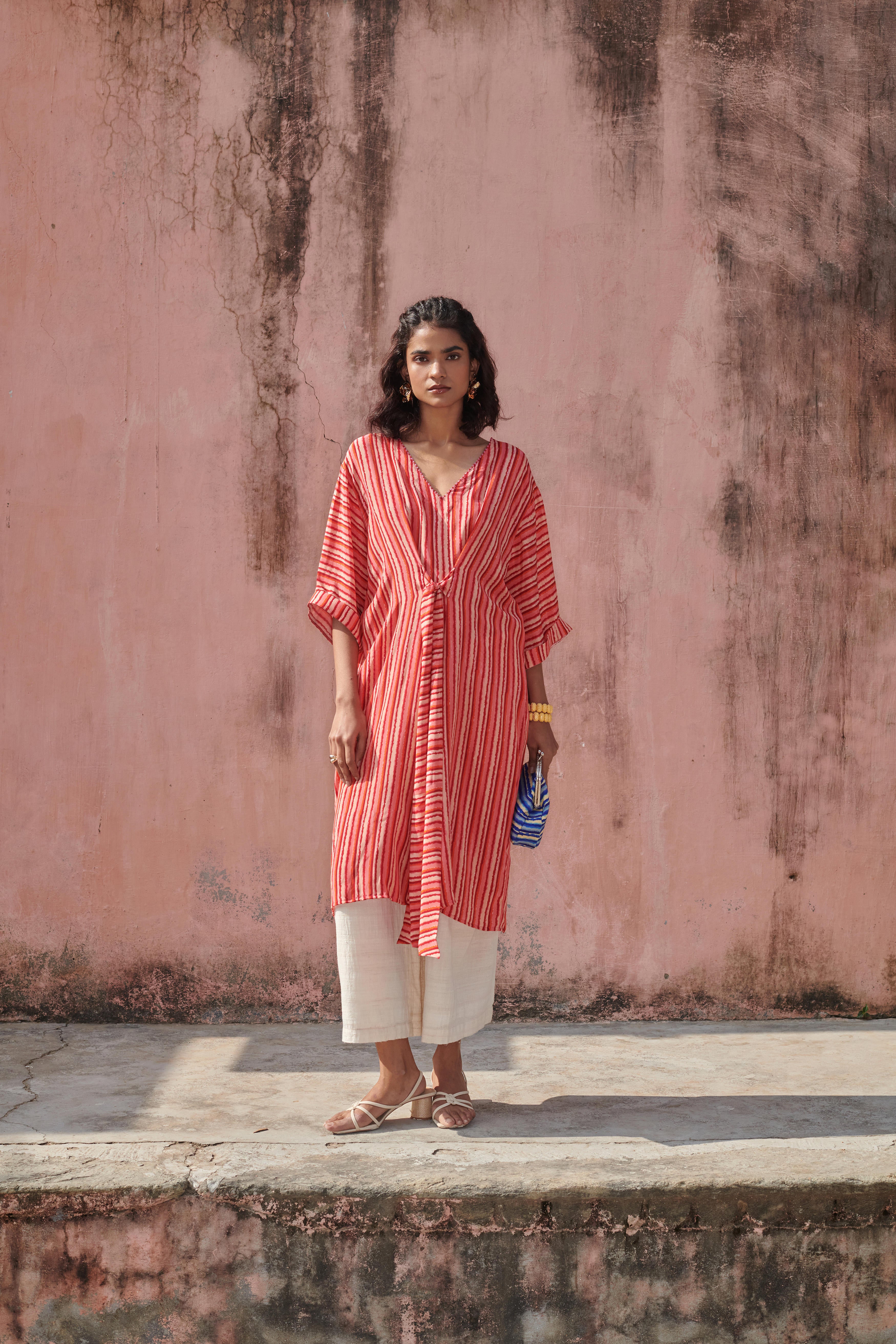 The tunic crafted from our Blush rush print for a comfortable look. The tunic is designed with knot detail in the front, drop down shoulder and side inseam pockets. The tunic is adorned with hand detailing on front neck. Tunic Length: 42"