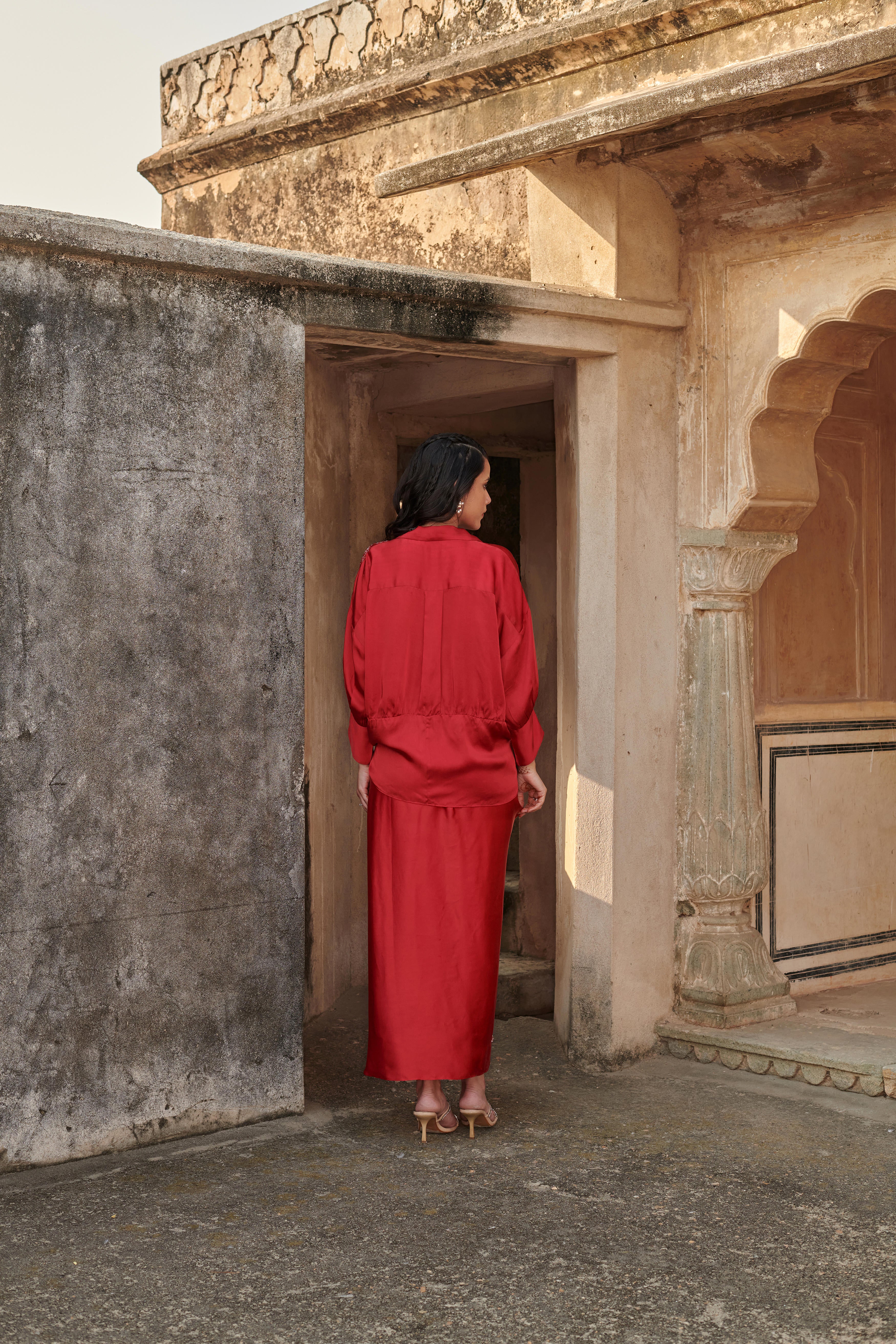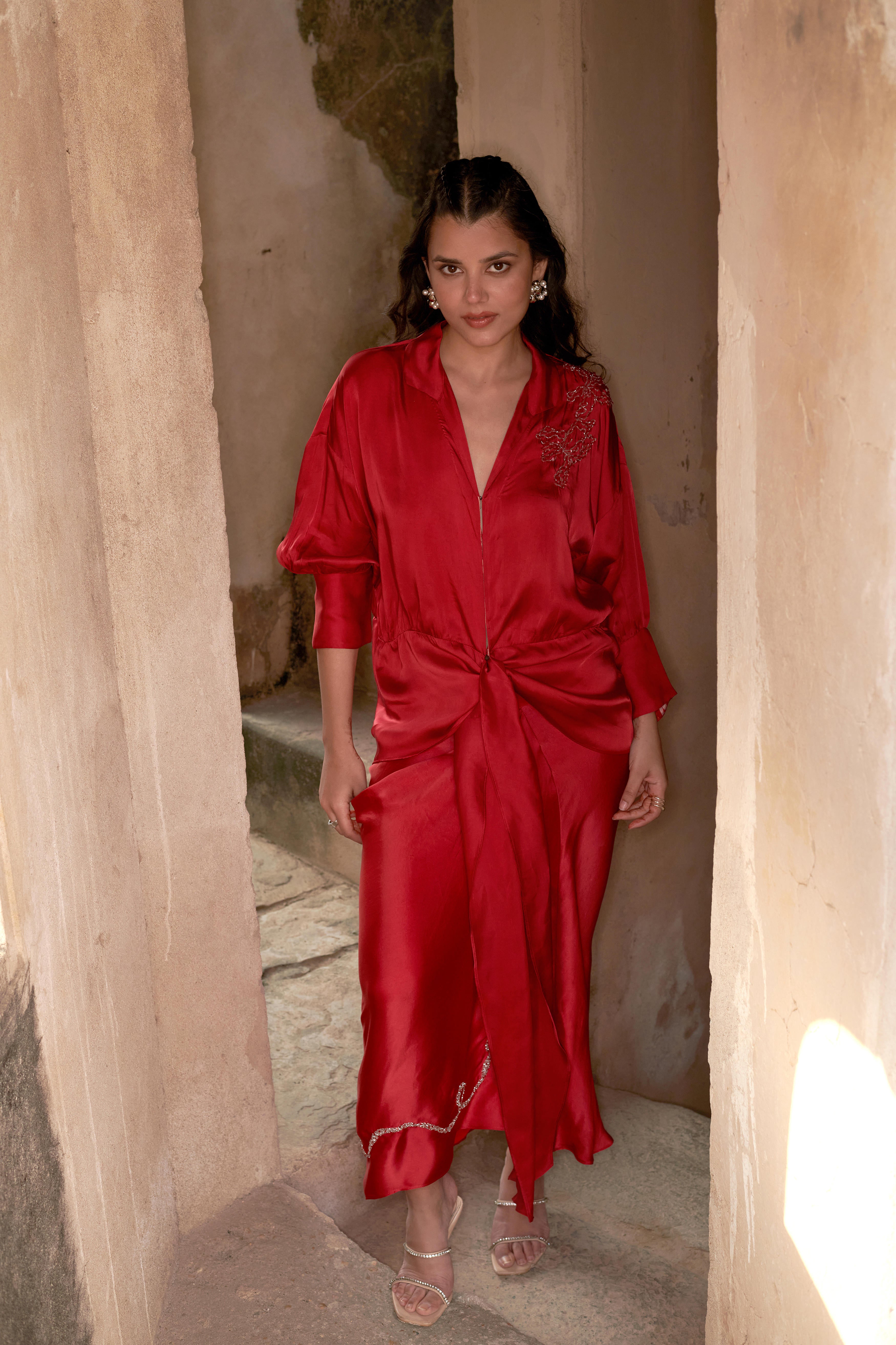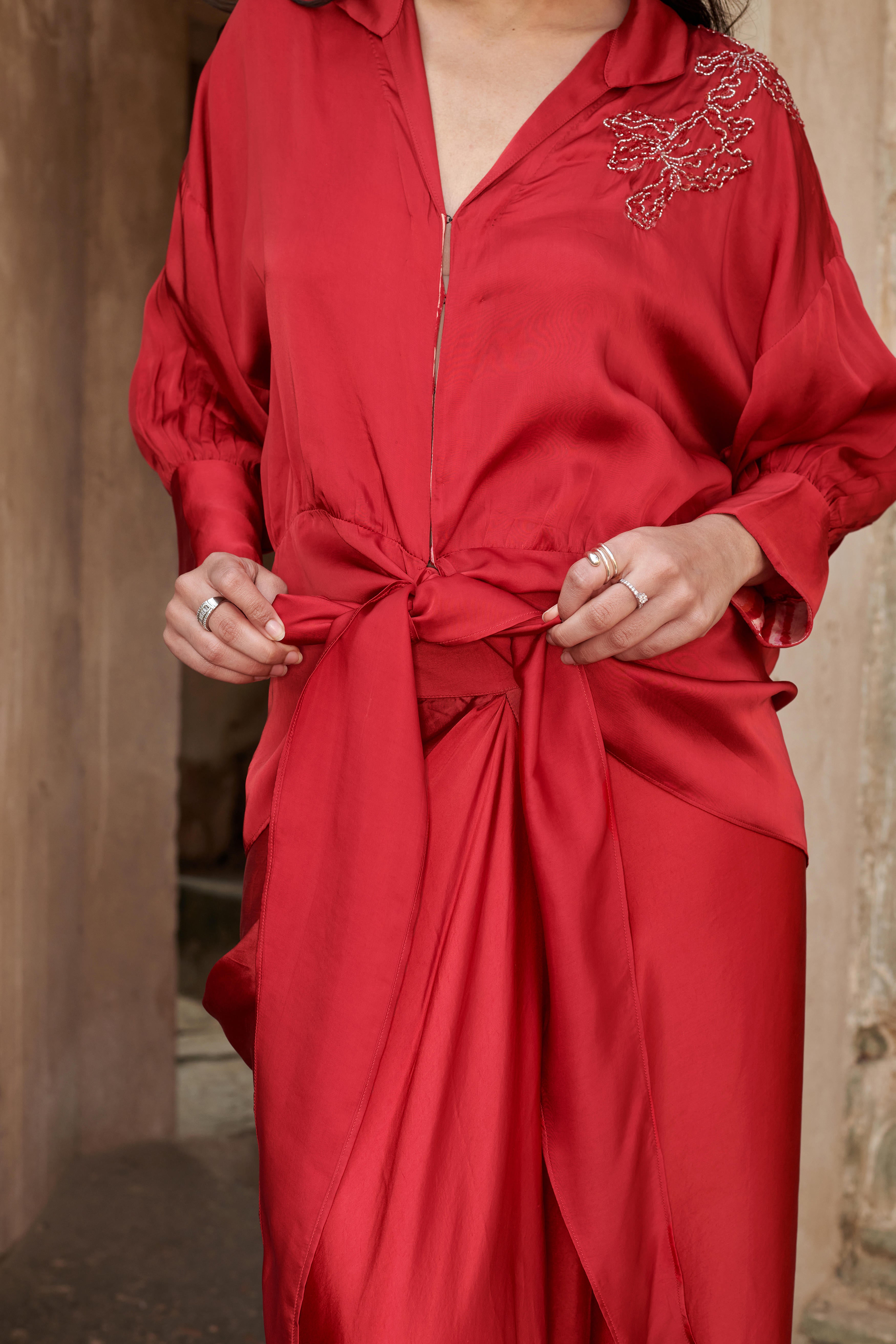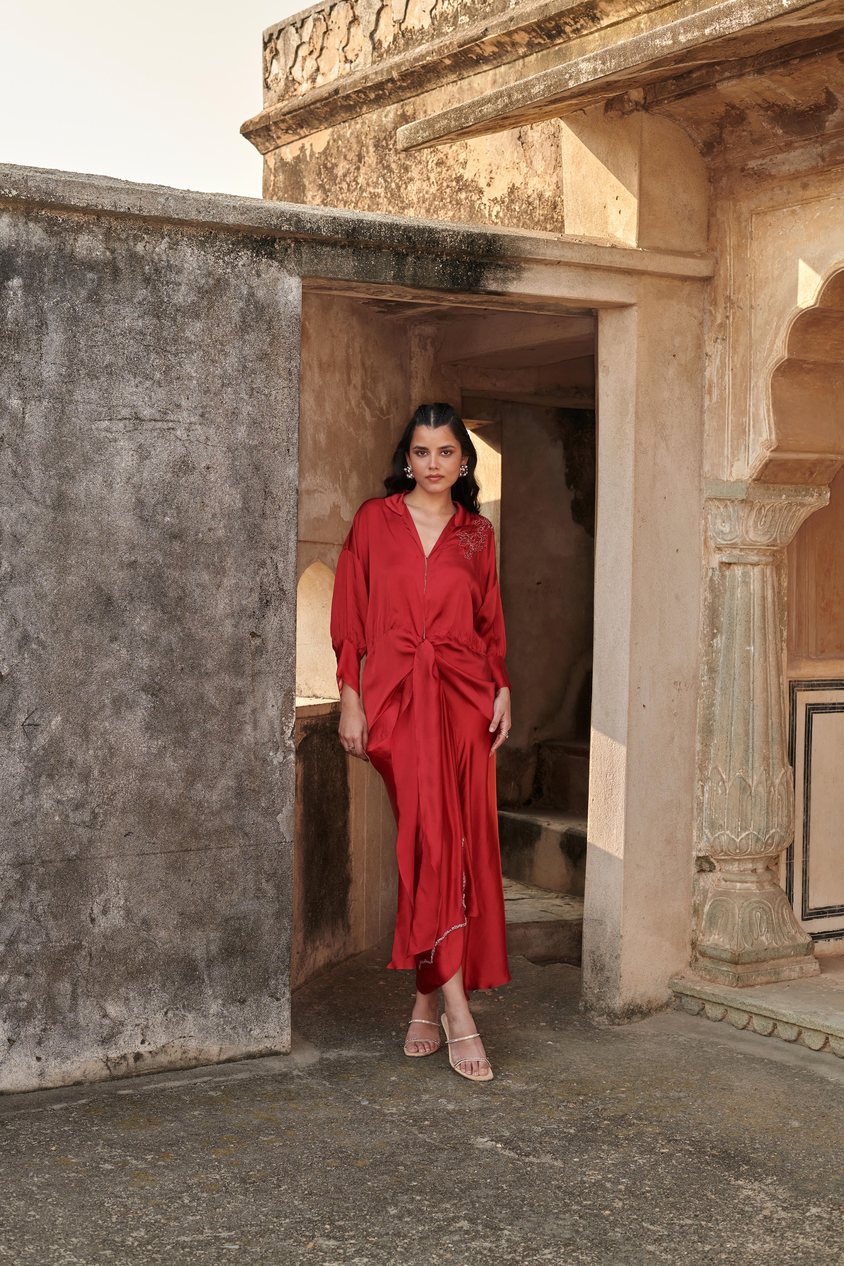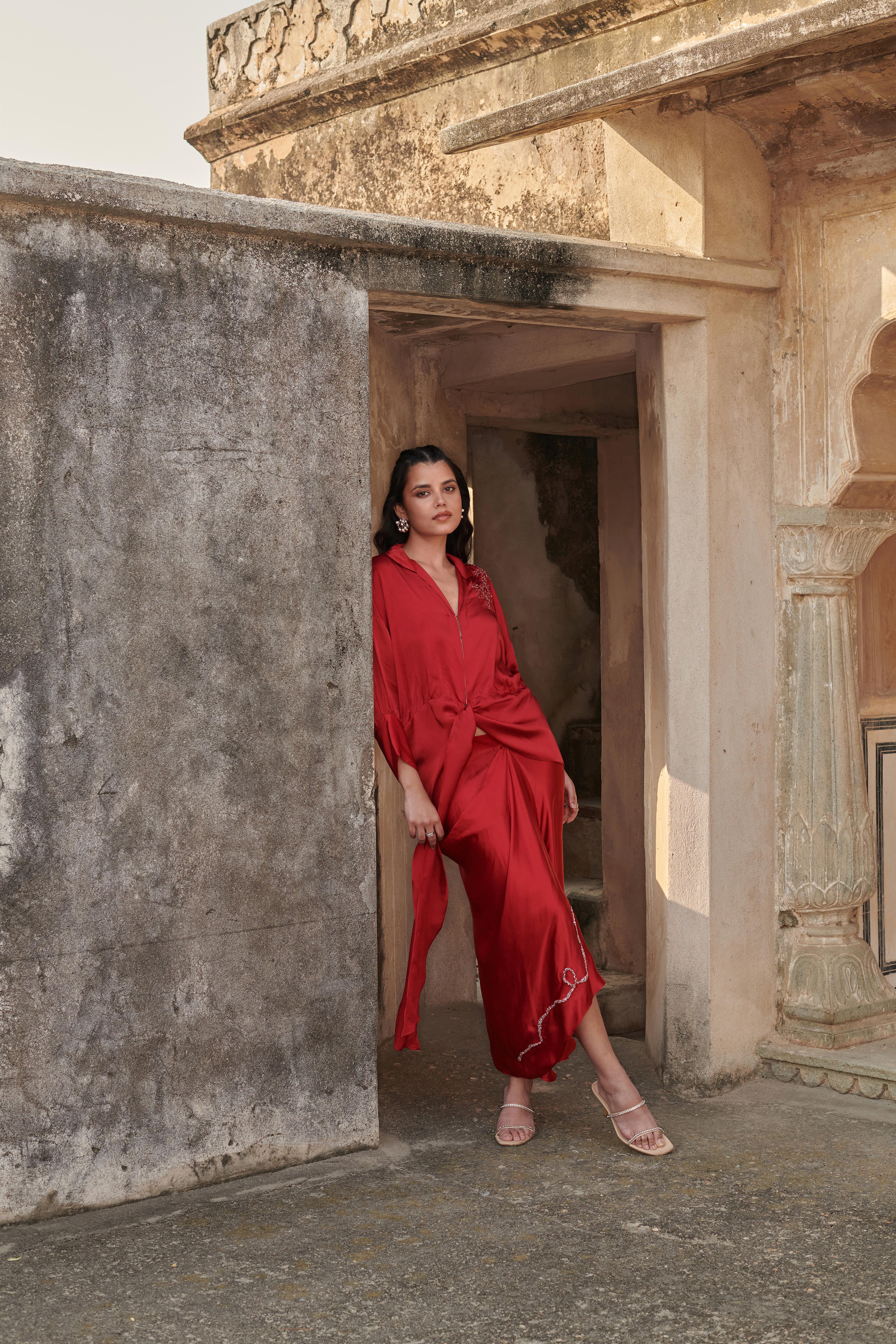 The ensemble comes with knot shirt and draped skirt. This statement piece crafted in deep red satin silk with longer back, tie ups in the front , highlighted with hand embroidery on one shoulder. Shirt length:26.5" Paired with hand embriodered draped skirt with back zip closure. Skirt length: 38"