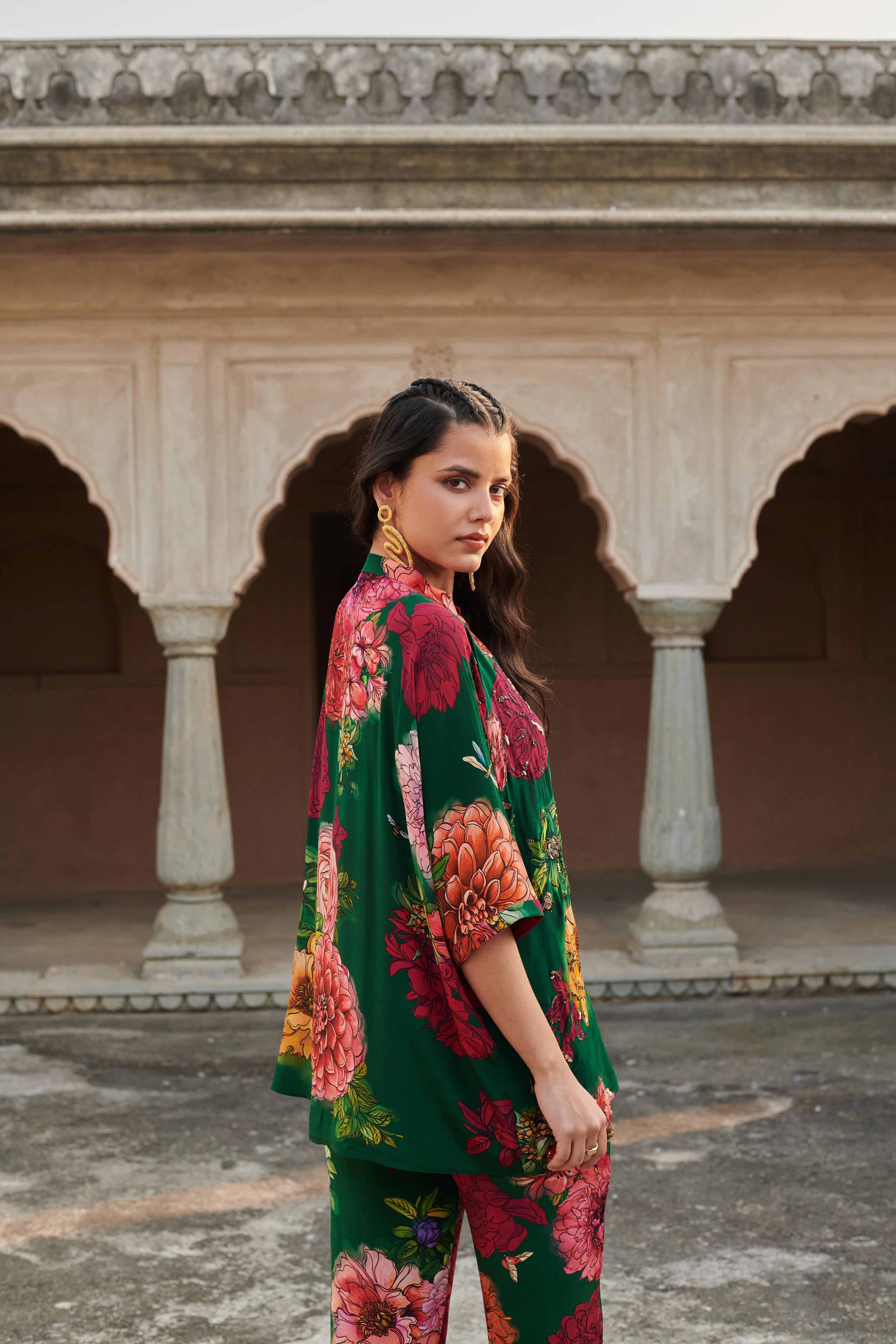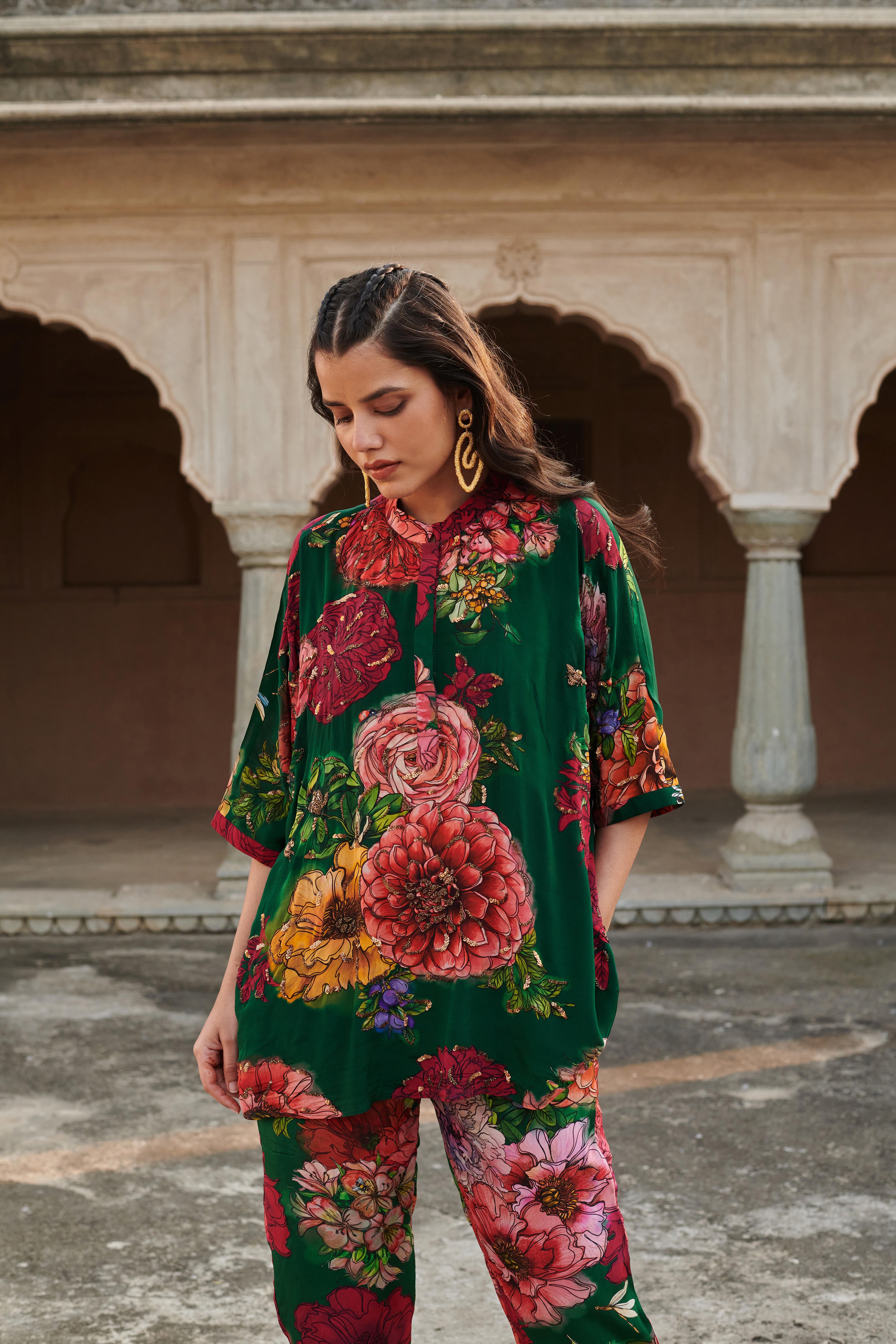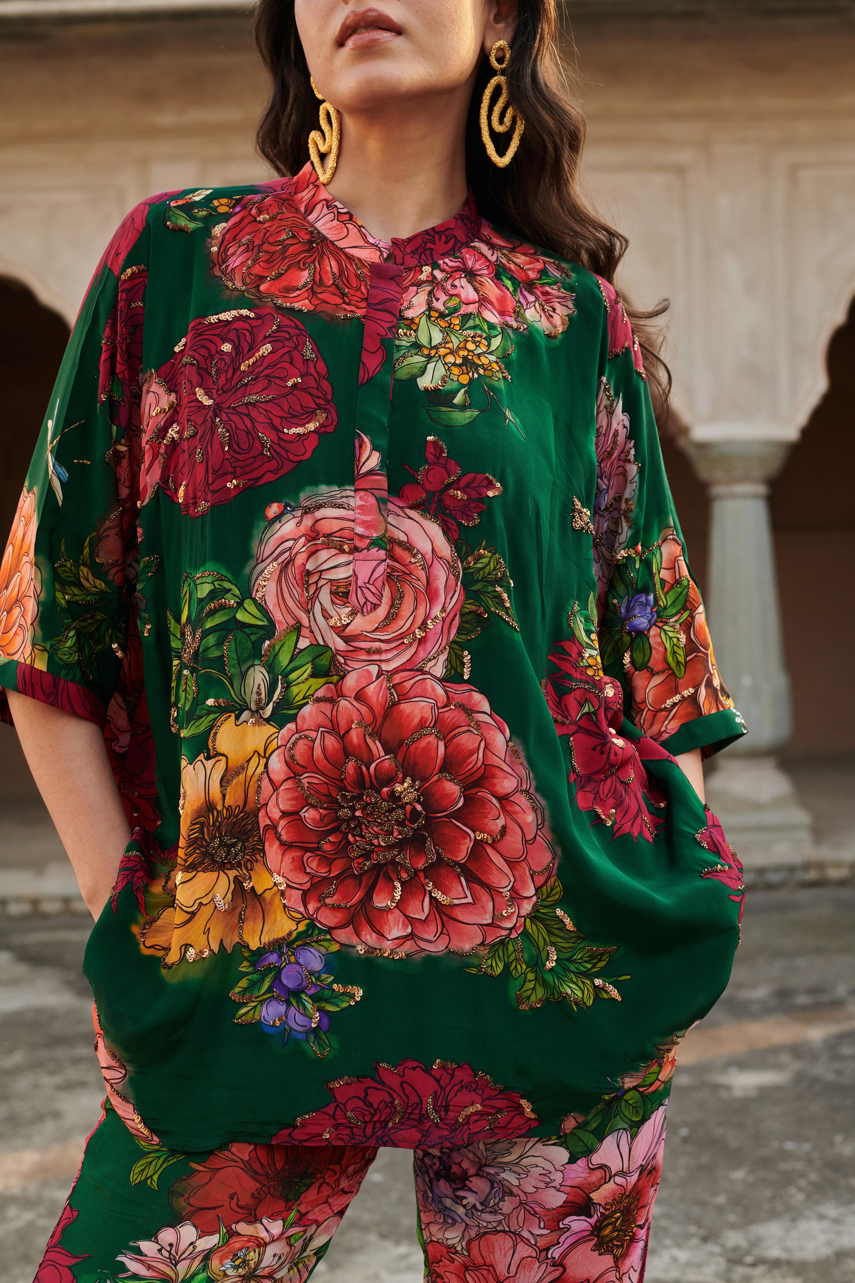 Co-ord set featuring embroidered kaftan style top with mandarian collar. Top length: 29" Paired with straight fit pants featuring half elasticated belt and side inseam pockets. Pant length: 36"