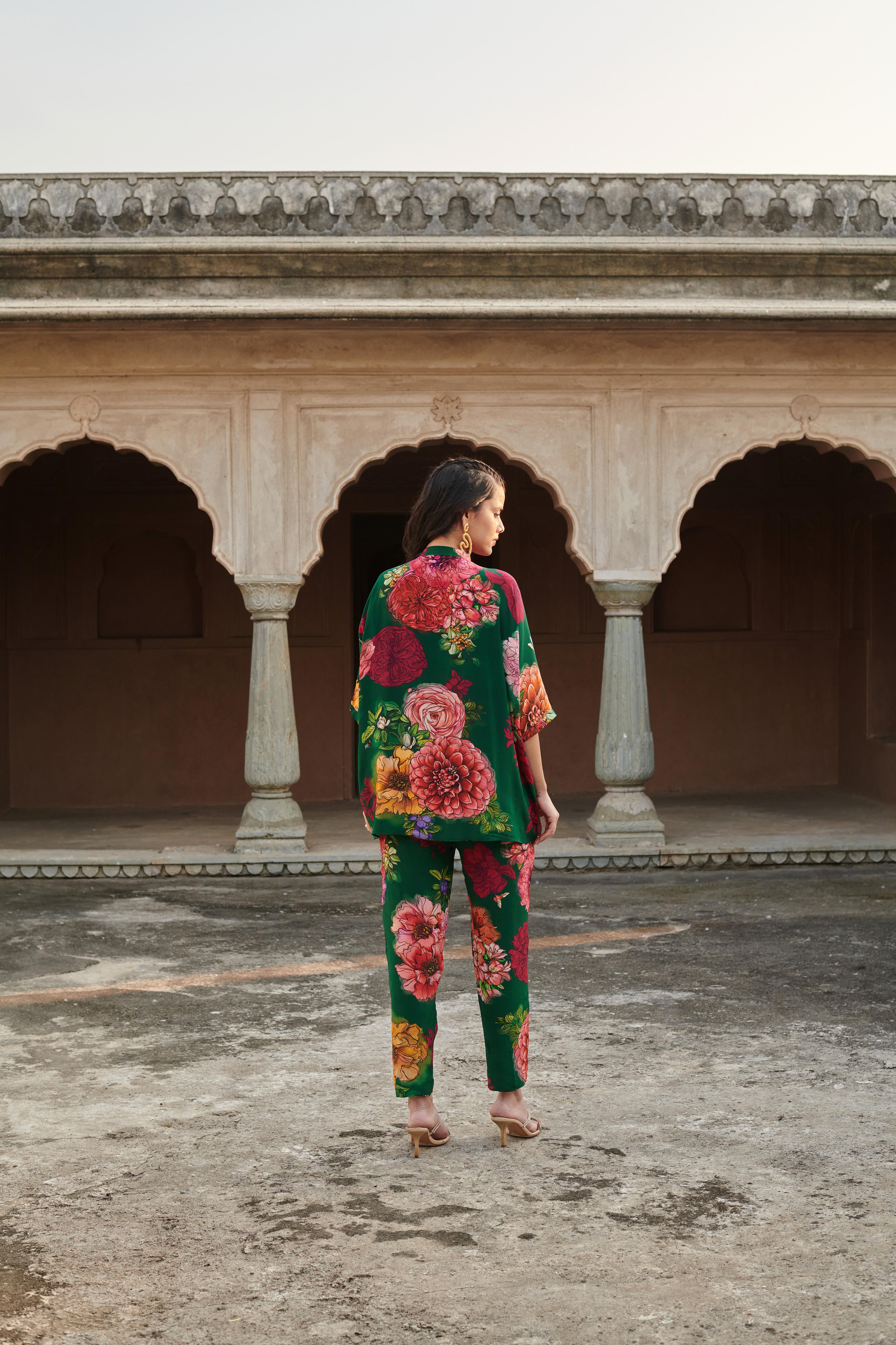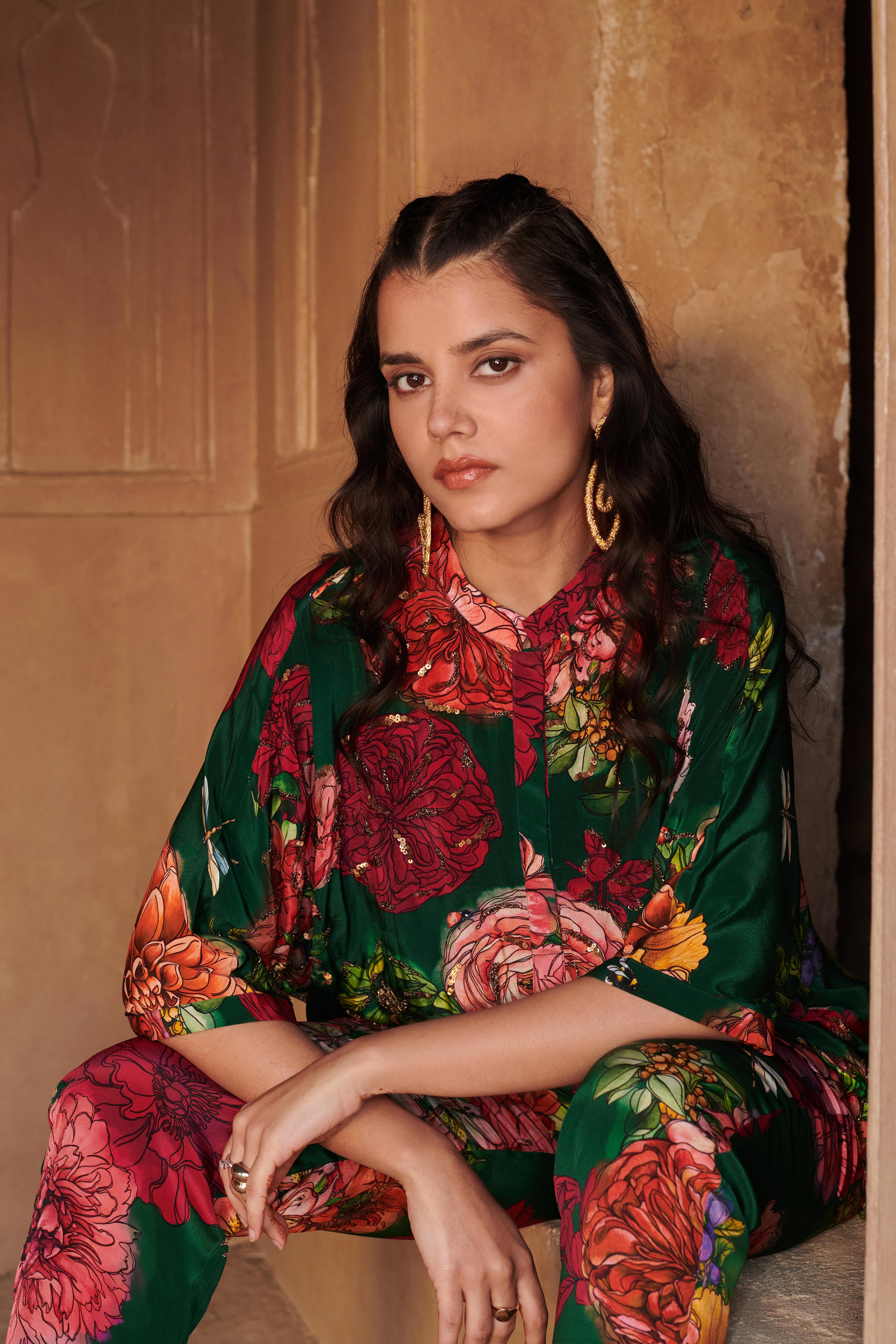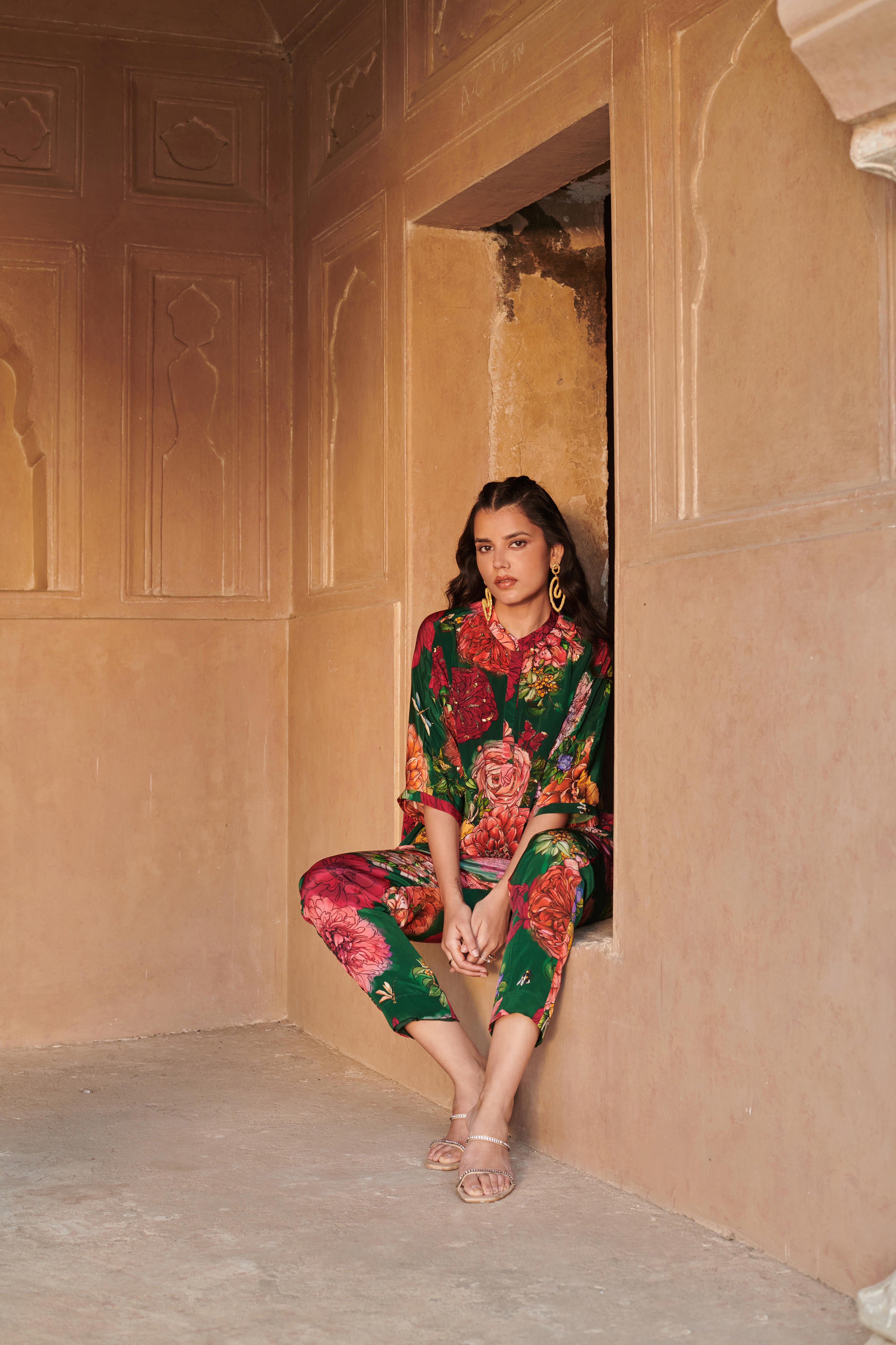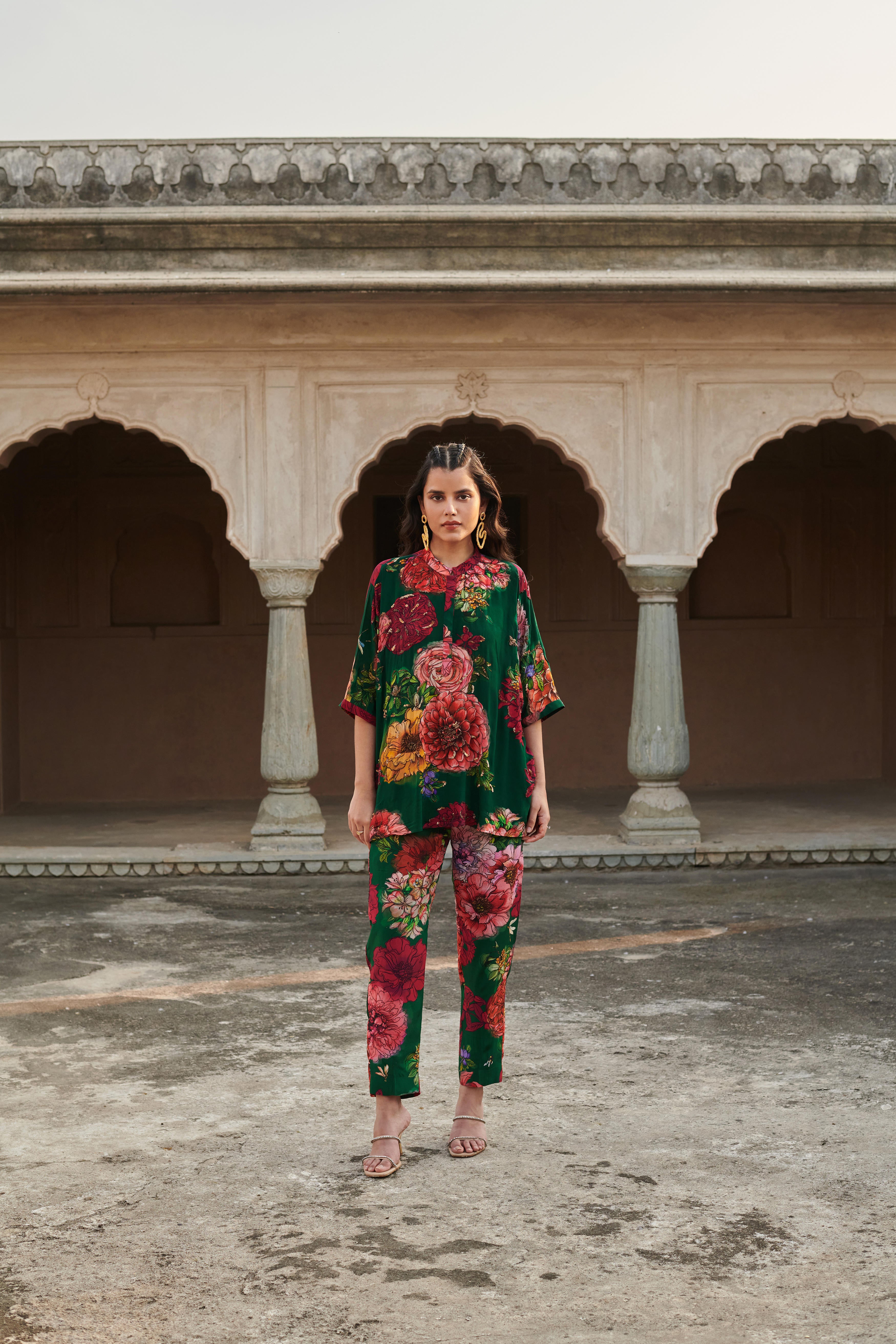 Co-ord set featuring embroidered kaftan style top with mandarian collar. Top length: 29" Paired with straight fit pants featuring half elasticated belt and side inseam pockets. Pant length: 36"